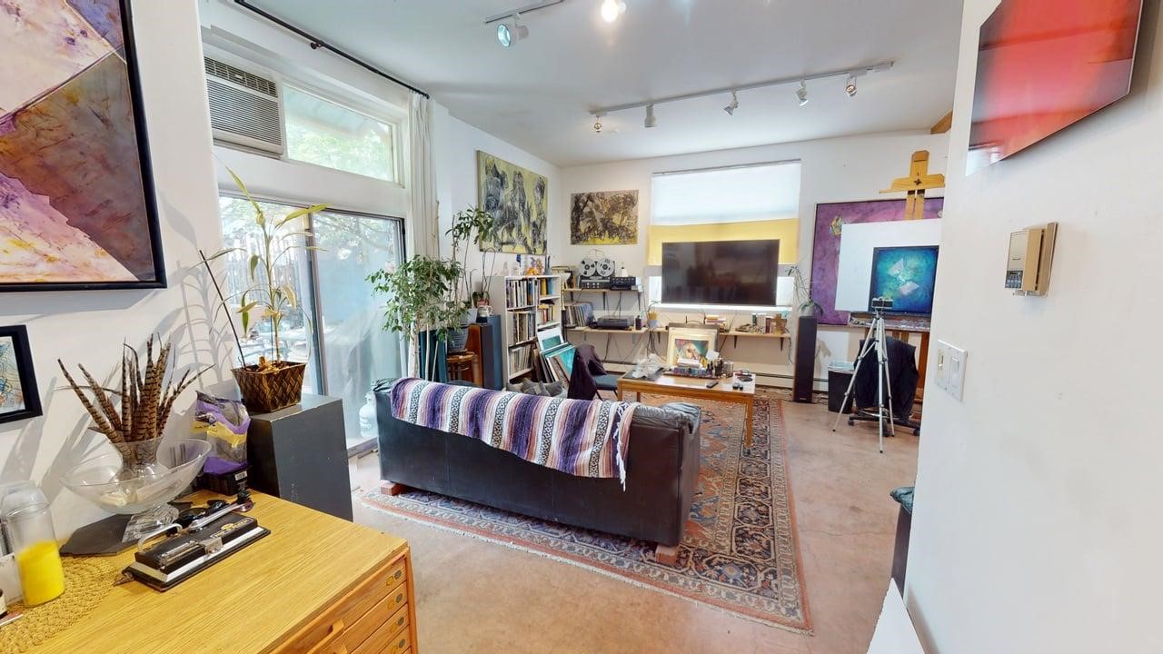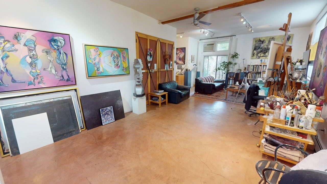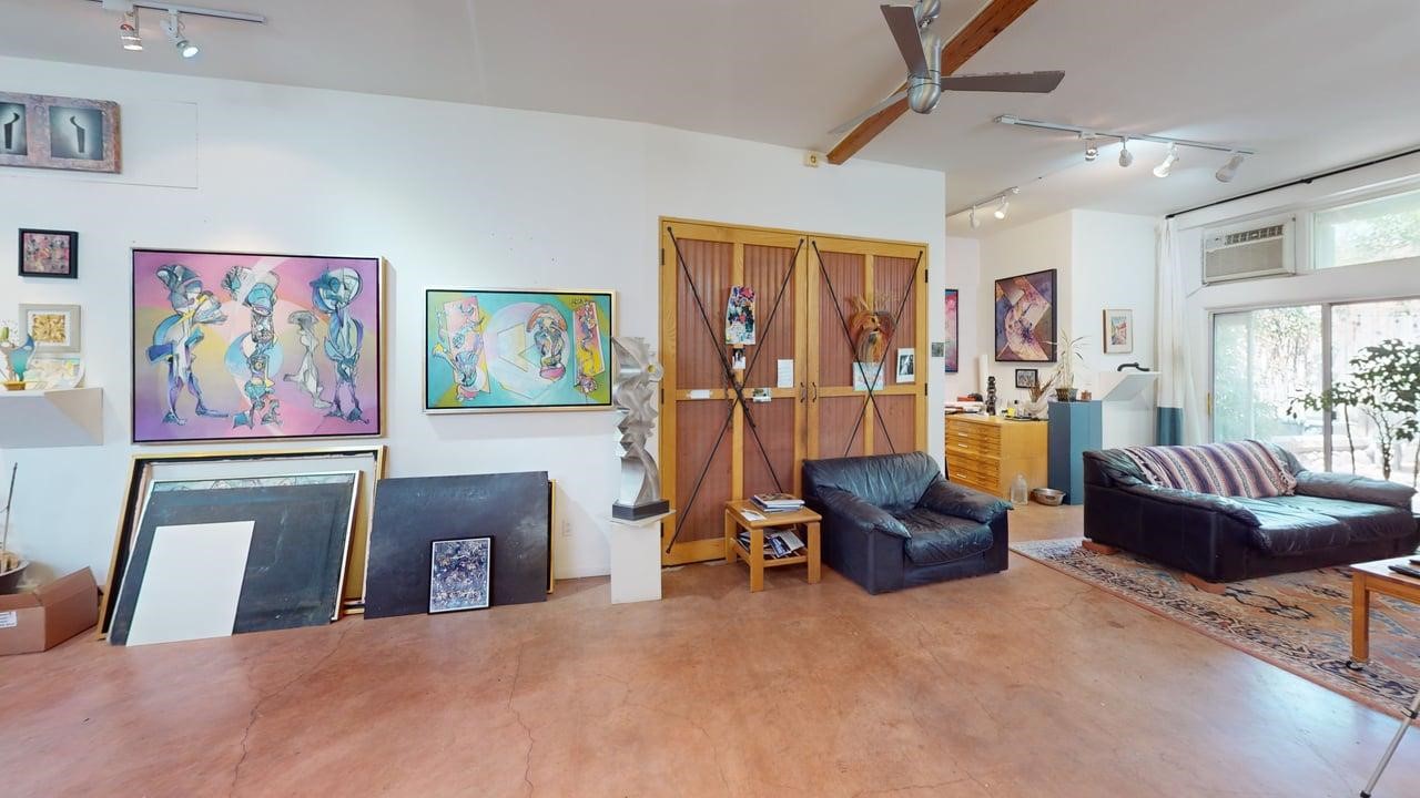 Rare opportunity to own a live/work condominium with C-1 zoning located just steps from Casa Solana Shopping Center, schools and downtown Santa Fe. Guests and owners alike are invited by a quaint but thoughtfully created front porch/sitting area. Double doors open to the large, light-filled work and living area area with a small office on the ground level. There is also a half bath and hookups for a washer and dryer on the lower level. A sliding glass door invites sunshine and shade via an enclosed and tranquil patio. Upstairs is a newly remodeled living with plenty of natural light to supplement the tract lighting. The upstairs full bath was newly remodeled with lovely stone accents and up to date plumbing fixtures. Beautifully landscaped, this live/work condo's potential is limited only by the owner's imagination. HOA dues are $800/quarterly and include insurance, water, refuse, sewer, landscaping, roof and reserve.