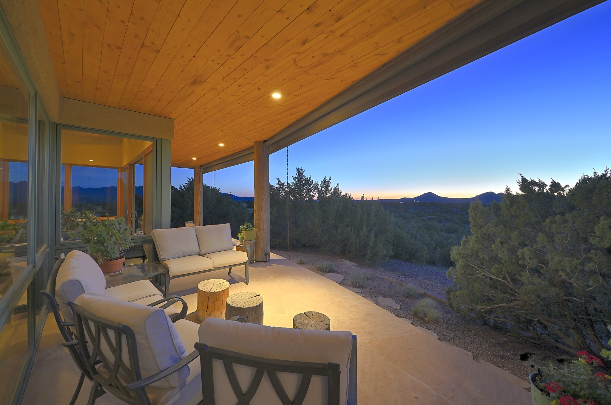 Perched atop a grassy mesa on over 40 acres covering 3 tracts, this 2009 adobe home designed by Ted Turner offers panoramic views of the Sangre de Cristo, Sandia, Jemez, Ortiz Mountain ranges& Mount Taylor. Exuding Santa Fe elegance, with soft contemporary design, featuring concrete floors, diamond-finish clay plaster walls, expansive banks of windows, exposed beams. The chef's kitchen is open and bright, with quartz countertops, a 4-burner range, convection microwave, custom soft-close cabinetry, and pantry. The open-concept layout flows into a curved gallery hallway with indoor-outdoor living and large portals to experience Santa Fe's breathtaking sunsets. Views from every room & excellent separation of bedrooms for privacy and comfort, enjoy radiant in-floor heating, a high-efficiency boiler, a 6,500-gallon rainwater collection system, 12-panel solar array, solar-powered well, and whole-house water filtration as well as a commercial grade roof. The 750-square-foot studio/guest house--built to passive house standard- can be used as an art studio, office, or guest quarters, with south-facing light, concrete floors, a kitchenette, and half-bath. Enjoy a three-car garage with a tall roll-up door, workshop space, and rodent-resistant construction. This an extraordinary retreat just minutes from the heart of Santa Fe--yet worlds away in tranquility and privacy.