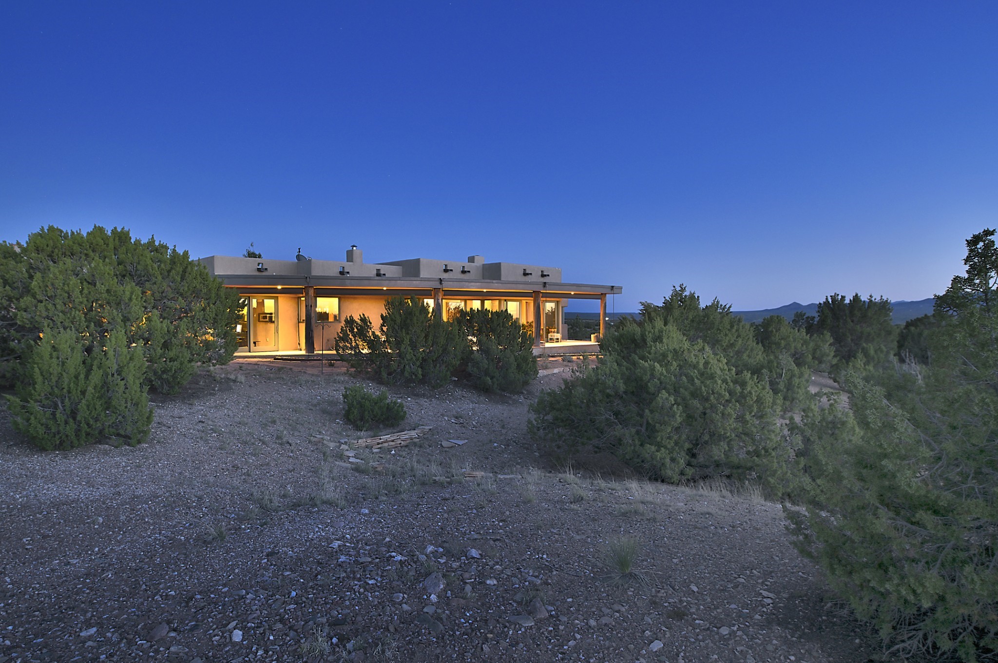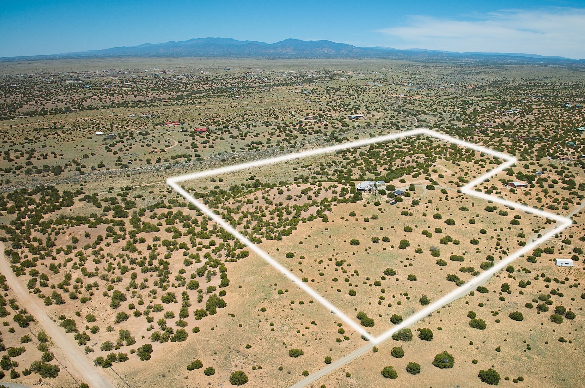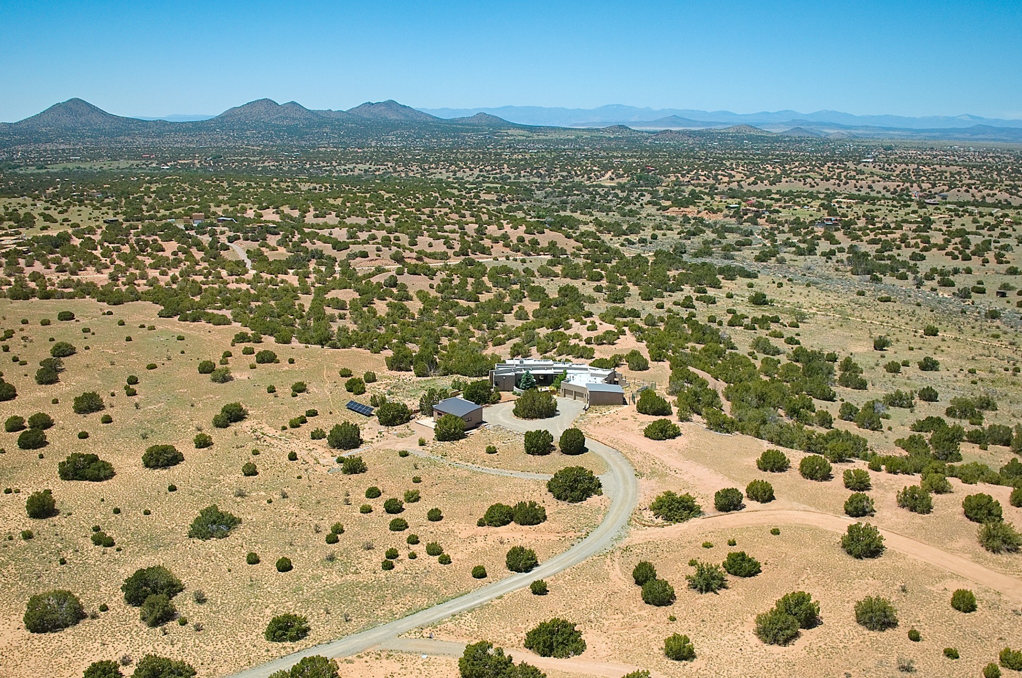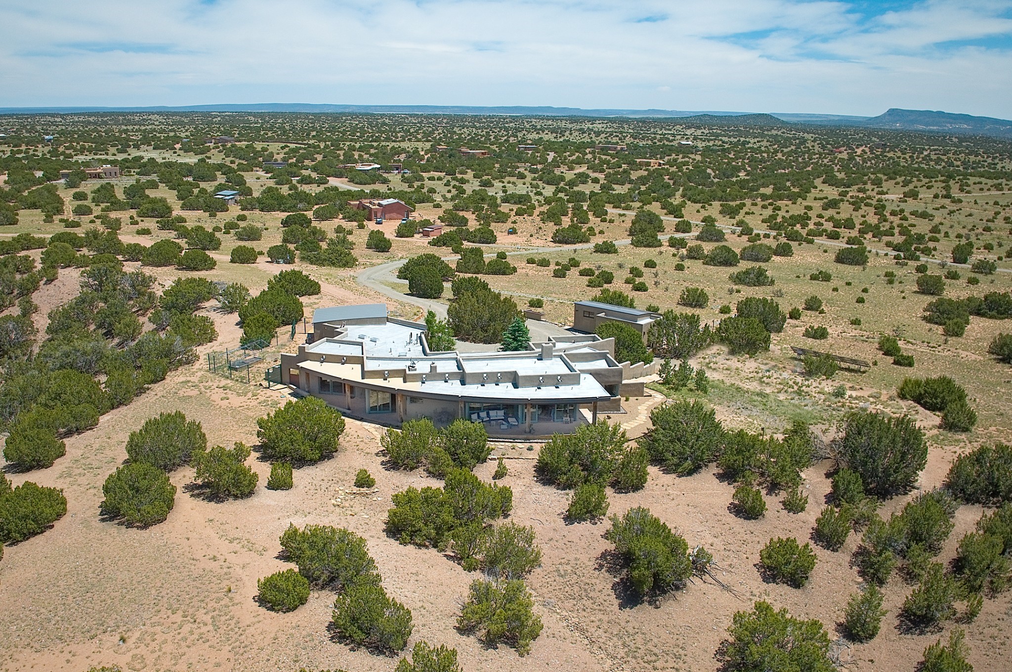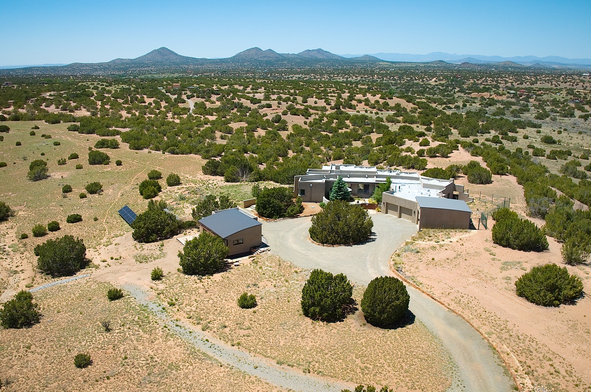 Perched atop a grassy mesa on over 40 acres covering 3 tracts, this 2009 adobe home designed by Ted Turner offers panoramic views of the Sangre de Cristo, Sandia, Jemez, Ortiz Mountain ranges& Mount Taylor. Exuding Santa Fe elegance, with soft contemporary design, featuring concrete floors, diamond-finish clay plaster walls, expansive banks of windows, exposed beams. The chef's kitchen is open and bright, with quartz countertops, a 4-burner range, convection microwave, custom soft-close cabinetry, and pantry. The open-concept layout flows into a curved gallery hallway with indoor-outdoor living and large portals to experience Santa Fe's breathtaking sunsets. Views from every room & excellent separation of bedrooms for privacy and comfort, enjoy radiant in-floor heating, a high-efficiency boiler, a 6,500-gallon rainwater collection system, 12-panel solar array, solar-powered well, and whole-house water filtration as well as a commercial grade roof. The 750-square-foot studio/guest house--built to passive house standard- can be used as an art studio, office, or guest quarters, with south-facing light, concrete floors, a kitchenette, and half-bath. Enjoy a three-car garage with a tall roll-up door, workshop space, and rodent-resistant construction. This an extraordinary retreat just minutes from the heart of Santa Fe--yet worlds away in tranquility and privacy.