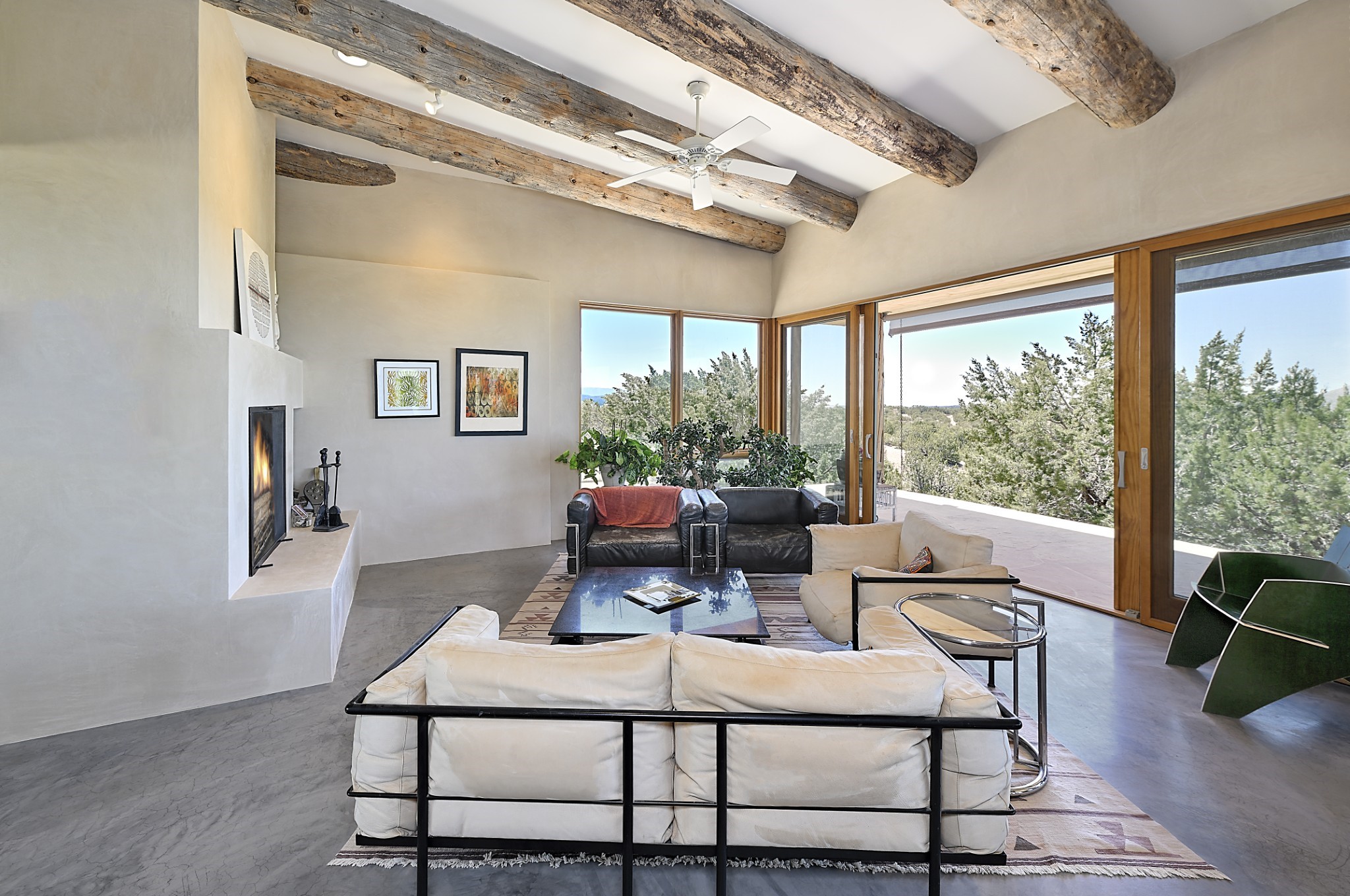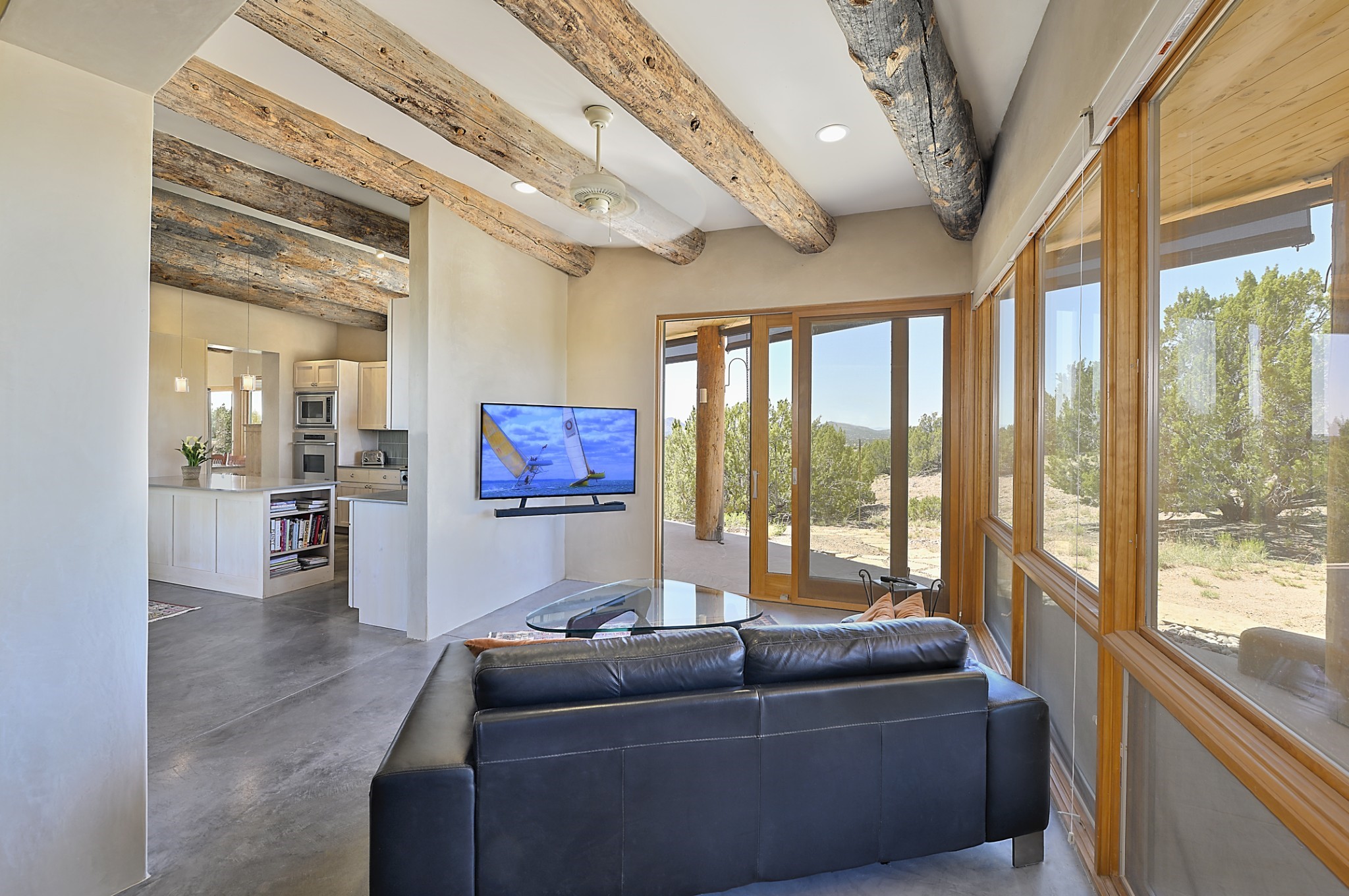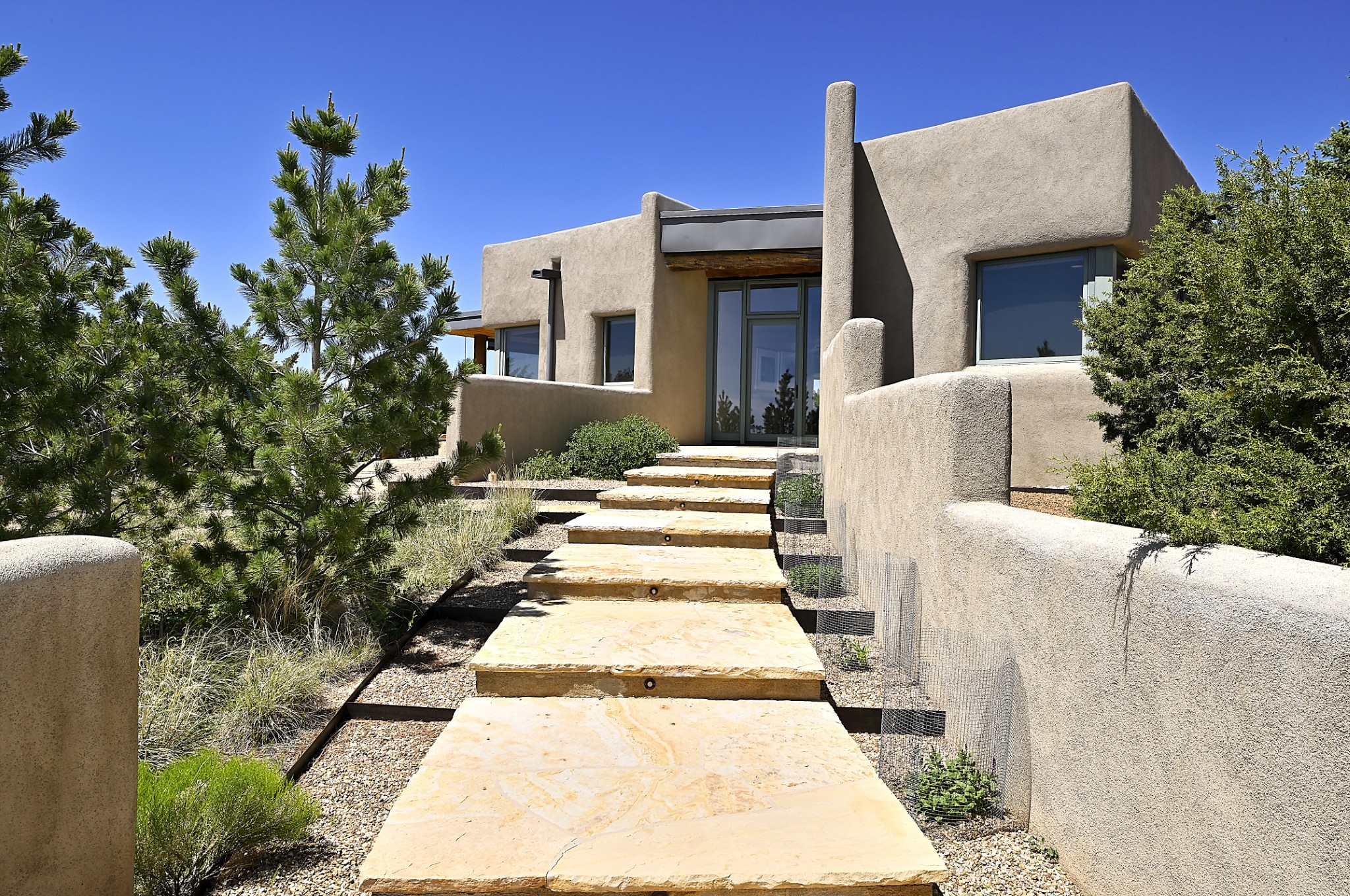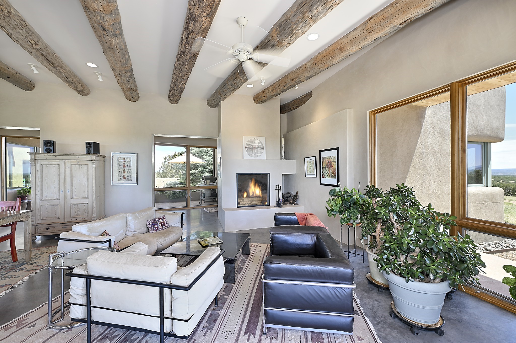 Perched atop a grassy mesa on over 40 acres covering 3 tracts, this 2009 adobe home designed by Ted Turner offers panoramic views of the Sangre de Cristo, Sandia, Jemez, Ortiz Mountain ranges& Mount Taylor. Exuding Santa Fe elegance, with soft contemporary design, featuring concrete floors, diamond-finish clay plaster walls, expansive banks of windows, exposed beams. The chef's kitchen is open and bright, with quartz countertops, a 4-burner range, convection microwave, custom soft-close cabinetry, and pantry. The open-concept layout flows into a curved gallery hallway with indoor-outdoor living and large portals to experience Santa Fe's breathtaking sunsets. Views from every room & excellent separation of bedrooms for privacy and comfort, enjoy radiant in-floor heating, a high-efficiency boiler, a 6,500-gallon rainwater collection system, 12-panel solar array, solar-powered well, and whole-house water filtration as well as a commercial grade roof. The 750-square-foot studio/guest house--built to passive house standard- can be used as an art studio, office, or guest quarters, with south-facing light, concrete floors, a kitchenette, and half-bath. Enjoy a three-car garage with a tall roll-up door, workshop space, and rodent-resistant construction. This an extraordinary retreat just minutes from the heart of Santa Fe--yet worlds away in tranquility and privacy.