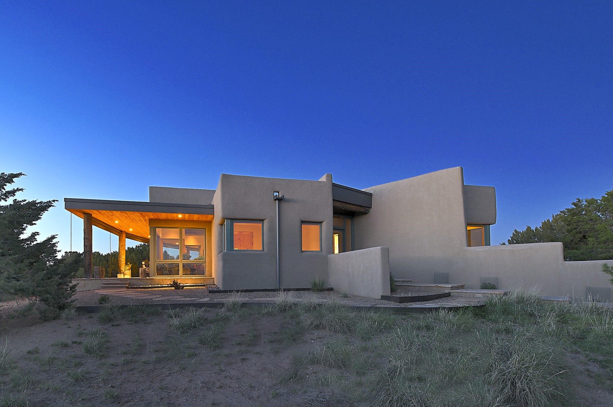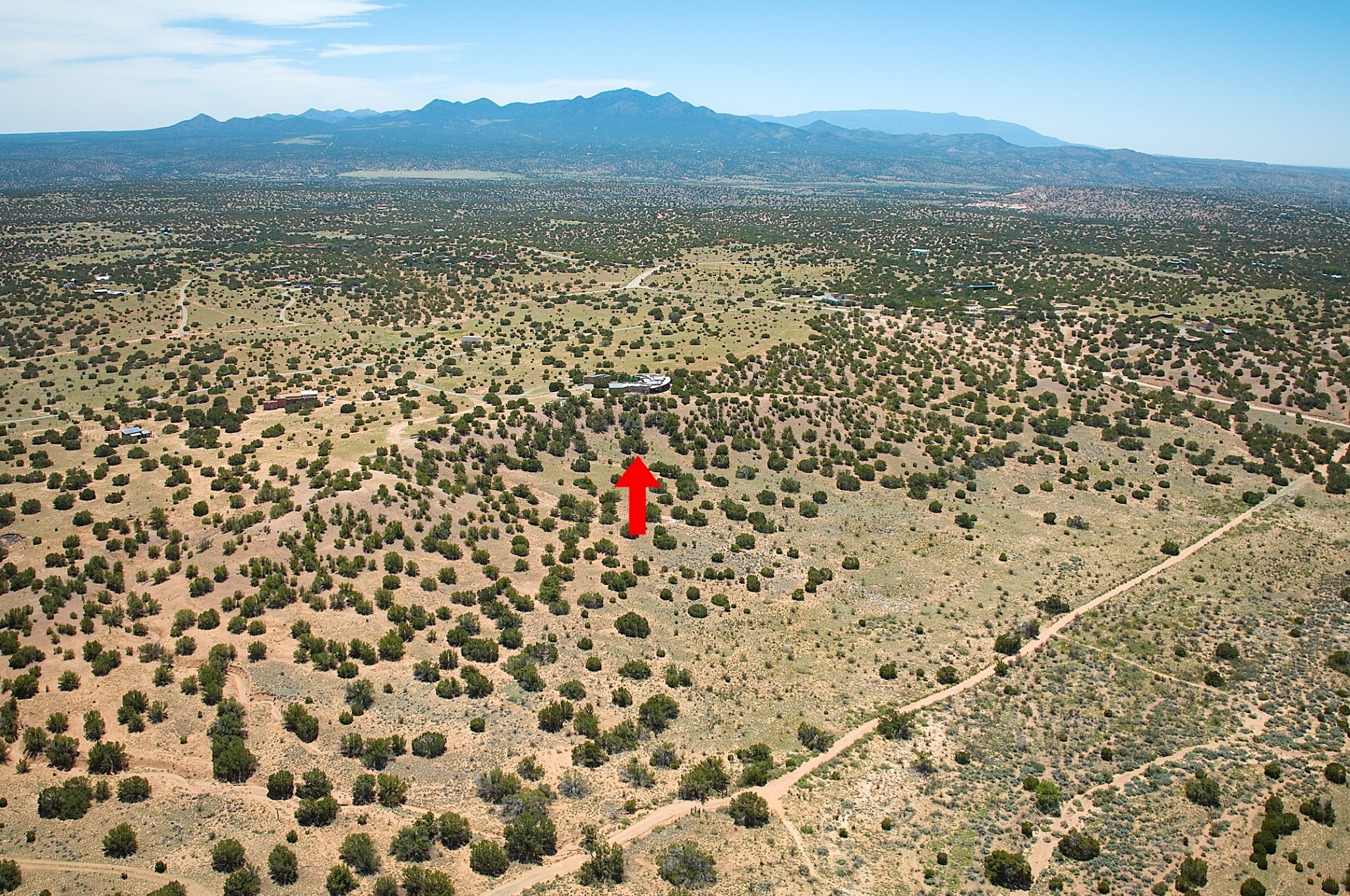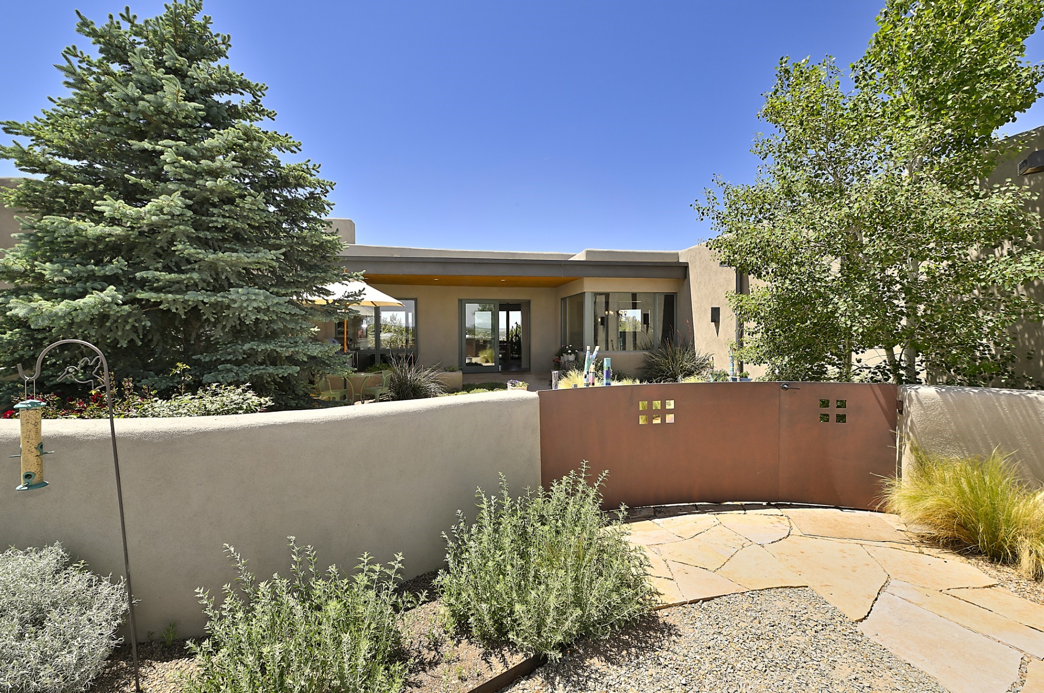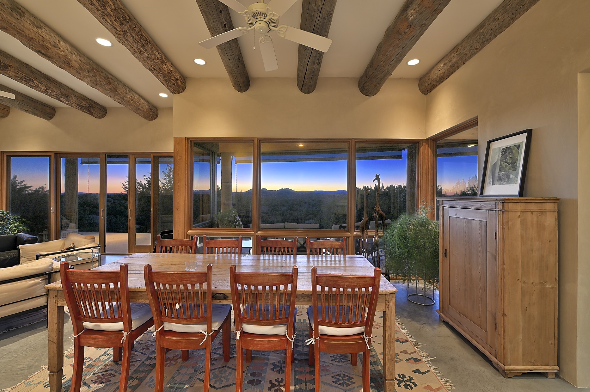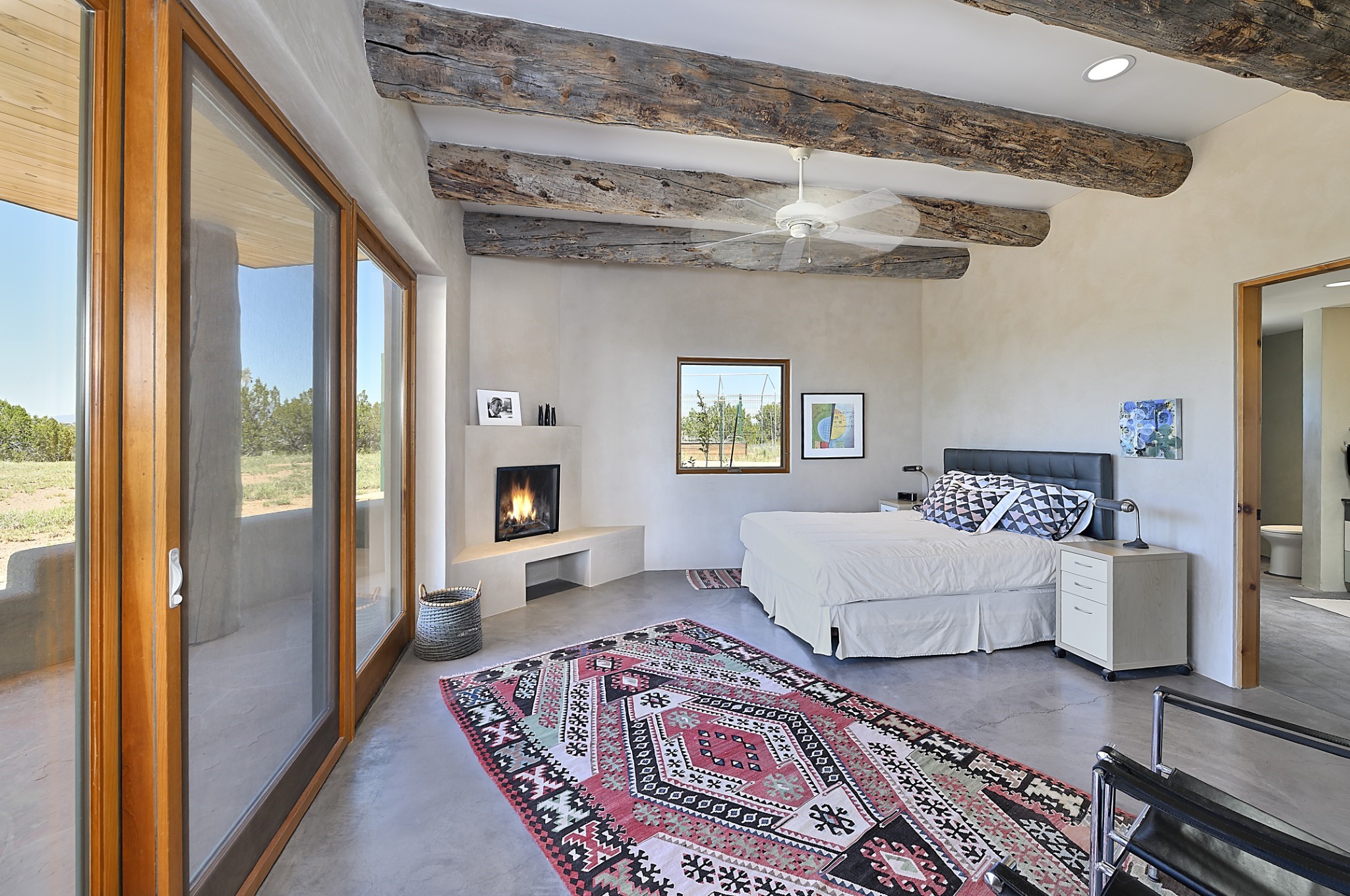 Perched atop a grassy mesa on over 40 acres covering 3 tracts, this 2009 adobe home designed by Ted Turner offers panoramic views of the Sangre de Cristo, Sandia, Jemez, Ortiz Mountain ranges& Mount Taylor. Exuding Santa Fe elegance, with soft contemporary design, featuring concrete floors, diamond-finish clay plaster walls, expansive banks of windows, exposed beams. The chef's kitchen is open and bright, with quartz countertops, a 4-burner range, convection microwave, custom soft-close cabinetry, and pantry. The open-concept layout flows into a curved gallery hallway with indoor-outdoor living and large portals to experience Santa Fe's breathtaking sunsets. Views from every room & excellent separation of bedrooms for privacy and comfort, enjoy radiant in-floor heating, a high-efficiency boiler, a 6,500-gallon rainwater collection system, 12-panel solar array, solar-powered well, and whole-house water filtration as well as a commercial grade roof. The 750-square-foot studio/guest house--built to passive house standard- can be used as an art studio, office, or guest quarters, with south-facing light, concrete floors, a kitchenette, and half-bath. Enjoy a three-car garage with a tall roll-up door, workshop space, and rodent-resistant construction. This an extraordinary retreat just minutes from the heart of Santa Fe--yet worlds away in tranquility and privacy.