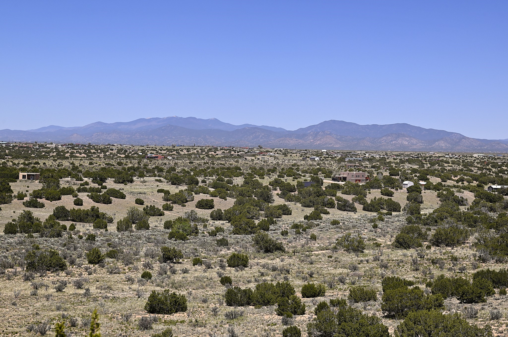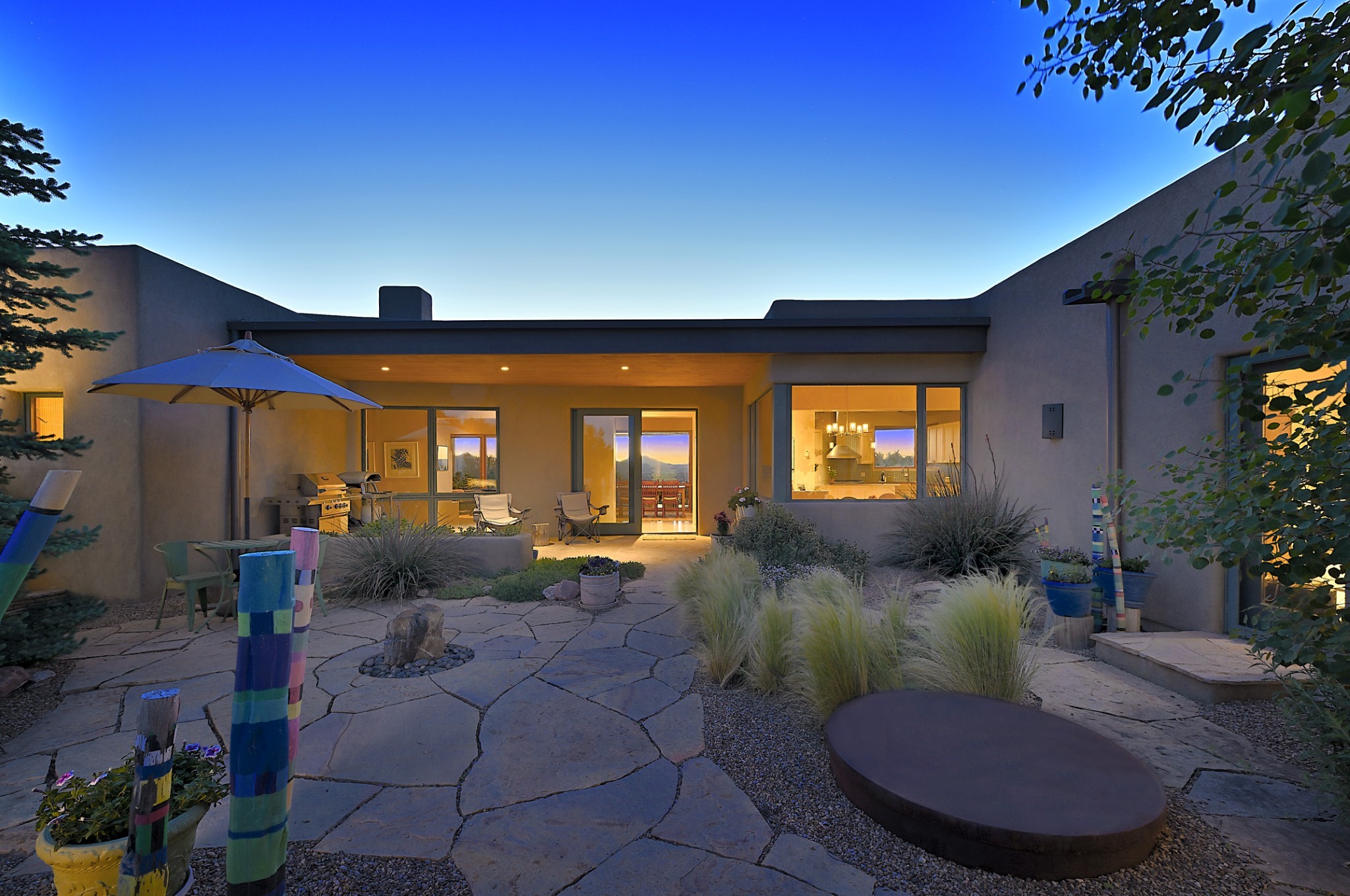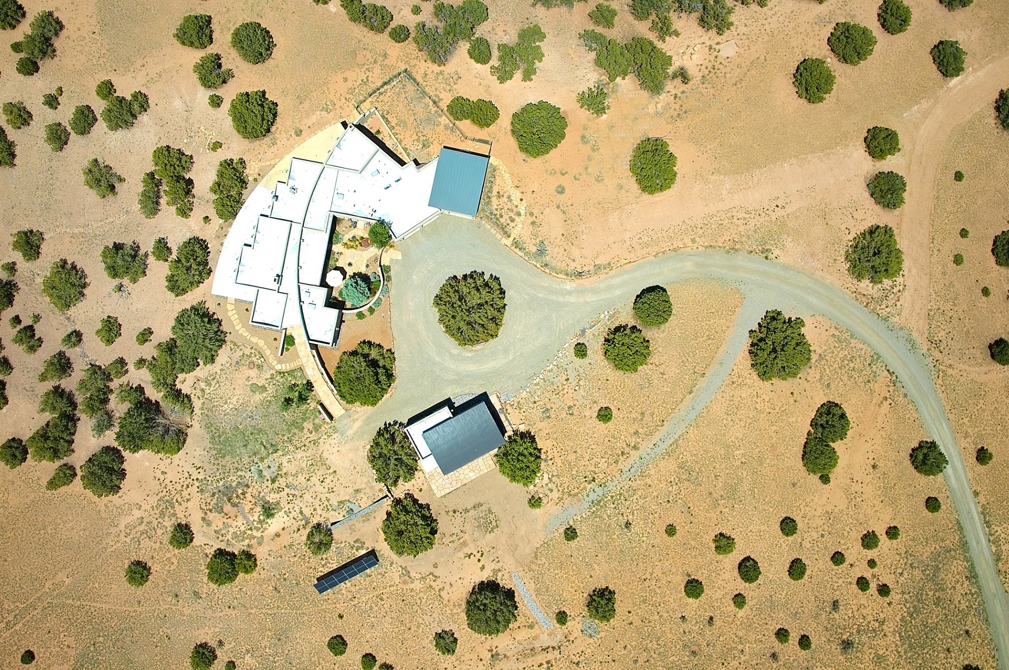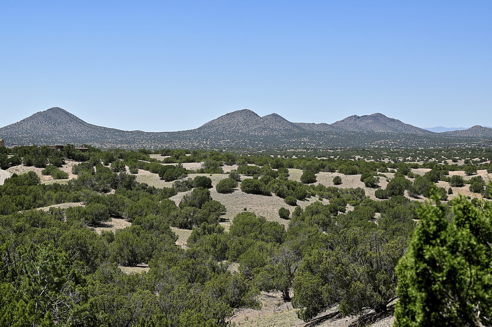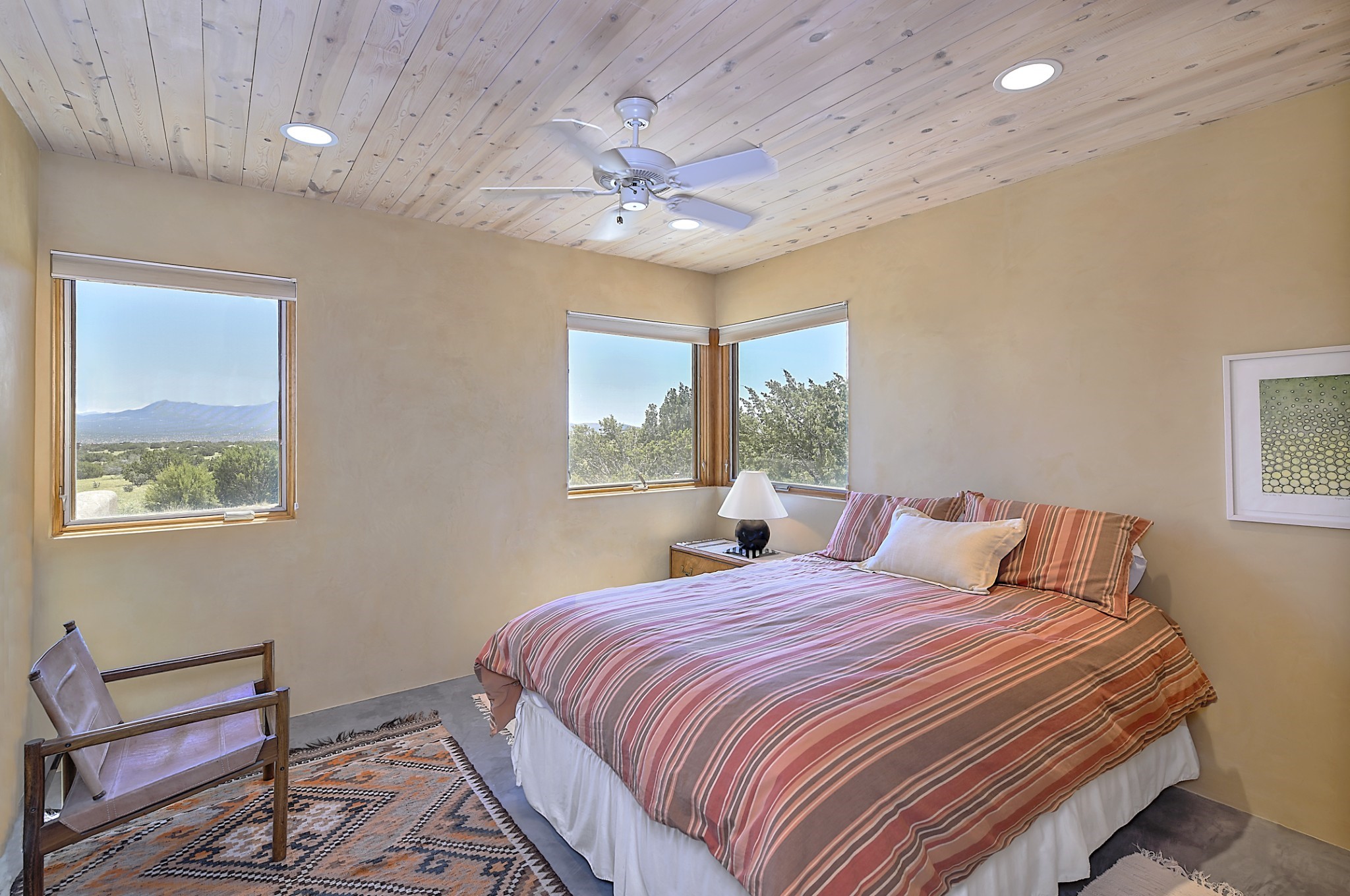 Perched atop a grassy mesa on over 40 acres covering 3 tracts, this 2009 adobe home designed by Ted Turner offers panoramic views of the Sangre de Cristo, Sandia, Jemez, Ortiz Mountain ranges& Mount Taylor. Exuding Santa Fe elegance, with soft contemporary design, featuring concrete floors, diamond-finish clay plaster walls, expansive banks of windows, exposed beams. The chef's kitchen is open and bright, with quartz countertops, a 4-burner range, convection microwave, custom soft-close cabinetry, and pantry. The open-concept layout flows into a curved gallery hallway with indoor-outdoor living and large portals to experience Santa Fe's breathtaking sunsets. Views from every room & excellent separation of bedrooms for privacy and comfort, enjoy radiant in-floor heating, a high-efficiency boiler, a 6,500-gallon rainwater collection system, 12-panel solar array, solar-powered well, and whole-house water filtration as well as a commercial grade roof. The 750-square-foot studio/guest house--built to passive house standard- can be used as an art studio, office, or guest quarters, with south-facing light, concrete floors, a kitchenette, and half-bath. Enjoy a three-car garage with a tall roll-up door, workshop space, and rodent-resistant construction. This an extraordinary retreat just minutes from the heart of Santa Fe--yet worlds away in tranquility and privacy.