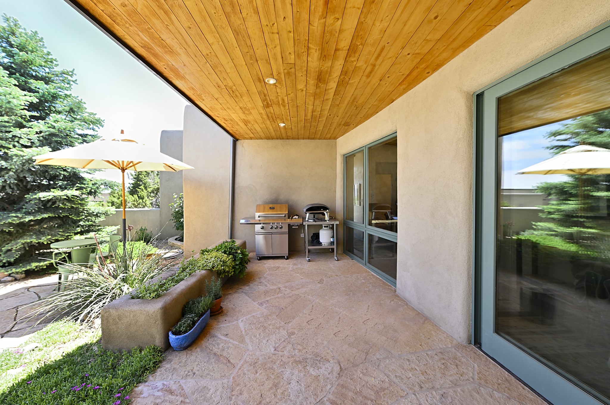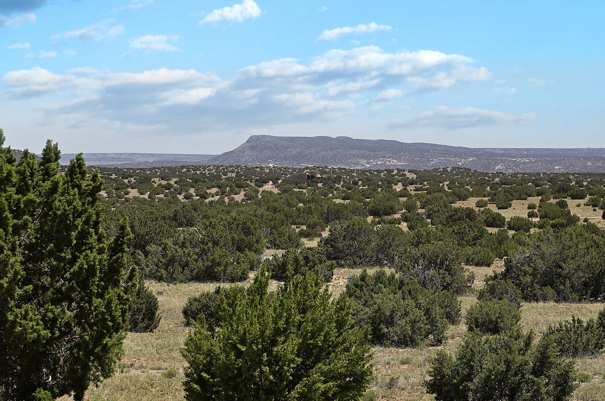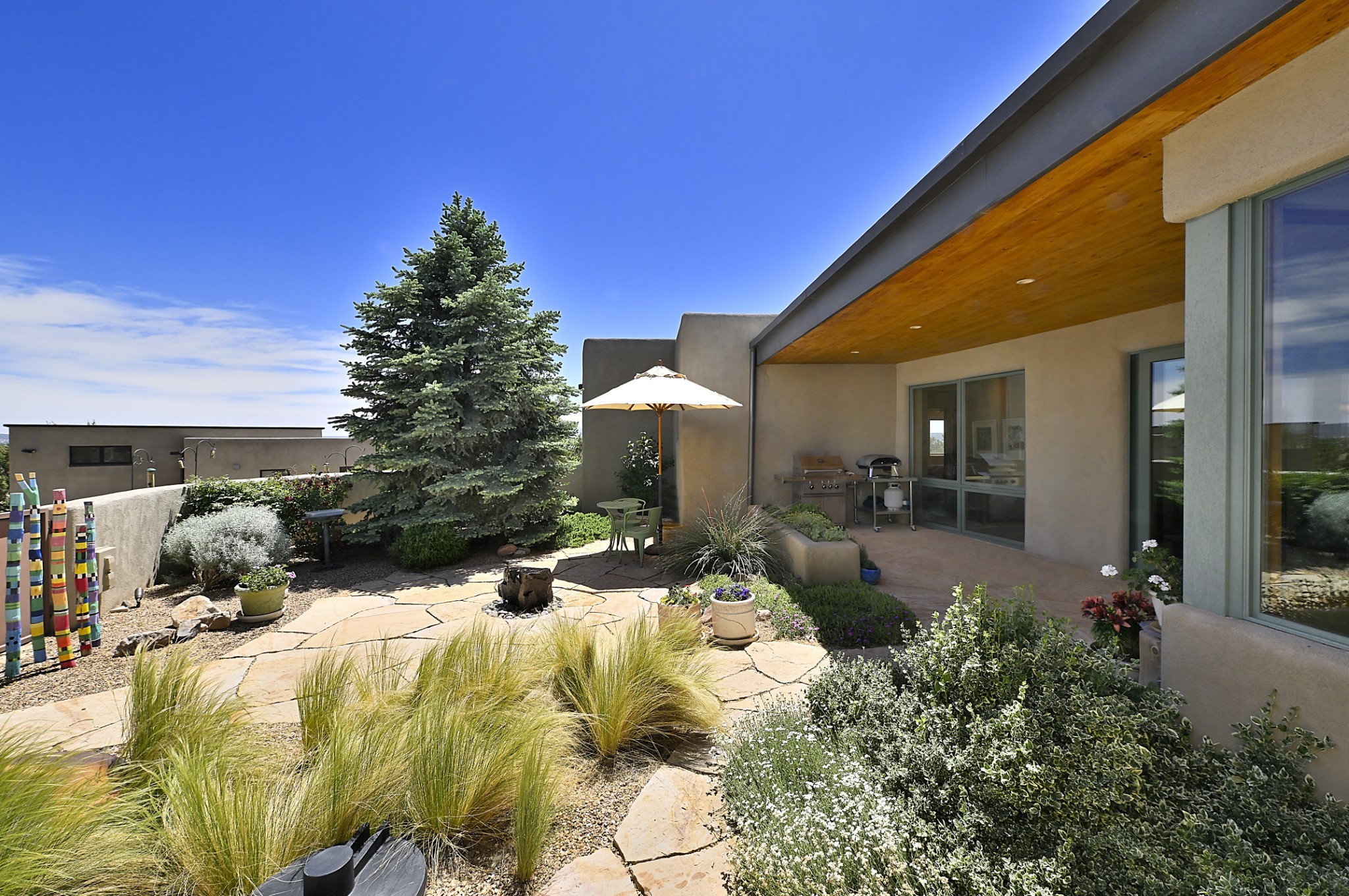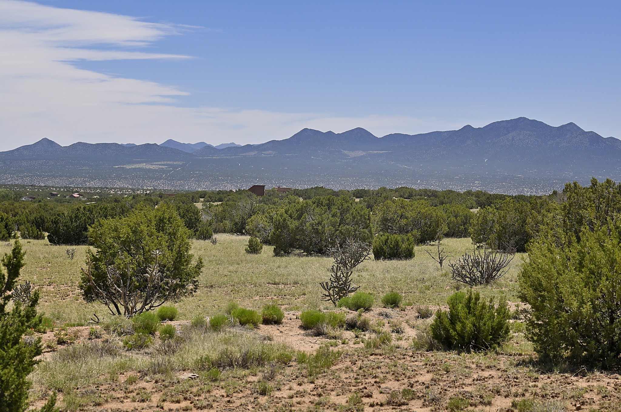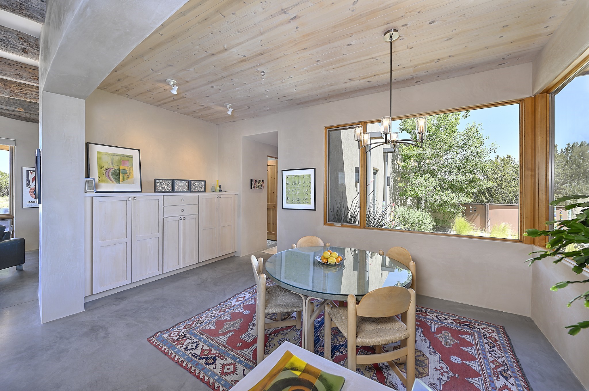 Perched atop a grassy mesa on over 40 acres covering 3 tracts, this 2009 adobe home designed by Ted Turner offers panoramic views of the Sangre de Cristo, Sandia, Jemez, Ortiz Mountain ranges& Mount Taylor. Exuding Santa Fe elegance, with soft contemporary design, featuring concrete floors, diamond-finish clay plaster walls, expansive banks of windows, exposed beams. The chef's kitchen is open and bright, with quartz countertops, a 4-burner range, convection microwave, custom soft-close cabinetry, and pantry. The open-concept layout flows into a curved gallery hallway with indoor-outdoor living and large portals to experience Santa Fe's breathtaking sunsets. Views from every room & excellent separation of bedrooms for privacy and comfort, enjoy radiant in-floor heating, a high-efficiency boiler, a 6,500-gallon rainwater collection system, 12-panel solar array, solar-powered well, and whole-house water filtration as well as a commercial grade roof. The 750-square-foot studio/guest house--built to passive house standard- can be used as an art studio, office, or guest quarters, with south-facing light, concrete floors, a kitchenette, and half-bath. Enjoy a three-car garage with a tall roll-up door, workshop space, and rodent-resistant construction. This an extraordinary retreat just minutes from the heart of Santa Fe--yet worlds away in tranquility and privacy.