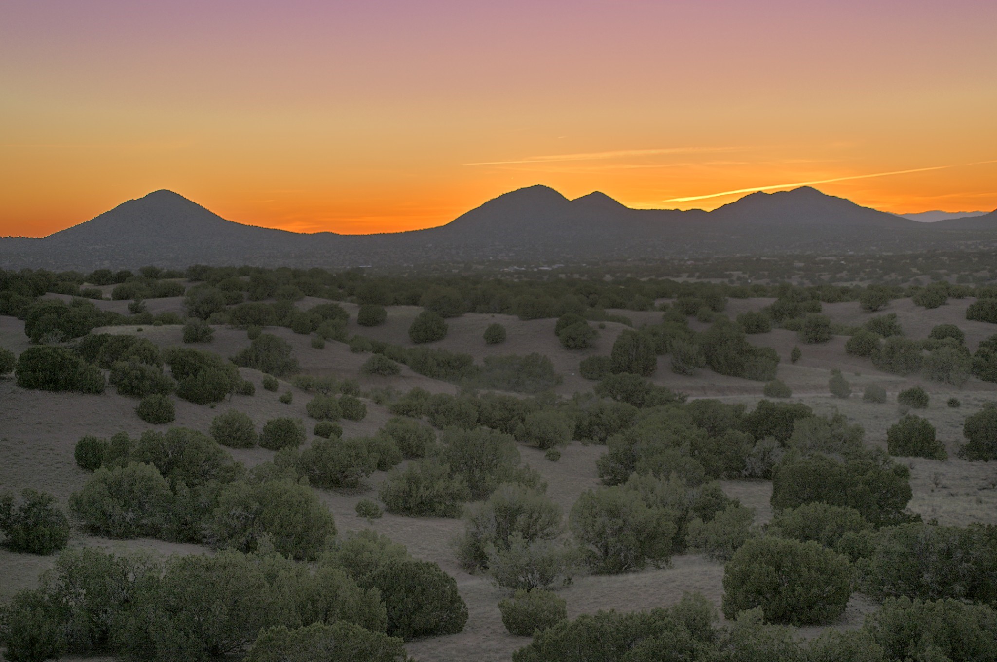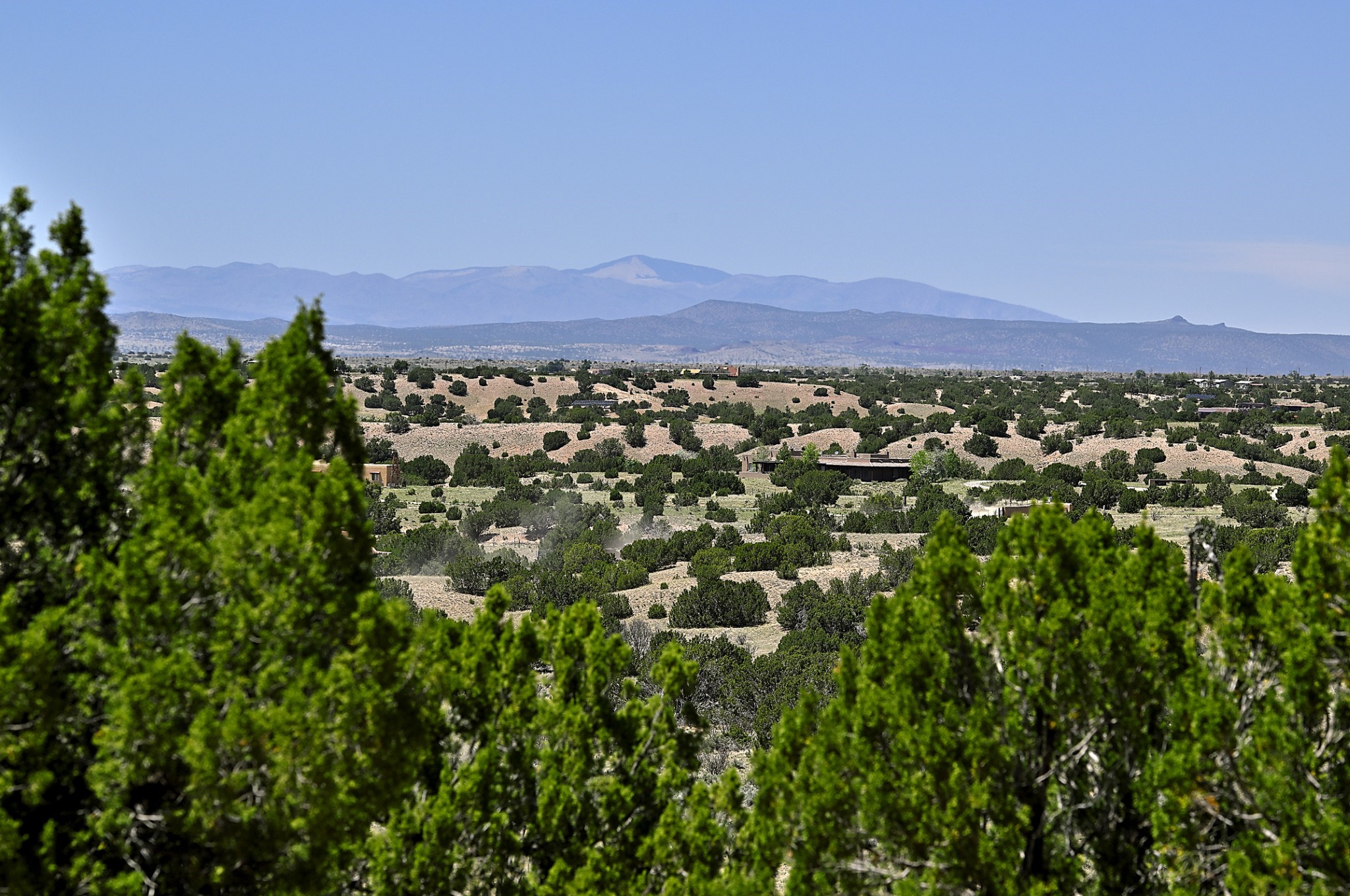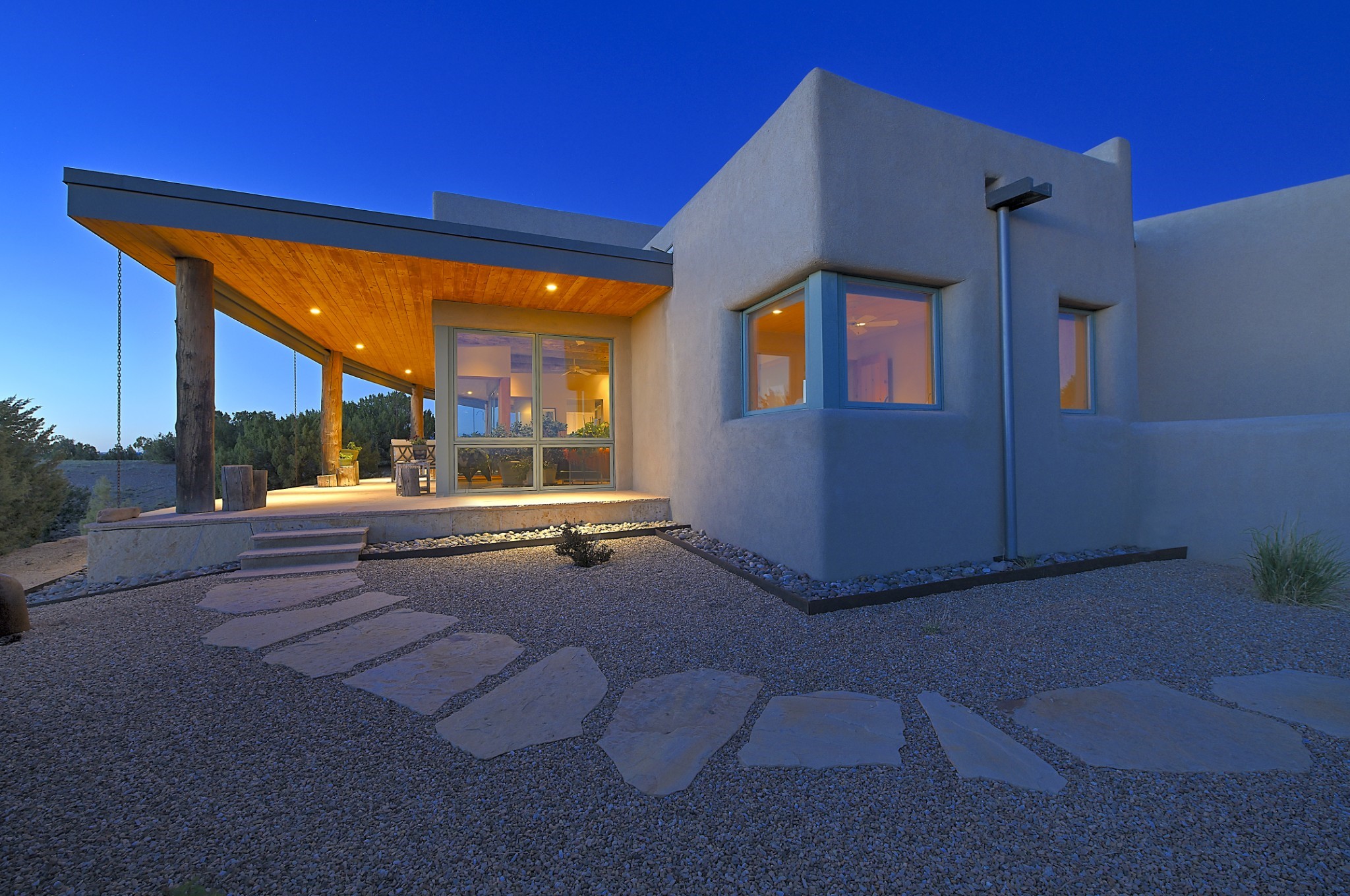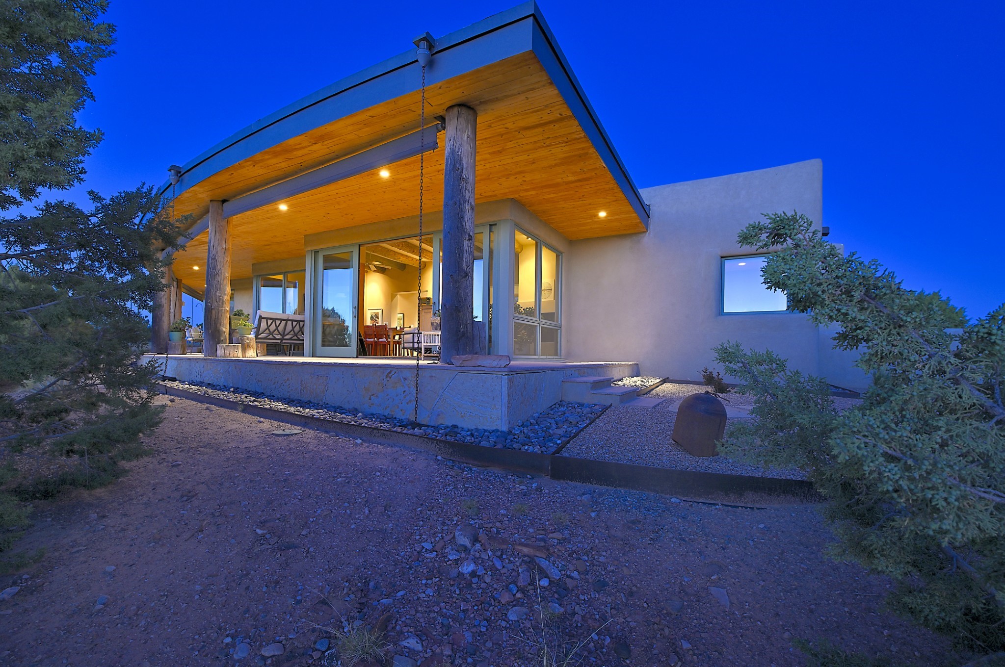 Perched atop a grassy mesa on over 40 acres covering 3 tracts, this 2009 adobe home designed by Ted Turner offers panoramic views of the Sangre de Cristo, Sandia, Jemez, Ortiz Mountain ranges& Mount Taylor. Exuding Santa Fe elegance, with soft contemporary design, featuring concrete floors, diamond-finish clay plaster walls, expansive banks of windows, exposed beams. The chef's kitchen is open and bright, with quartz countertops, a 4-burner range, convection microwave, custom soft-close cabinetry, and pantry. The open-concept layout flows into a curved gallery hallway with indoor-outdoor living and large portals to experience Santa Fe's breathtaking sunsets. Views from every room & excellent separation of bedrooms for privacy and comfort, enjoy radiant in-floor heating, a high-efficiency boiler, a 6,500-gallon rainwater collection system, 12-panel solar array, solar-powered well, and whole-house water filtration as well as a commercial grade roof. The 750-square-foot studio/guest house--built to passive house standard- can be used as an art studio, office, or guest quarters, with south-facing light, concrete floors, a kitchenette, and half-bath. Enjoy a three-car garage with a tall roll-up door, workshop space, and rodent-resistant construction. This an extraordinary retreat just minutes from the heart of Santa Fe--yet worlds away in tranquility and privacy.
