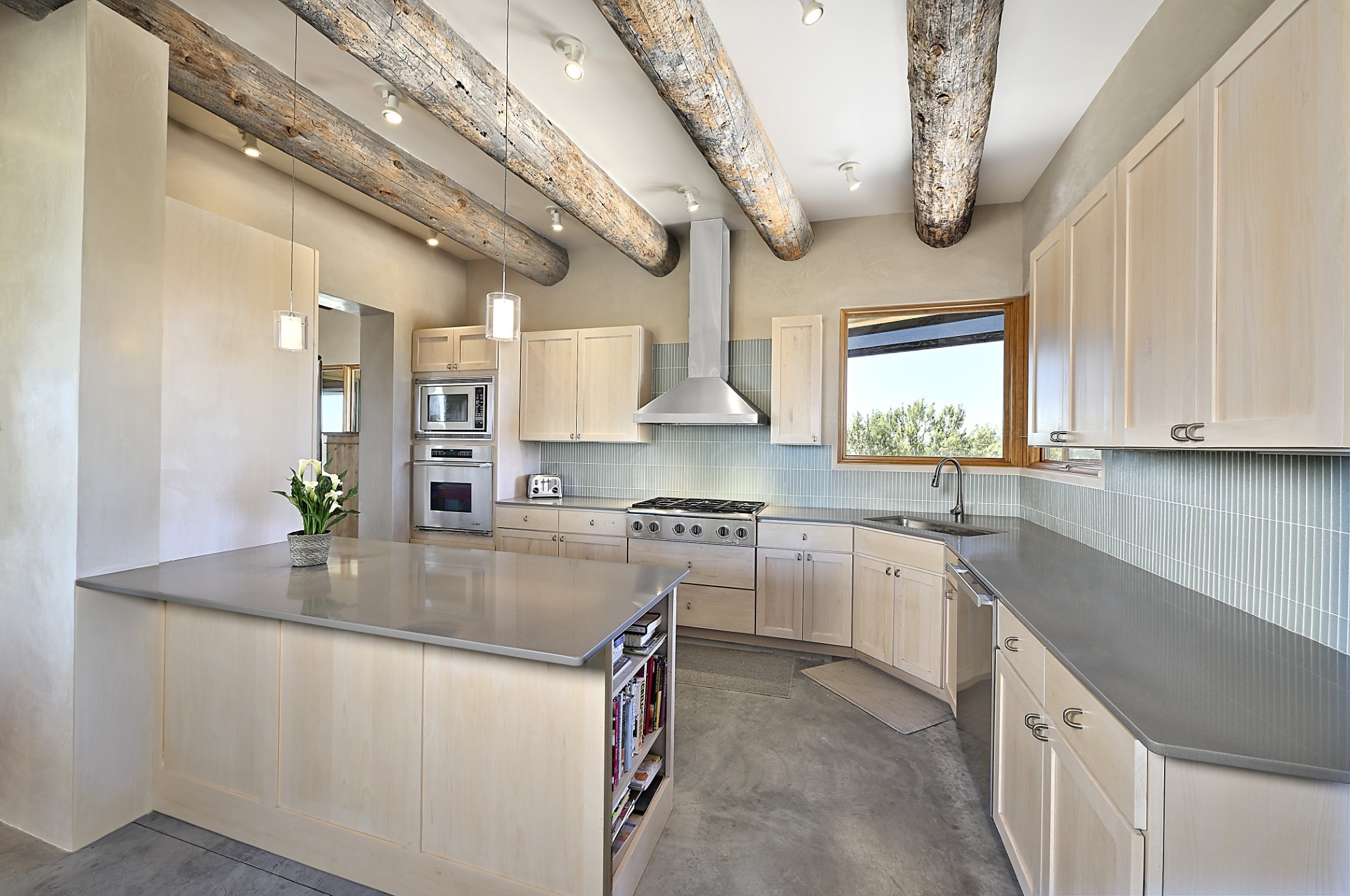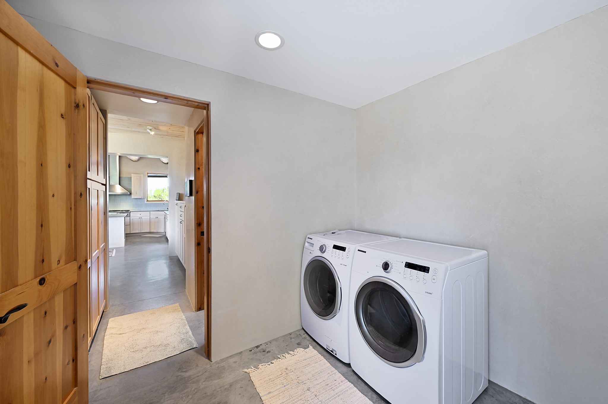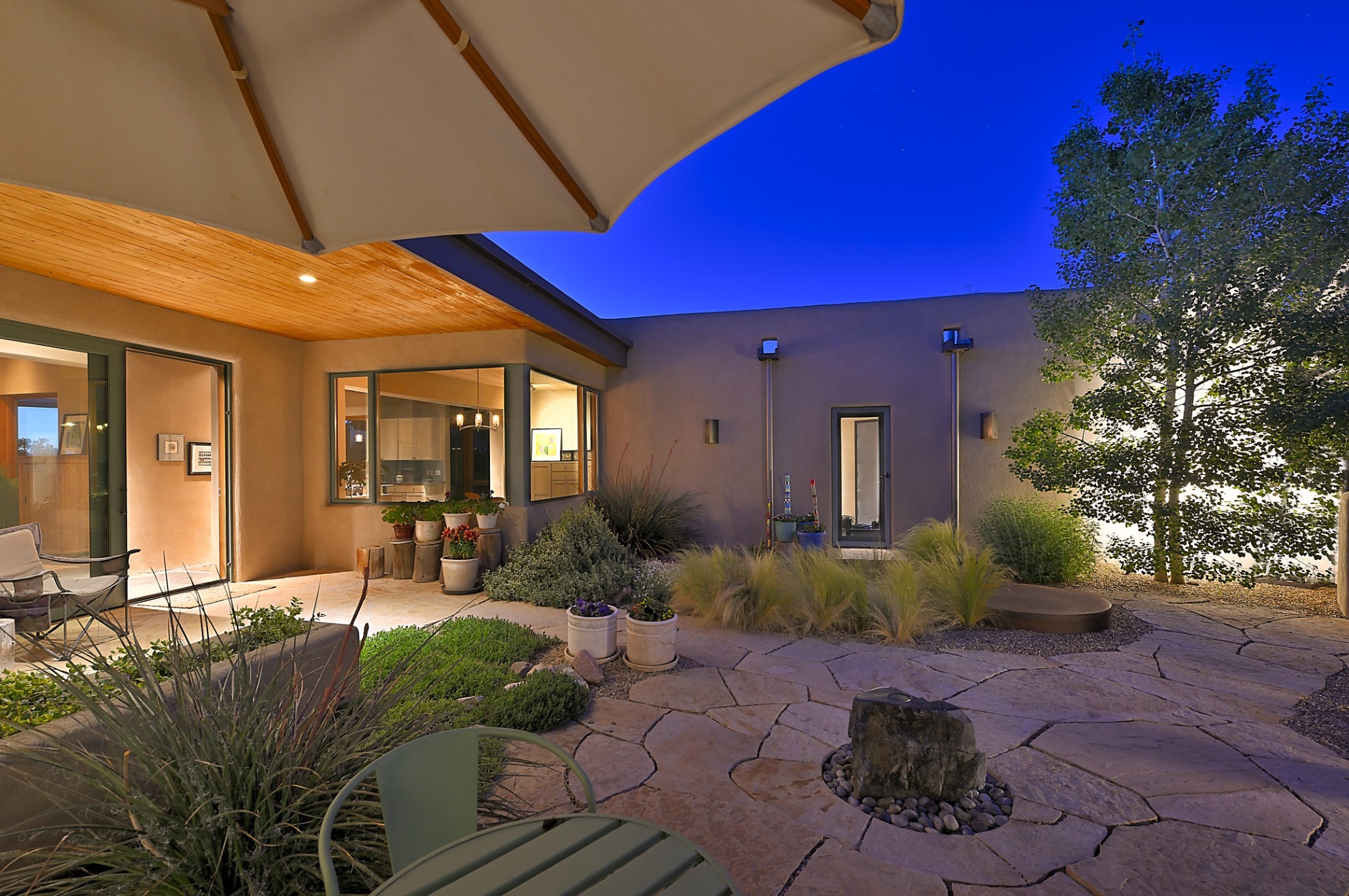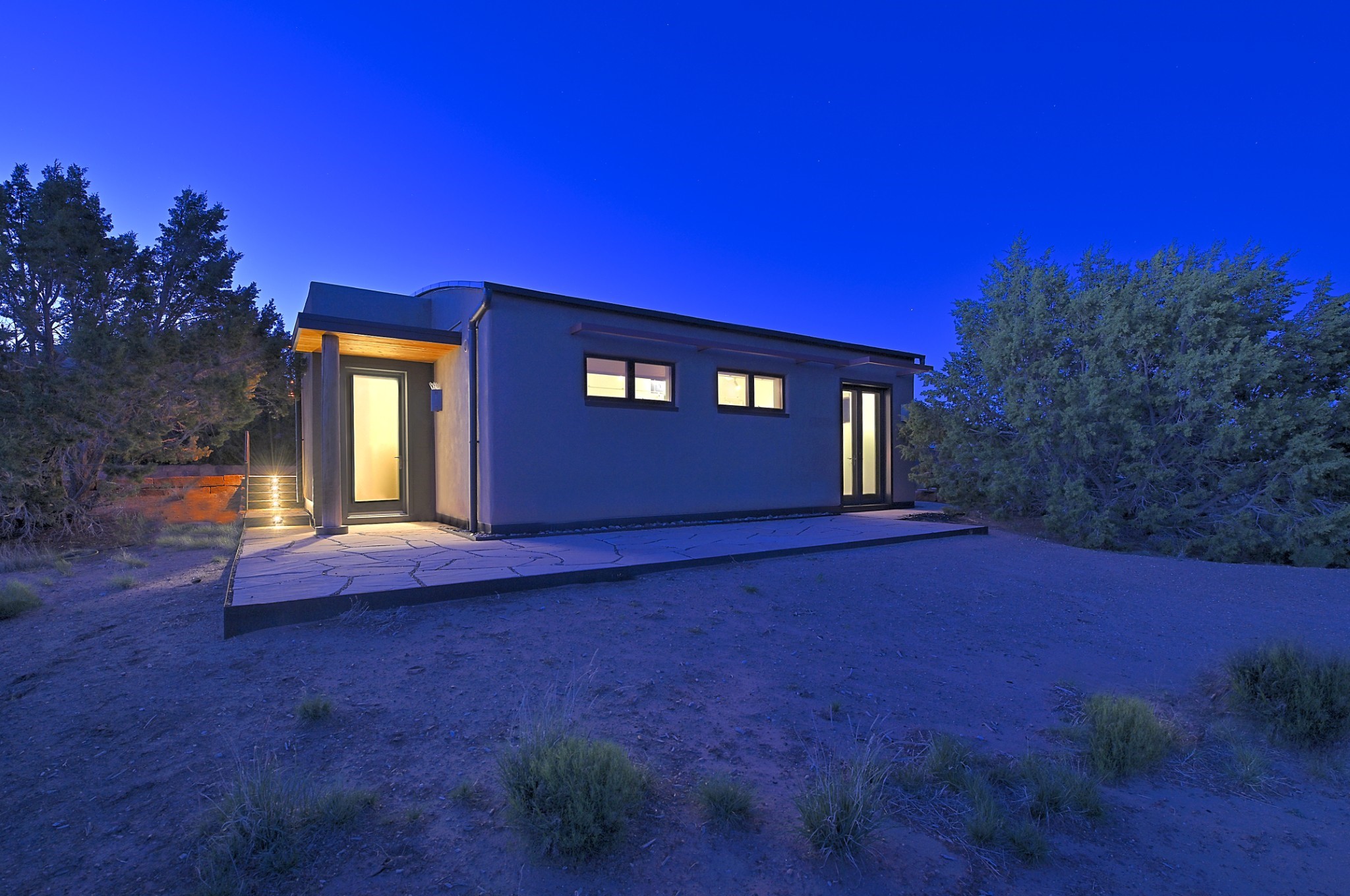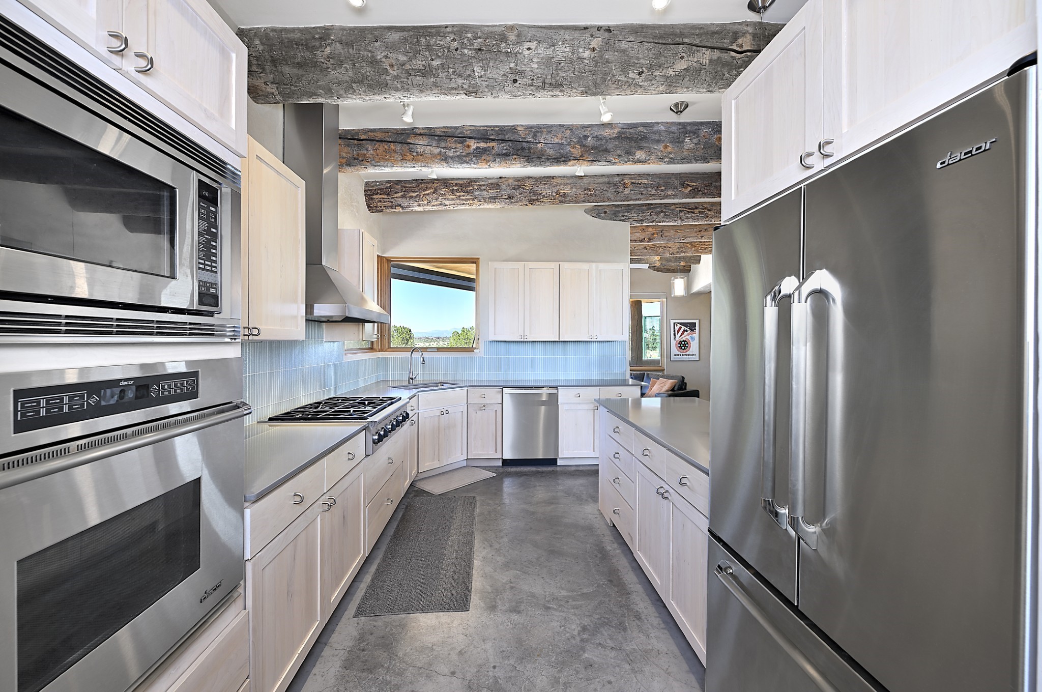 Perched atop a grassy mesa on over 40 acres covering 3 tracts, this 2009 adobe home designed by Ted Turner offers panoramic views of the Sangre de Cristo, Sandia, Jemez, Ortiz Mountain ranges& Mount Taylor. Exuding Santa Fe elegance, with soft contemporary design, featuring concrete floors, diamond-finish clay plaster walls, expansive banks of windows, exposed beams. The chef's kitchen is open and bright, with quartz countertops, a 4-burner range, convection microwave, custom soft-close cabinetry, and pantry. The open-concept layout flows into a curved gallery hallway with indoor-outdoor living and large portals to experience Santa Fe's breathtaking sunsets. Views from every room & excellent separation of bedrooms for privacy and comfort, enjoy radiant in-floor heating, a high-efficiency boiler, a 6,500-gallon rainwater collection system, 12-panel solar array, solar-powered well, and whole-house water filtration as well as a commercial grade roof. The 750-square-foot studio/guest house--built to passive house standard- can be used as an art studio, office, or guest quarters, with south-facing light, concrete floors, a kitchenette, and half-bath. Enjoy a three-car garage with a tall roll-up door, workshop space, and rodent-resistant construction. This an extraordinary retreat just minutes from the heart of Santa Fe--yet worlds away in tranquility and privacy.