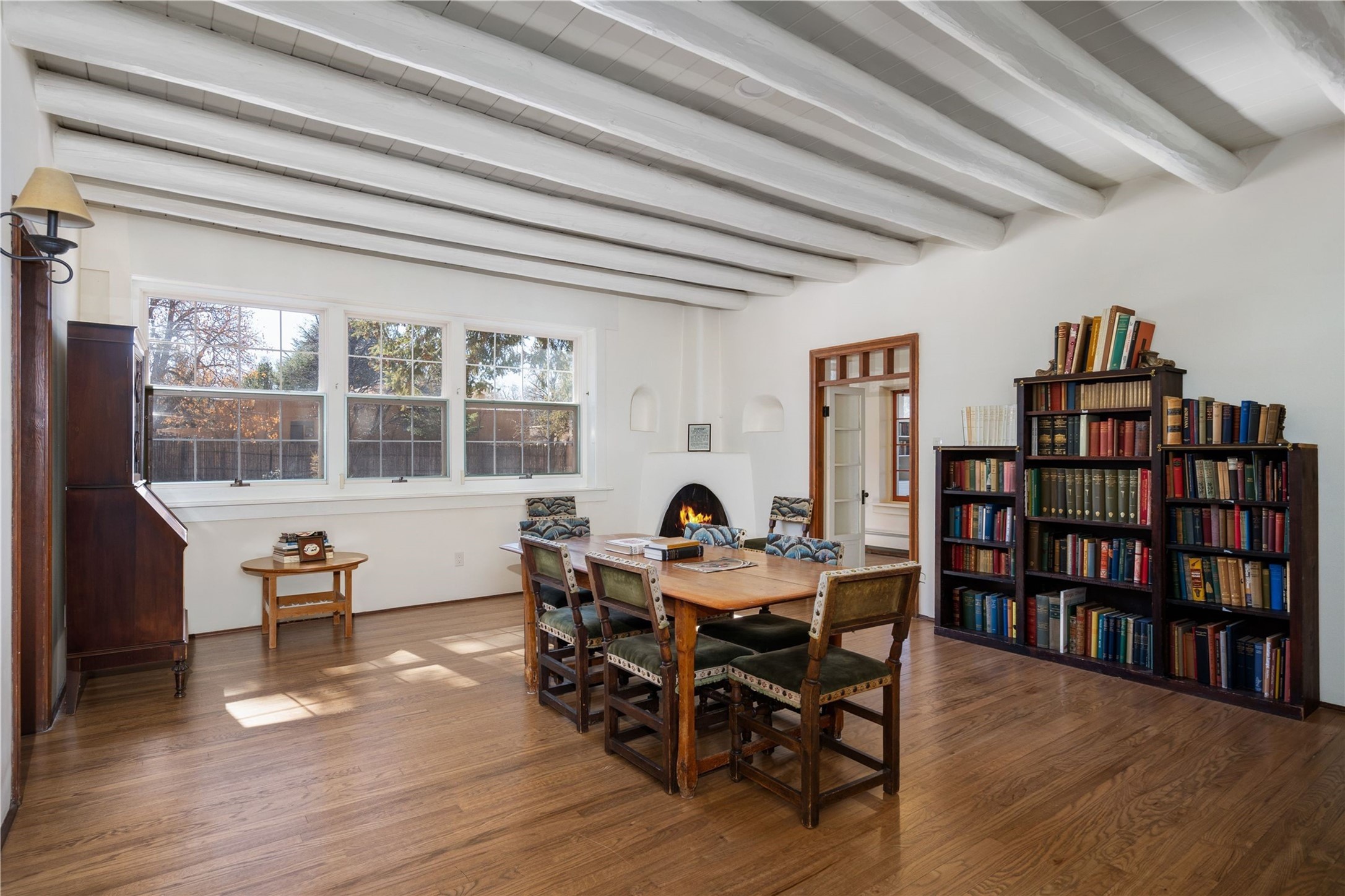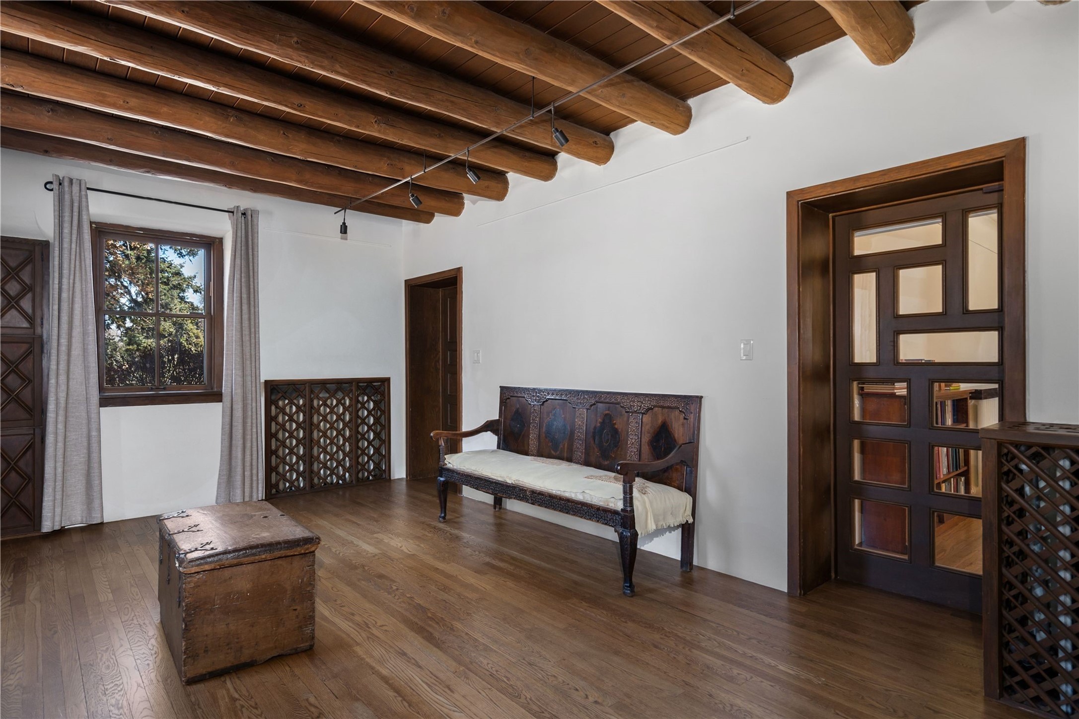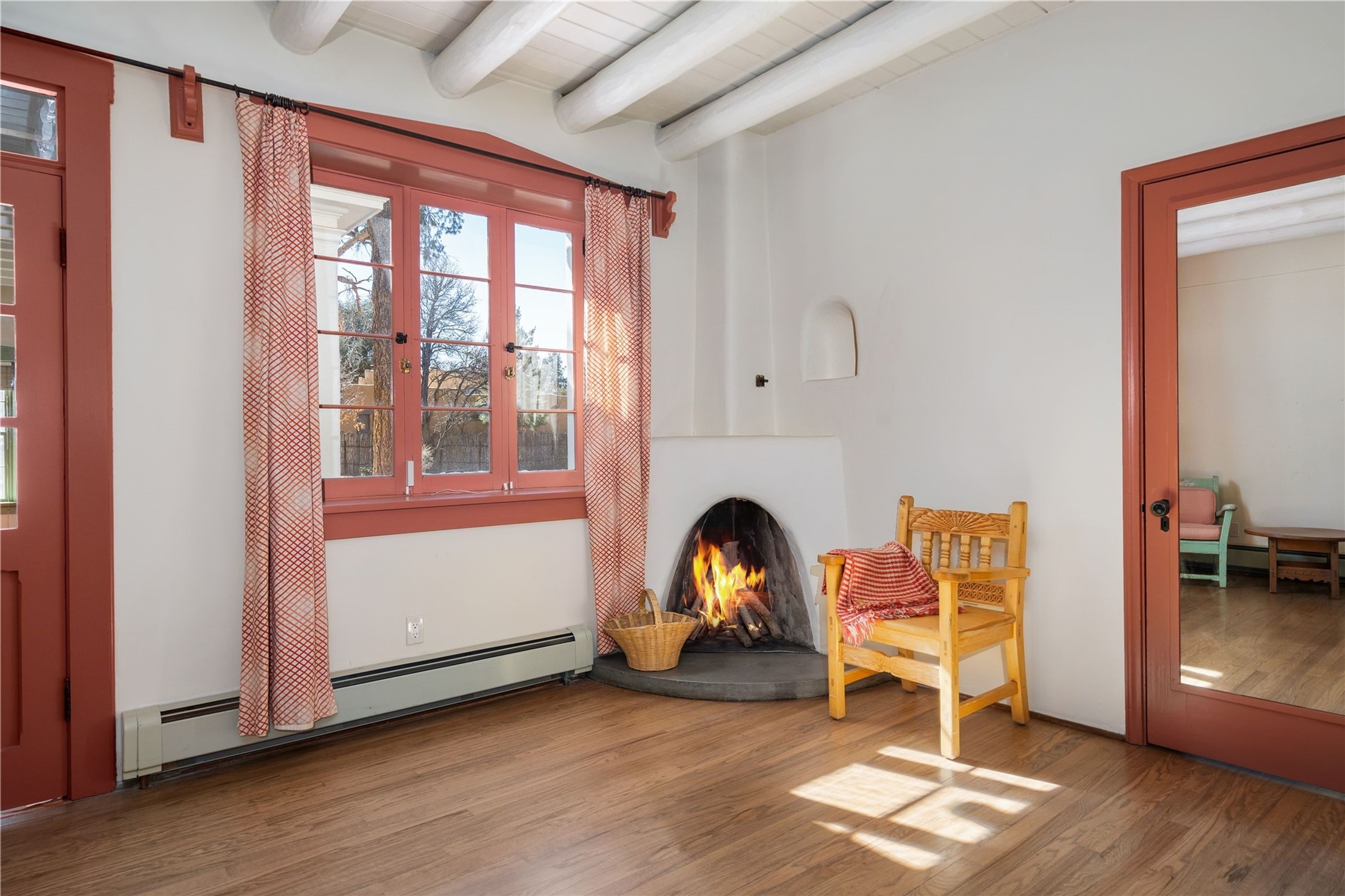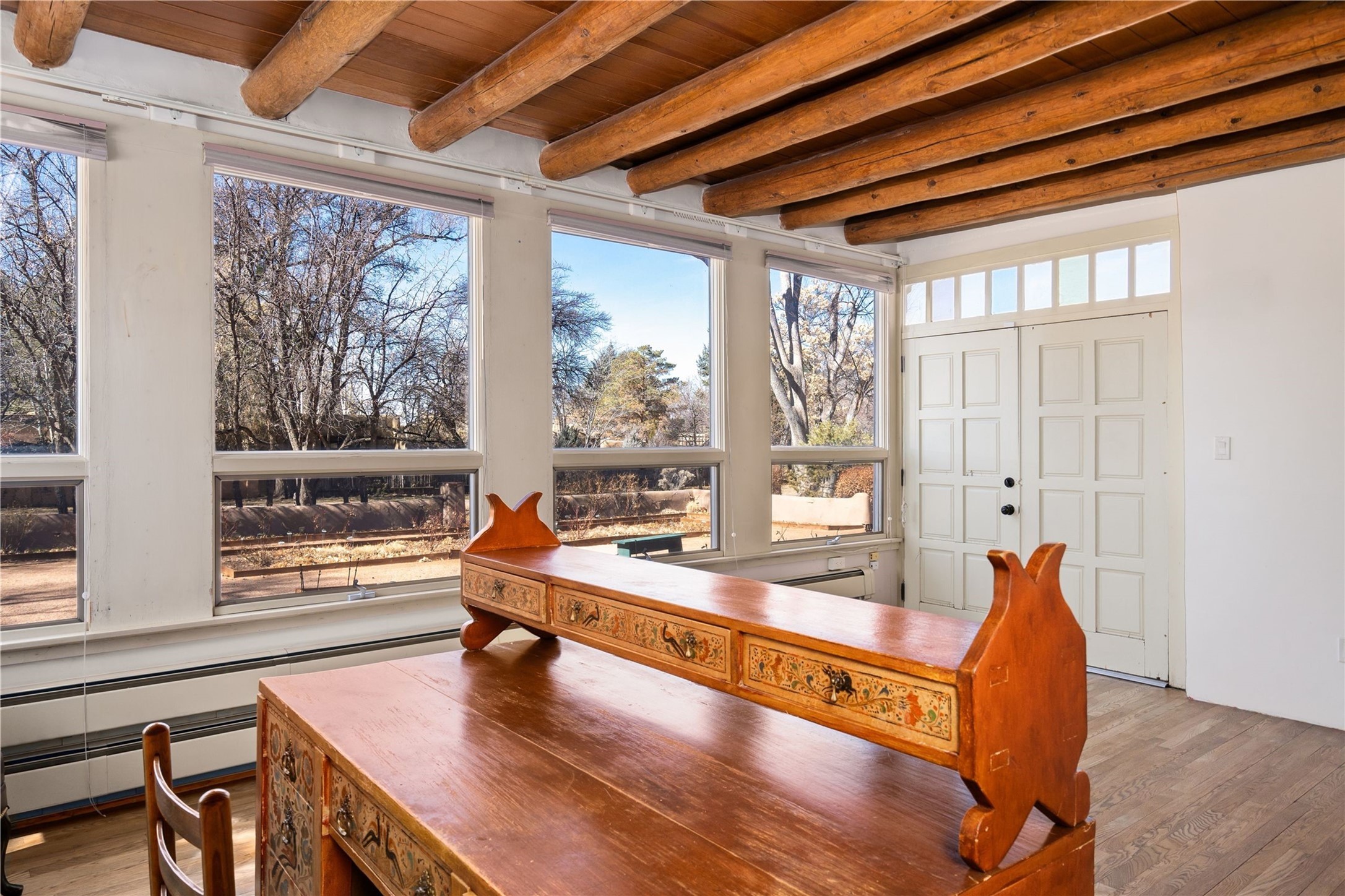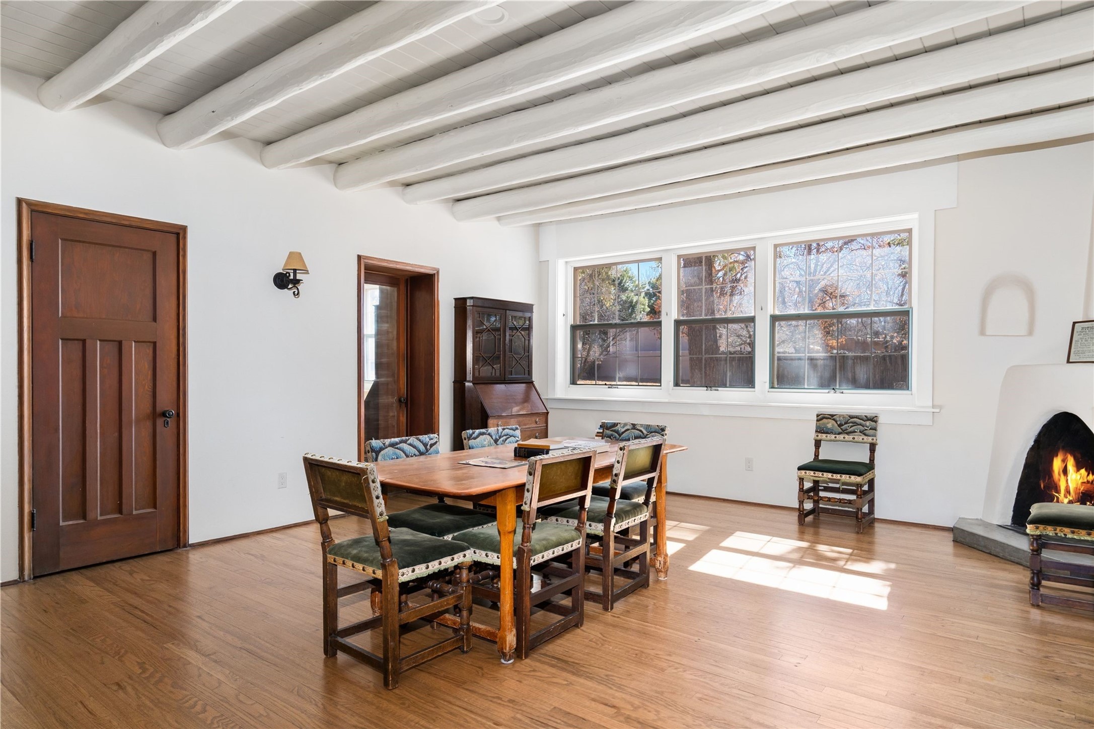 Acquire a treasured piece of Santa Fe history with The Acequia Madre House, a cornerstone and time capsule of Santa Fe's rich cultural and artistic legacy. This truly remarkable estate, built in 1926 by the influential women Eva Scott Fnyes, her daughter Leonora S. M. Curtin, and granddaughter Leonora F. Curtin, is a living museum of fine handcrafted woodwork, sculpted kiva fireplaces, and traditional artistic details. These trailblazing women played a significant role in the "cultural crafting" of Santa Fe, and their legacy is beautifully reflected in the exquisite workmanship of this extraordinary property. Set on just over 3 acres within the esteemed Camino del Monte Sol Historic District, The Acequia Madre House features a spacious 5,450 sq ft main house alongside a 2,313 sq ft carriage house. Recognized by both federal and state historic preservation authorities, the main house embodies the rich heritage of the region. Designed in classic Old Santa Fe Style, the single-story structure showcases territorial elements that capture the essence of Southwestern architecture. Inside, the main house offers an array of inviting spaces, from cozy to grand, including a spacious living room that serves as the perfect gathering place, an elegant dining room, and a study that provides a quiet retreat for work or reflection. Two luminous sunrooms create serene spots to enjoy the beautiful natural surroundings. The estate includes a one-car garage as well as parking for up to 13 vehicles. The property is adorned with mature trees and features a large lawn. Conveniently located just moments away from iconic Canyon Road and the historic downtown plaza, this architectural and historical showpiece is unequaled in its entertaining and artistic potential. Being offered below appraisal.