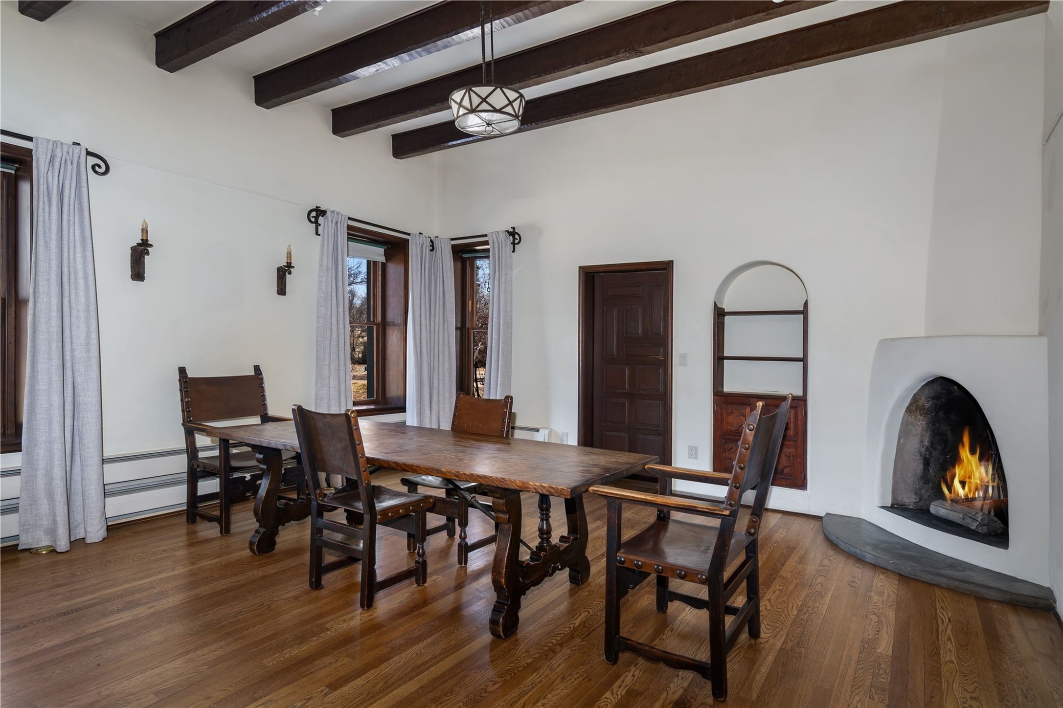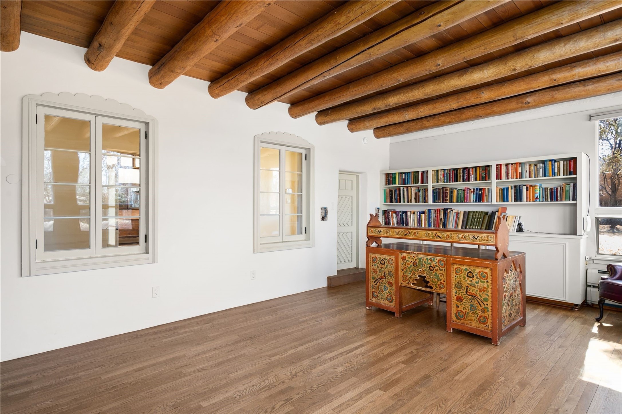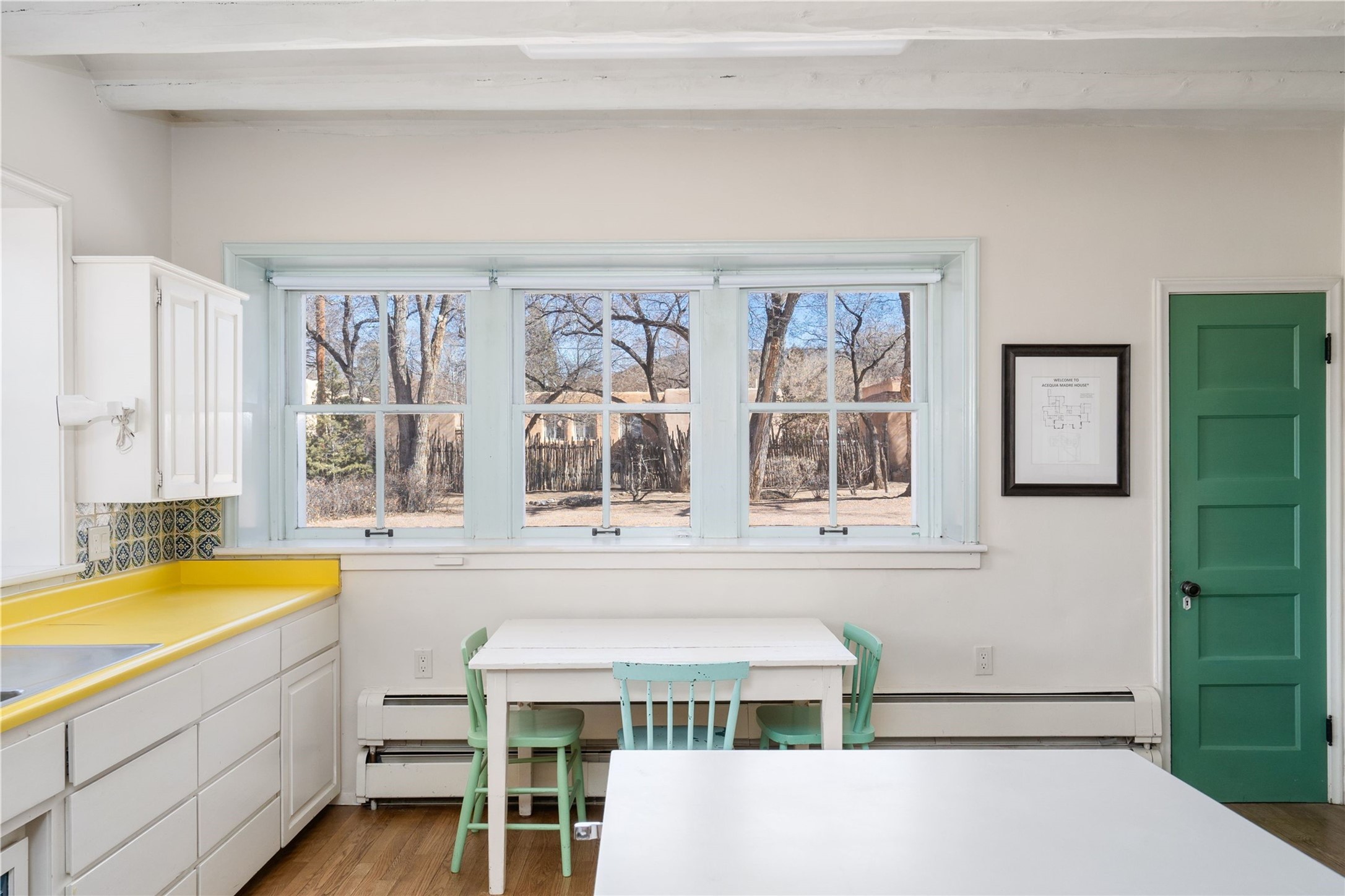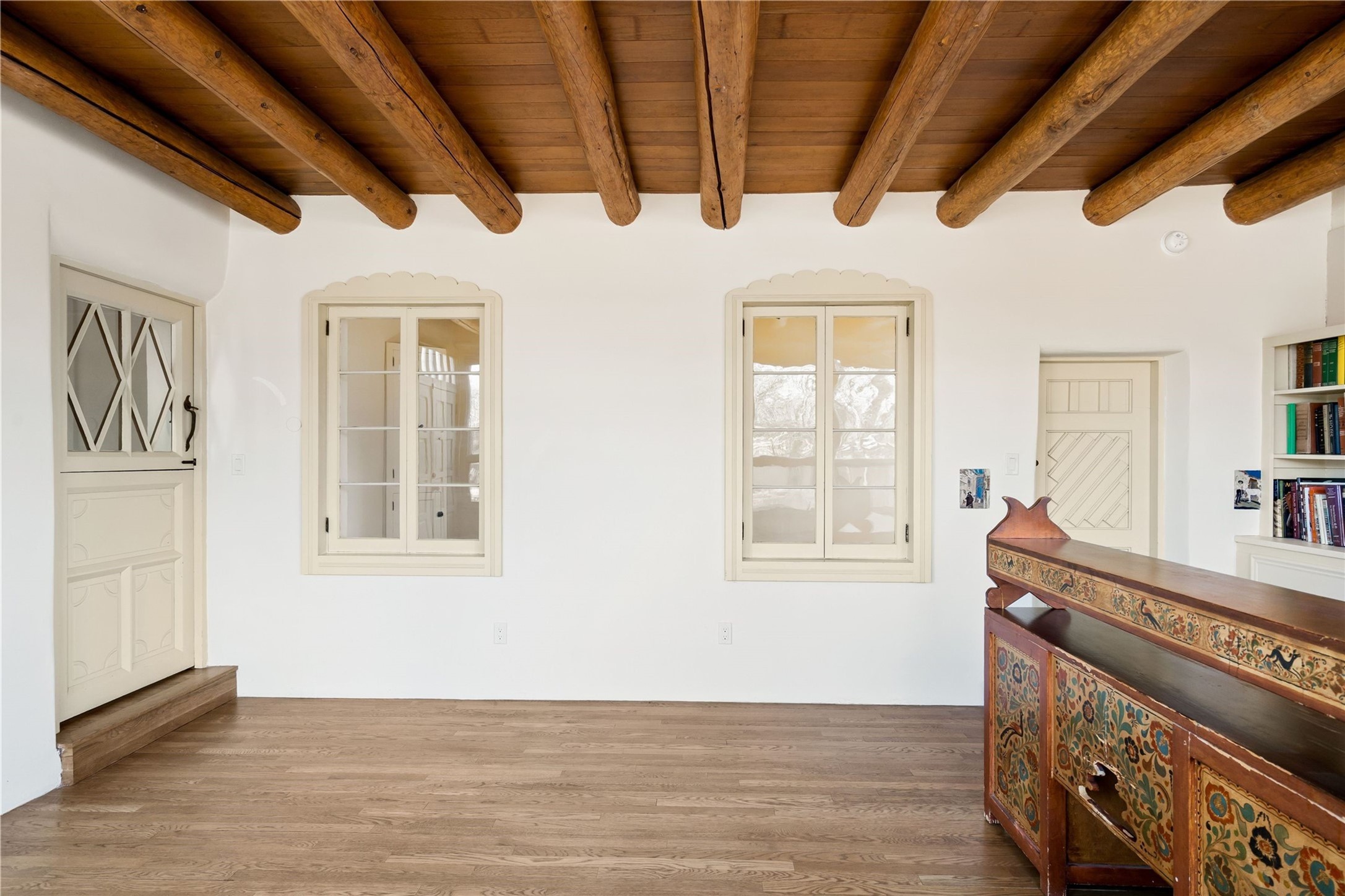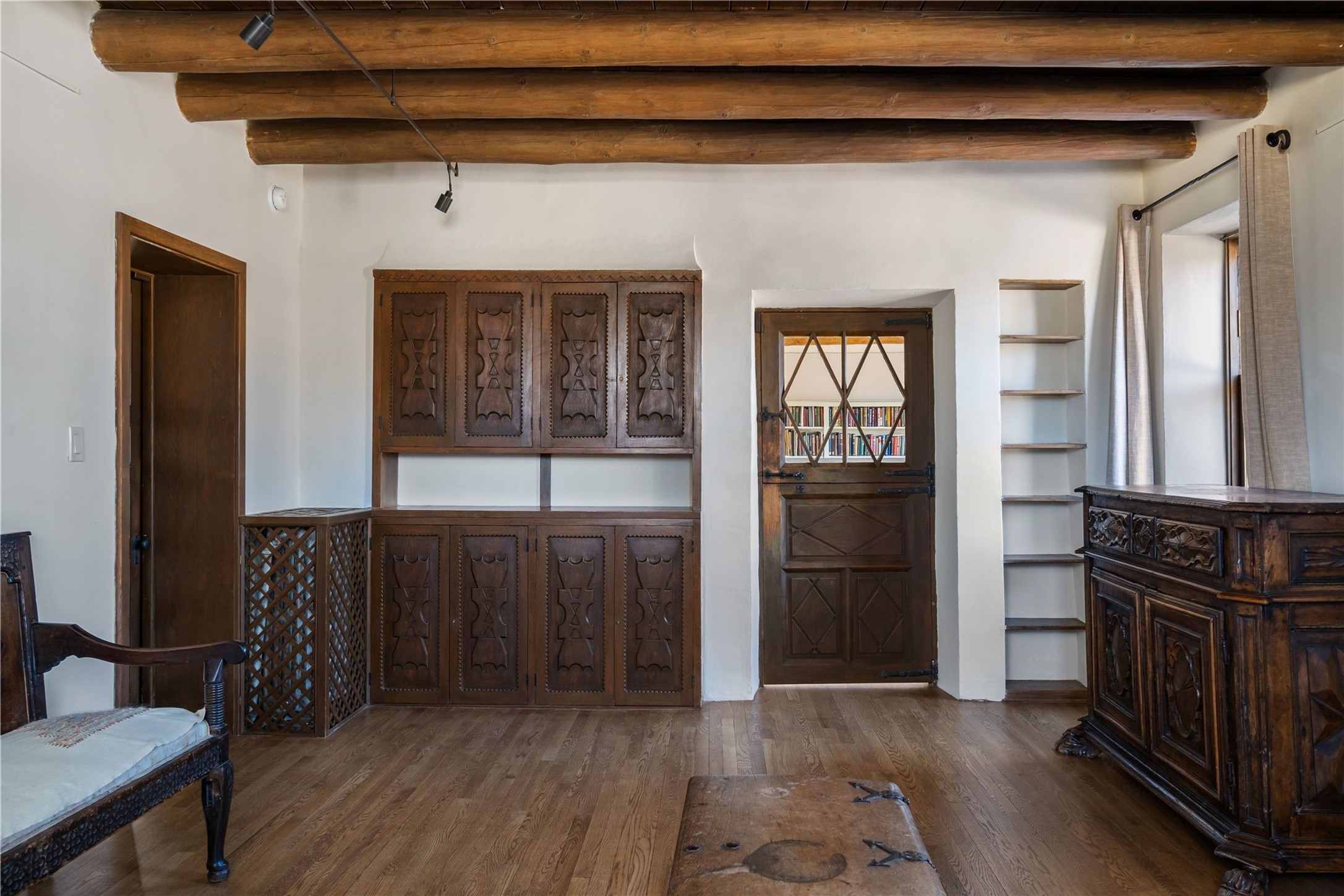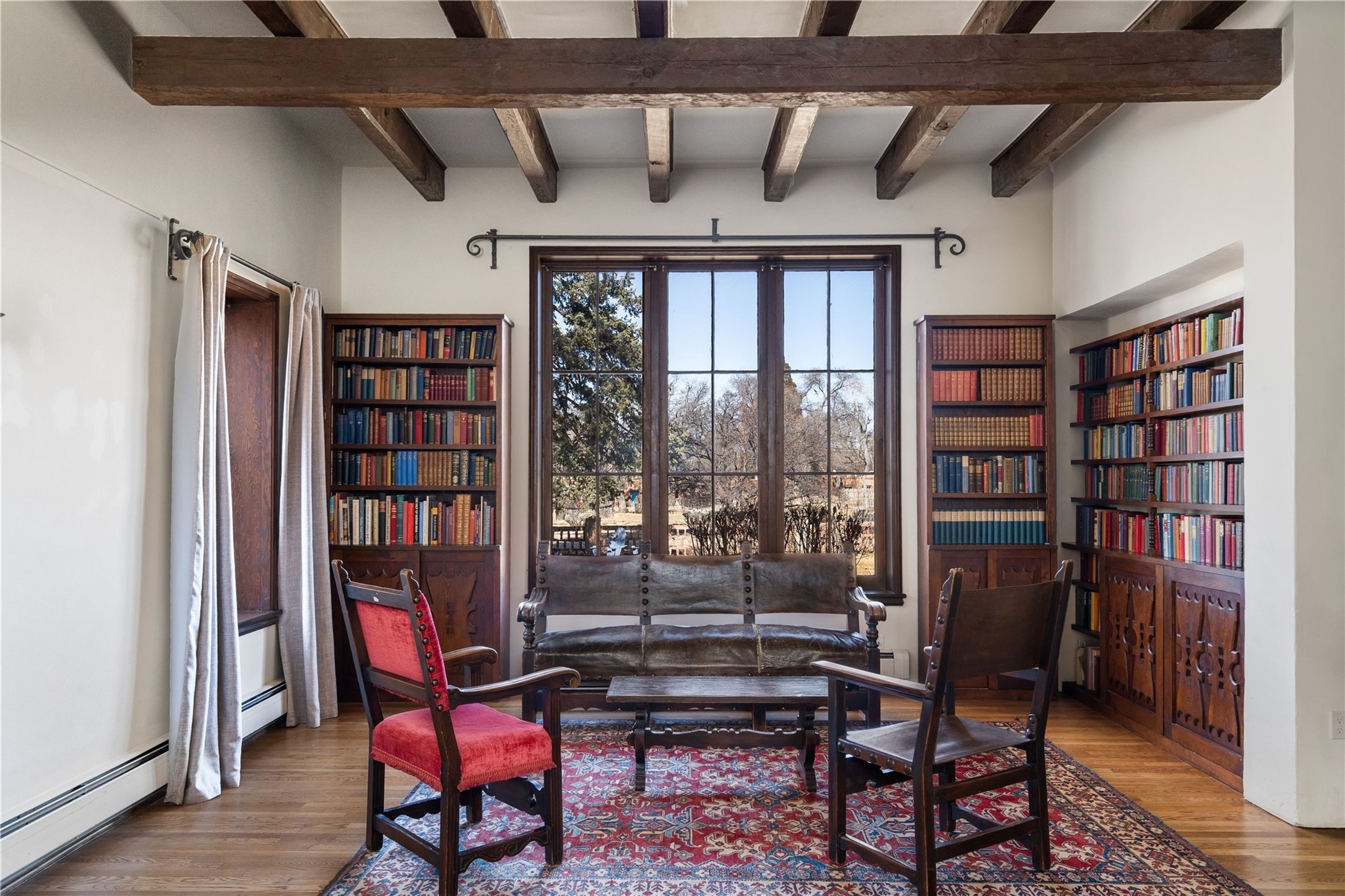 Acquire a treasured piece of Santa Fe history with The Acequia Madre House, a cornerstone and time capsule of Santa Fe's rich cultural and artistic legacy. This truly remarkable estate, built in 1926 by the influential women Eva Scott Fnyes, her daughter Leonora S. M. Curtin, and granddaughter Leonora F. Curtin, is a living museum of fine handcrafted woodwork, sculpted kiva fireplaces, and traditional artistic details. These trailblazing women played a significant role in the "cultural crafting" of Santa Fe, and their legacy is beautifully reflected in the exquisite workmanship of this extraordinary property. Set on just over 3 acres within the esteemed Camino del Monte Sol Historic District, The Acequia Madre House features a spacious 5,450 sq ft main house alongside a 2,313 sq ft carriage house. Recognized by both federal and state historic preservation authorities, the main house embodies the rich heritage of the region. Designed in classic Old Santa Fe Style, the single-story structure showcases territorial elements that capture the essence of Southwestern architecture. Inside, the main house offers an array of inviting spaces, from cozy to grand, including a spacious living room that serves as the perfect gathering place, an elegant dining room, and a study that provides a quiet retreat for work or reflection. Two luminous sunrooms create serene spots to enjoy the beautiful natural surroundings. The estate includes a one-car garage as well as parking for up to 13 vehicles. The property is adorned with mature trees and features a large lawn. Conveniently located just moments away from iconic Canyon Road and the historic downtown plaza, this architectural and historical showpiece is unequaled in its entertaining and artistic potential. Being offered below appraisal.