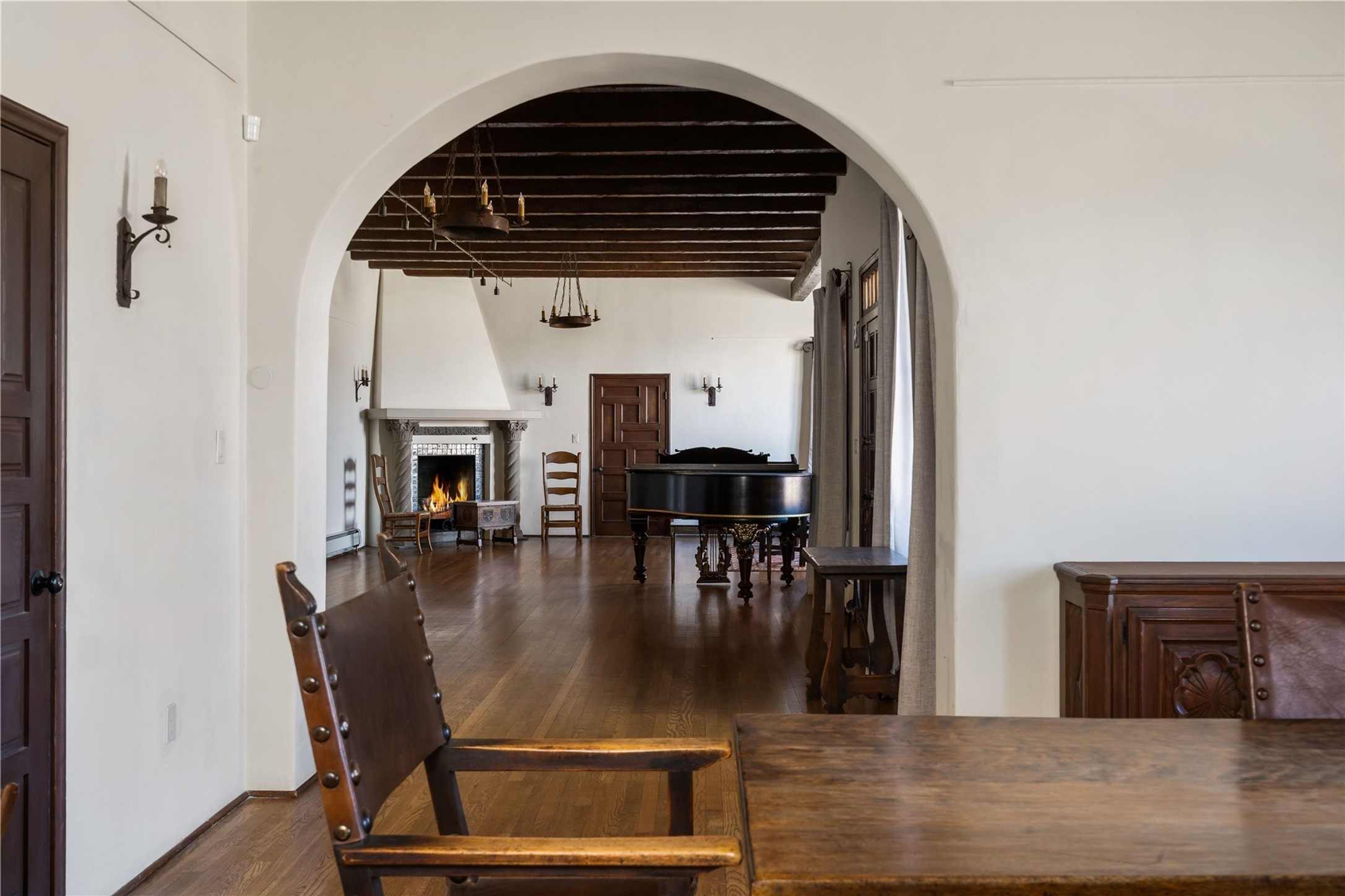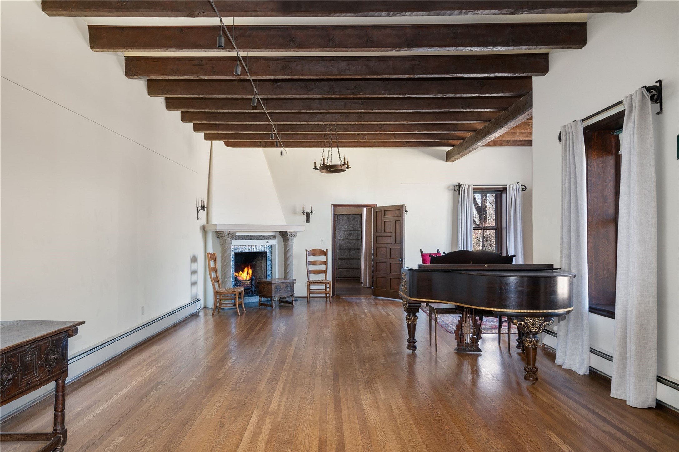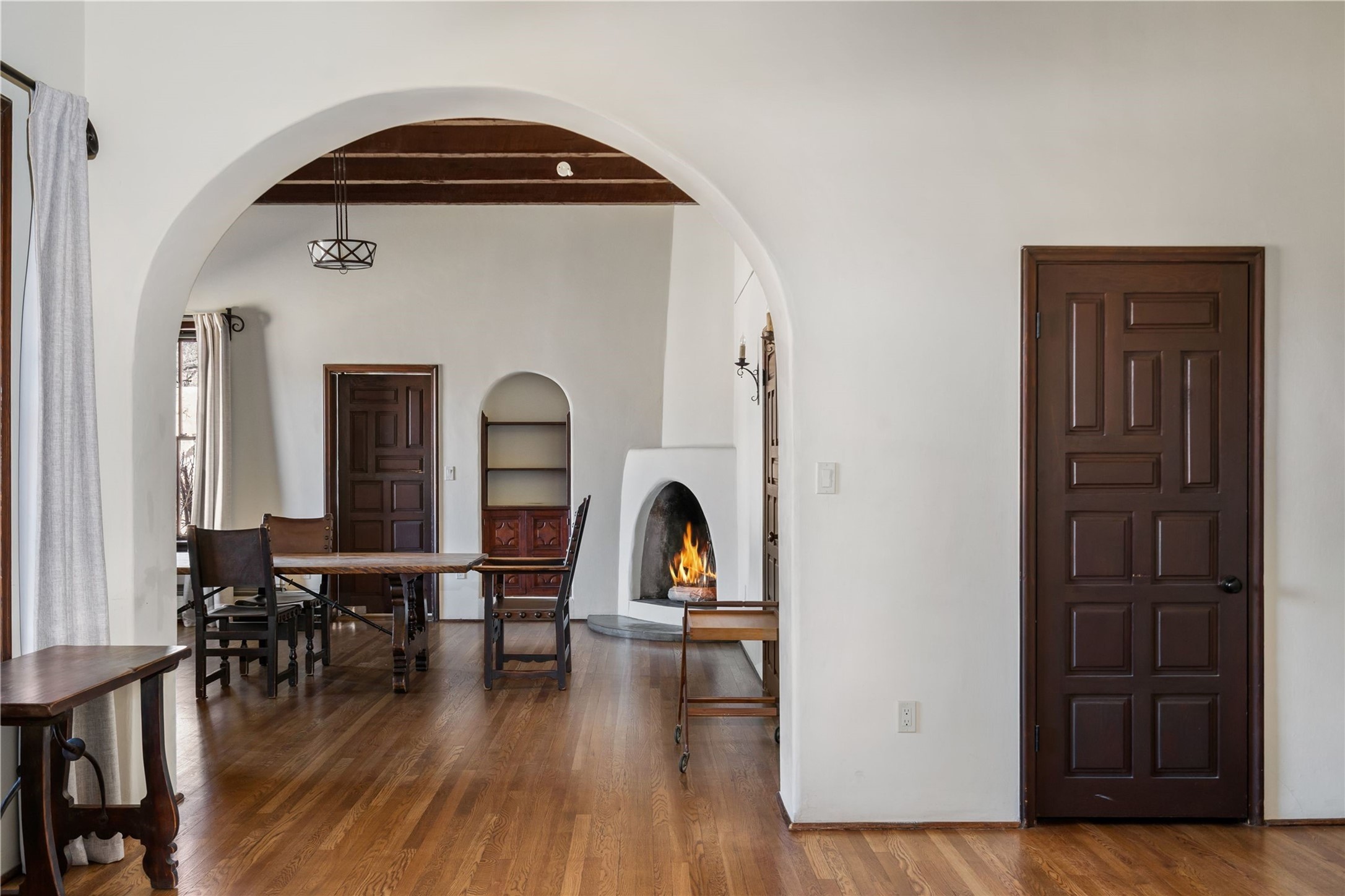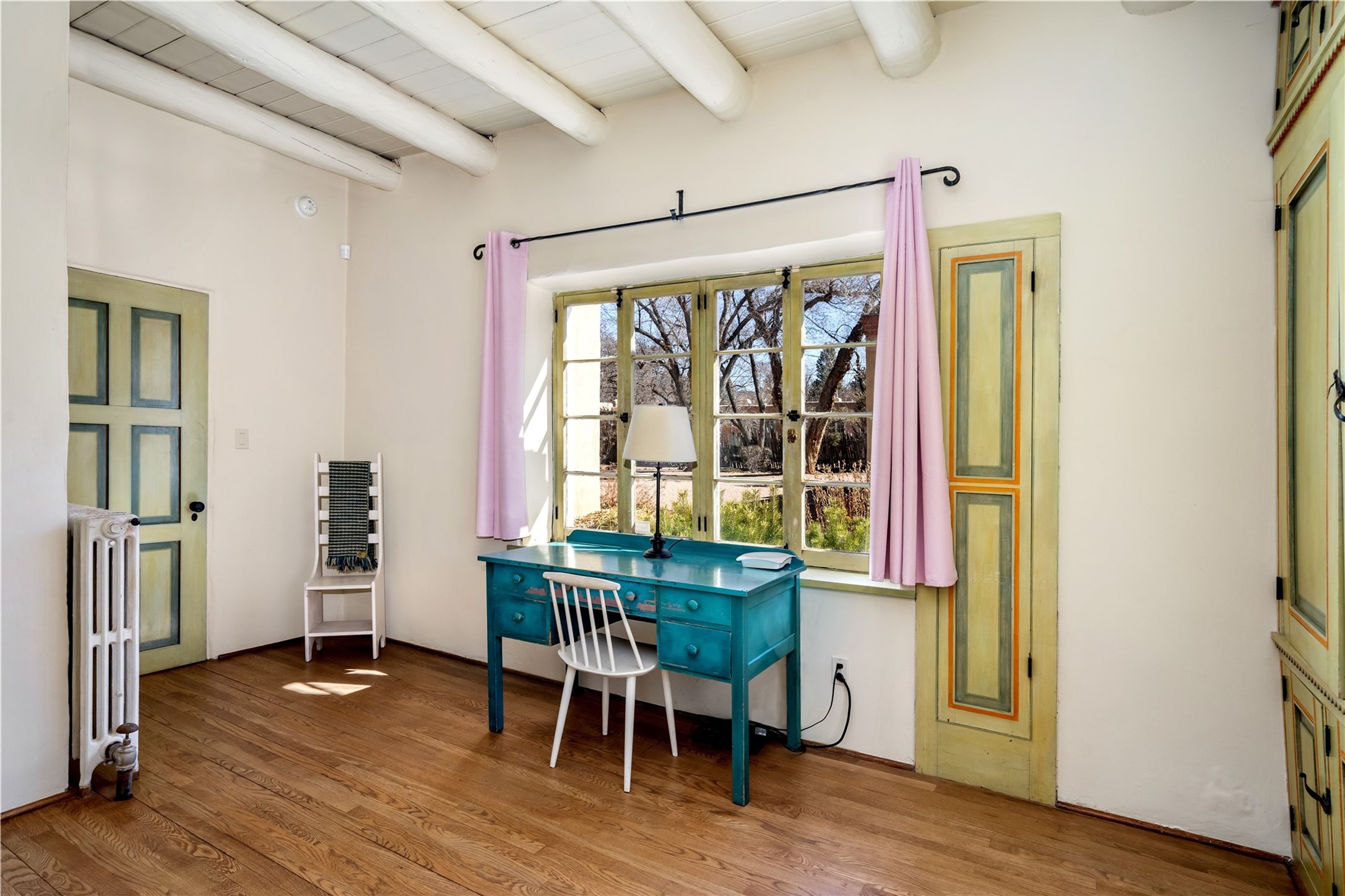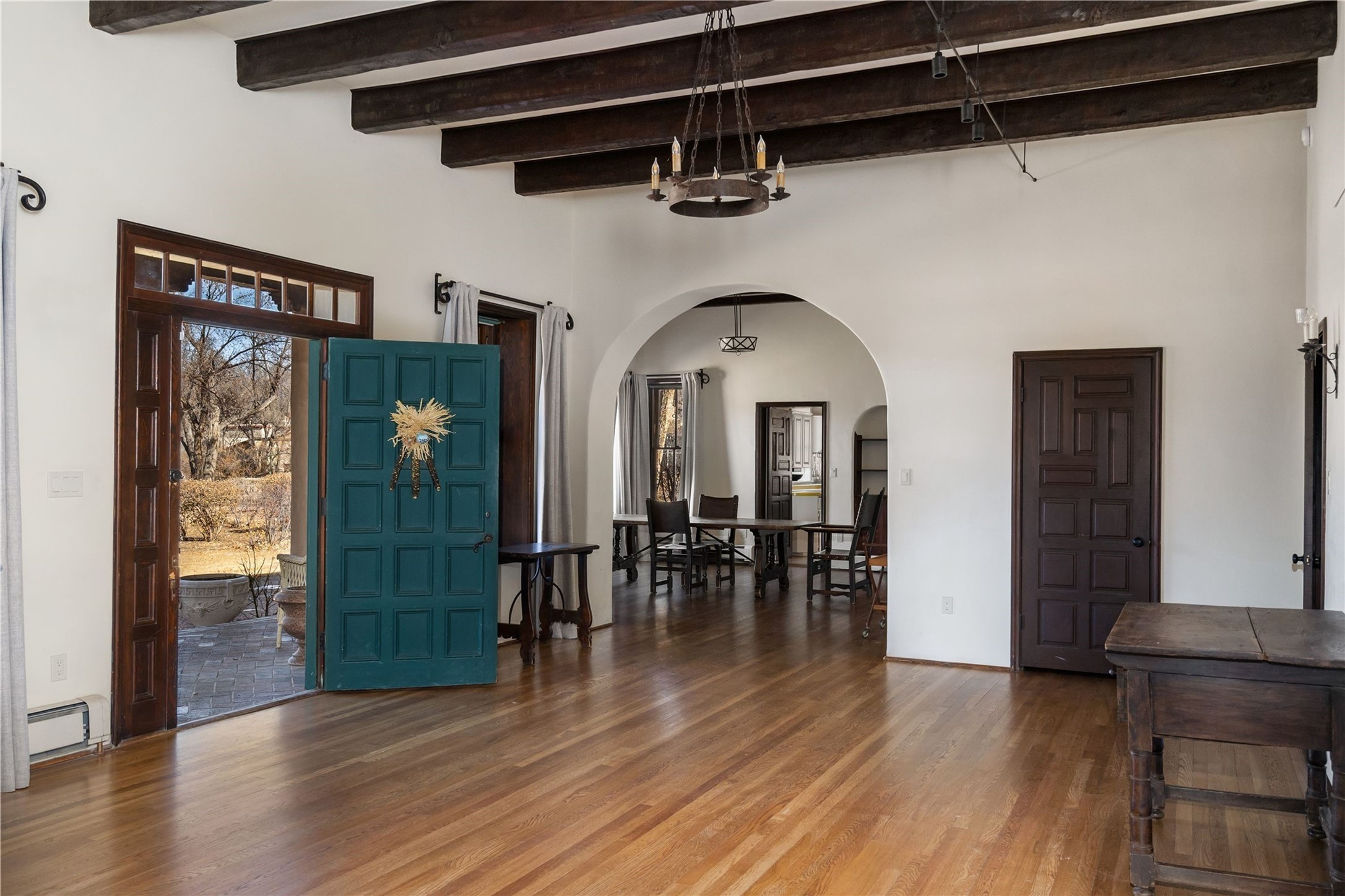 Acquire a treasured piece of Santa Fe history with The Acequia Madre House, a cornerstone and time capsule of Santa Fe's rich cultural and artistic legacy. This truly remarkable estate, built in 1926 by the influential women Eva Scott Fnyes, her daughter Leonora S. M. Curtin, and granddaughter Leonora F. Curtin, is a living museum of fine handcrafted woodwork, sculpted kiva fireplaces, and traditional artistic details. These trailblazing women played a significant role in the "cultural crafting" of Santa Fe, and their legacy is beautifully reflected in the exquisite workmanship of this extraordinary property. Set on just over 3 acres within the esteemed Camino del Monte Sol Historic District, The Acequia Madre House features a spacious 5,450 sq ft main house alongside a 2,313 sq ft carriage house. Recognized by both federal and state historic preservation authorities, the main house embodies the rich heritage of the region. Designed in classic Old Santa Fe Style, the single-story structure showcases territorial elements that capture the essence of Southwestern architecture. Inside, the main house offers an array of inviting spaces, from cozy to grand, including a spacious living room that serves as the perfect gathering place, an elegant dining room, and a study that provides a quiet retreat for work or reflection. Two luminous sunrooms create serene spots to enjoy the beautiful natural surroundings. The estate includes a one-car garage as well as parking for up to 13 vehicles. The property is adorned with mature trees and features a large lawn. Conveniently located just moments away from iconic Canyon Road and the historic downtown plaza, this architectural and historical showpiece is unequaled in its entertaining and artistic potential. Being offered below appraisal.
