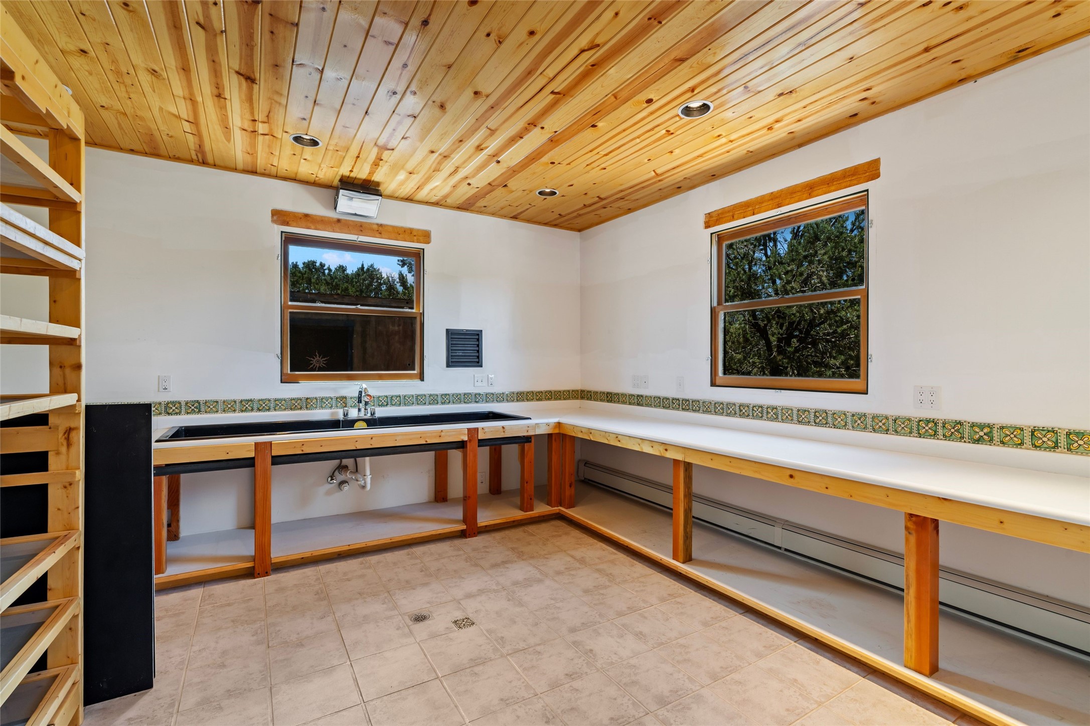 Sited on two and a half acres in a pastoral setting with pretty Sangre de Cristo mountain views, this charming Pueblo style adobe home offers traditional architectural details such as beautiful wood ceilings of vigas and latillas, also coved ceilings with vigas, plaster walls, solid wood doors, wooden lintels, brick and Saltillo tile floors, Talavera tile, and a kiva fireplace. The property features beautiful large pine trees, an enclosed yard with pretty plantings and lovely flower gardens, and a synthetic wood deck. The owner has added an art studio, which has blackout window coverings, so it can be used as a dark room as well. The original infrastructure was upgraded, the electrical system, new mechanical room added with hot water tank and boiler, roof and stucco, and the well was recently maintained with new pressure tanks installed. There's also a small horse barn on the lot.