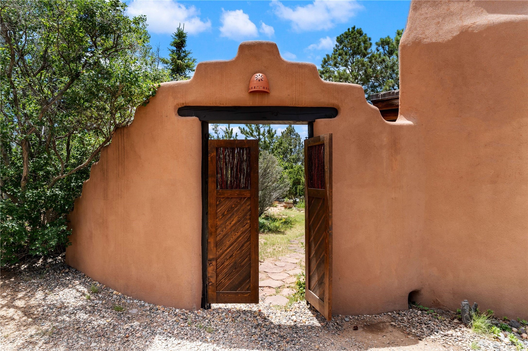 Sited on two and a half acres in a bucolic rural setting with pretty Sangre de Cristo mountain views, this charming Pueblo style adobe home offers traditional architectural details such as beautiful wood ceilings of vigas and latillas, also coved ceilings with vigas, plaster walls, solid wood doors, wooden lintels, brick and Saltillo tile floors, Talavera tile, and a kiva fireplace. The property features beautiful large pine trees, an enclosed yard with perennial plantings and lovely flower gardens, and a synthetic wood deck. The studio space is fitted with blackout window coverings, so it can be used as a dark room as well. The original infrastructure has been upgraded: the electrical system, new mechanical room with boiler and water heater, roof and stucco, and the well was recently maintained with new pressure tanks installed. There's also a small horse barn on the lot. Quintessential Santa Fe!