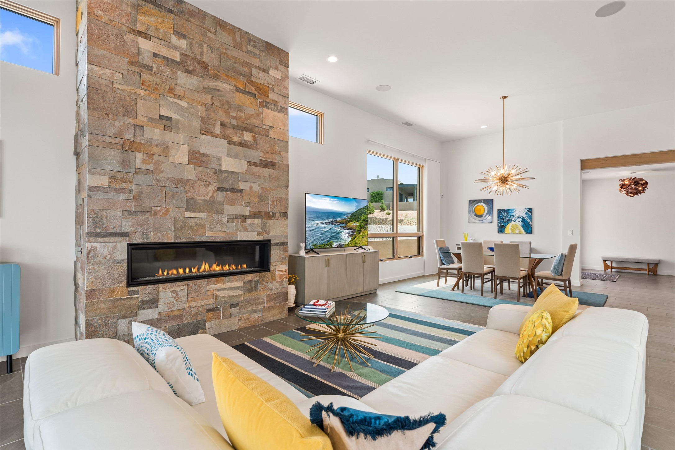 Accepting backup offers. Nestled in the prestigious Las Campanas gated community, this nearly new home offers breathtaking sunset & golf course views. Meticulously upgraded by the discerning owners, this residence boasts superior craftsmanship & thoughtful design. Energy efficient with Anderson 400 series windows & the convenience of an oversized, climate-controlled three car garage (Pre-wired for EV charger). The open concept floor plan flows seamlessly from the gourmet kitchen, featuring undermount lighting, quartz countertops with waterfall edge, Viking appliances, & a walk-in pantry, to the expansive dining & living areas. Imagine cozy evenings by the contemporary gas fireplace with its striking stacked stone wall, surrounded by large sliders leading to multiple outdoor living spaces. Electric Hunter Douglas shades in the living & dining rooms, while a built-in Sonos sound system enhances the ambiance in the living room, primary bedroom, & patio. Retreat to the primary bedroom, a sanctuary of relaxation with its private portal offering million dollar sunset & golf course vistas. The luxurious primary bath features a curbless walk-in shower, soaking tub, dual sinks & walk-in closet. A convenient access door leads from the primary closet to the laundry room, complete with a utility sink, custom cabinetry, and Electrolux washer/dryer. The secondary bedrooms are on a separate wing for enhanced privacy & floating vanities add a touch of modern elegance to the half bath and guest bath. The large third bedroom & guest bath may be closed off for added quietness. Soft-close drawers & cabinets throughout the entire home - custom-built closet systems in all three bedrooms. Security system w/ 6 cameras. Enjoy the outdoors with four distinct living spaces, including one at the front & three at the rear, showcasing direct views of the Jemez Mountains, stunning western sunsets, & golf course. Situated on the largest lot on the street, this home offers unparalleled privacy.