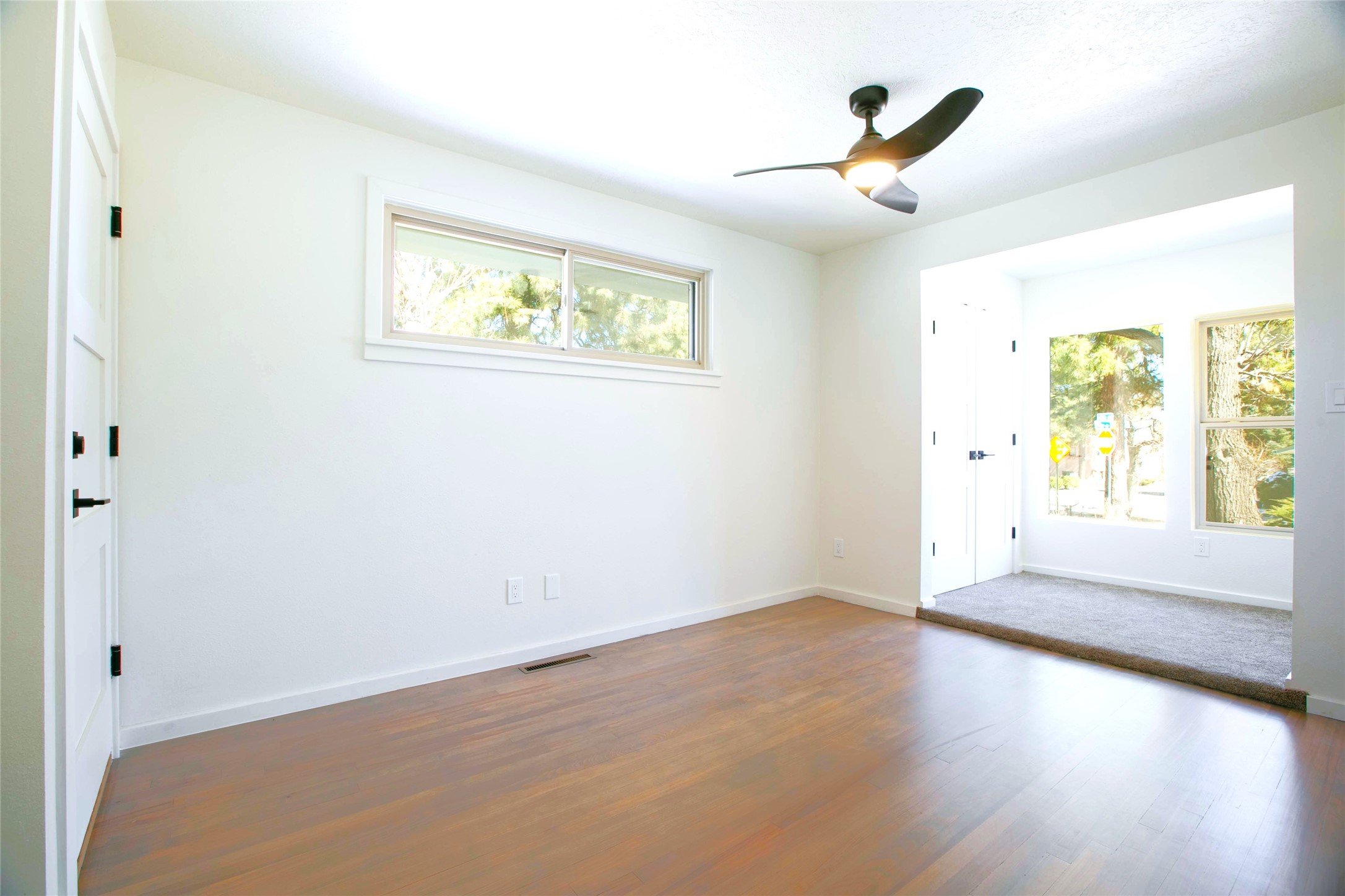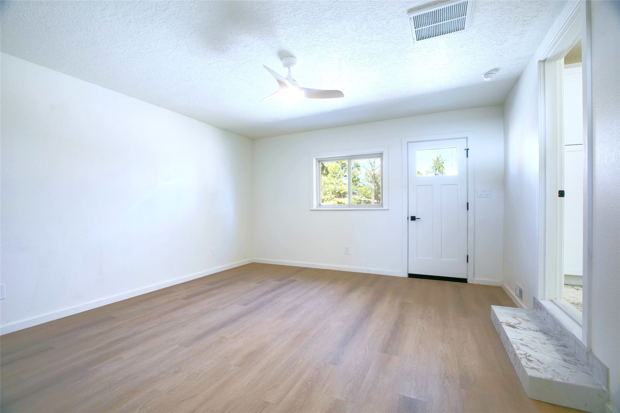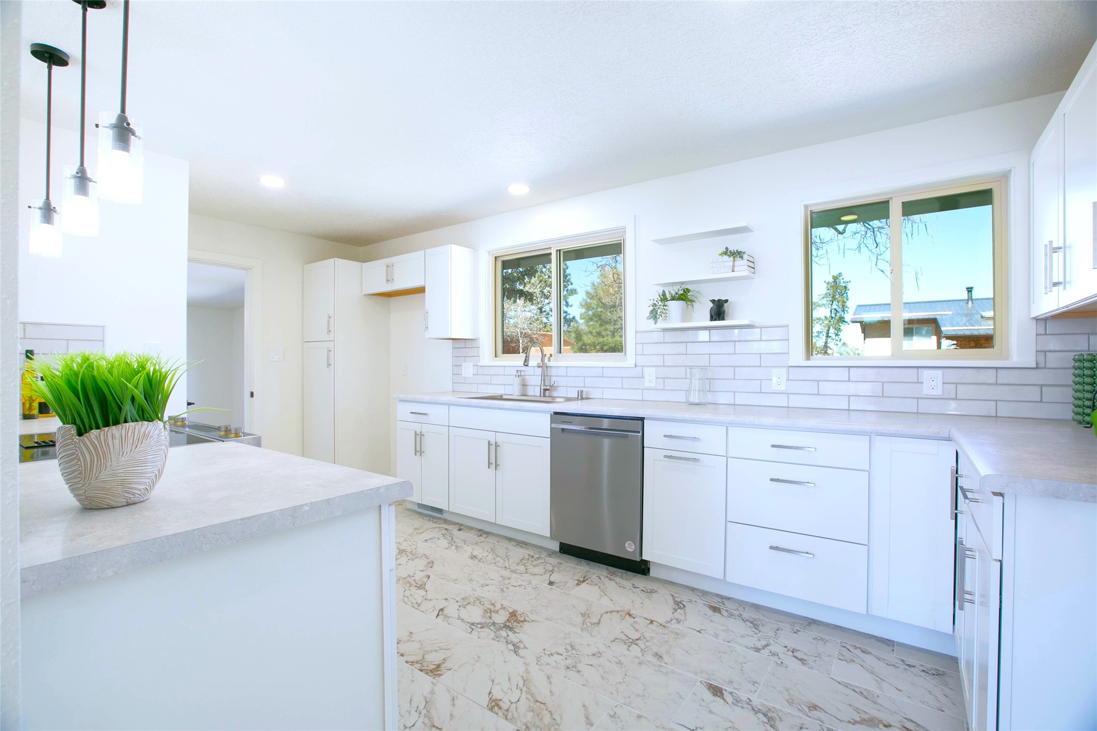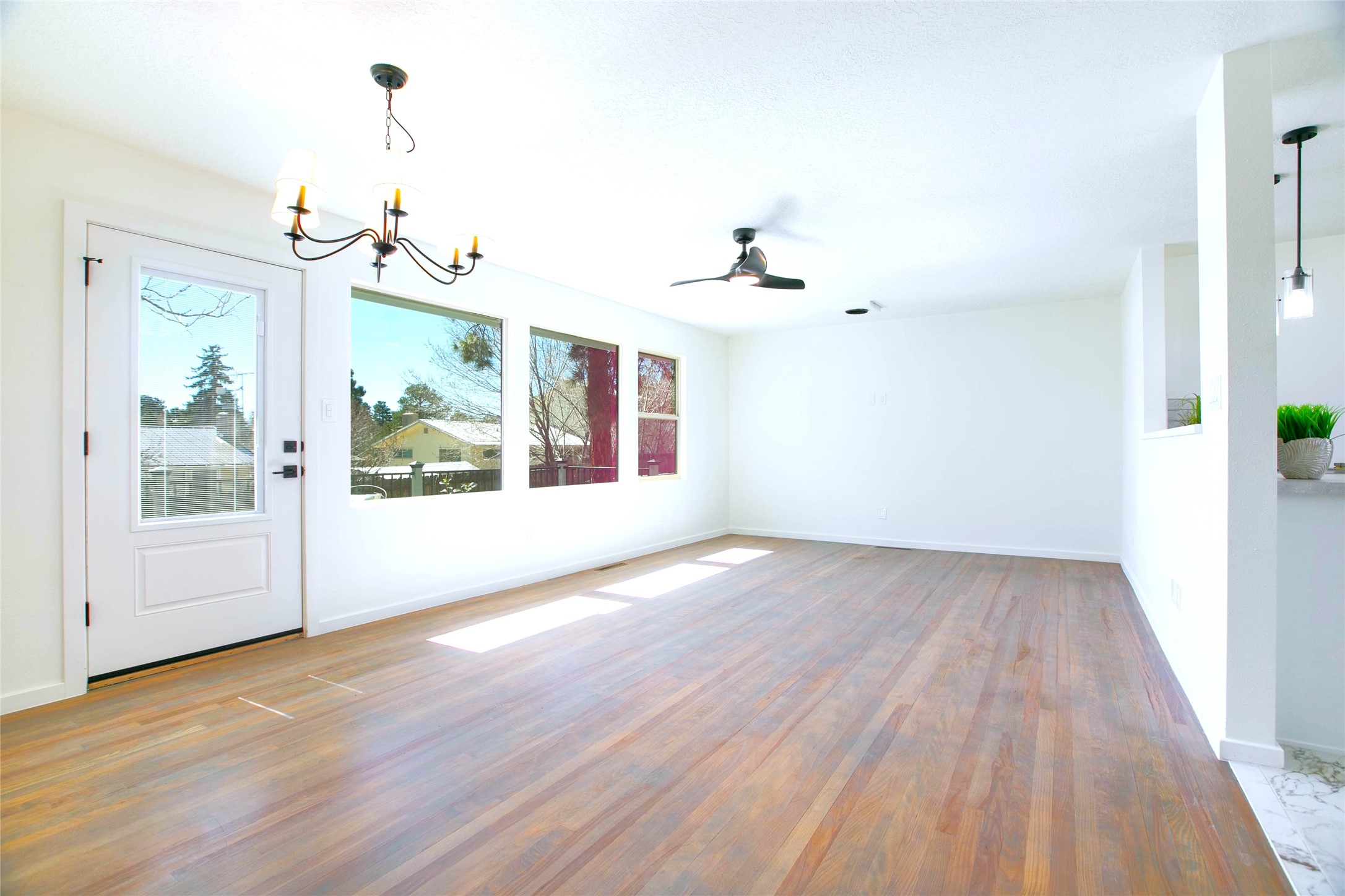 This Immaculate home sits on a tranquil corner lot in the heart of Los Alamos! Convenience and amenities are just outside your doorstep with Trinity Dr and countless restaurants, shops, breweries, & activity centers only a few short minutes' drive from the property. This recently renovated home features finished hardwood floors (living area, bedrooms & hallway), waterproof luxury vinyl plank (primary bedroom), and porcelain tile flooring (kitchen, entry & bathrooms). Enjoy the Gourmet Kitchen with brand new state of the art stainless steel appliances including Jenn Air electric down-draft range w/ air fry/oven combo. Whirlpool dishwasher & large Kohler undermount sink. Brand-new plumbing, electrical, furnace & refrigerated air unit makes this home a luxury commodity you dont want to miss! Kohler fixtures & cultured marble vanities accentuate both bathrooms in the home. The primary bedroom offers its own entrance & exit to the deck - ideal as a studio or an attached retreat. The two guest bedrooms overlook a charming rose garden accentuated by the well-manicured front grass lawn. The basement brings versatility with its own entrance & driveway. This space could be used as a creative studio, a theater room, a home office or extra storage.