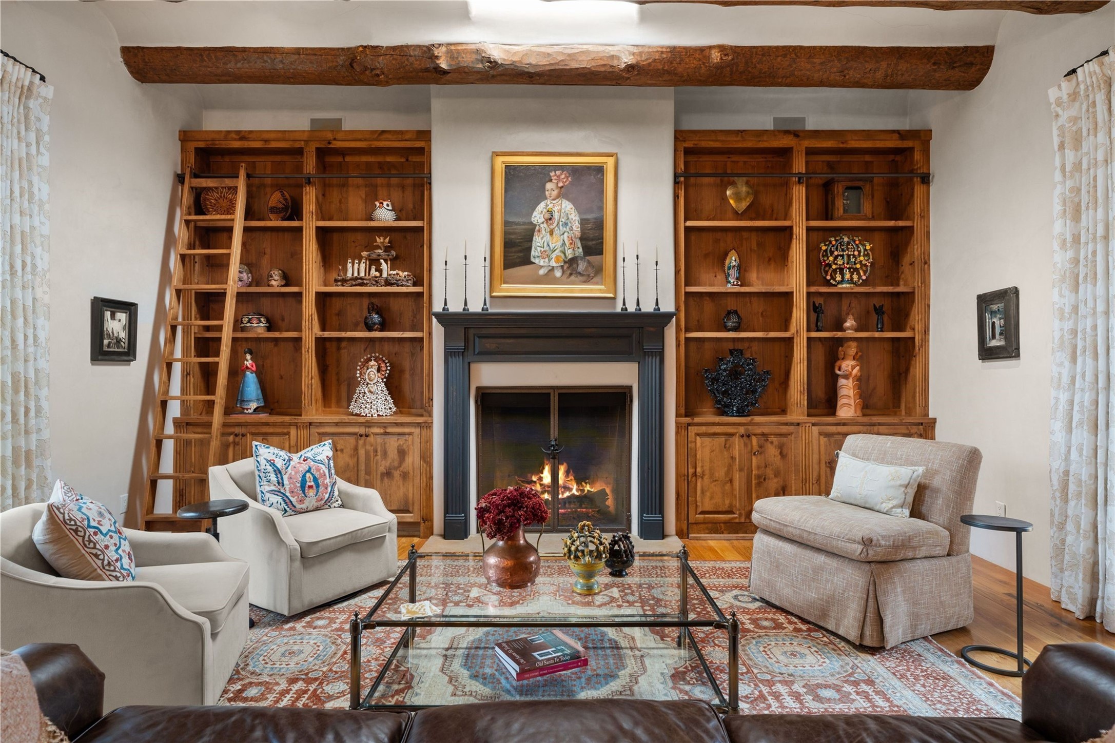 A rare opportunity in the heart of Santa Fe's Historic Eastside, this adobe home and casita-- within the six-unit San Antonio Compound built by renowned builder Jay Parks--offers timeless craftsmanship and thoughtful design in the form of a mini compound. Situated on the wide and peaceful San Antonio Street off of Acequia Madre, the offering comprises two separately deeded condominiums sharing a common courtyard, which provides the owner with a three-bedroom main house and an impeccably charming one-bedroom casita. The main house features white oak flooring, antique wooden beams and doors, custom plastered walls, and five fireplaces, typifying the warmth of classic Santa Fe architecture. A stately living room flows into a kitchen with a copper island and granite countertops. There are two bedroom suites plus a third room (served by a hall bathroom) that either works as another guest bedroom or perfect office. Aspen-lined stone pathways within a walled courtyard connect the home to the guest house, passing by a private hot tub that sits between the two homes. The casita is appointed with brick flooring, wood burning fireplace, a freshly updated kitchen, a decadent bedroom suite and two off-street parking spaces - all ensuring your guests will never want to leave. A two-car garage and additional parking are a rare asset in this sought-after downtown location. Meticulously maintained and thoughtfully designed, this is an exceptional offering just moments from Santa Fe's best dining, galleries on Canyon Road, and the Plaza.