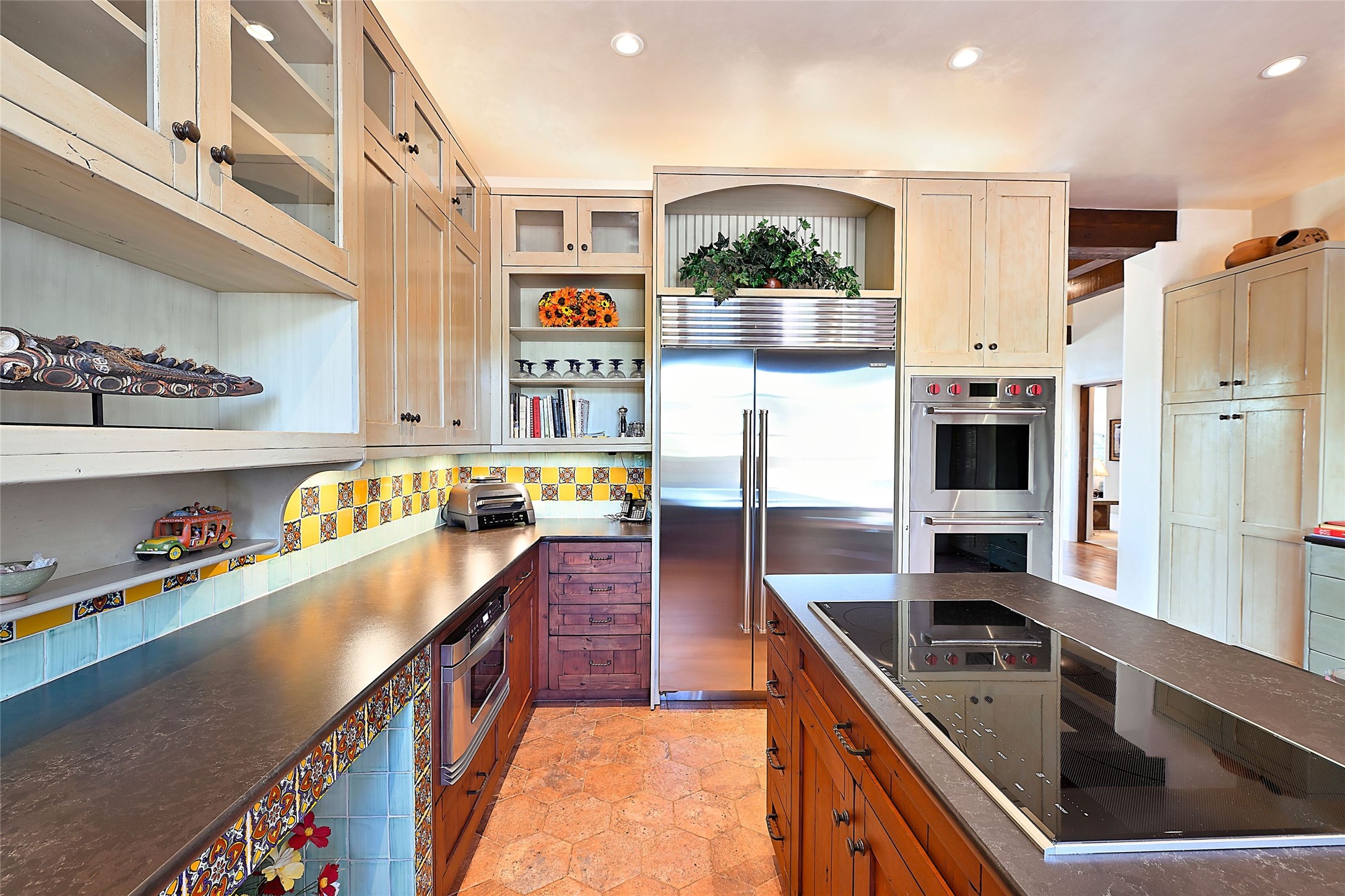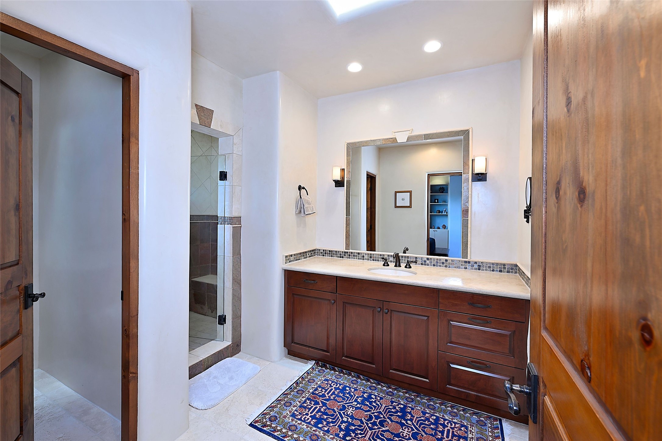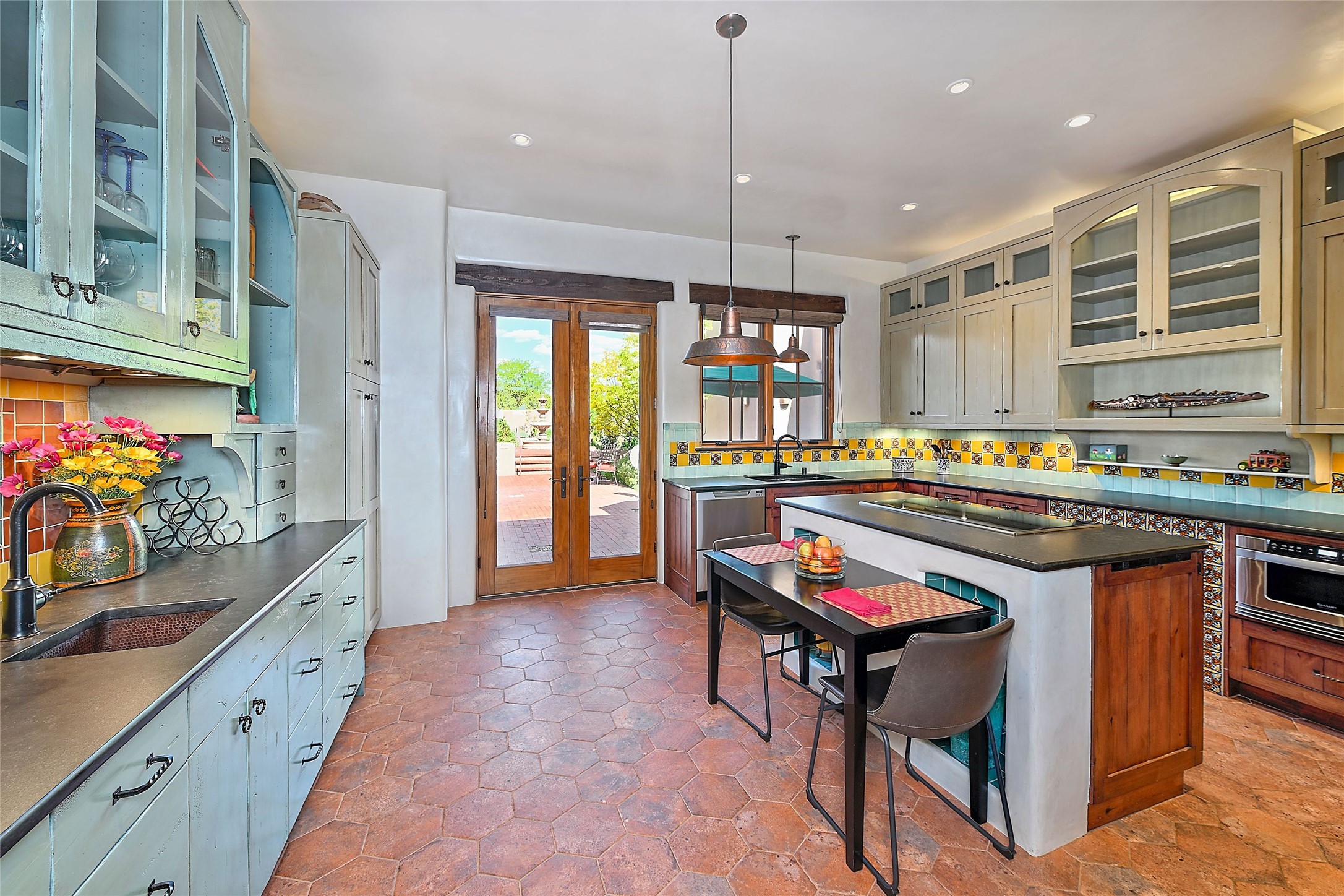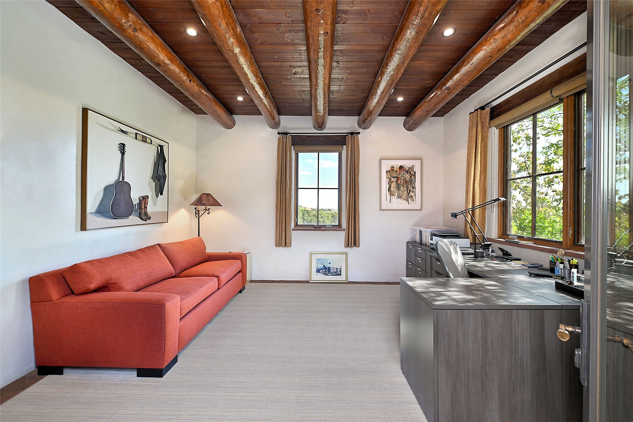 Sited on a scenic hill, this charming New Mexico residence offers breathtaking views and the perfect blend of privacy, comfort, and timeless Southwestern appeal. Surrounded by stunning, low-maintenance gardens and multiple outdoor spaces, this property invites you to relax and soak in the incredible weather and spectacular sunsets. Portals and patios wrap the home, creating a seamless flow between indoor and outdoor living. Whether you're enjoying a quiet morning coffee or entertaining guests under the vast, clear blue skies, every corner is thoughtfully designed for comfort and connection with the outdoors. Inside, the expansive primary suite is a true retreat, featuring two generous walk-in closets and a luxurious bath. A well-appointed guest suite offers ample closet space and a cozy office nook, ideal for working or unwinding. The kitchen is up to the minute in fittings and function while retaining authentic New Mexico charm. It opens to a vast patio and garden area, creating an ideal space for alfresco dining and gatherings. Adding to the property's appeal is a separate casita, complete with a mini kitchen and bath--perfect for guests, extended family, or creative studio use. This exceptional hilltop home offers beauty, serenity, and true New Mexican character at every turn.