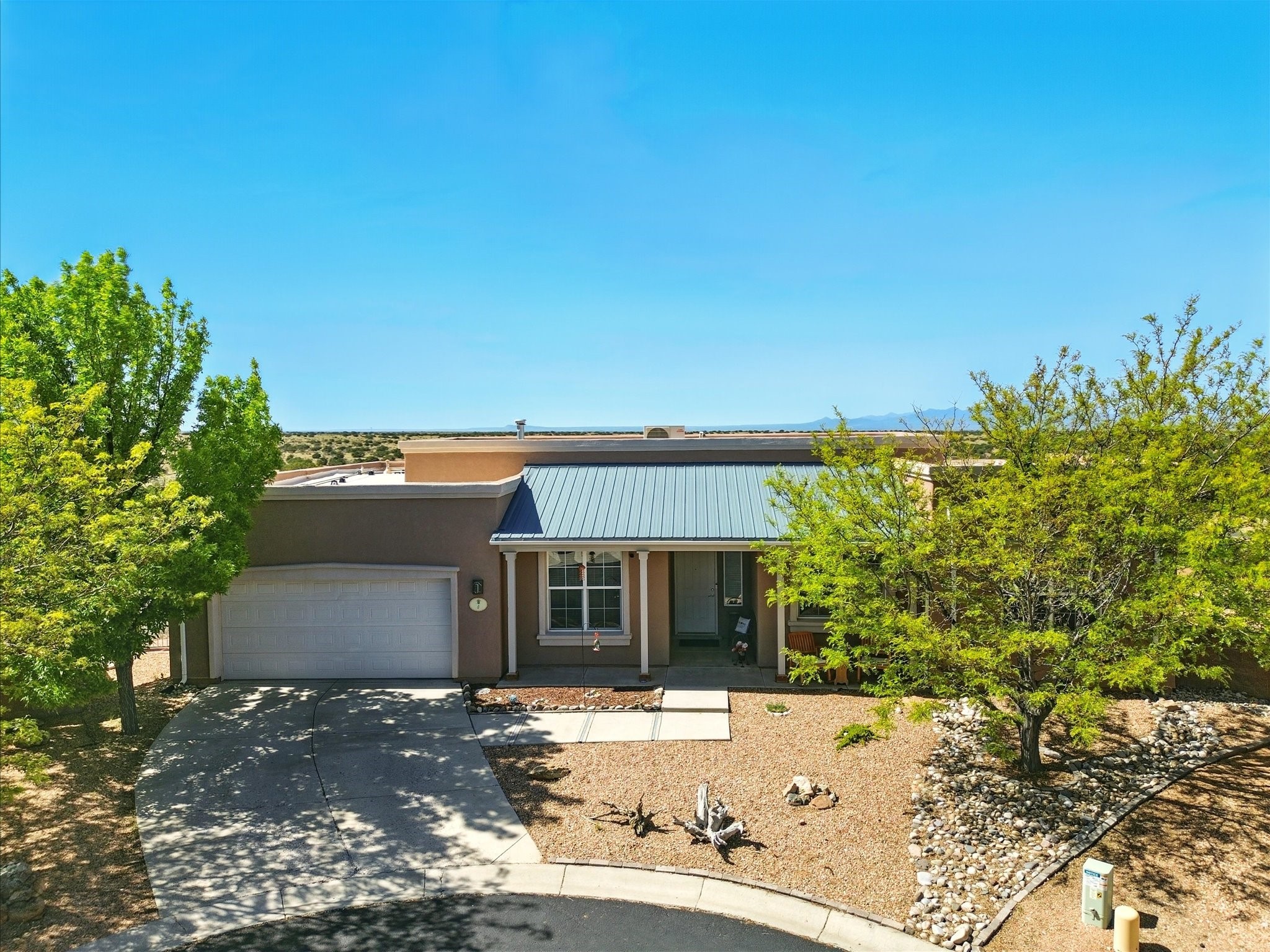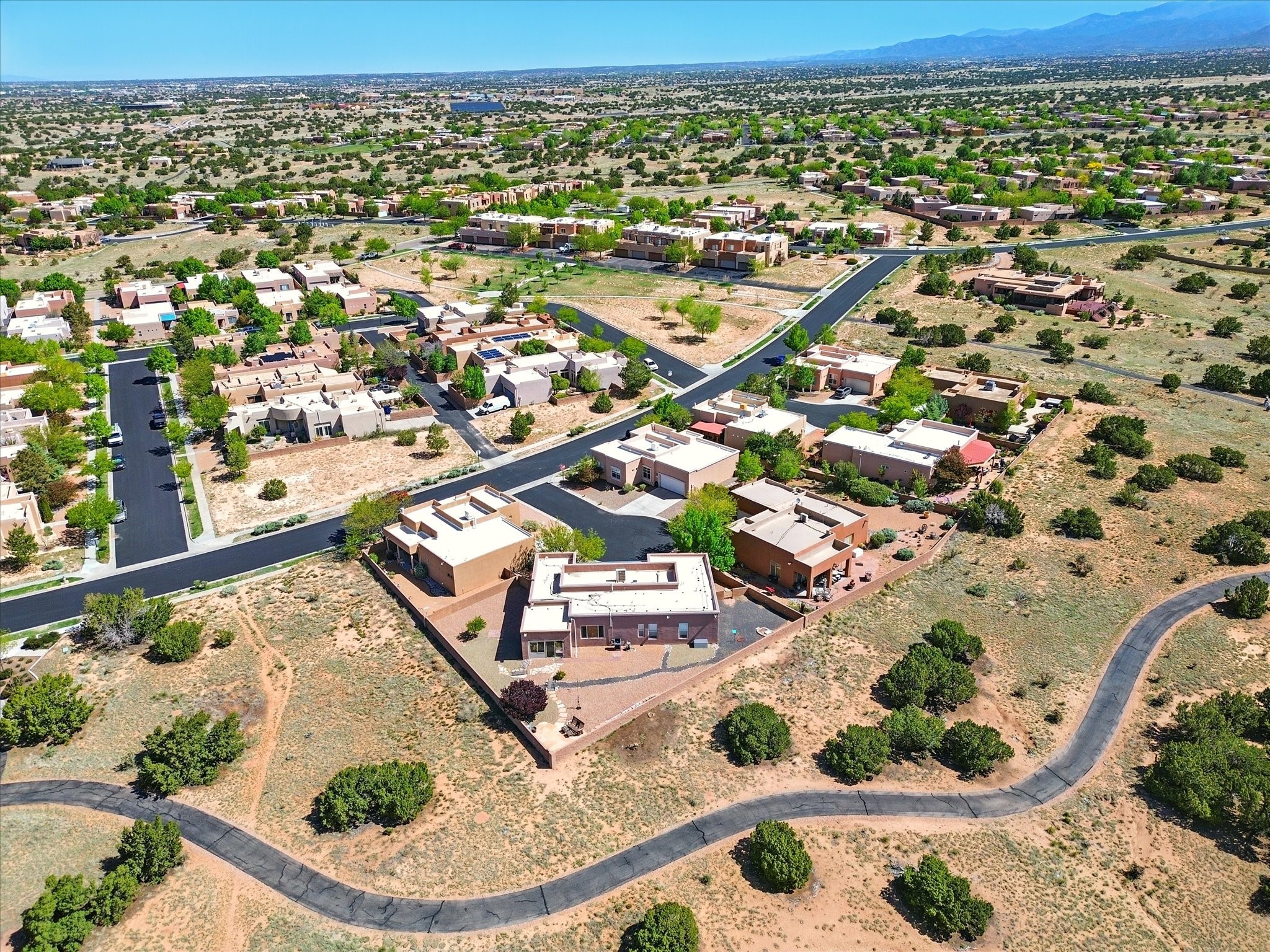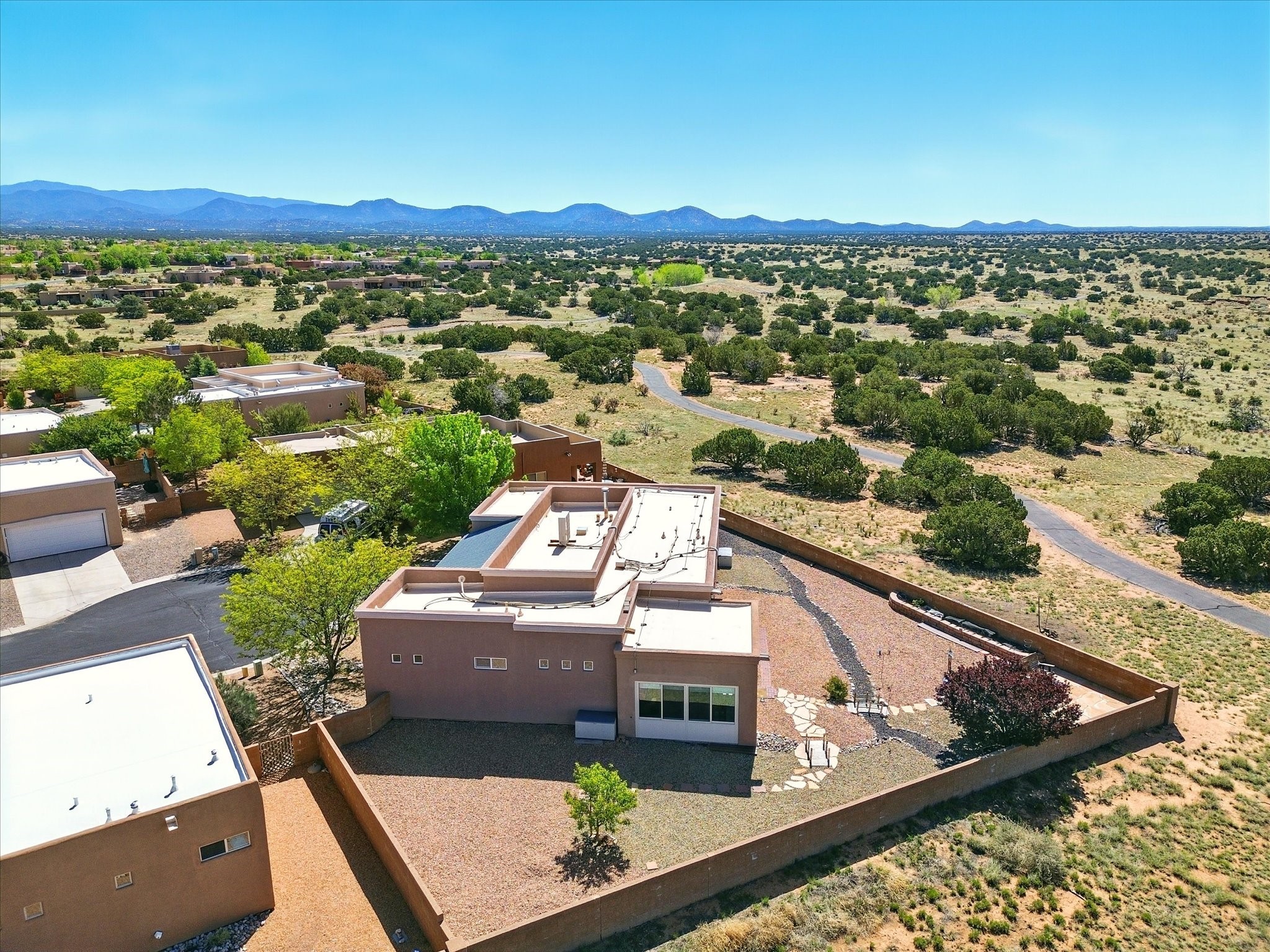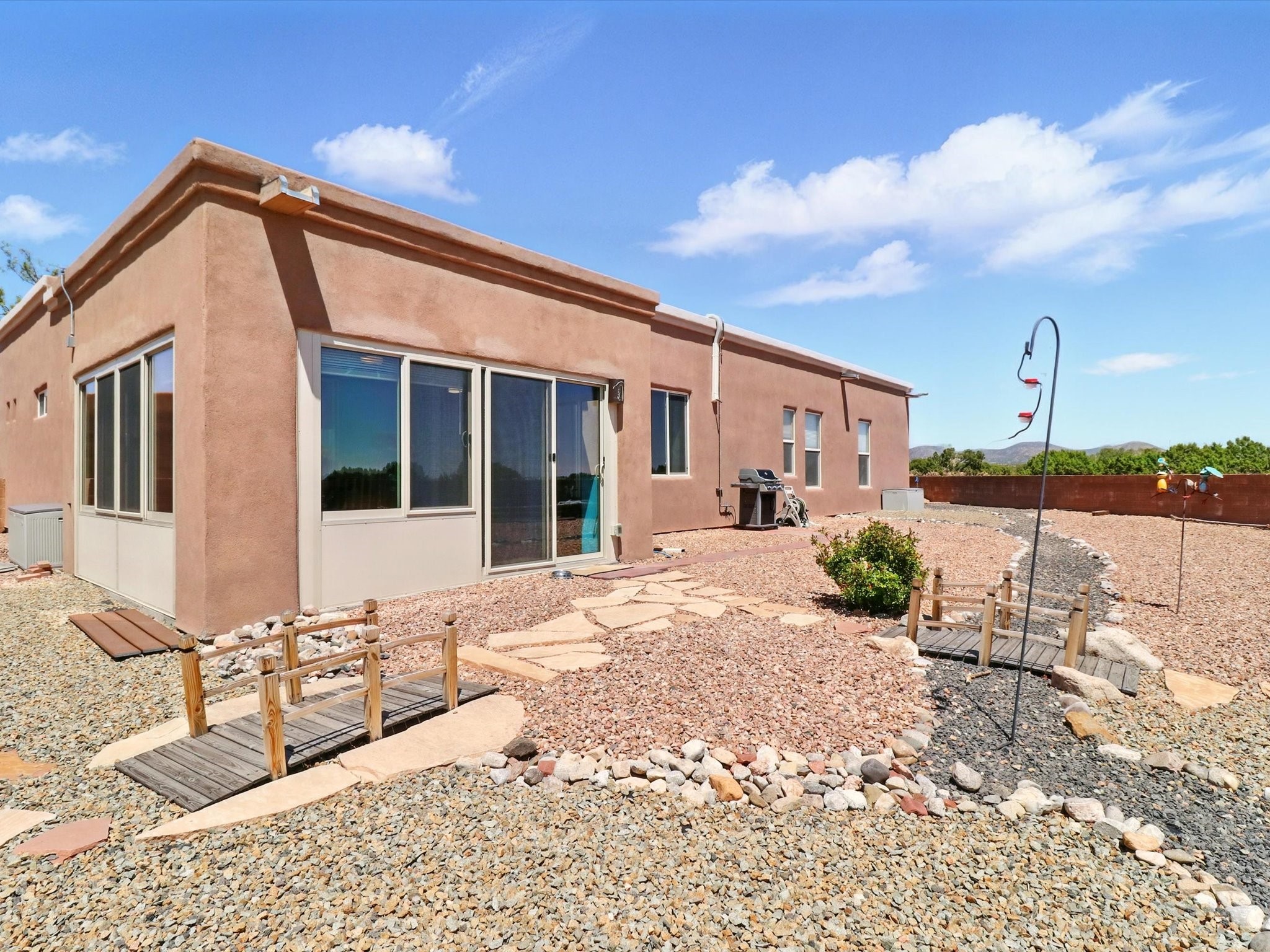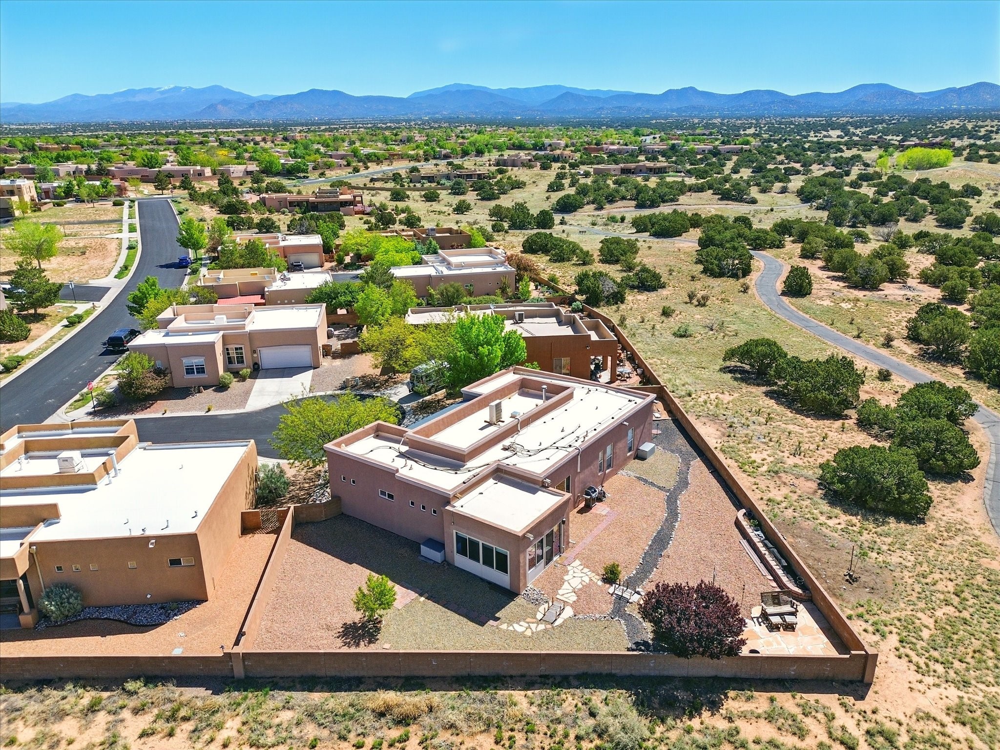 Welcome to one of the rare gems in the sought-after Rancho Viejo community--4 SierraGrande, where spectacular views and peaceful living come together. Nestled in a quiet4-home cul-de-sac, this beautifully maintained 3-bedroom, 2-bath home offerspanoramic vistas of the Sandia, Ortiz, and Jemez Mountains, with miles of open spaceto the south--protected HOA land that will never be developed. One of the standoutfeatures is the three-year-old sunroom, offering a sweeping, unobstructed view to thesouth--the perfect spot to enjoy vibrant sunsets and tranquil mornings year-round. This2,090 sqft Wild Iris model is filled with natural light and features a bright open-conceptlayout that seamlessly connects the kitchen, dining, and living areas. The primary suiteis tucked away for privacy and includes a spacious walk-in closet, double-sink vanity,and enclosed shower. Two additional guest bedrooms and a full bath are located on theopposite side of the home. Enjoy peace of mind with recent upgrades including a twoyear old boiler, instant water heater, mini-split systems, whole-house tile flooring, a fullyrenovated kitchen with updated cabinets, quartz countertops, updated appliances andlights, fresh interior paint, and new front-facing blinds--all completed within the lastthree years. Step outside to a spacious fenced backyard with a patio, ideal forgardening or relaxing while taking in the expansive, southwesterly views. With radiantheating, ductless air conditioning , and no steps throughout, this energy-efficient homeoffers year-round comfort and ease of living. Homes with this level of care, comfort, anduninterrupted natural beauty are a rare find--don't miss your chance to call this onehome.