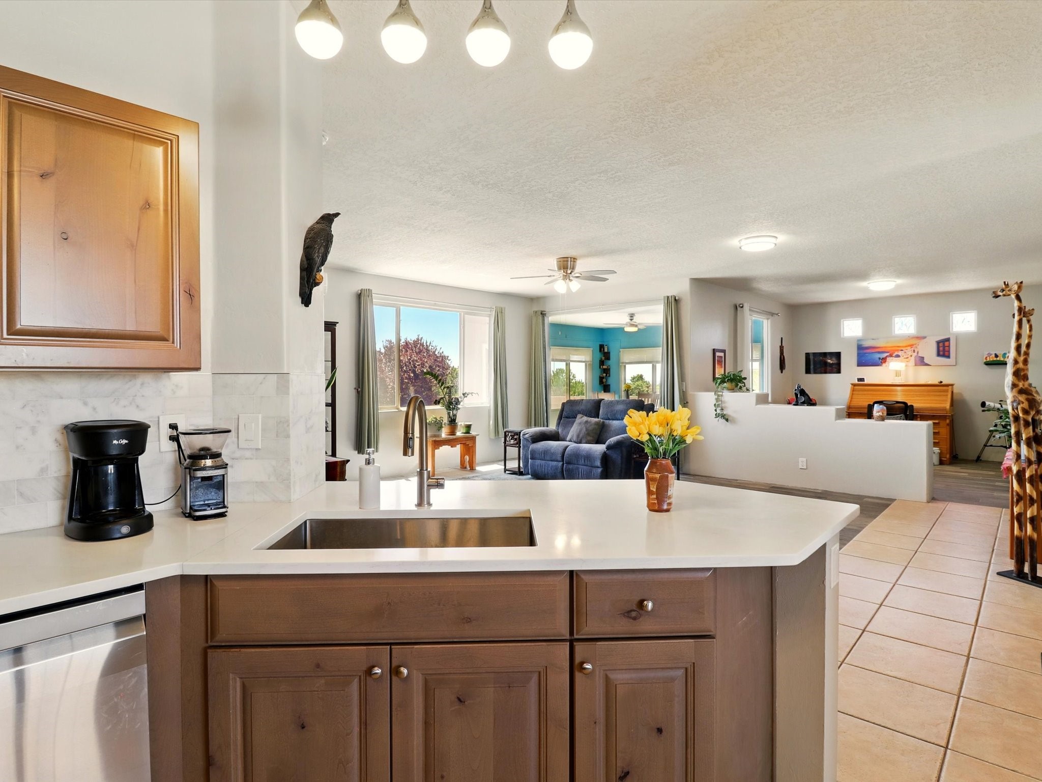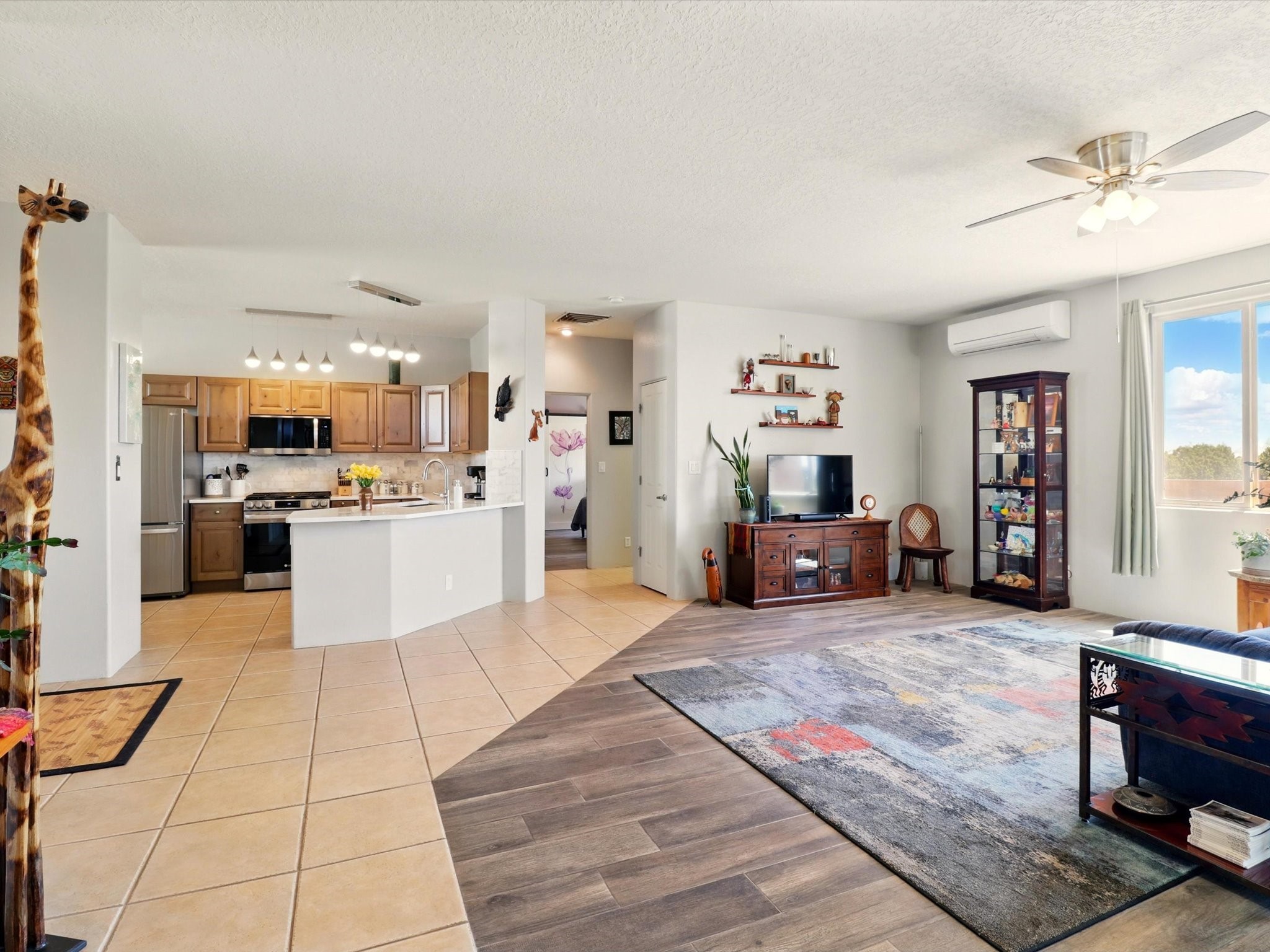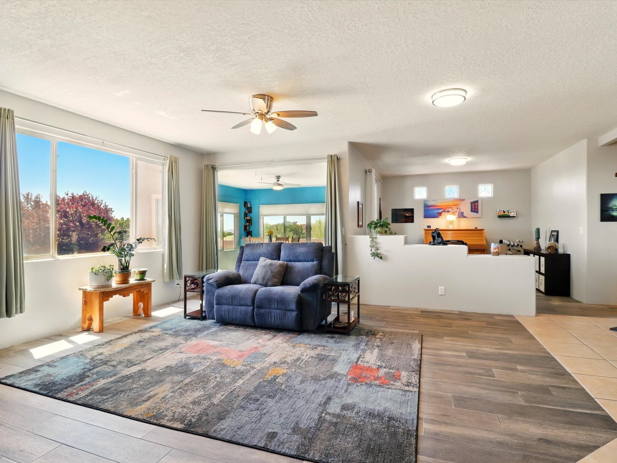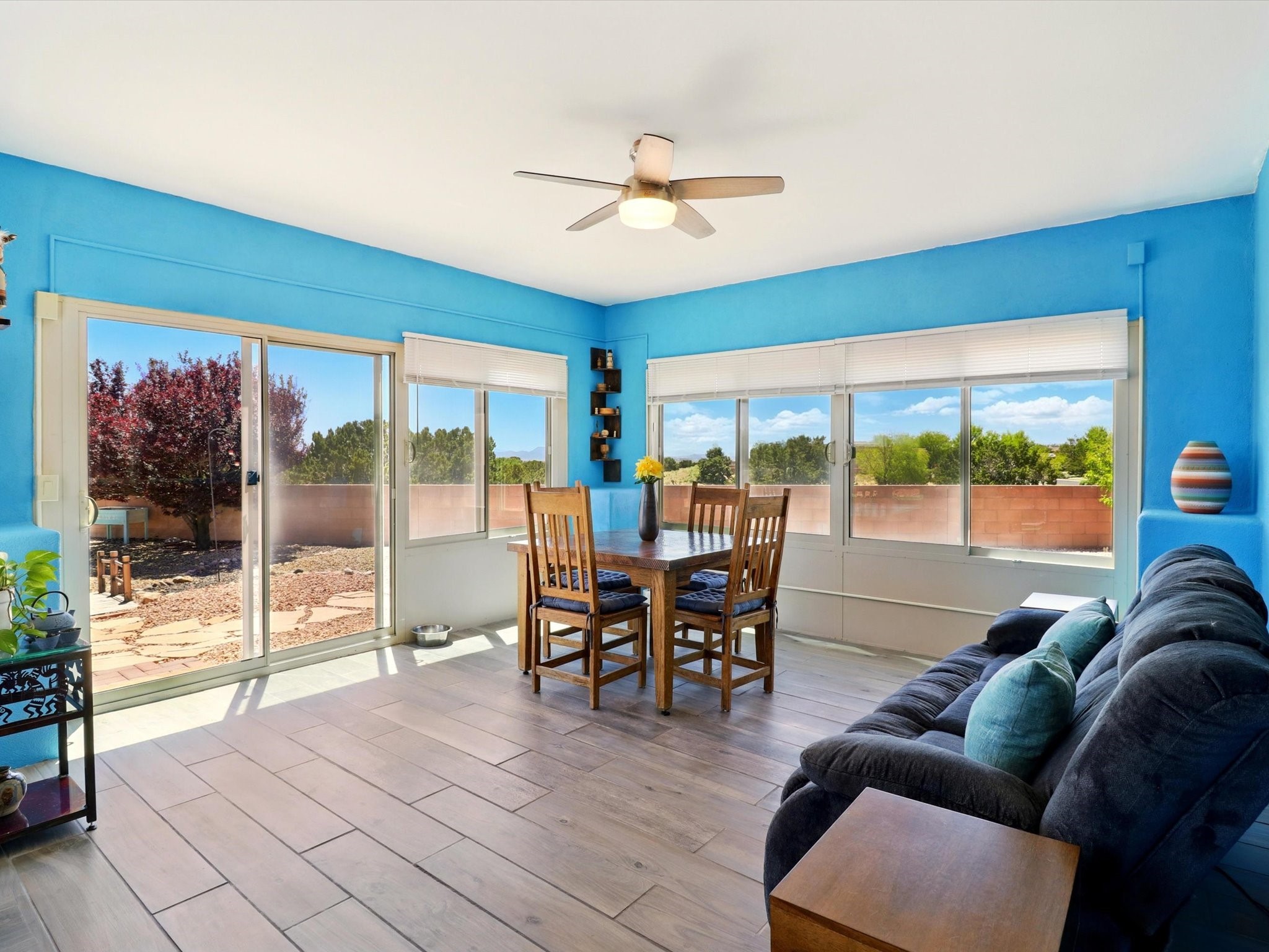 Welcome to one of the rare gems in the sought-after Rancho Viejo community--4 SierraGrande, where spectacular views and peaceful living come together. Nestled in a quiet4-home cul-de-sac, this beautifully maintained 3-bedroom, 2-bath home offerspanoramic vistas of the Sandia, Ortiz, and Jemez Mountains, with miles of open spaceto the south--protected HOA land that will never be developed. One of the standoutfeatures is the three-year-old sunroom, offering a sweeping, unobstructed view to thesouth--the perfect spot to enjoy vibrant sunsets and tranquil mornings year-round. This2,090 sqft Wild Iris model is filled with natural light and features a bright open-conceptlayout that seamlessly connects the kitchen, dining, and living areas. The primary suiteis tucked away for privacy and includes a spacious walk-in closet, double-sink vanity,and enclosed shower. Two additional guest bedrooms and a full bath are located on theopposite side of the home. Enjoy peace of mind with recent upgrades including a twoyear old boiler, instant water heater, mini-split systems, whole-house tile flooring, a fullyrenovated kitchen with updated cabinets, quartz countertops, updated appliances andlights, fresh interior paint, and new front-facing blinds--all completed within the lastthree years. Step outside to a spacious fenced backyard with a patio, ideal forgardening or relaxing while taking in the expansive, southwesterly views. With radiantheating, ductless air conditioning , and no steps throughout, this energy-efficient homeoffers year-round comfort and ease of living. Homes with this level of care, comfort, anduninterrupted natural beauty are a rare find--don't miss your chance to call this onehome.