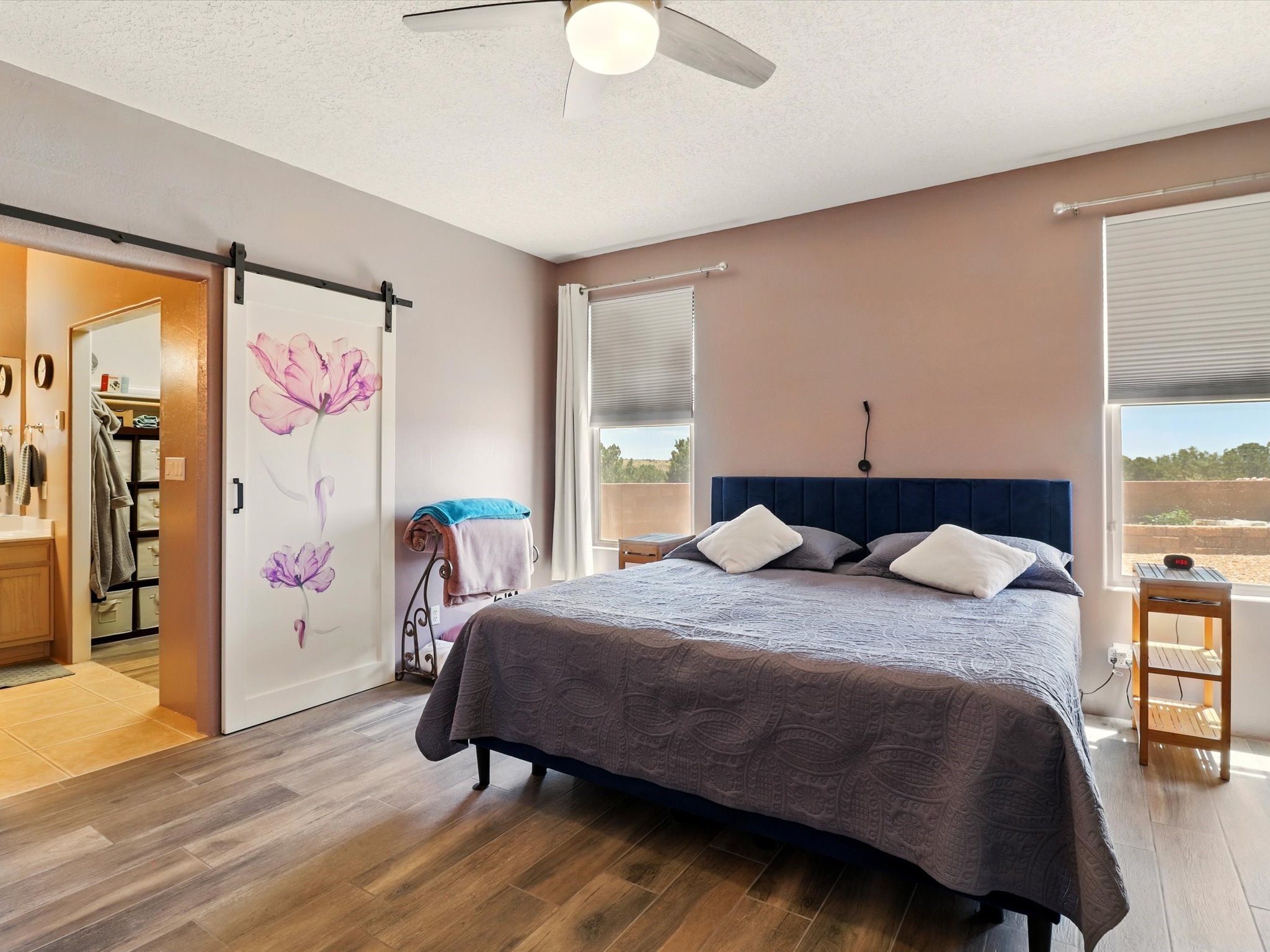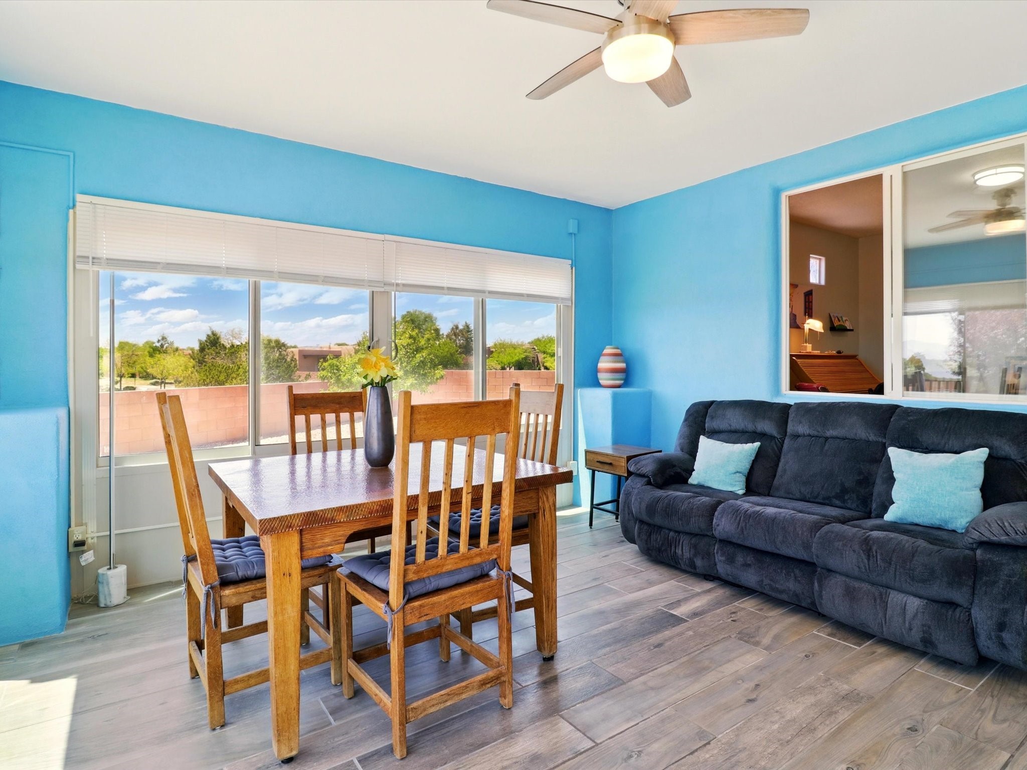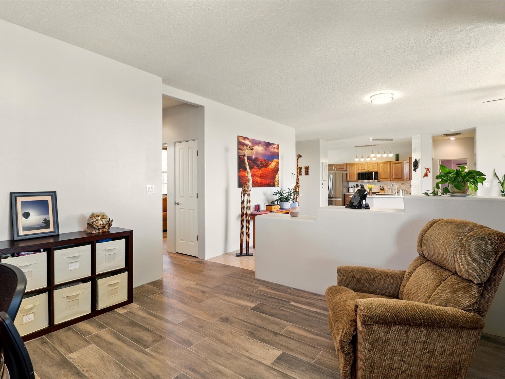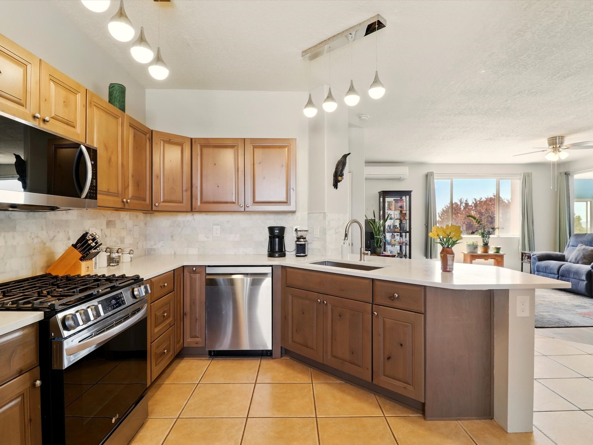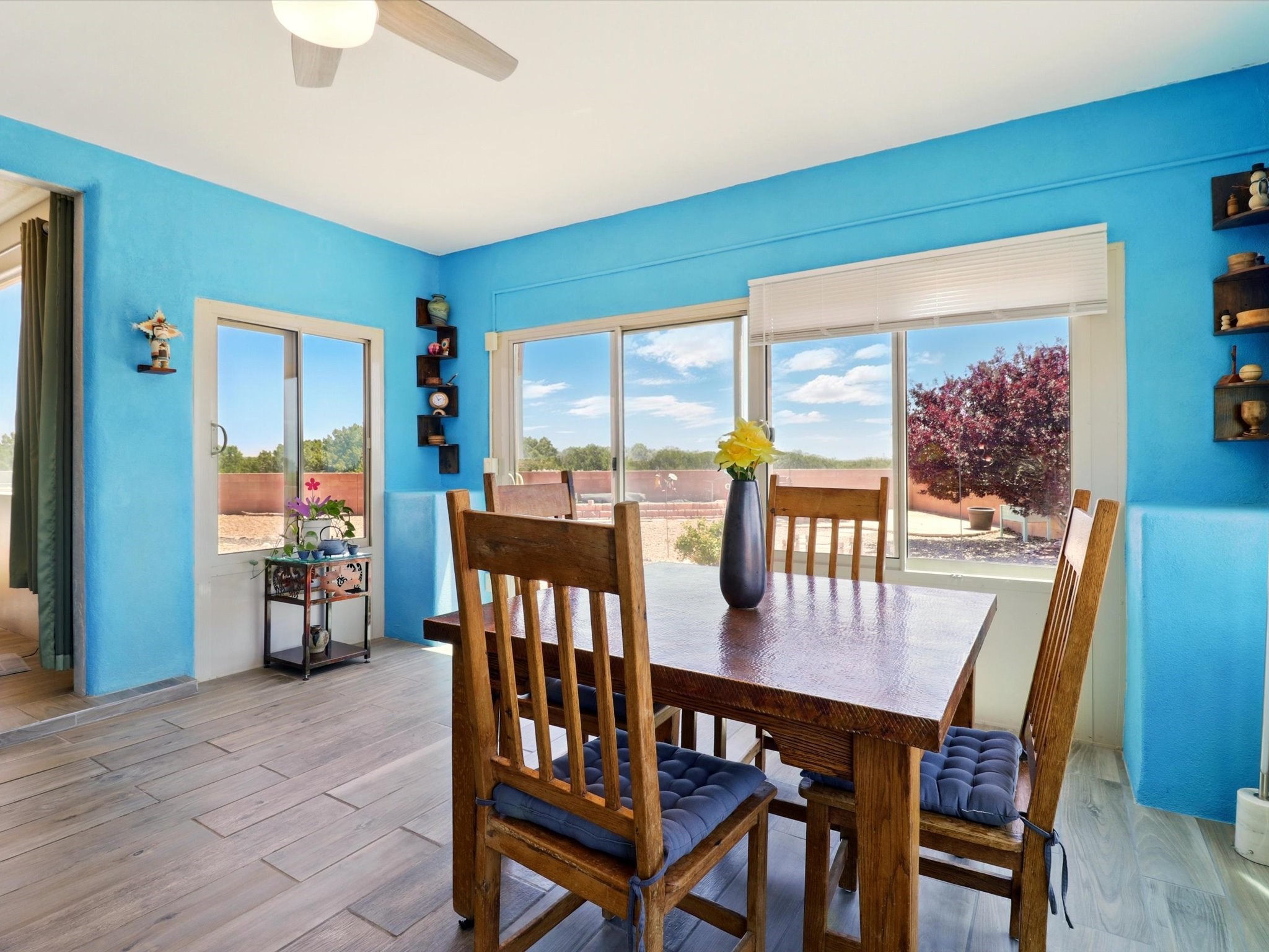 Welcome to one of the rare gems in the sought-after Rancho Viejo community--4 SierraGrande, where spectacular views and peaceful living come together. Nestled in a quiet4-home cul-de-sac, this beautifully maintained 3-bedroom, 2-bath home offerspanoramic vistas of the Sandia, Ortiz, and Jemez Mountains, with miles of open spaceto the south--protected HOA land that will never be developed. One of the standoutfeatures is the three-year-old sunroom, offering a sweeping, unobstructed view to thesouth--the perfect spot to enjoy vibrant sunsets and tranquil mornings year-round. This2,090 sqft Wild Iris model is filled with natural light and features a bright open-conceptlayout that seamlessly connects the kitchen, dining, and living areas. The primary suiteis tucked away for privacy and includes a spacious walk-in closet, double-sink vanity,and enclosed shower. Two additional guest bedrooms and a full bath are located on theopposite side of the home. Enjoy peace of mind with recent upgrades including a twoyear old boiler, instant water heater, mini-split systems, whole-house tile flooring, a fullyrenovated kitchen with updated cabinets, quartz countertops, updated appliances andlights, fresh interior paint, and new front-facing blinds--all completed within the lastthree years. Step outside to a spacious fenced backyard with a patio, ideal forgardening or relaxing while taking in the expansive, southwesterly views. With radiantheating, ductless air conditioning , and no steps throughout, this energy-efficient homeoffers year-round comfort and ease of living. Homes with this level of care, comfort, anduninterrupted natural beauty are a rare find--don't miss your chance to call this onehome.