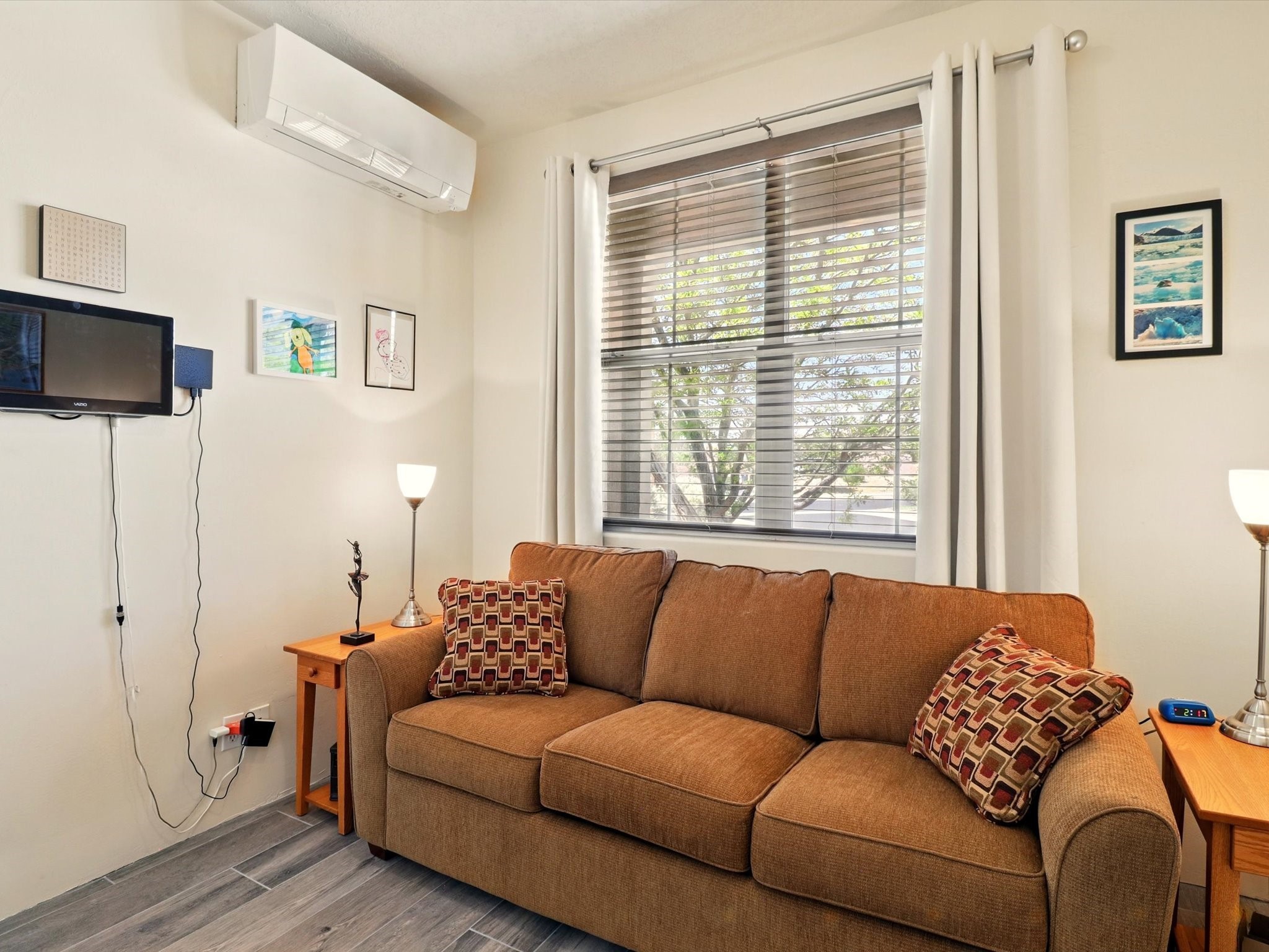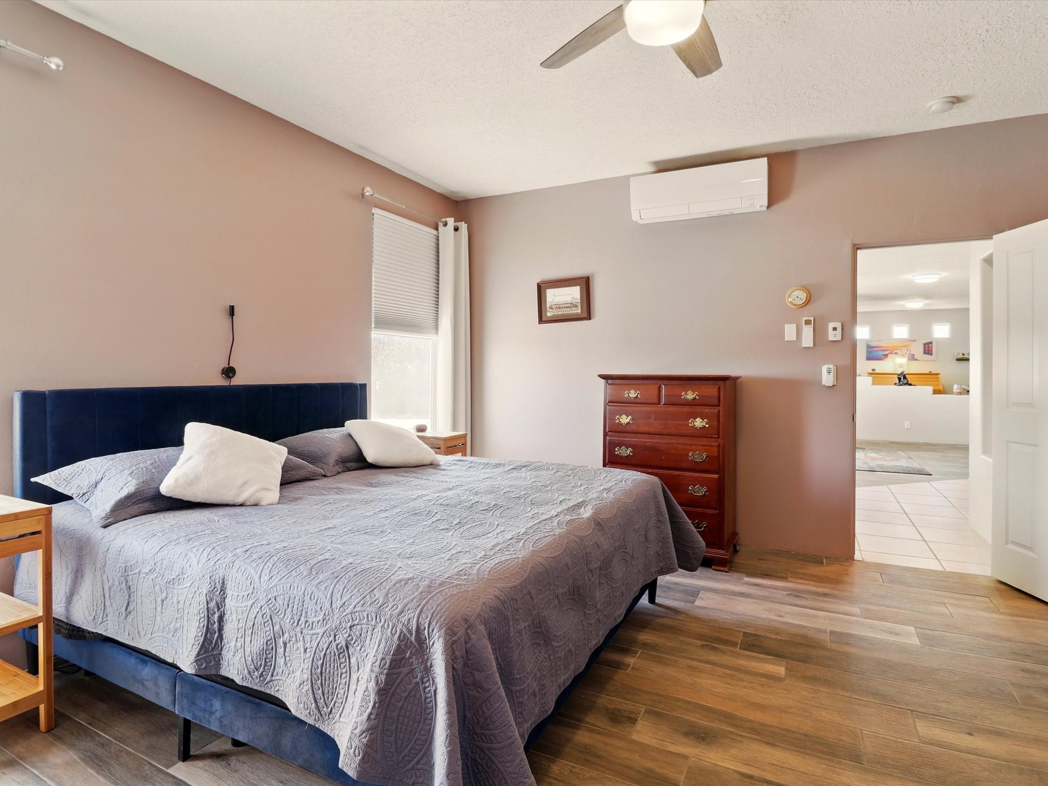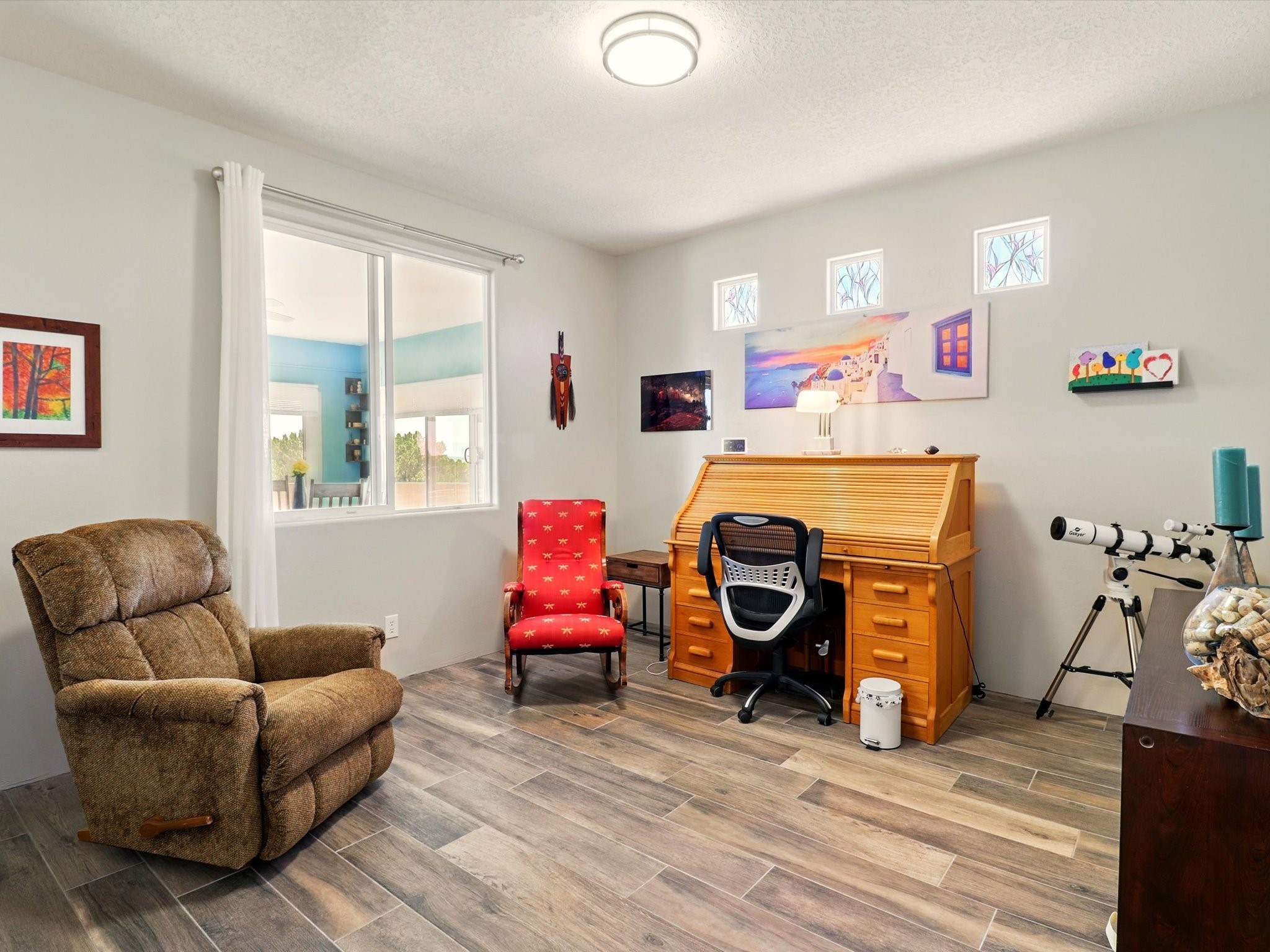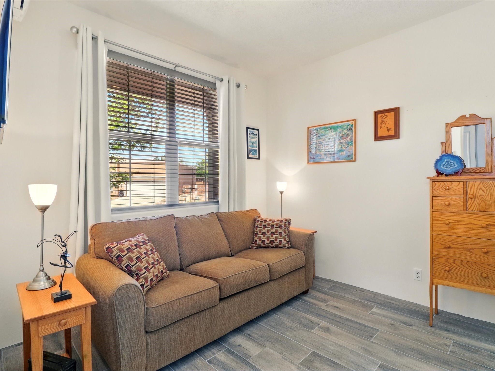 Welcome to one of the rare gems in the sought-after Rancho Viejo community--4 SierraGrande, where spectacular views and peaceful living come together. Nestled in a quiet4-home cul-de-sac, this beautifully maintained 3-bedroom, 2-bath home offerspanoramic vistas of the Sandia, Ortiz, and Jemez Mountains, with miles of open spaceto the south--protected HOA land that will never be developed. One of the standoutfeatures is the three-year-old sunroom, offering a sweeping, unobstructed view to thesouth--the perfect spot to enjoy vibrant sunsets and tranquil mornings year-round. This2,090 sqft Wild Iris model is filled with natural light and features a bright open-conceptlayout that seamlessly connects the kitchen, dining, and living areas. The primary suiteis tucked away for privacy and includes a spacious walk-in closet, double-sink vanity,and enclosed shower. Two additional guest bedrooms and a full bath are located on theopposite side of the home. Enjoy peace of mind with recent upgrades including a twoyear old boiler, instant water heater, mini-split systems, whole-house tile flooring, a fullyrenovated kitchen with updated cabinets, quartz countertops, updated appliances andlights, fresh interior paint, and new front-facing blinds--all completed within the lastthree years. Step outside to a spacious fenced backyard with a patio, ideal forgardening or relaxing while taking in the expansive, southwesterly views. With radiantheating, ductless air conditioning , and no steps throughout, this energy-efficient homeoffers year-round comfort and ease of living. Homes with this level of care, comfort, anduninterrupted natural beauty are a rare find--don't miss your chance to call this onehome.