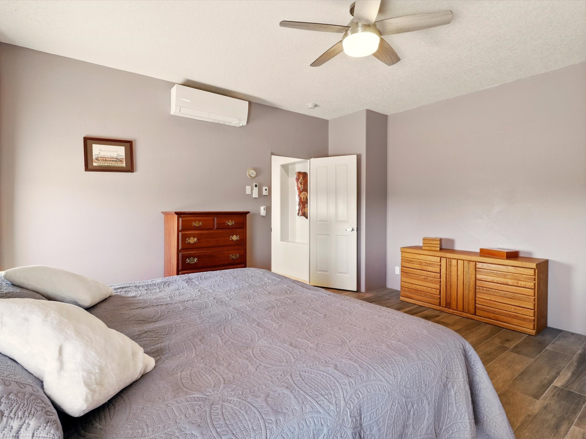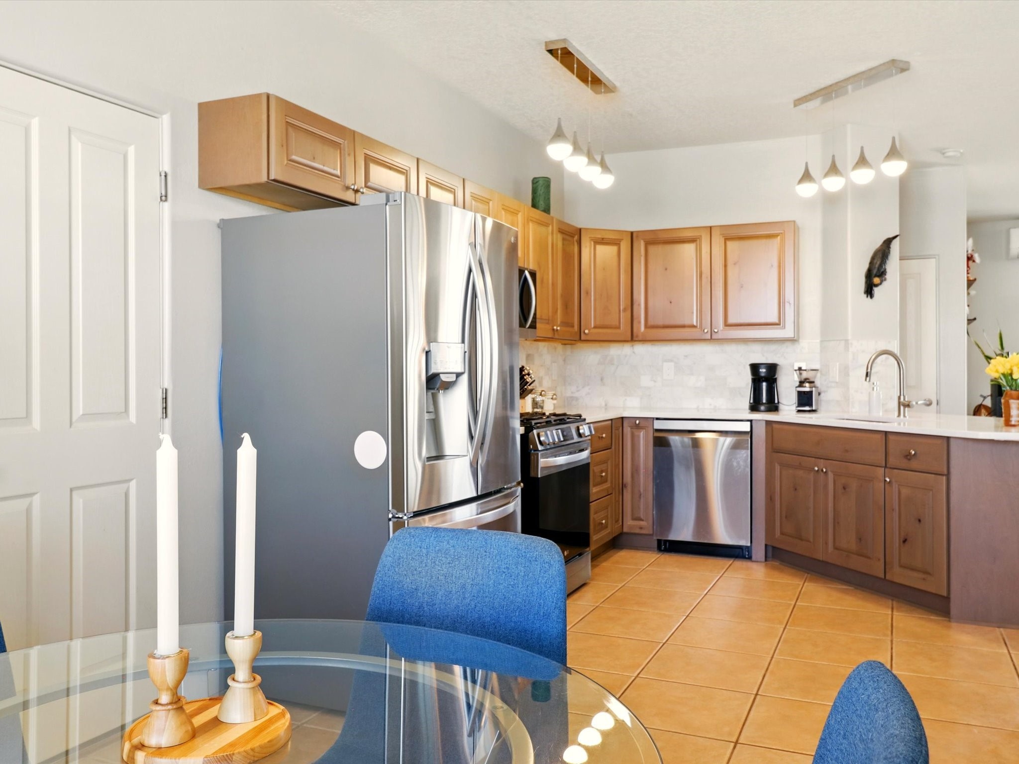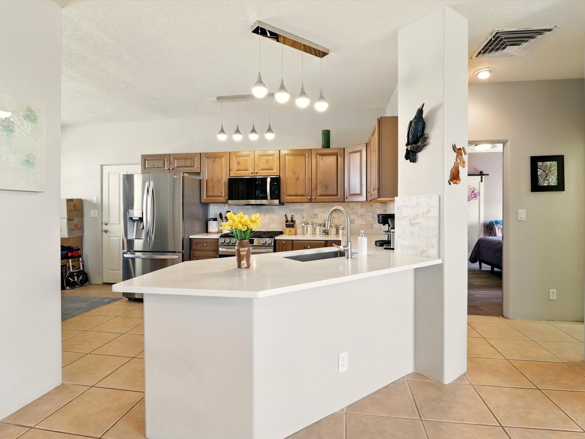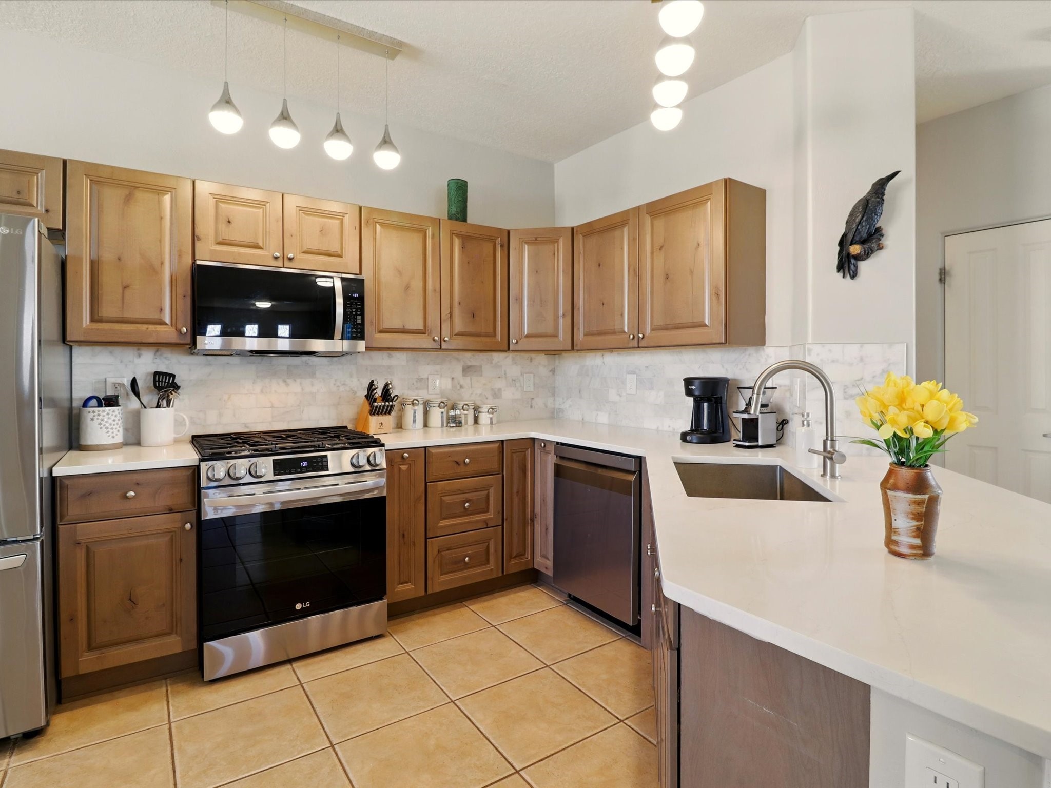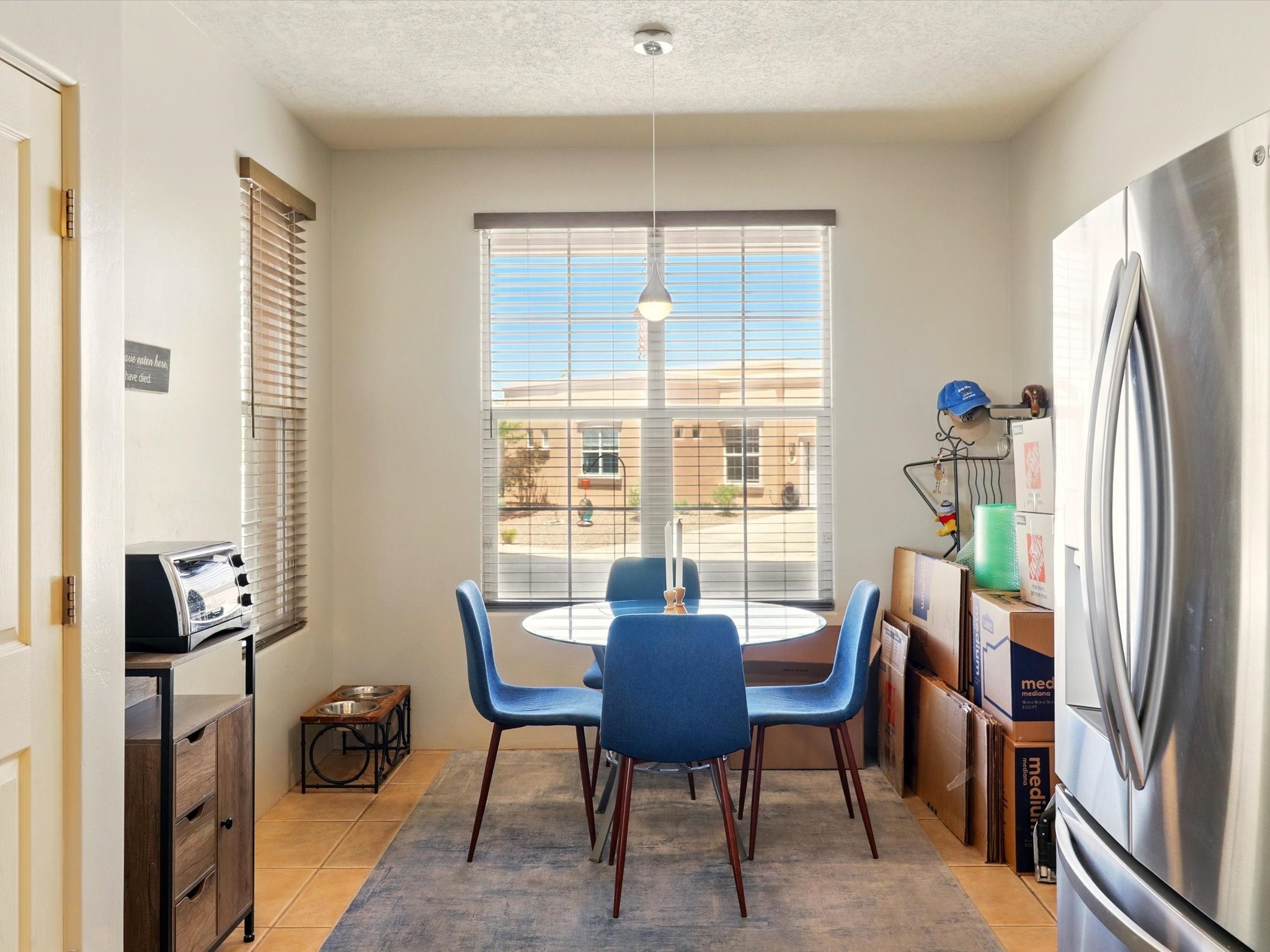 Welcome to one of the rare gems in the sought-after Rancho Viejo community--4 SierraGrande, where spectacular views and peaceful living come together. Nestled in a quiet4-home cul-de-sac, this beautifully maintained 3-bedroom, 2-bath home offerspanoramic vistas of the Sandia, Ortiz, and Jemez Mountains, with miles of open spaceto the south--protected HOA land that will never be developed. One of the standoutfeatures is the three-year-old sunroom, offering a sweeping, unobstructed view to thesouth--the perfect spot to enjoy vibrant sunsets and tranquil mornings year-round. This2,090 sqft Wild Iris model is filled with natural light and features a bright open-conceptlayout that seamlessly connects the kitchen, dining, and living areas. The primary suiteis tucked away for privacy and includes a spacious walk-in closet, double-sink vanity,and enclosed shower. Two additional guest bedrooms and a full bath are located on theopposite side of the home. Enjoy peace of mind with recent upgrades including a twoyear old boiler, instant water heater, mini-split systems, whole-house tile flooring, a fullyrenovated kitchen with updated cabinets, quartz countertops, updated appliances andlights, fresh interior paint, and new front-facing blinds--all completed within the lastthree years. Step outside to a spacious fenced backyard with a patio, ideal forgardening or relaxing while taking in the expansive, southwesterly views. With radiantheating, ductless air conditioning , and no steps throughout, this energy-efficient homeoffers year-round comfort and ease of living. Homes with this level of care, comfort, anduninterrupted natural beauty are a rare find--don't miss your chance to call this onehome.