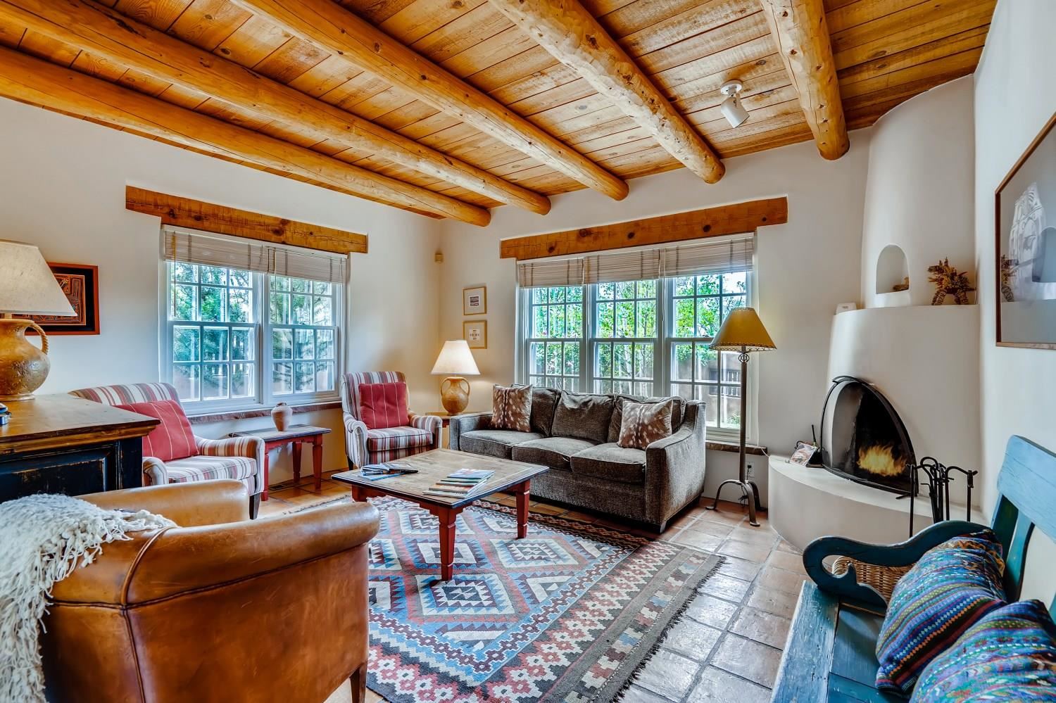 Charming condominium quarter ownership just a few blocks from the Plaza. Beautiful architectural details found in gracious old adobe home with vigas, kiva fireplaces, sculptural smooth plaster walls, hand adzed lintels above windows and doors. Tile kitchen and baths. All furnishings and maintenance, inside and out by Owners Association. Owners Associationmanagement operates established rental program.