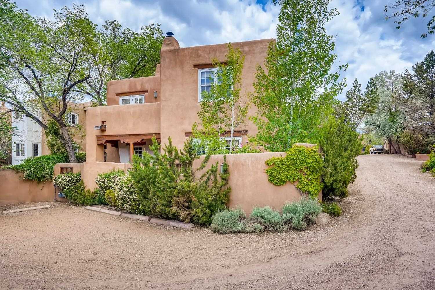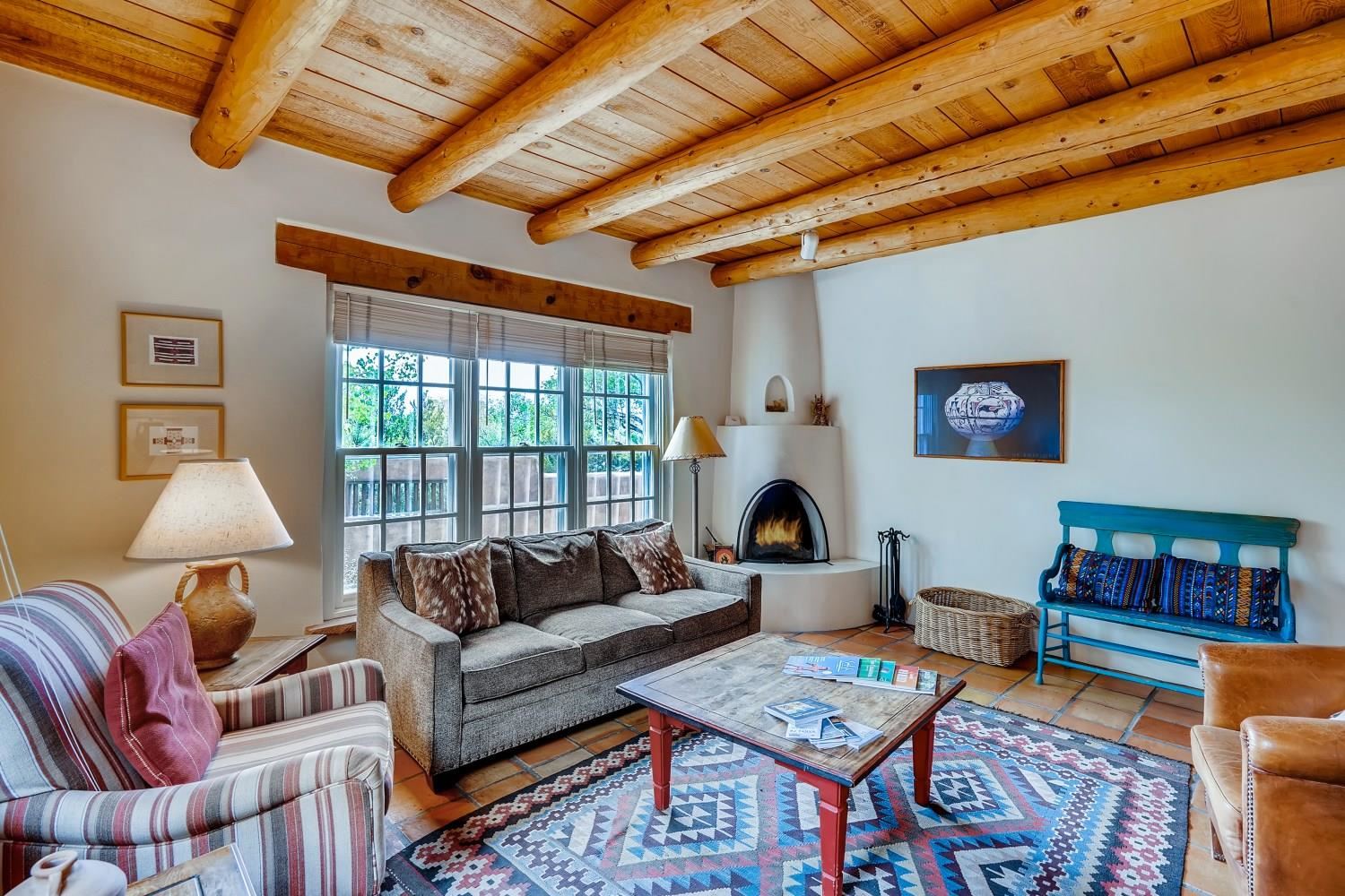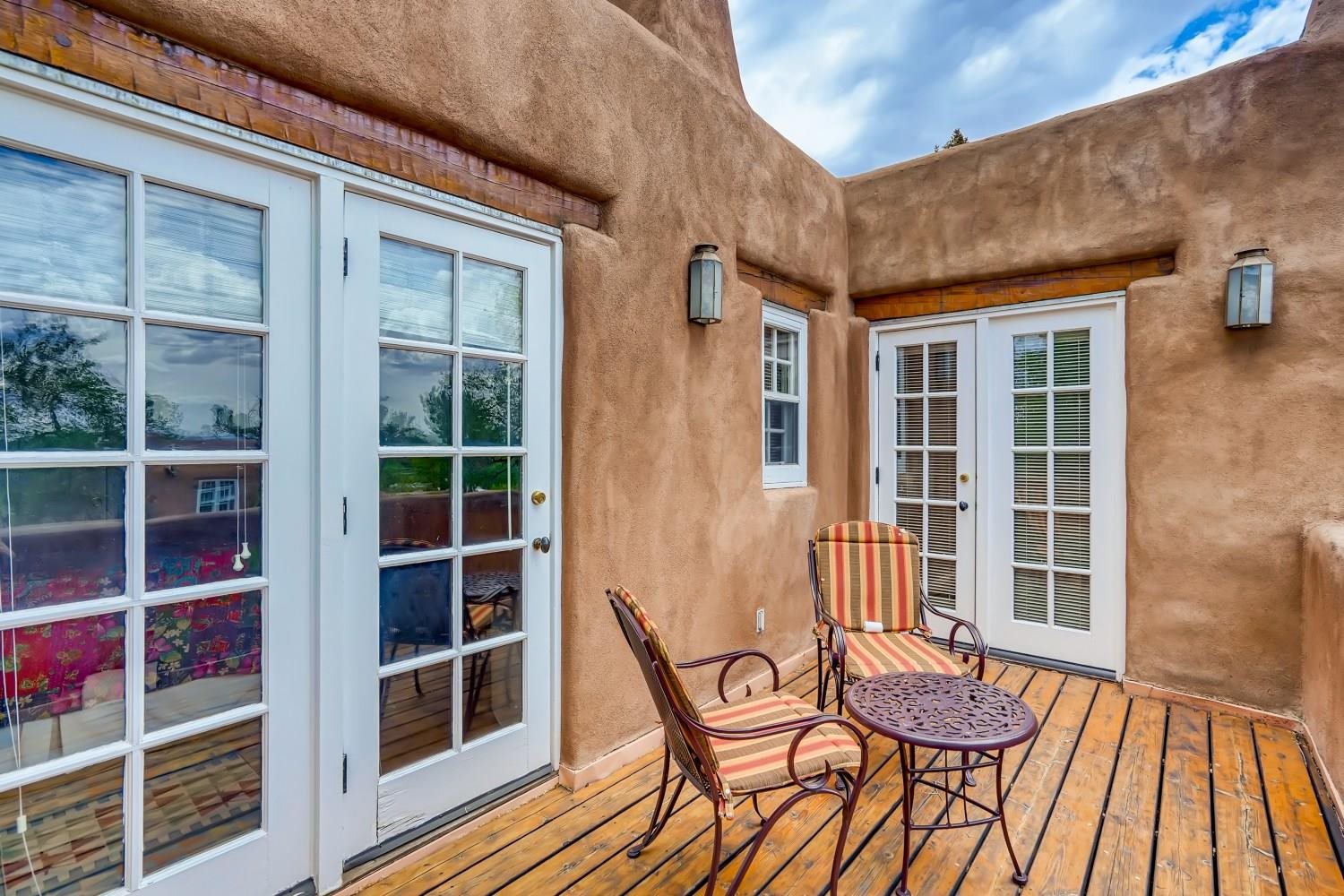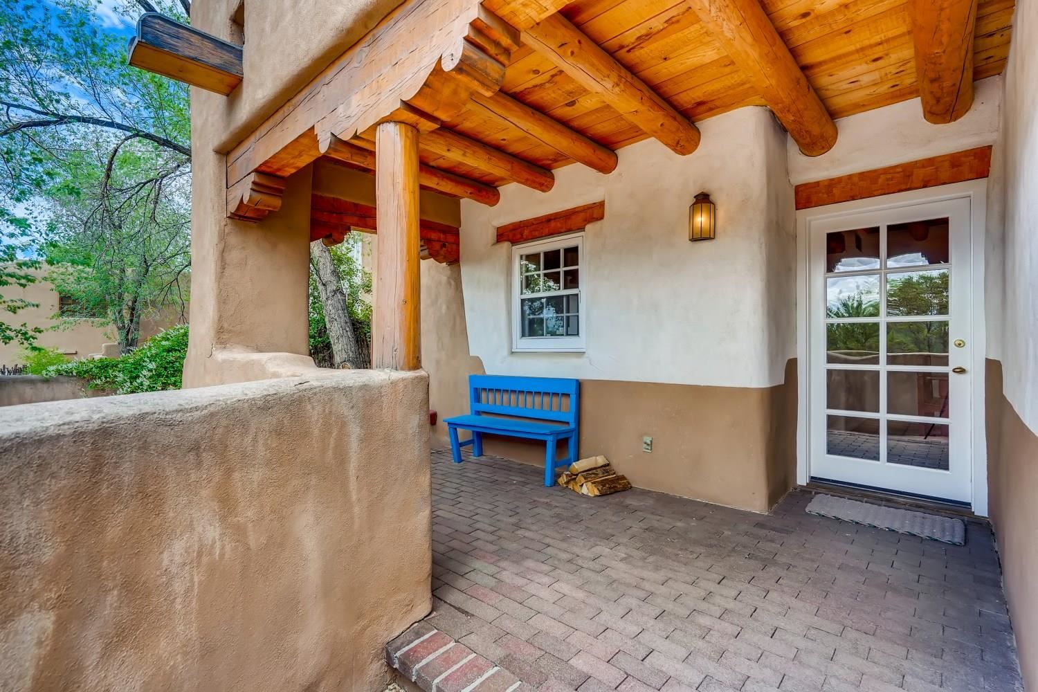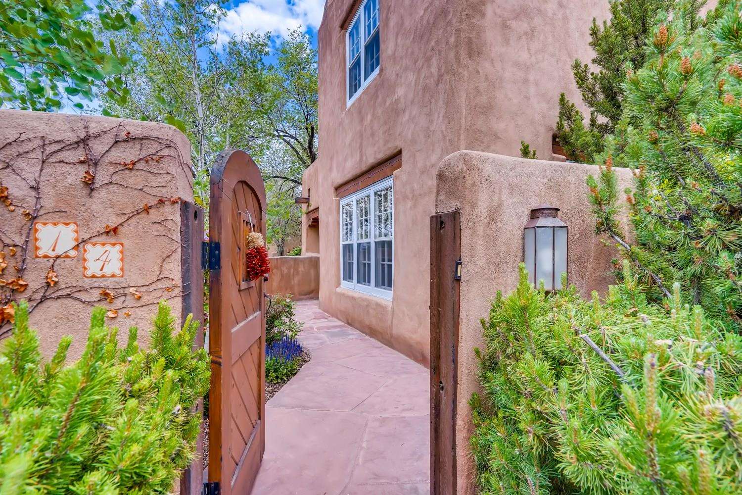 Charming condominium quarter ownership just a few blocks from the Plaza. Beautiful architectural details found in gracious old adobe home with vigas, kiva fireplaces, sculptural smooth plaster walls, hand adzed lintels above windows and doors. Tile kitchen and baths. All furnishings and maintenance, inside and out by Owners Association. Owners Associationmanagement operates established rental program.