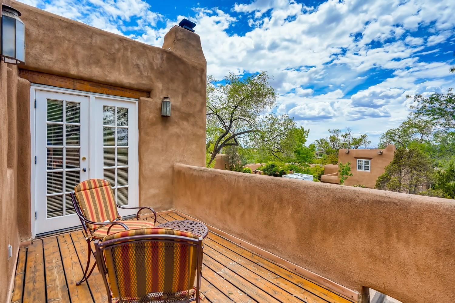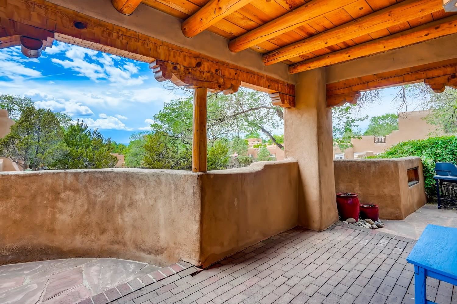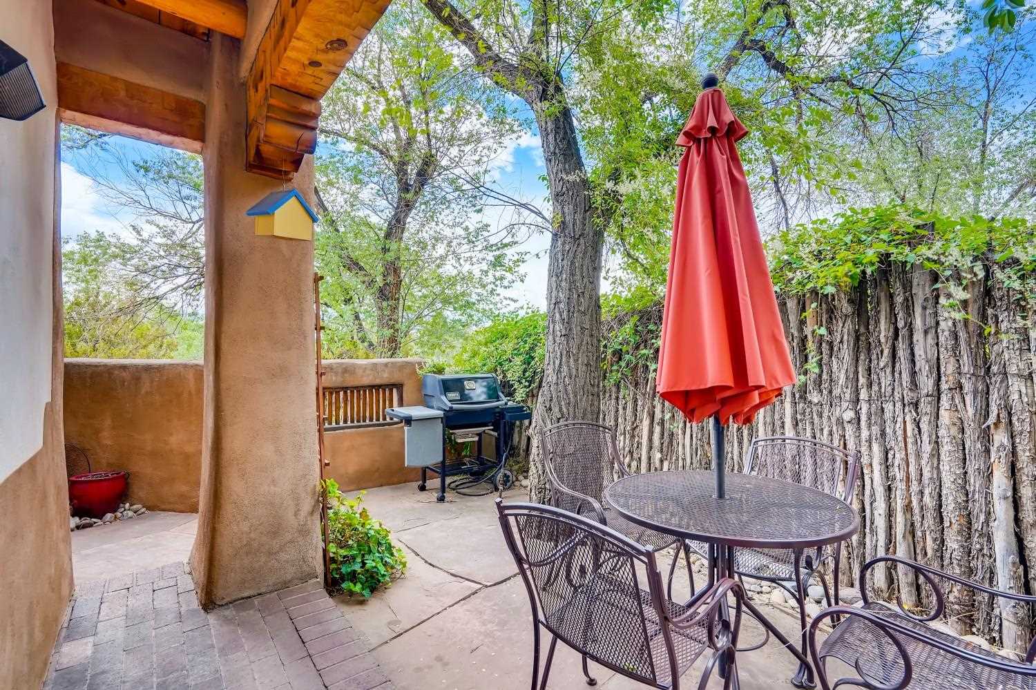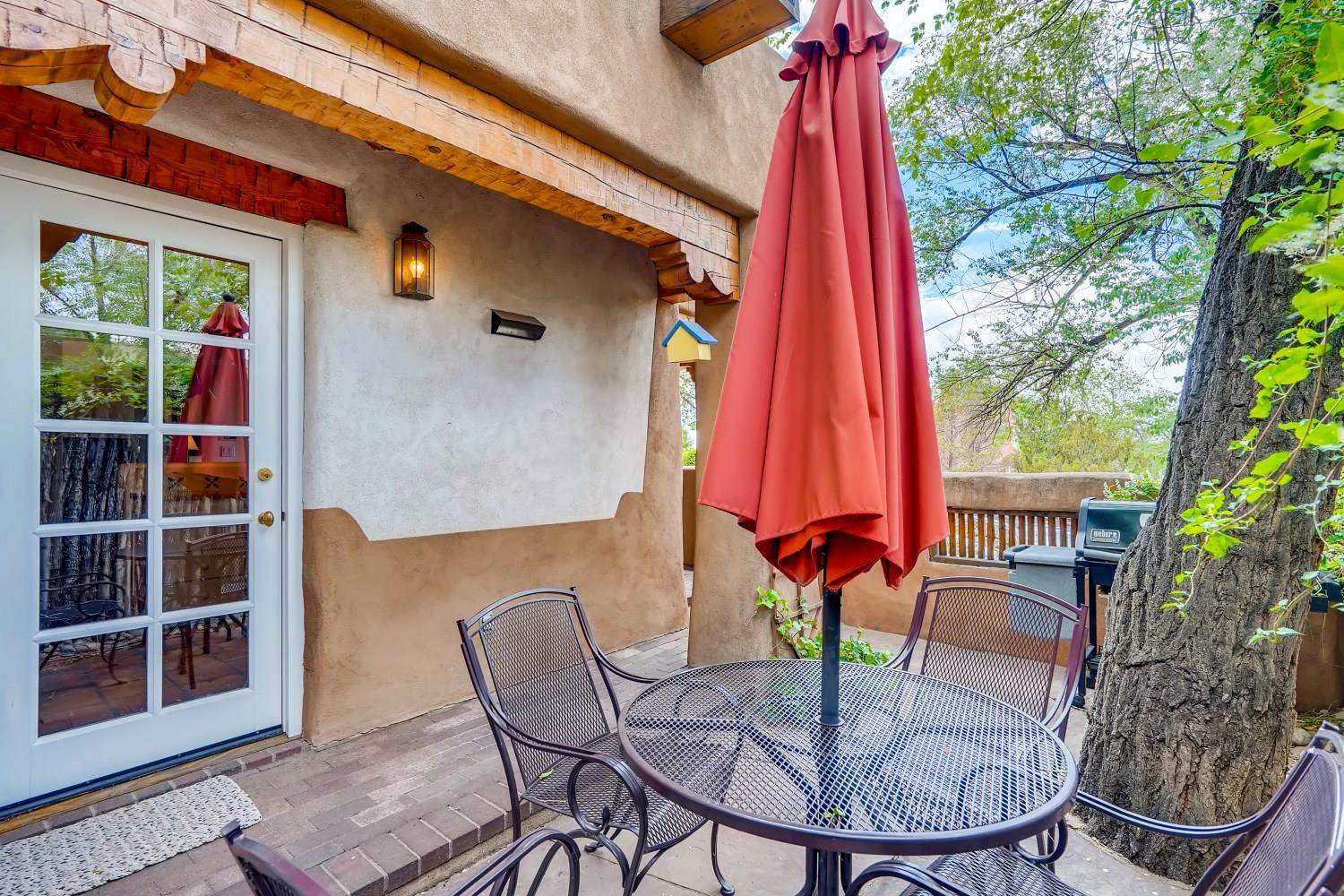 Charming condominium quarter ownership just a few blocks from the Plaza. Beautiful architectural details found in gracious old adobe home with vigas, kiva fireplaces, sculptural smooth plaster walls, hand adzed lintels above windows and doors. Tile kitchen and baths. All furnishings and maintenance, inside and out by Owners Association. Owners Associationmanagement operates established rental program.