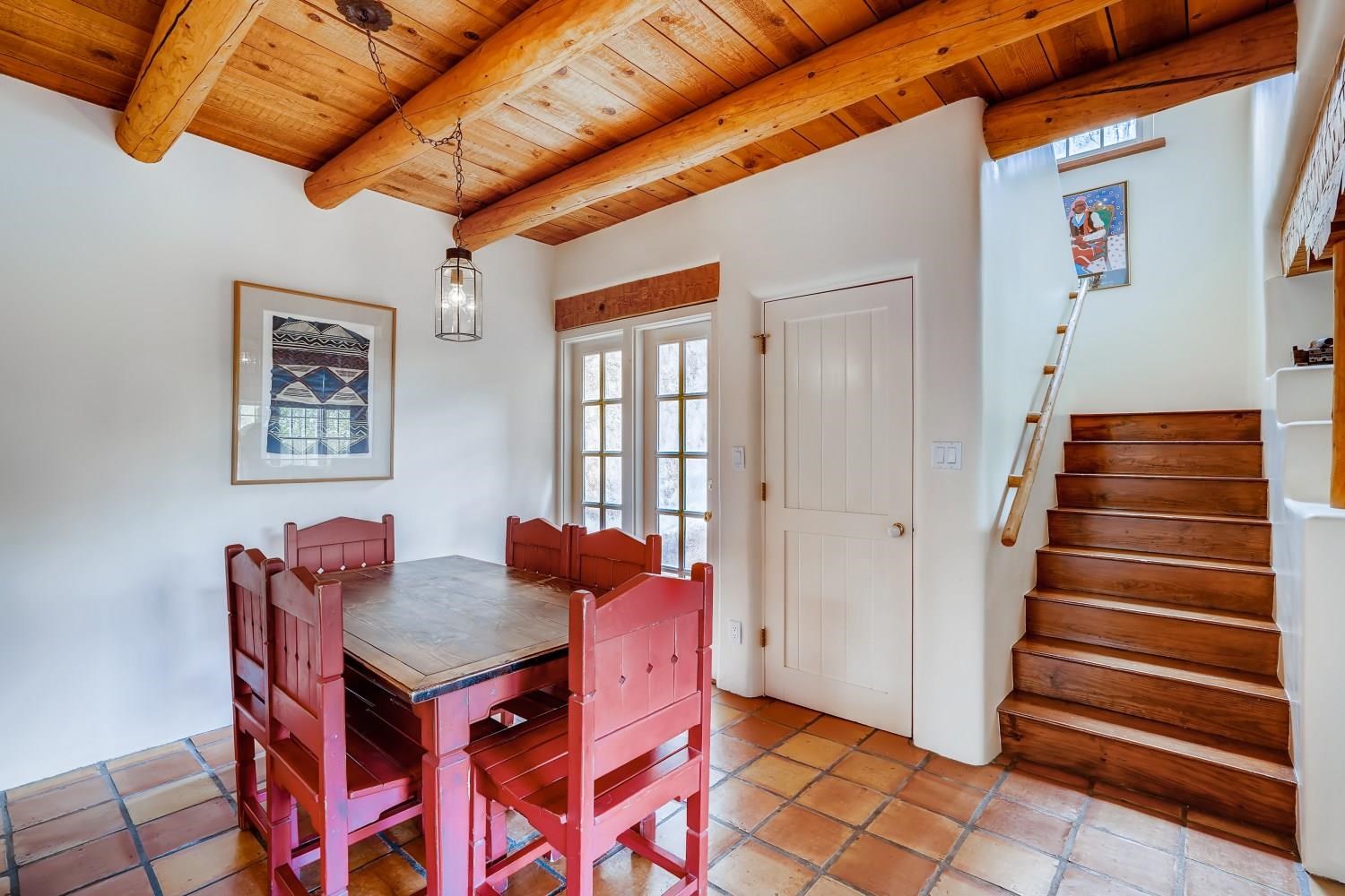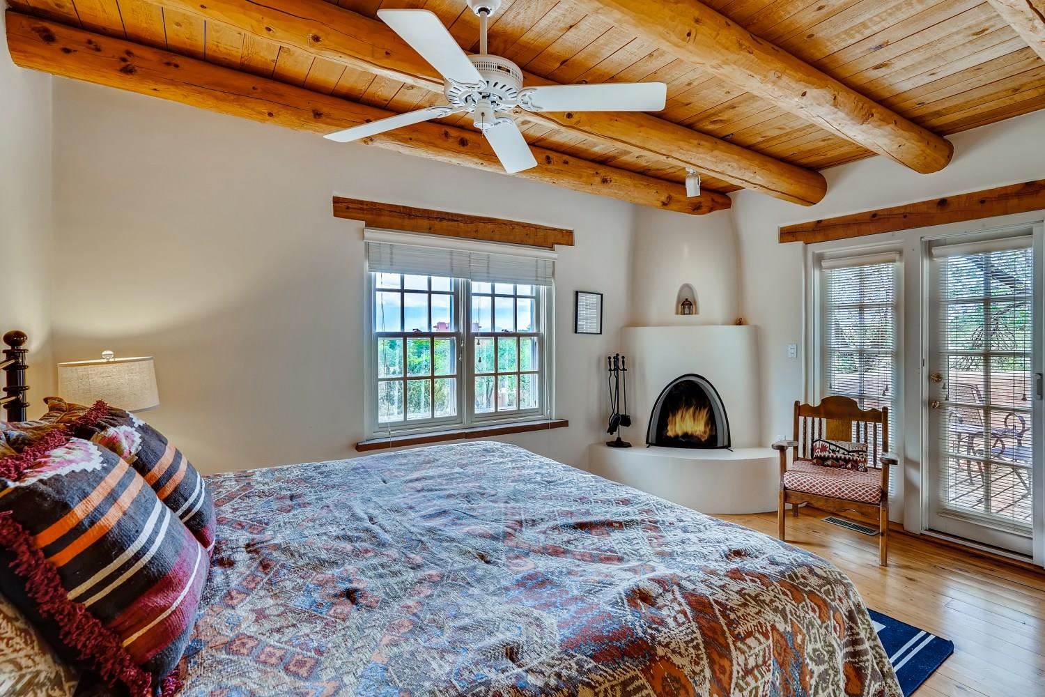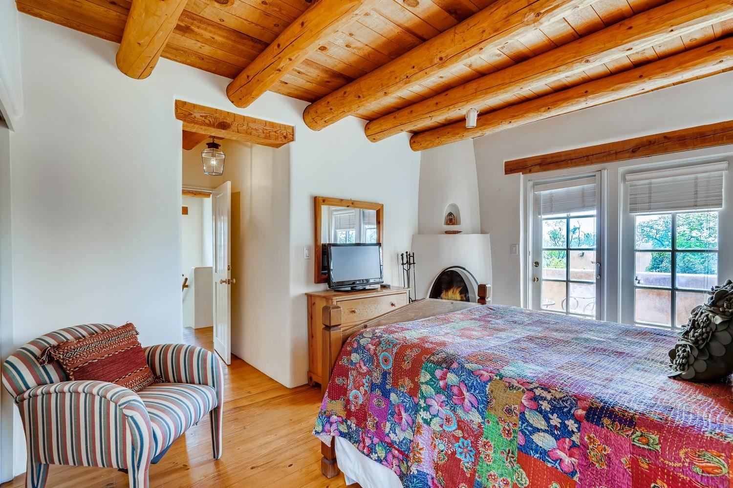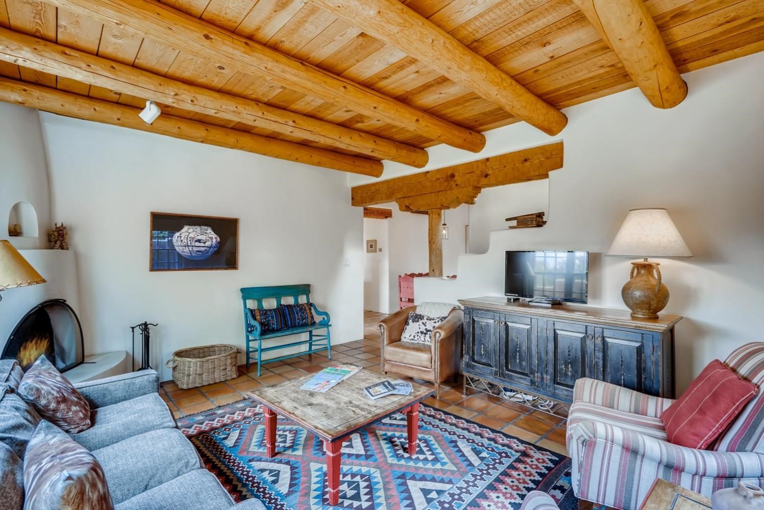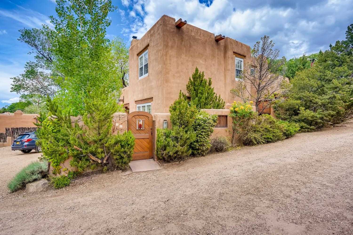 Charming condominium quarter ownership just a few blocks from the Plaza. Beautiful architectural details found in gracious old adobe home with vigas, kiva fireplaces, sculptural smooth plaster walls, hand adzed lintels above windows and doors. Tile kitchen and baths. All furnishings and maintenance, inside and out by Owners Association. Owners Associationmanagement operates established rental program.