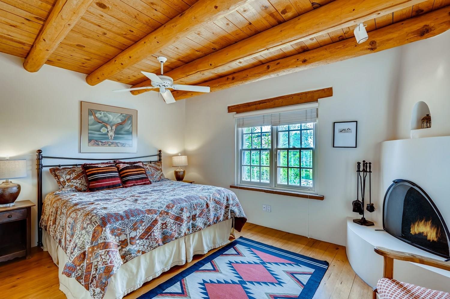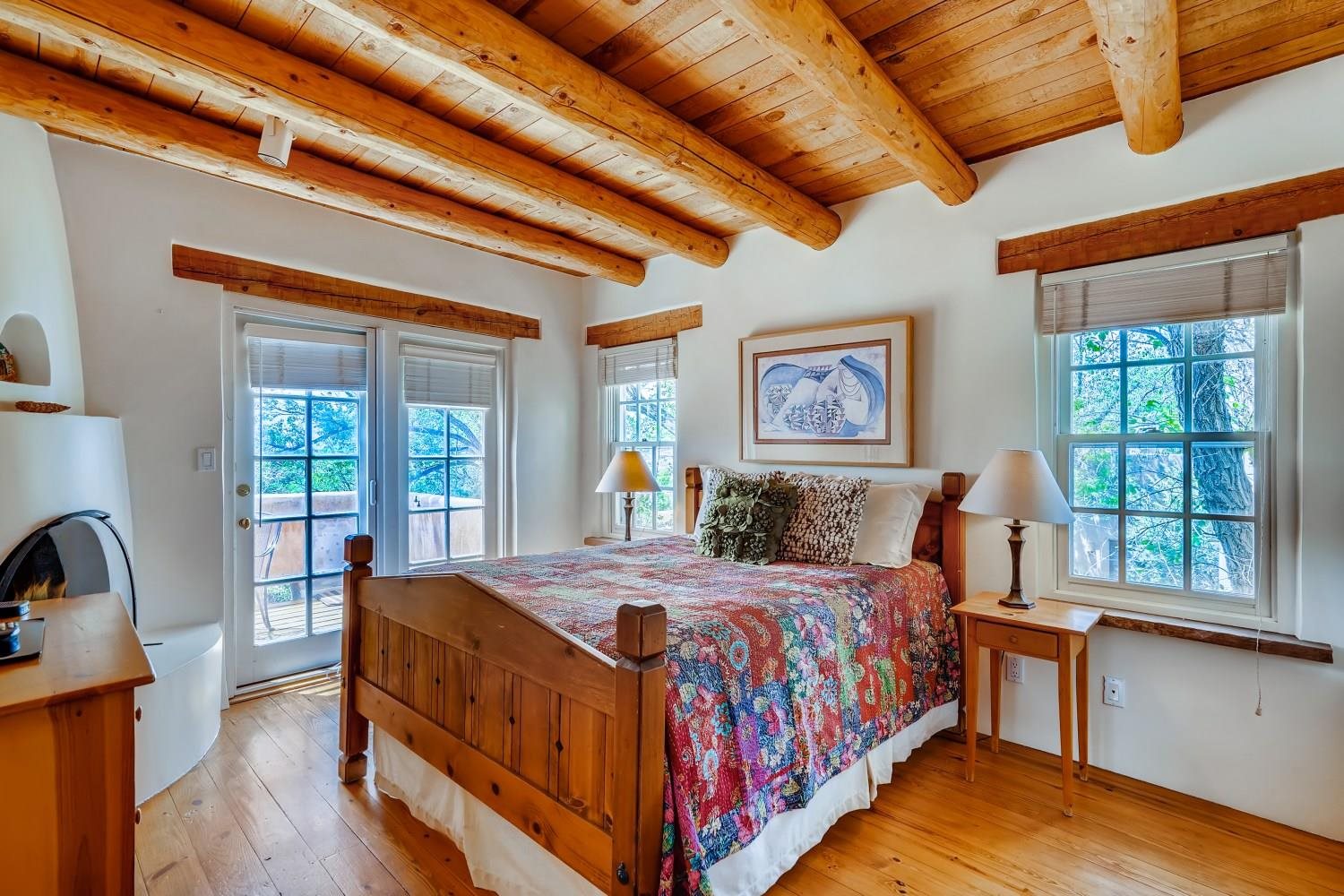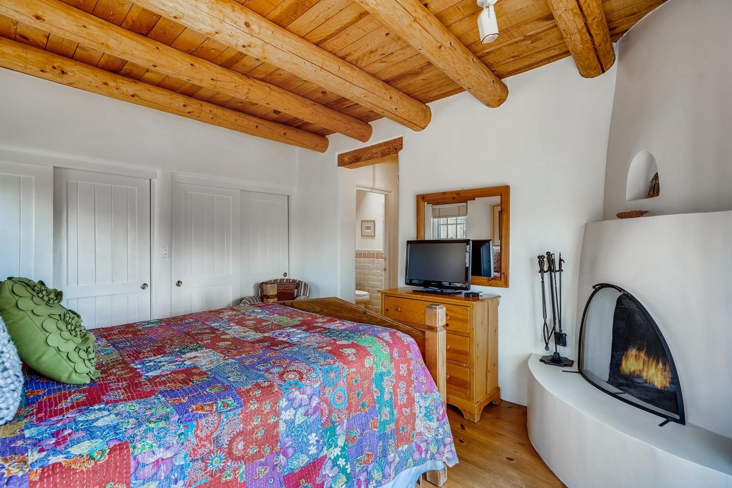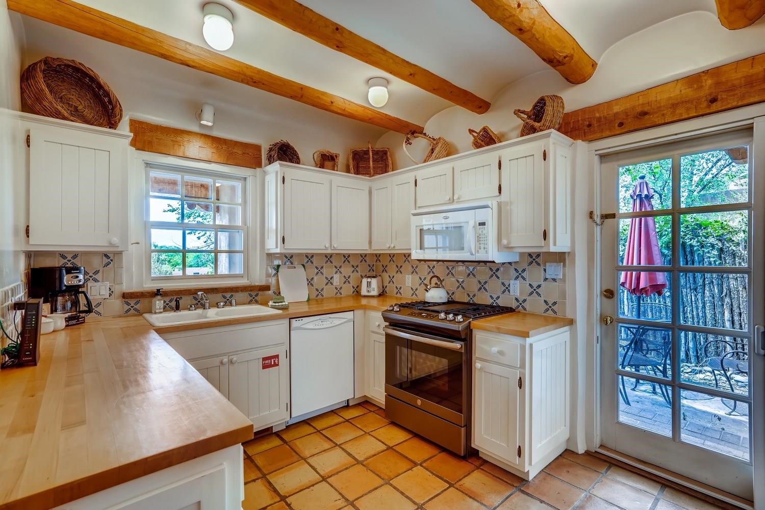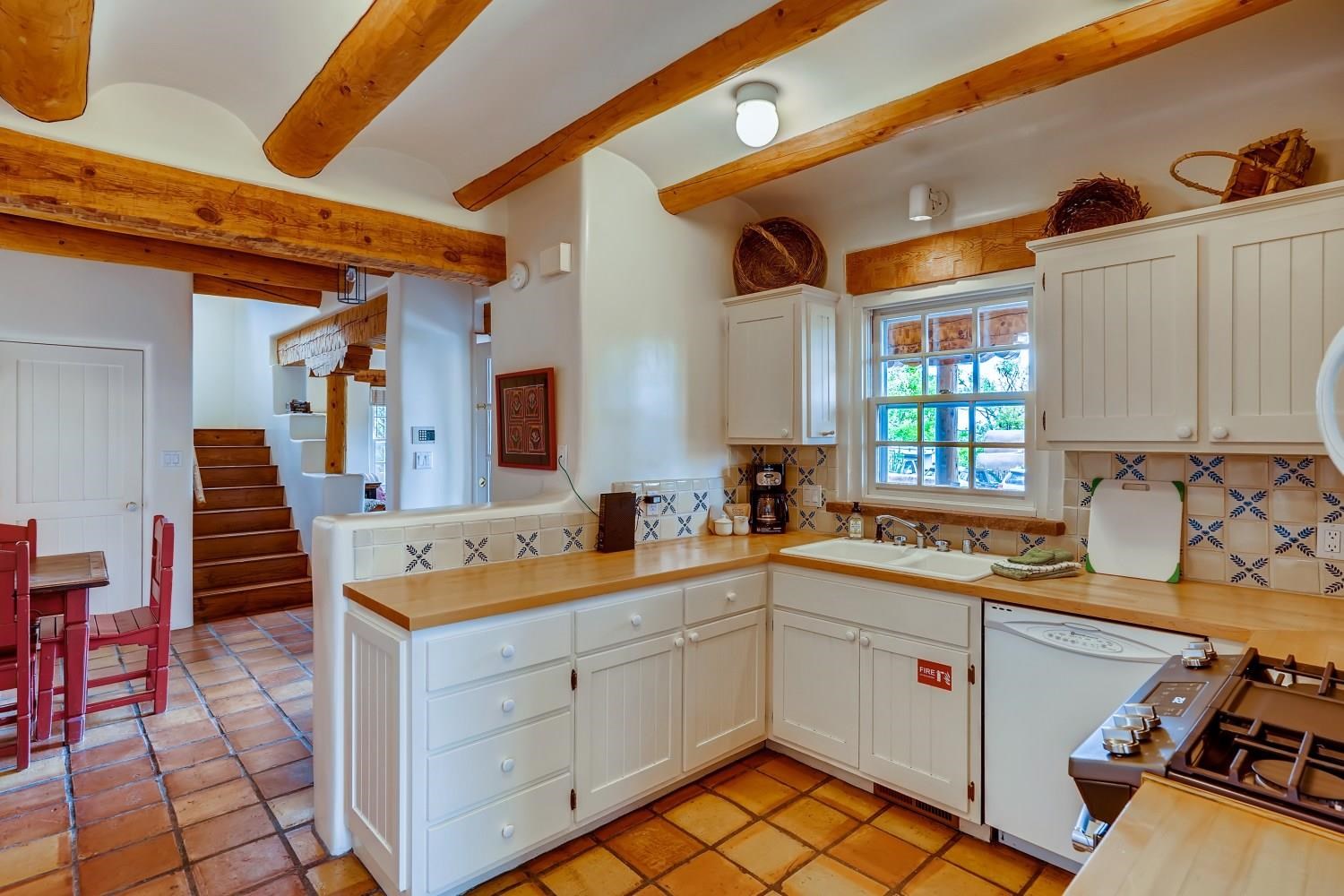 Charming condominium quarter ownership just a few blocks from the Plaza. Beautiful architectural details found in gracious old adobe home with vigas, kiva fireplaces, sculptural smooth plaster walls, hand adzed lintels above windows and doors. Tile kitchen and baths. All furnishings and maintenance, inside and out by Owners Association. Owners Associationmanagement operates established rental program.