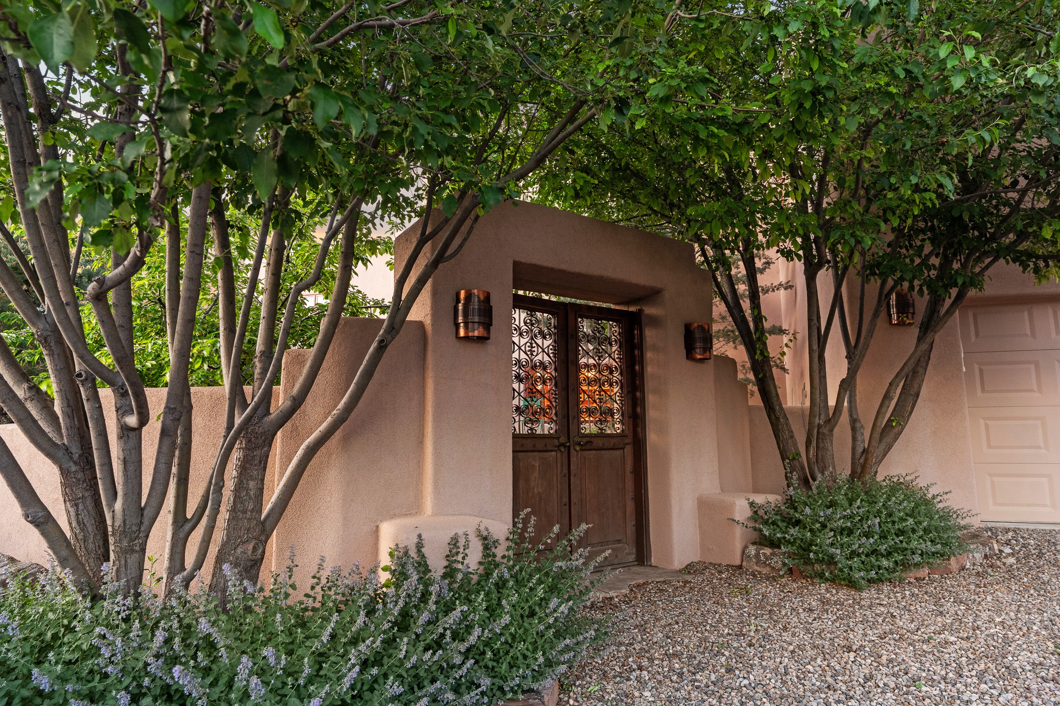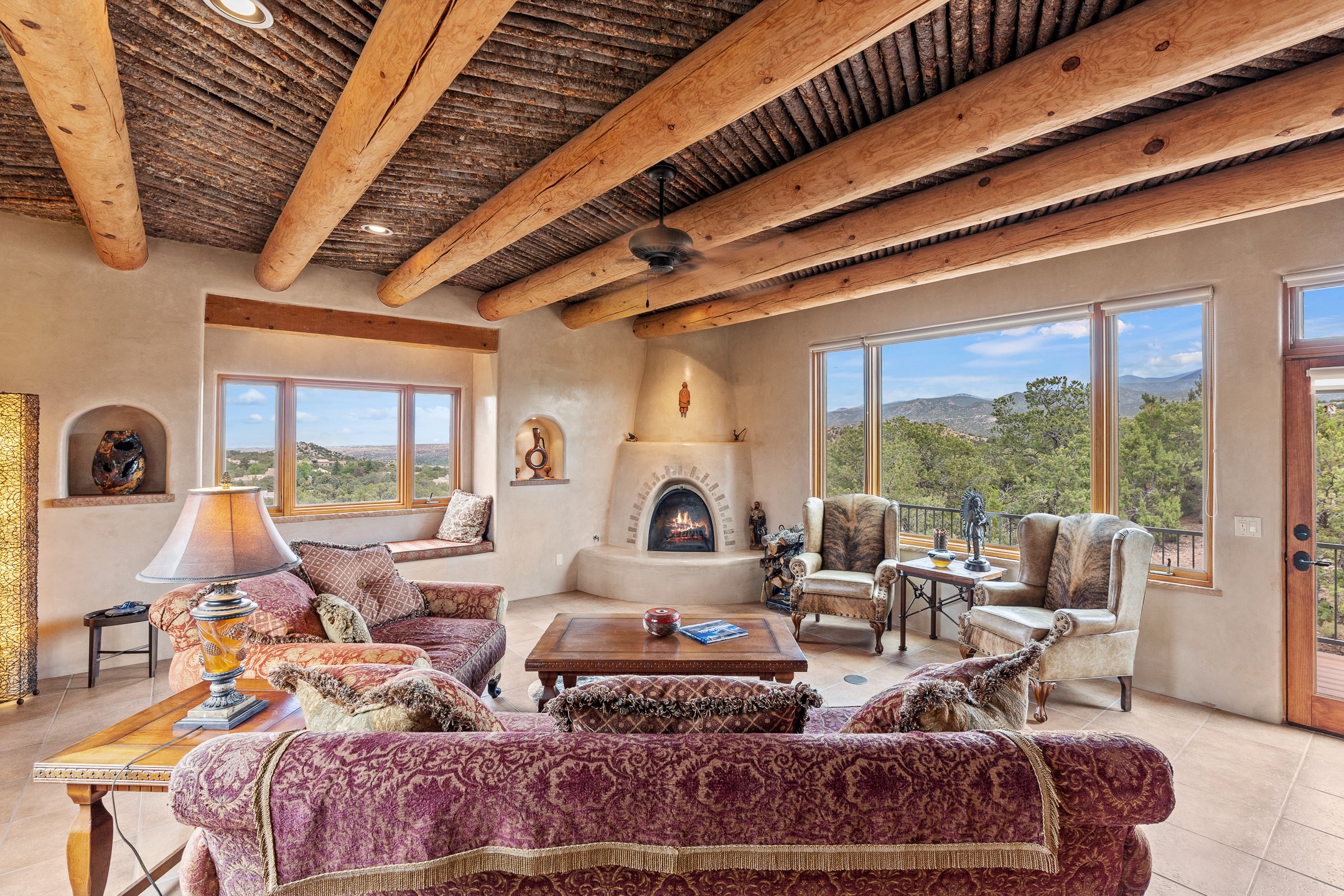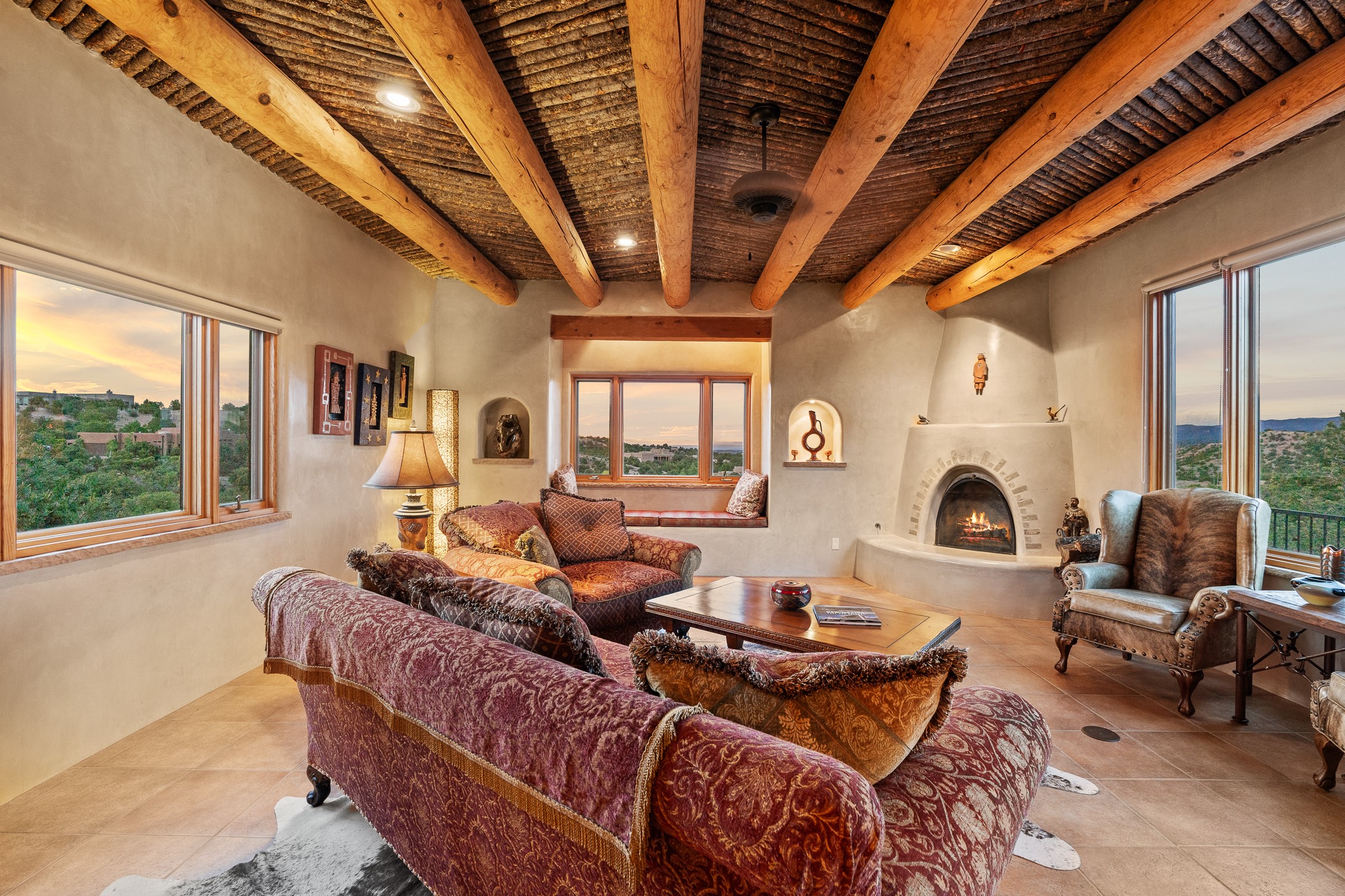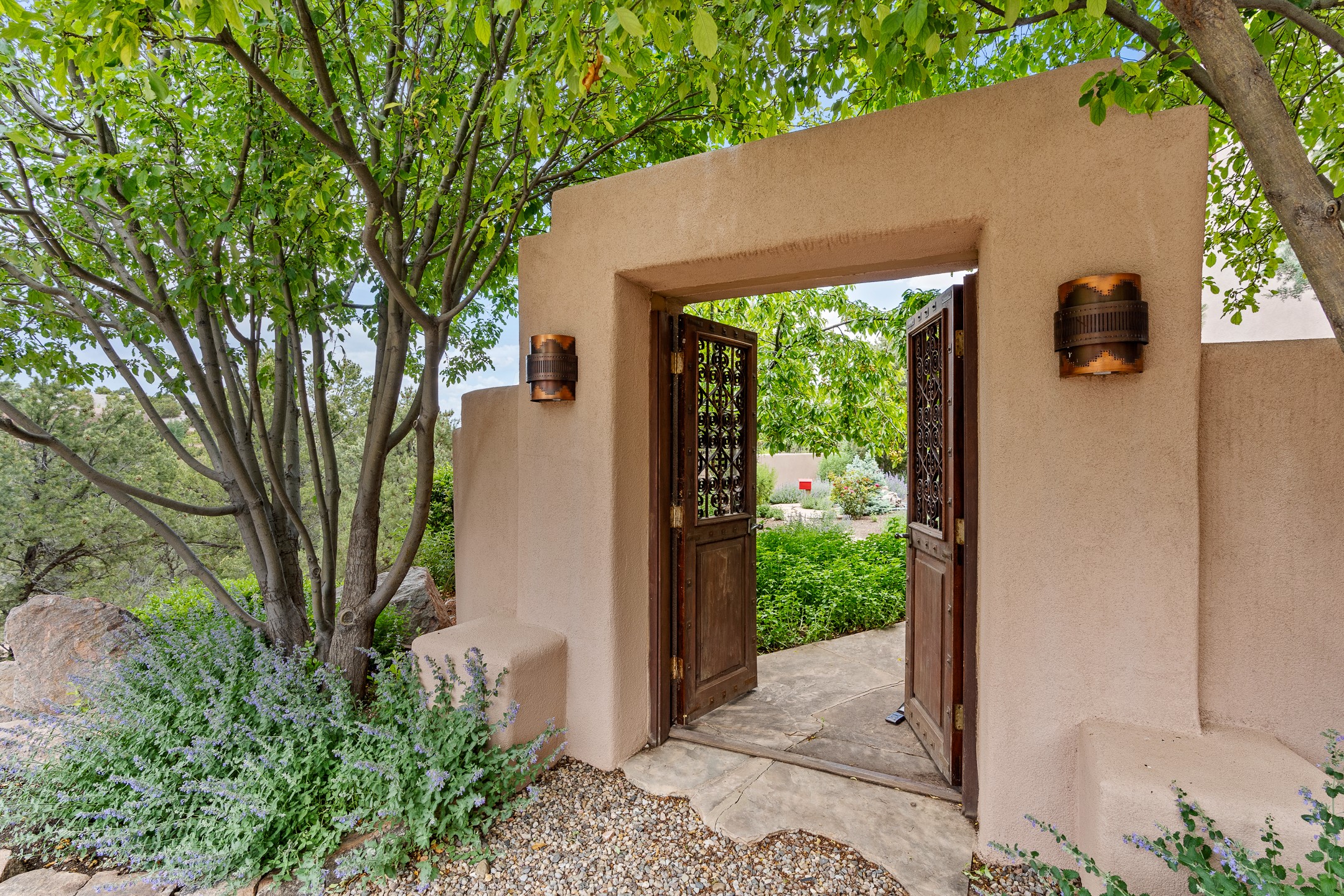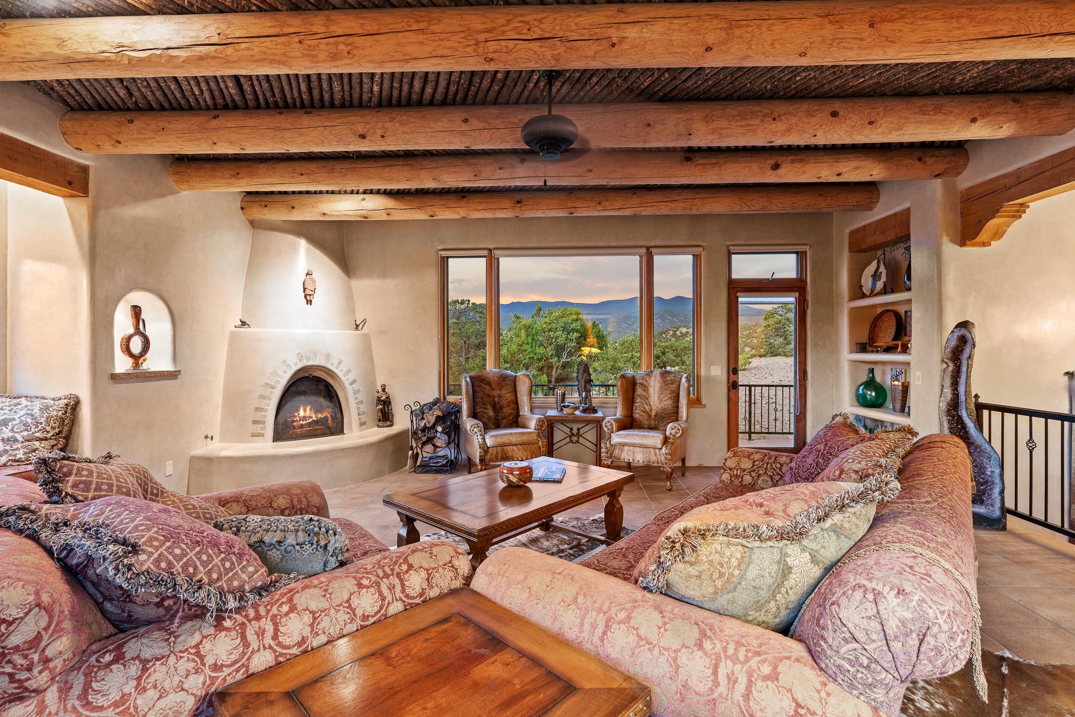Santa Fe Elegance with Sangre de Cristo Mountain Views.Located in a gated enclave just minutes from the Santa Fe Opera, this 3,000 sq ft residence offers sweeping Sangre de Cristo views from nearly every room. Privately set on 2.7 acres, the home showcases timeless Santa Fe style with diamond plaster walls, vigas, latilla ceilings, and a classic kiva fireplace.The upper level, the heart of the home, features a chef's kitchen with professional Wolf 6 burner range, and grill, pot filler, built-in wine captain fridge, a Wolf double oven and Sub zero stainless refrigerator, a dining room, expansive living room, and a serene primary suite, all thoughtfully positioned to capture the stunning vistas. A large entertainer's deck invites outdoor dining and sunset gatherings.The lower level offers a flexible den/office and a private guest suite, accessed through a charming gated courtyard. Additional highlights include an 850-bottle climate-controlled wine cellar, generous storage, and three custom rock water features that add tranquility throughout the mature landscaped gardens.A rare blend of privacy, style, and panoramic beauty--just minutes from world-class music, culture, and cuisine.