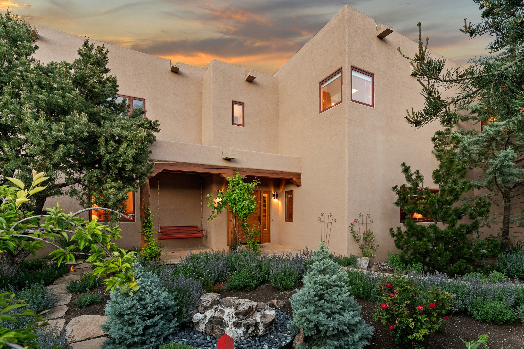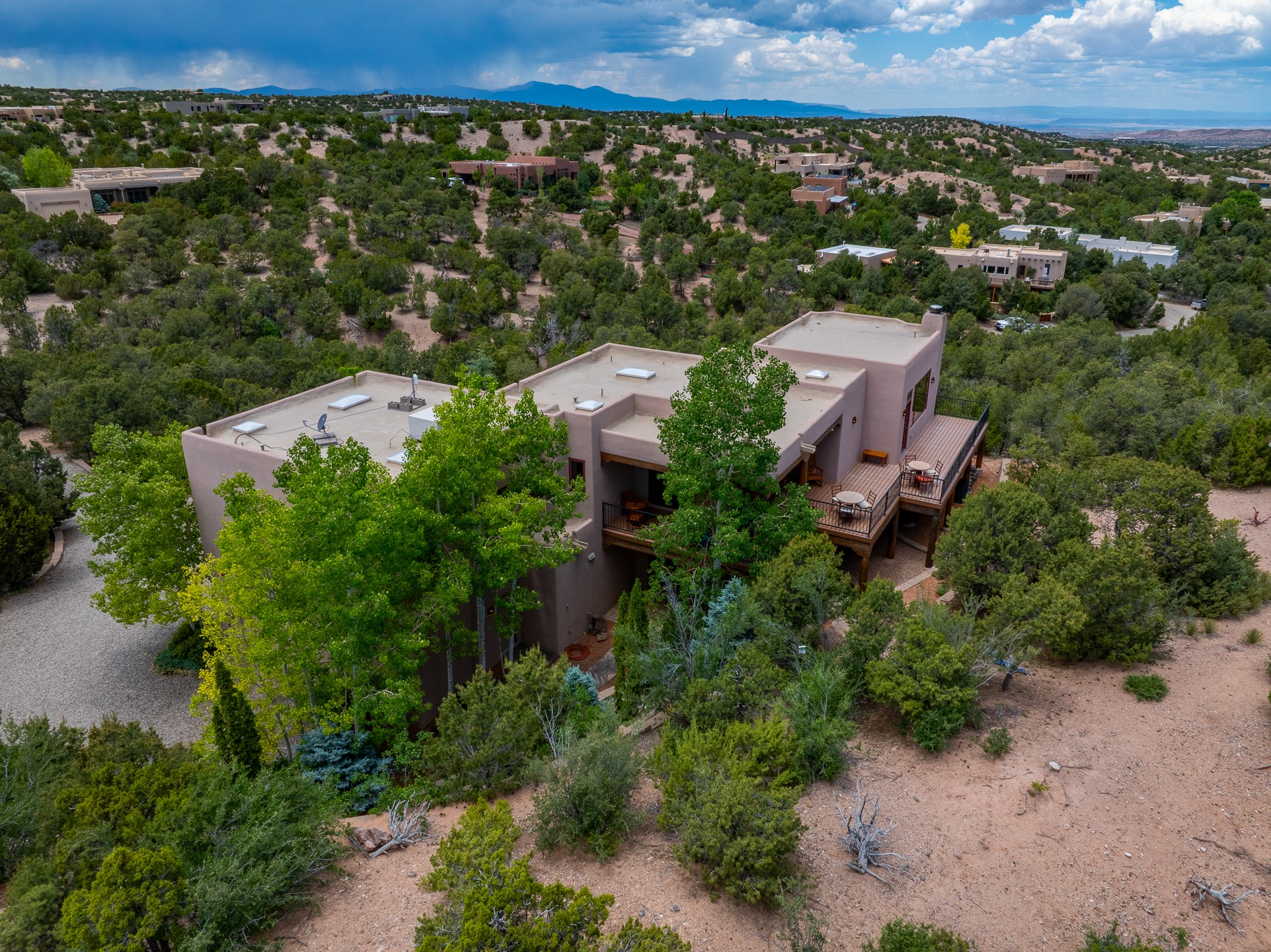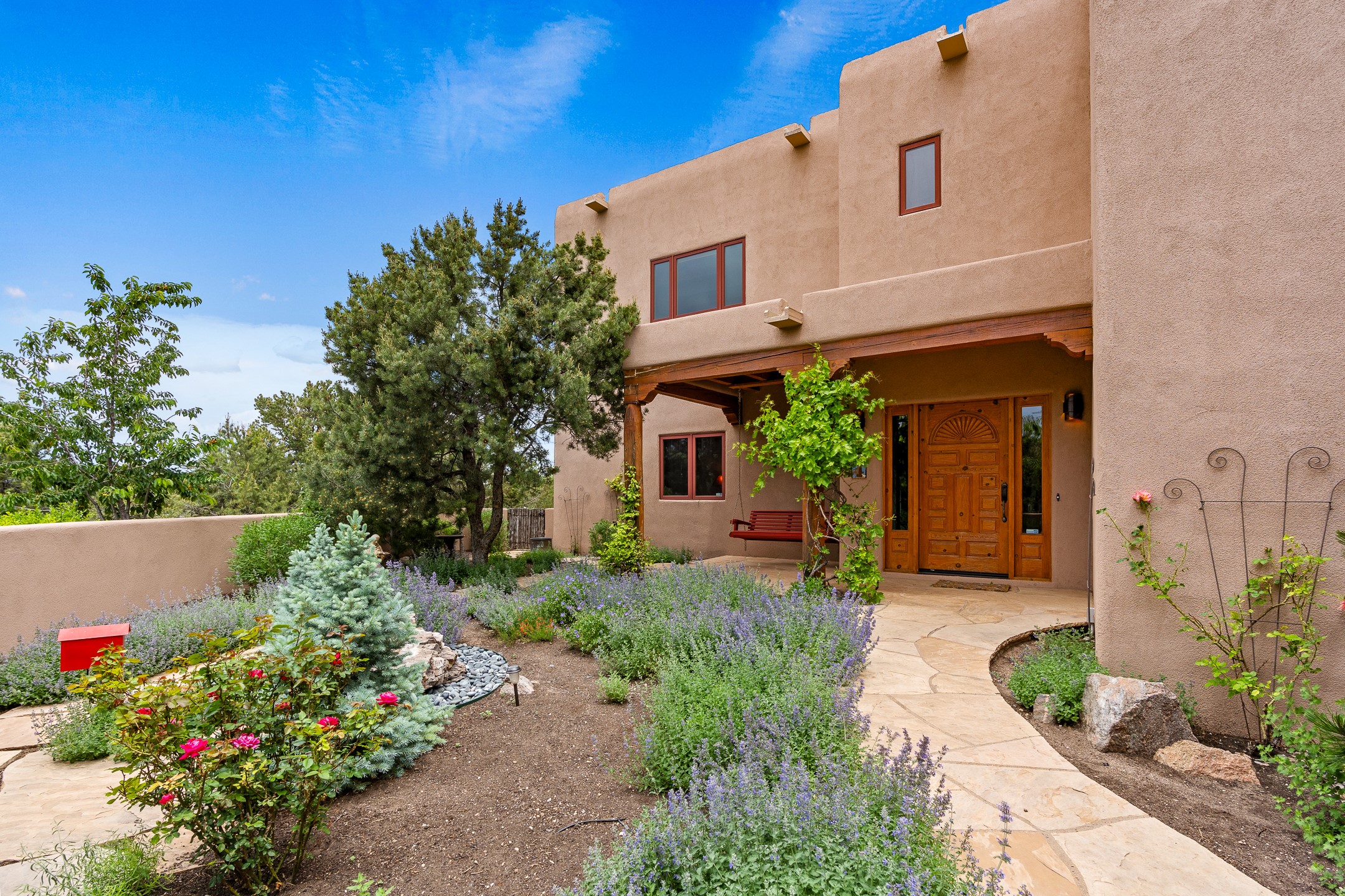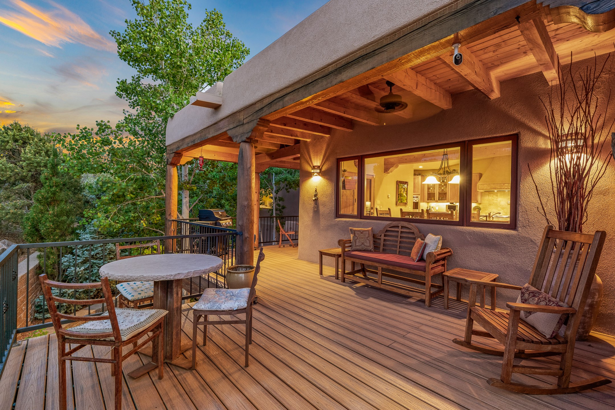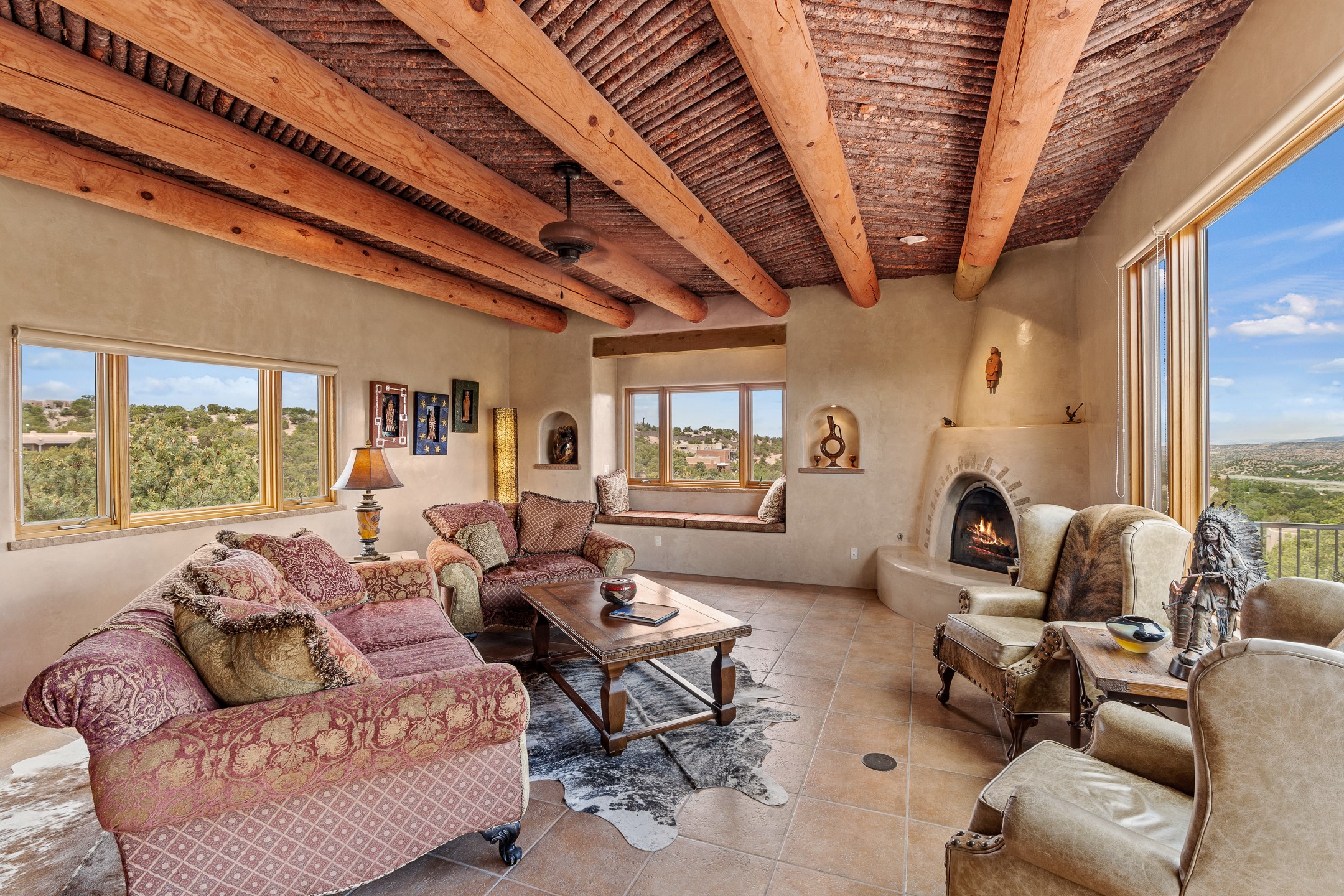 Santa Fe Elegance with Sangre de Cristo Mountain Views.Located in a gated enclave just minutes from the Santa Fe Opera, this 3,000 sq ft residence offers sweeping Sangre de Cristo views from nearly every room. Privately set on 2.7 acres, the home showcases timeless Santa Fe style with diamond plaster walls, vigas, latilla ceilings, and a classic kiva fireplace.The upper level, the heart of the home, features a chef's kitchen with professional Wolf 6 burner range, and grill, pot filler, built-in wine captain fridge, a Wolf double oven and Sub zero stainless refrigerator, a dining room, expansive living room, and a serene primary suite, all thoughtfully positioned to capture the stunning vistas. A large entertainer's deck invites outdoor dining and sunset gatherings.The lower level offers a flexible den/office and a private guest suite, accessed through a charming gated courtyard. Additional highlights include an 850-bottle climate-controlled wine cellar, generous storage, and three custom rock water features that add tranquility throughout the mature landscaped gardens.A rare blend of privacy, style, and panoramic beauty--just minutes from world-class music, culture, and cuisine.