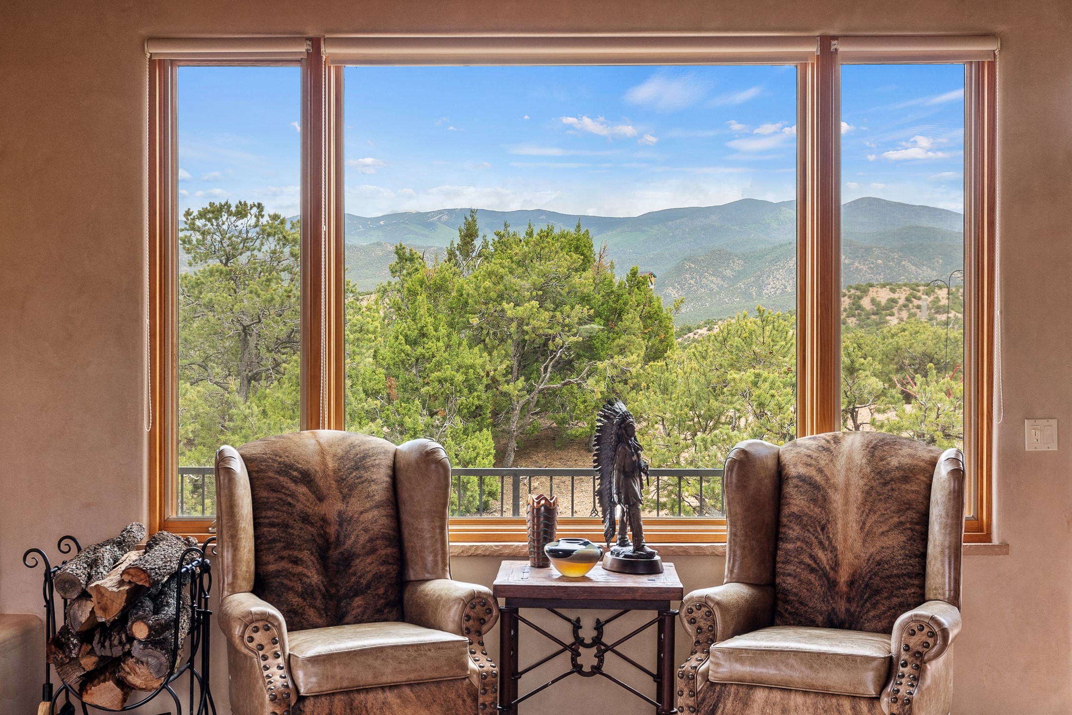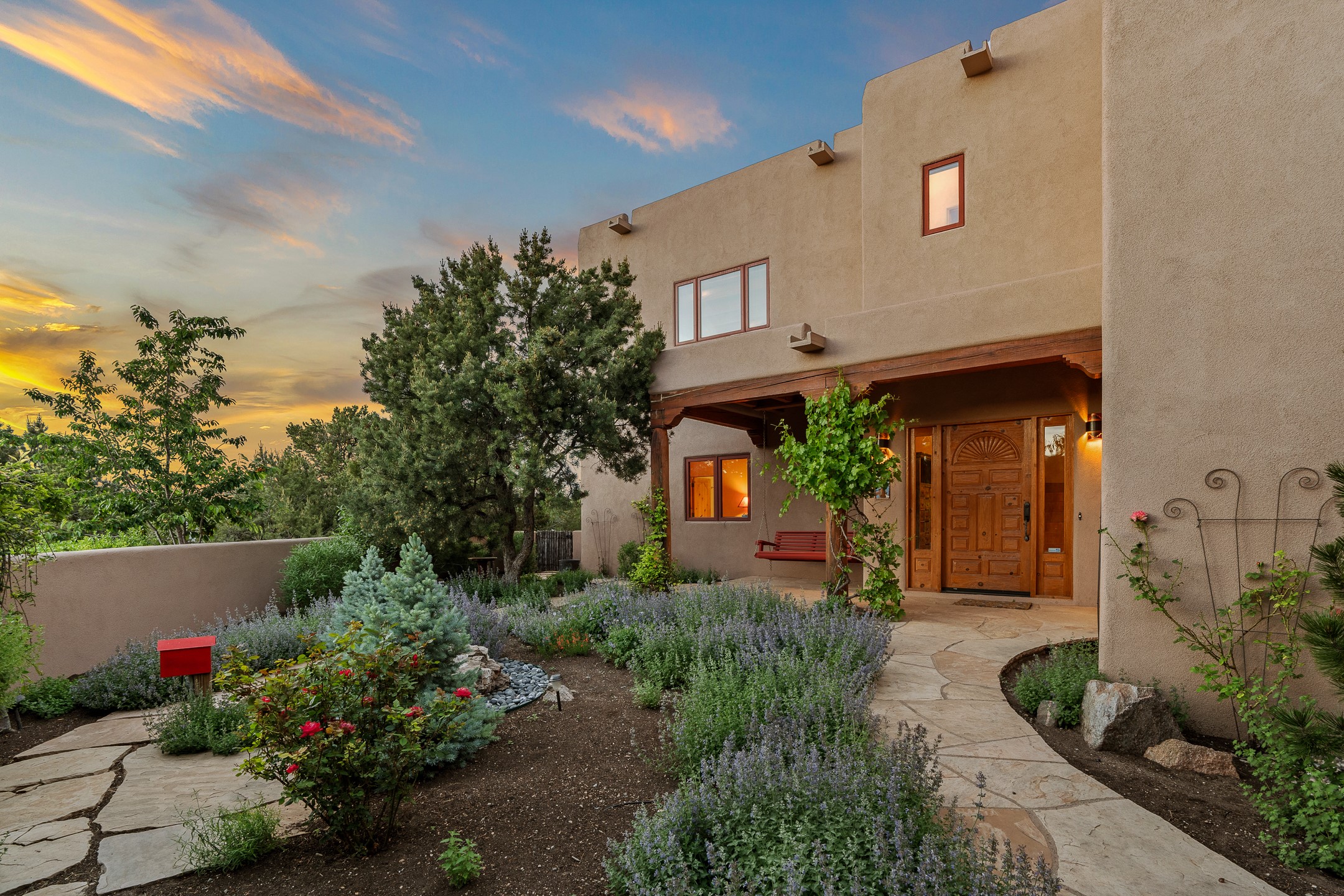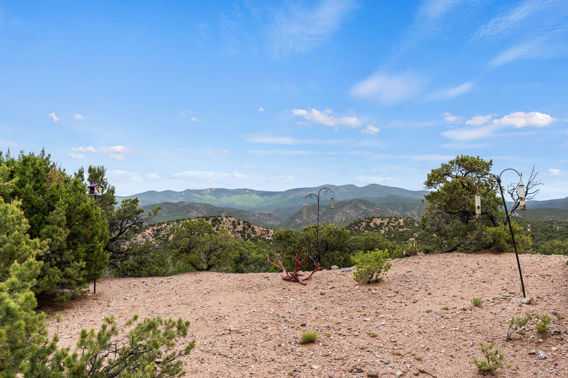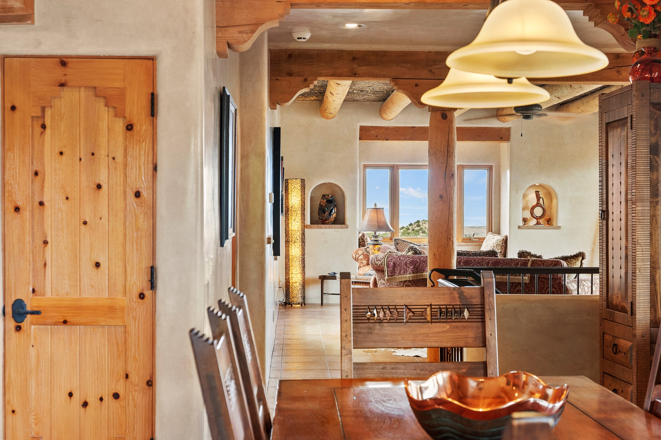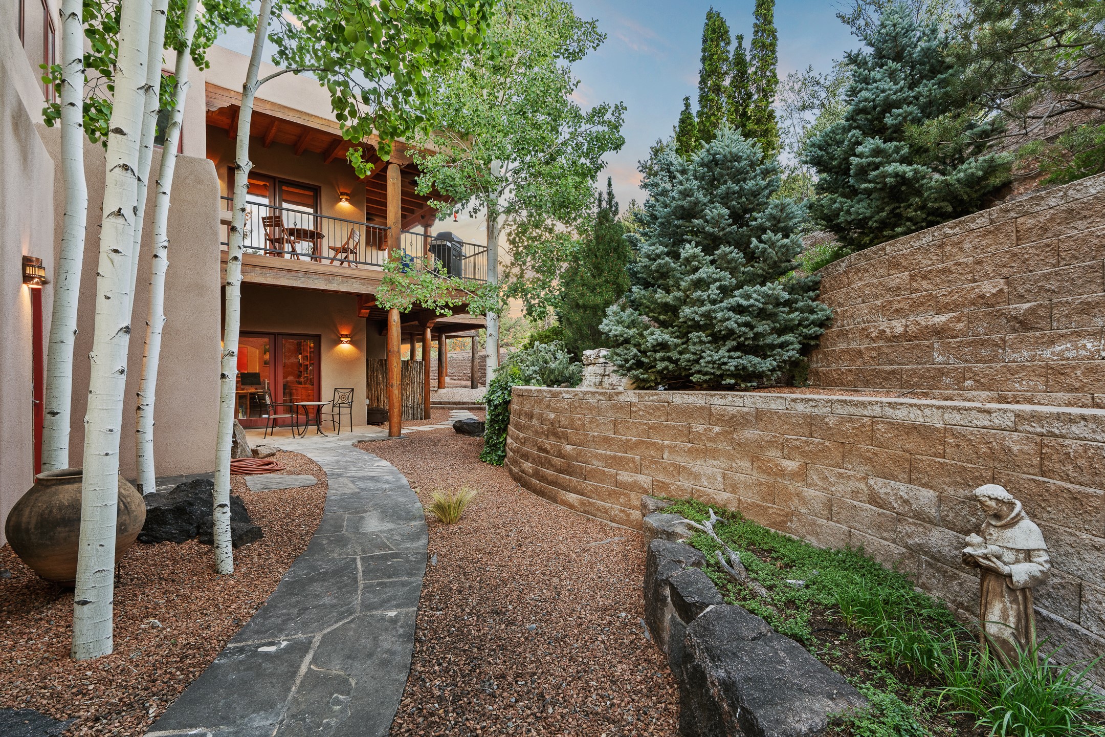 Santa Fe Elegance with Sangre de Cristo Mountain Views.Located in a gated enclave just minutes from the Santa Fe Opera, this 3,000 sq ft residence offers sweeping Sangre de Cristo views from nearly every room. Privately set on 2.7 acres, the home showcases timeless Santa Fe style with diamond plaster walls, vigas, latilla ceilings, and a classic kiva fireplace.The upper level, the heart of the home, features a chef's kitchen with professional Wolf 6 burner range, and grill, pot filler, built-in wine captain fridge, a Wolf double oven and Sub zero stainless refrigerator, a dining room, expansive living room, and a serene primary suite, all thoughtfully positioned to capture the stunning vistas. A large entertainer's deck invites outdoor dining and sunset gatherings.The lower level offers a flexible den/office and a private guest suite, accessed through a charming gated courtyard. Additional highlights include an 850-bottle climate-controlled wine cellar, generous storage, and three custom rock water features that add tranquility throughout the mature landscaped gardens.A rare blend of privacy, style, and panoramic beauty--just minutes from world-class music, culture, and cuisine.