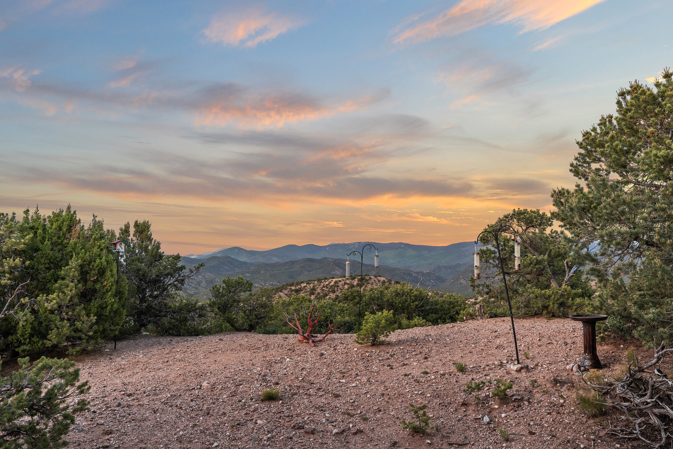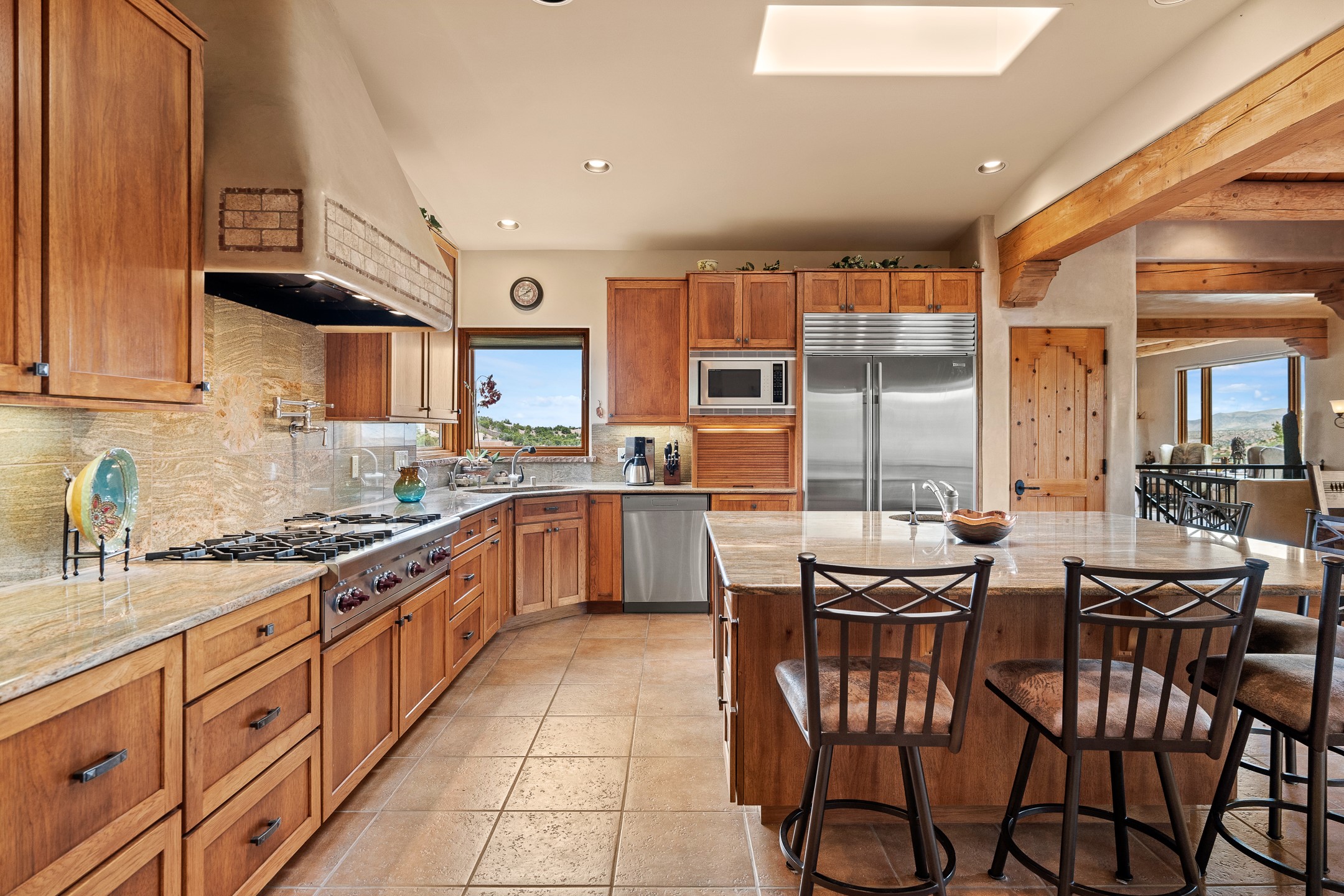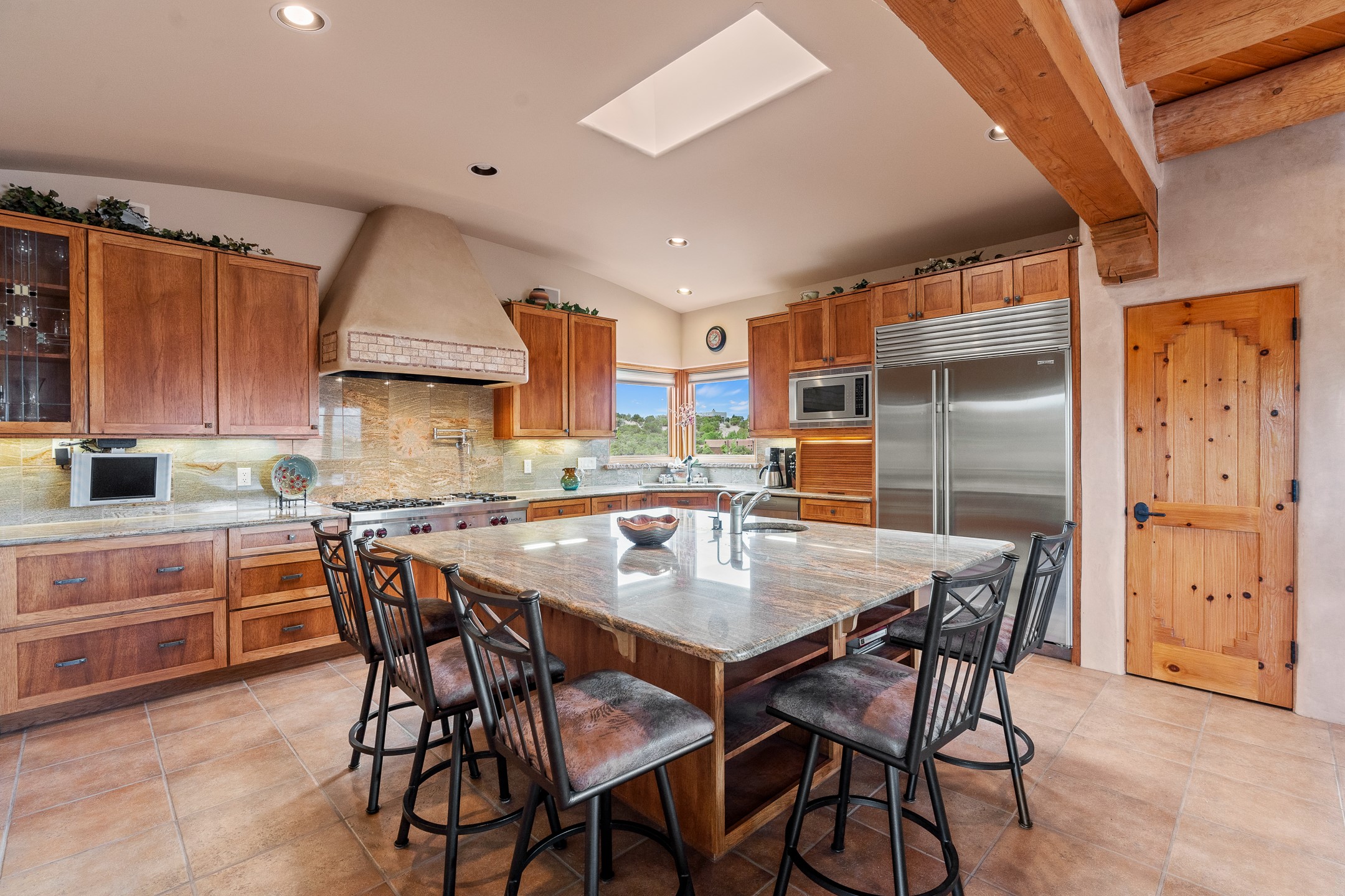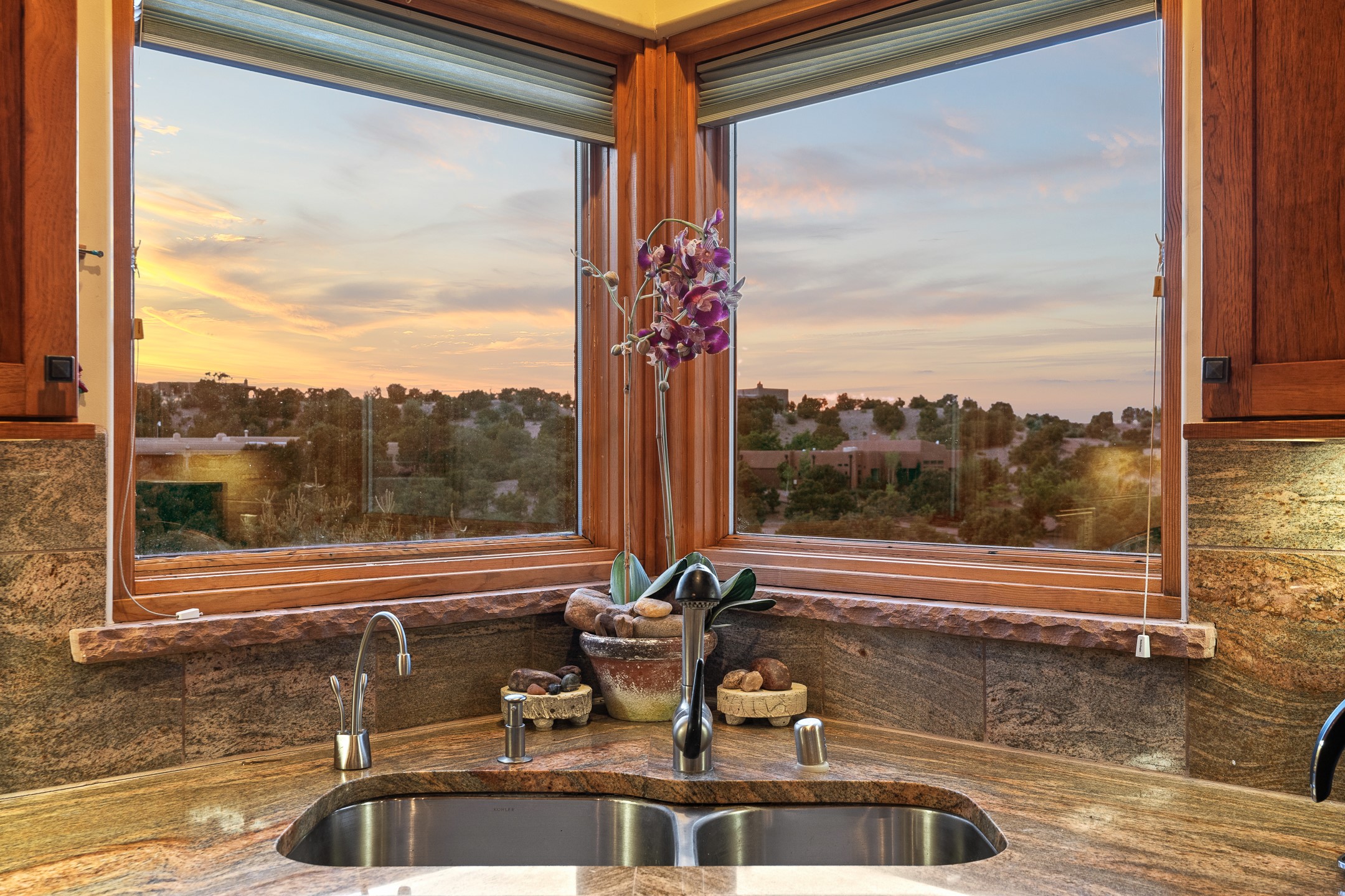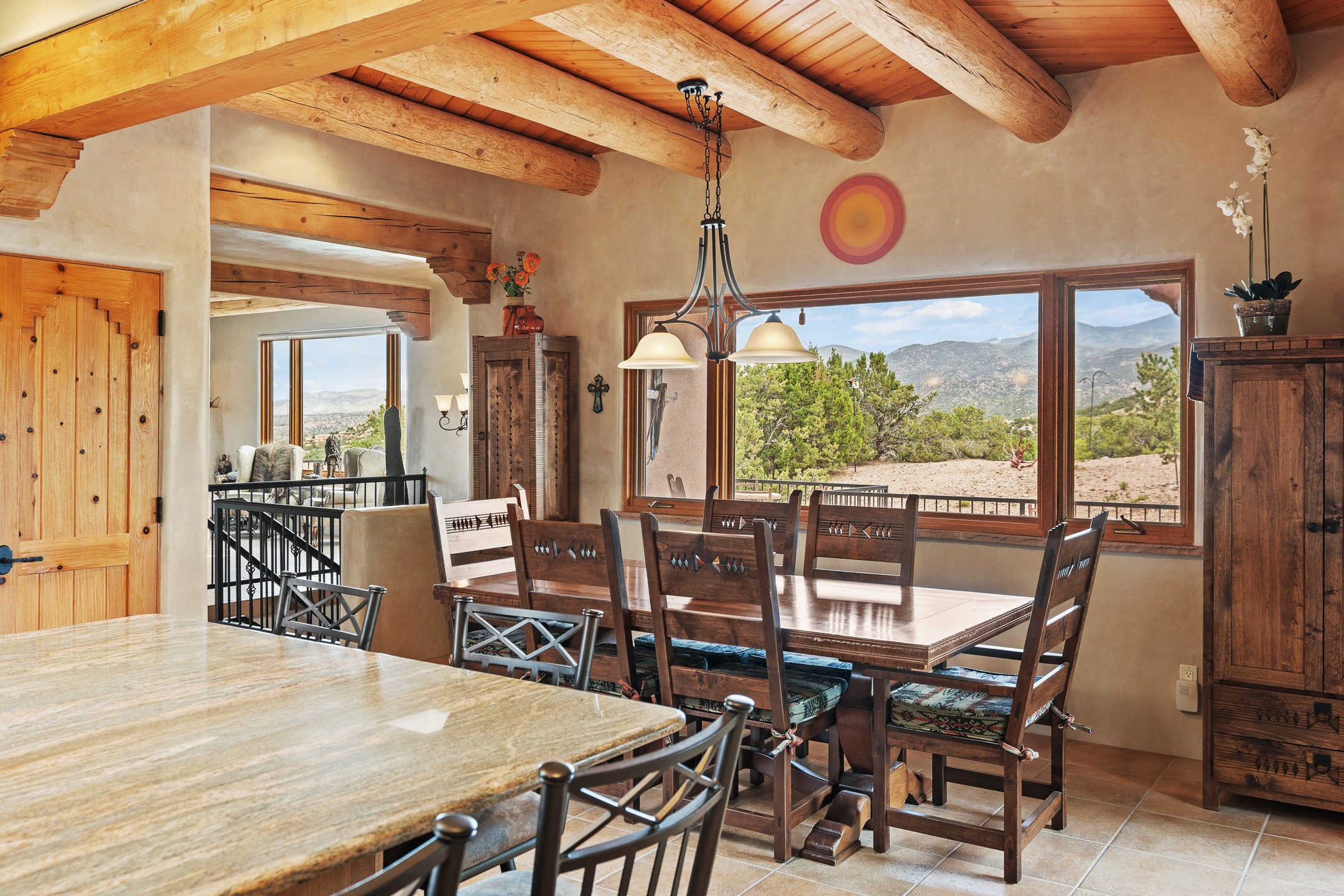 Santa Fe Elegance with Sangre de Cristo Mountain Views.Located in a gated enclave just minutes from the Santa Fe Opera, this 3,000 sq ft residence offers sweeping Sangre de Cristo views from nearly every room. Privately set on 2.7 acres, the home showcases timeless Santa Fe style with diamond plaster walls, vigas, latilla ceilings, and a classic kiva fireplace.The upper level, the heart of the home, features a chef's kitchen with professional Wolf 6 burner range, and grill, pot filler, built-in wine captain fridge, a Wolf double oven and Sub zero stainless refrigerator, a dining room, expansive living room, and a serene primary suite, all thoughtfully positioned to capture the stunning vistas. A large entertainer's deck invites outdoor dining and sunset gatherings.The lower level offers a flexible den/office and a private guest suite, accessed through a charming gated courtyard. Additional highlights include an 850-bottle climate-controlled wine cellar, generous storage, and three custom rock water features that add tranquility throughout the mature landscaped gardens.A rare blend of privacy, style, and panoramic beauty--just minutes from world-class music, culture, and cuisine.