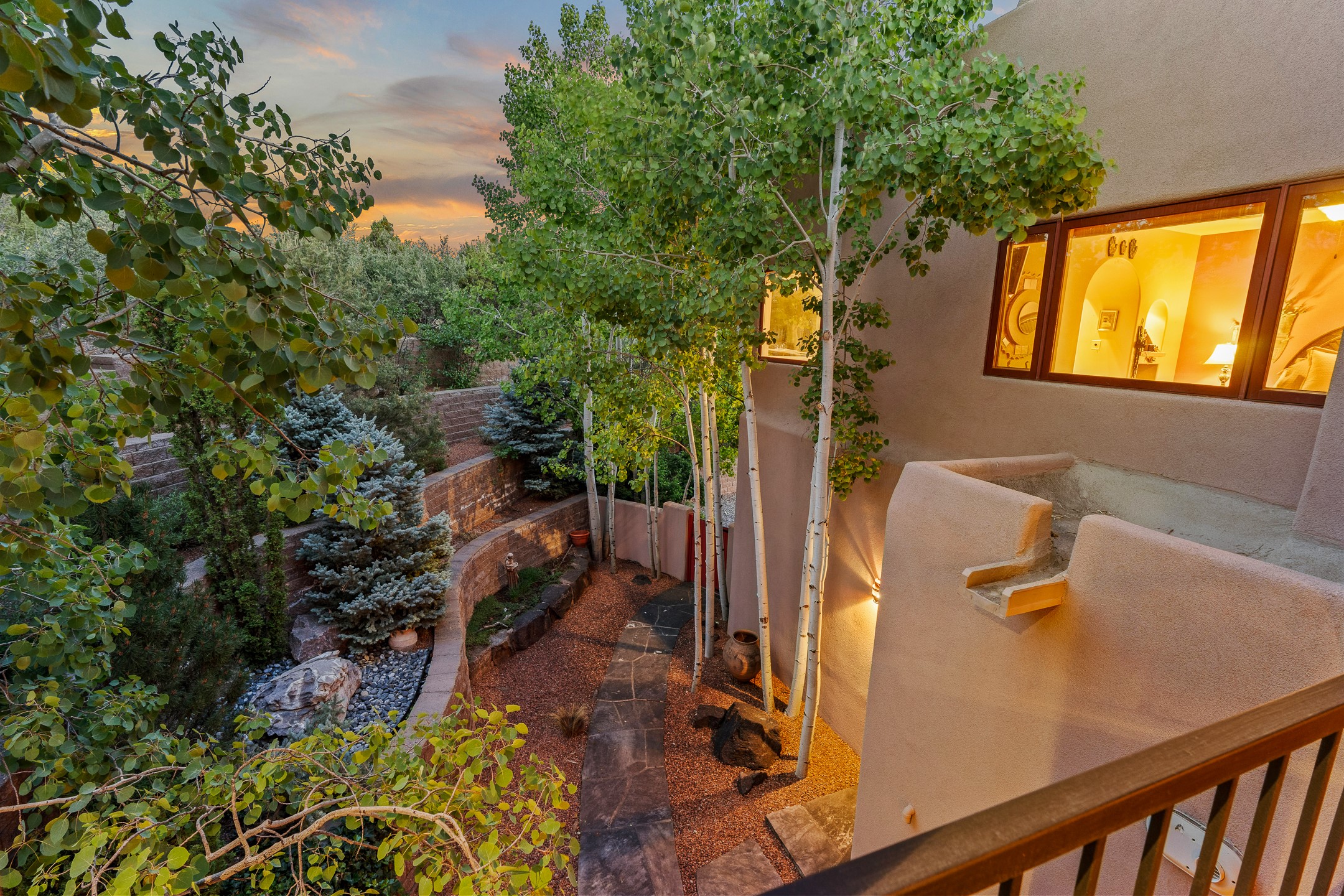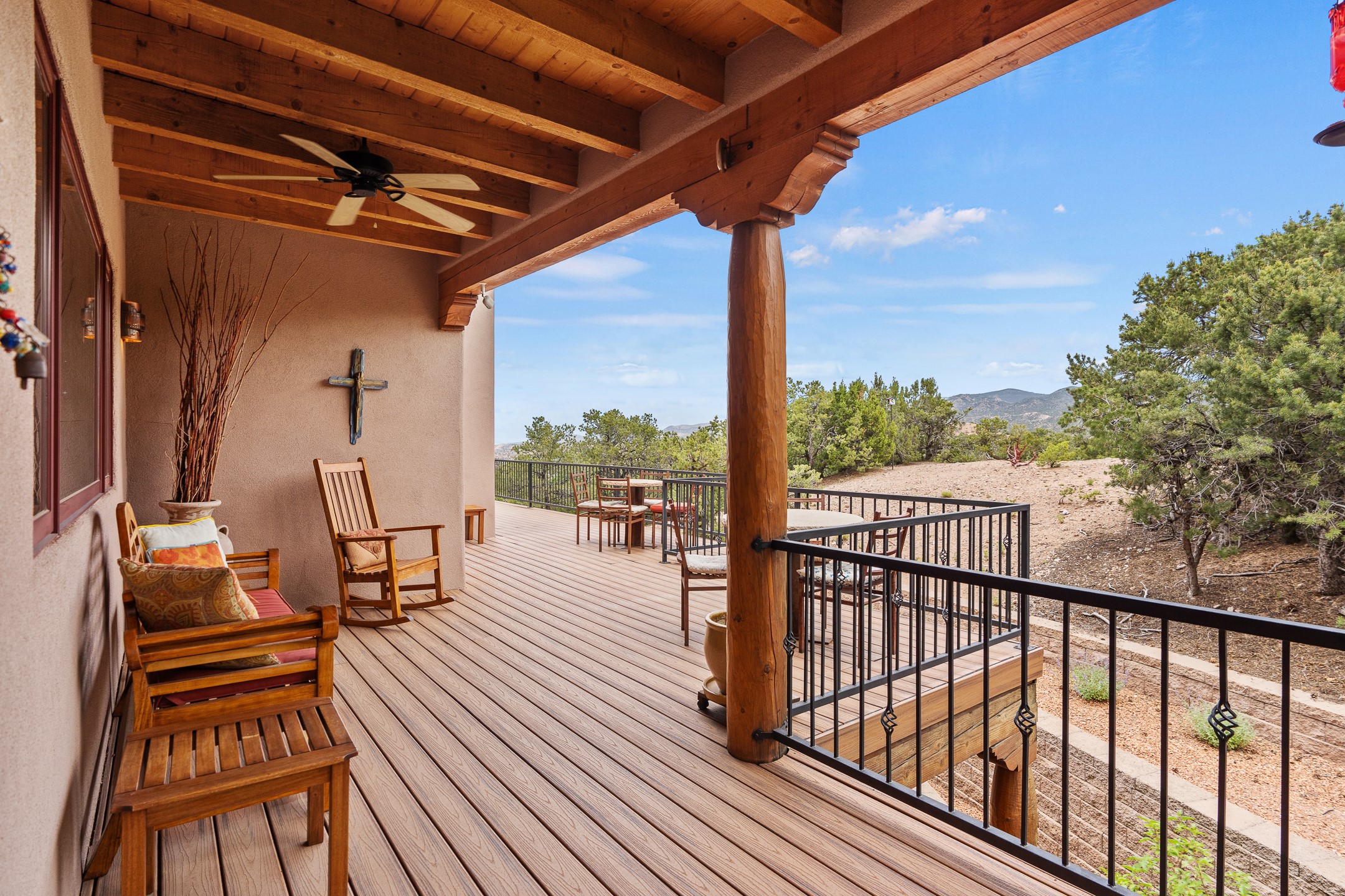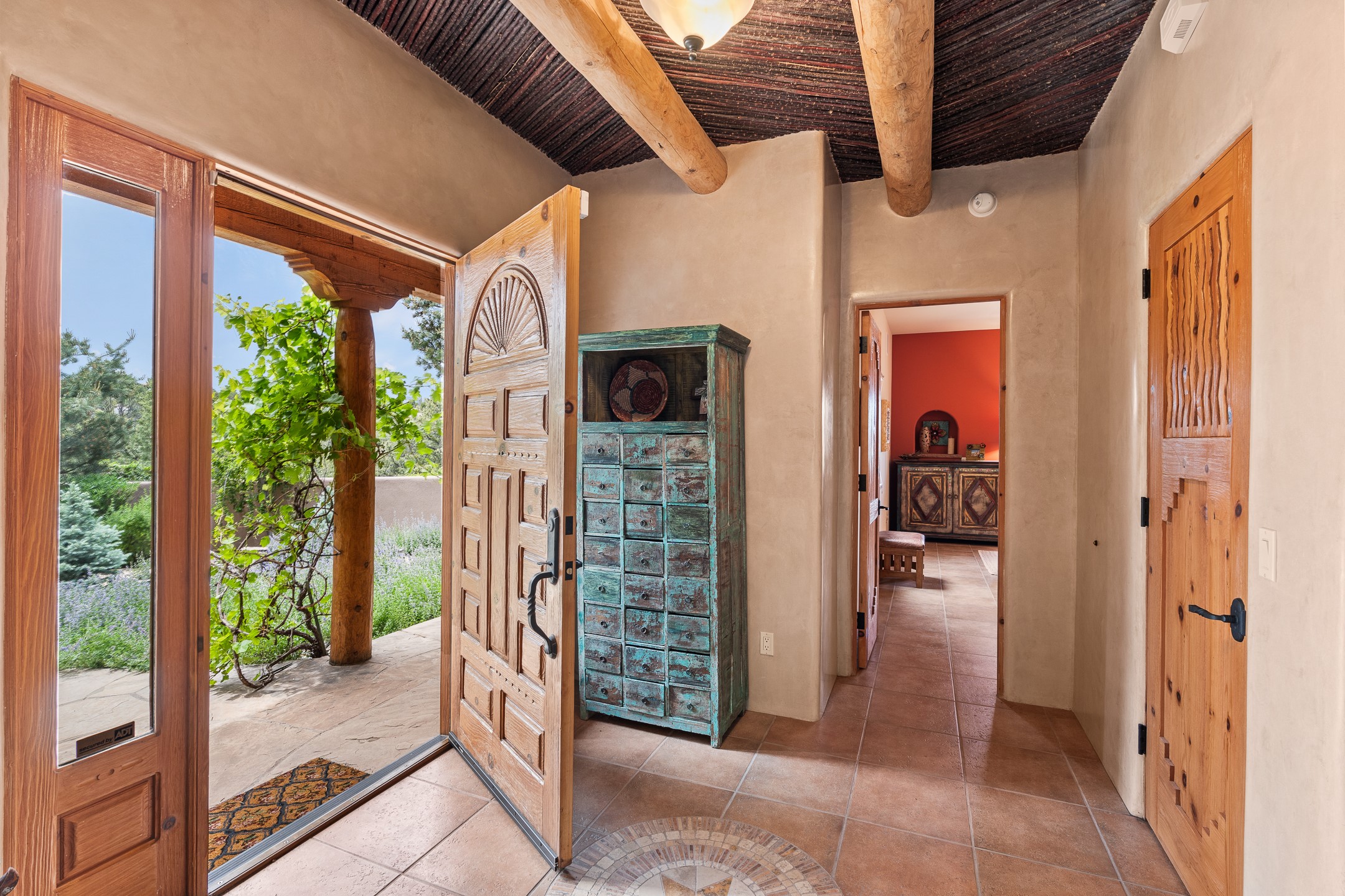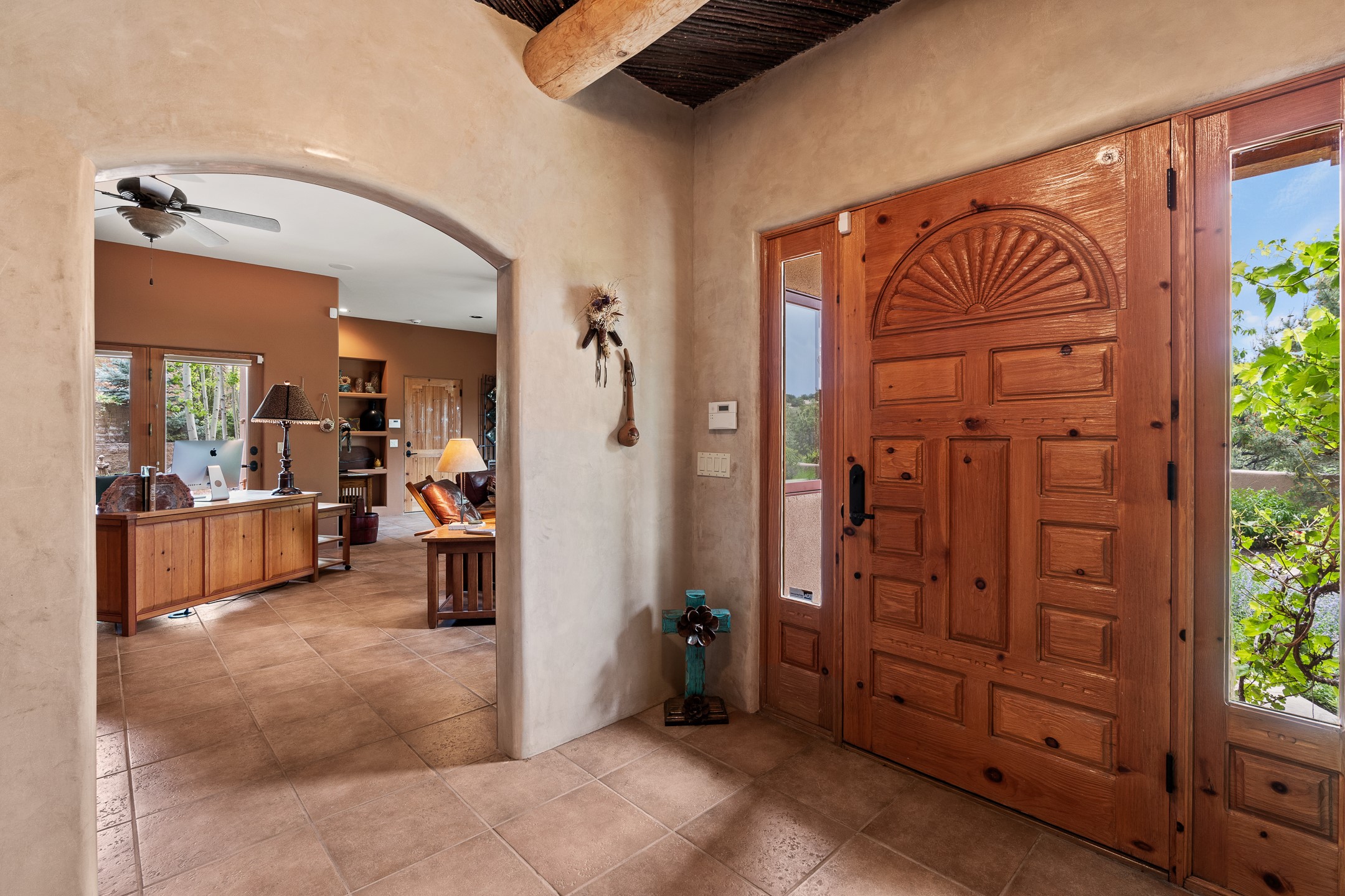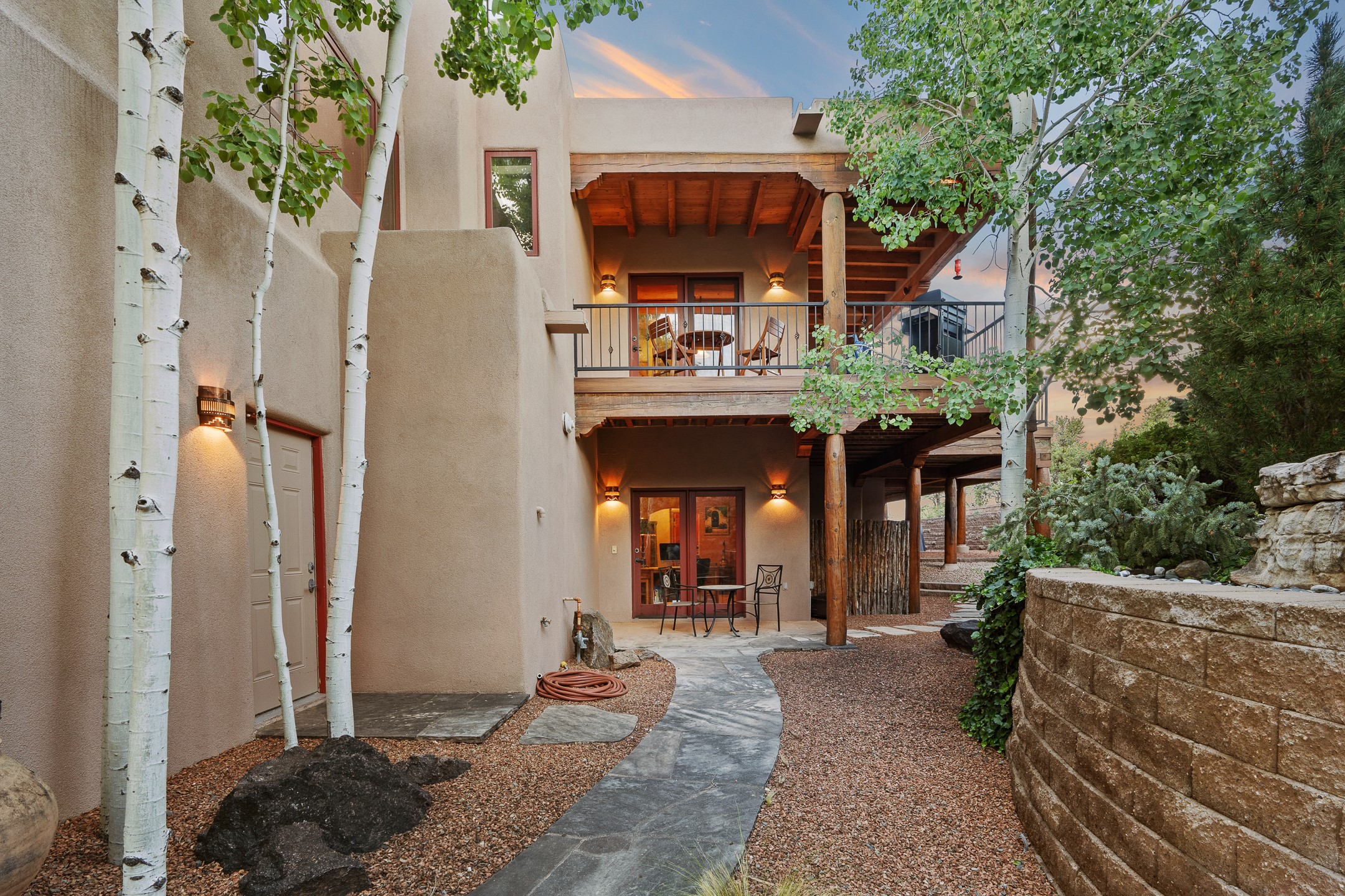 Santa Fe Elegance with Sangre de Cristo Mountain Views.Located in a gated enclave just minutes from the Santa Fe Opera, this 3,000 sq ft residence offers sweeping Sangre de Cristo views from nearly every room. Privately set on 2.7 acres, the home showcases timeless Santa Fe style with diamond plaster walls, vigas, latilla ceilings, and a classic kiva fireplace.The upper level, the heart of the home, features a chef's kitchen with professional Wolf 6 burner range, and grill, pot filler, built-in wine captain fridge, a Wolf double oven and Sub zero stainless refrigerator, a dining room, expansive living room, and a serene primary suite, all thoughtfully positioned to capture the stunning vistas. A large entertainer's deck invites outdoor dining and sunset gatherings.The lower level offers a flexible den/office and a private guest suite, accessed through a charming gated courtyard. Additional highlights include an 850-bottle climate-controlled wine cellar, generous storage, and three custom rock water features that add tranquility throughout the mature landscaped gardens.A rare blend of privacy, style, and panoramic beauty--just minutes from world-class music, culture, and cuisine.