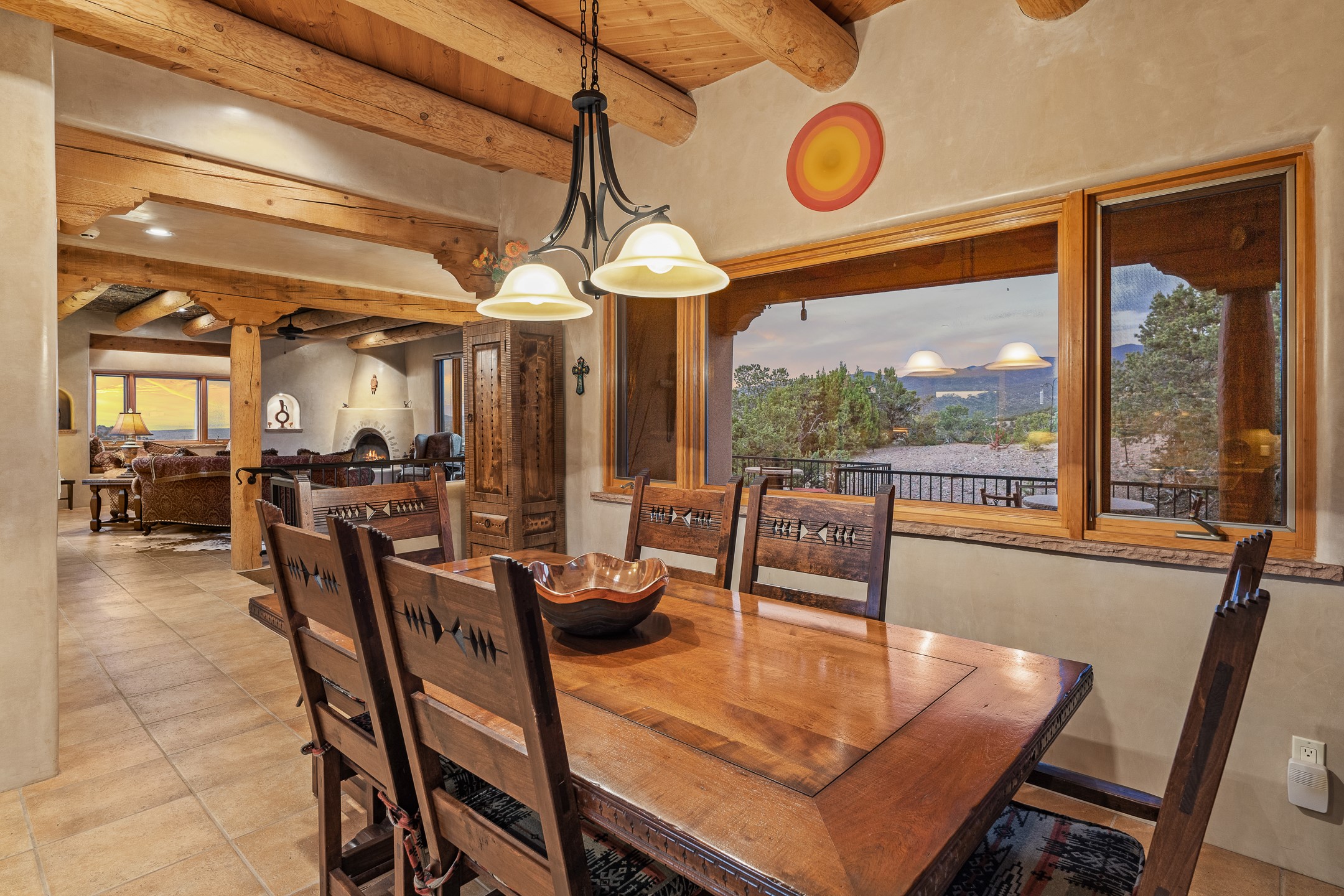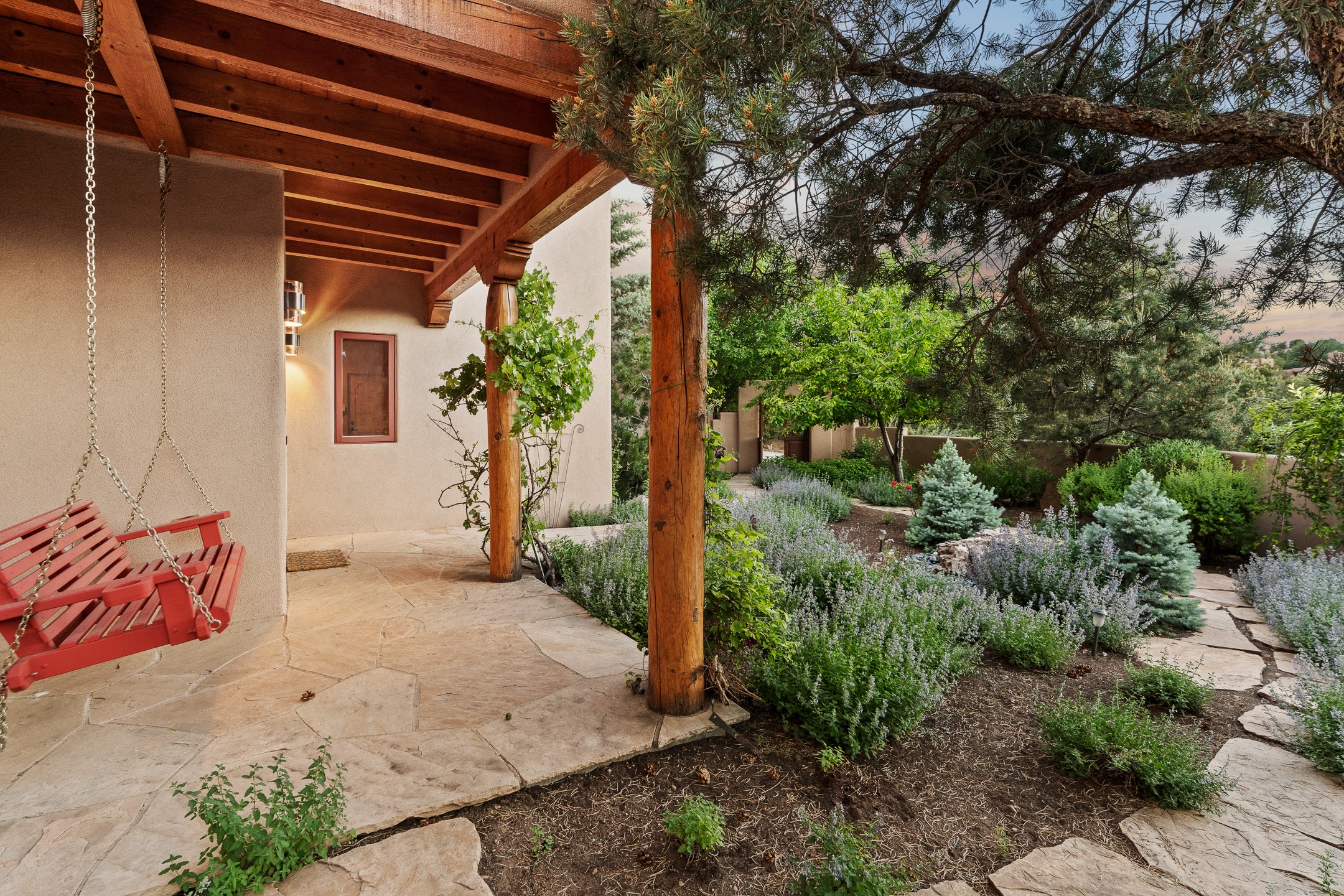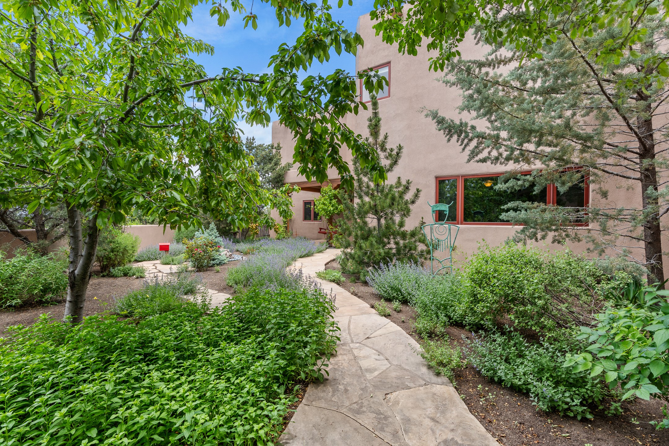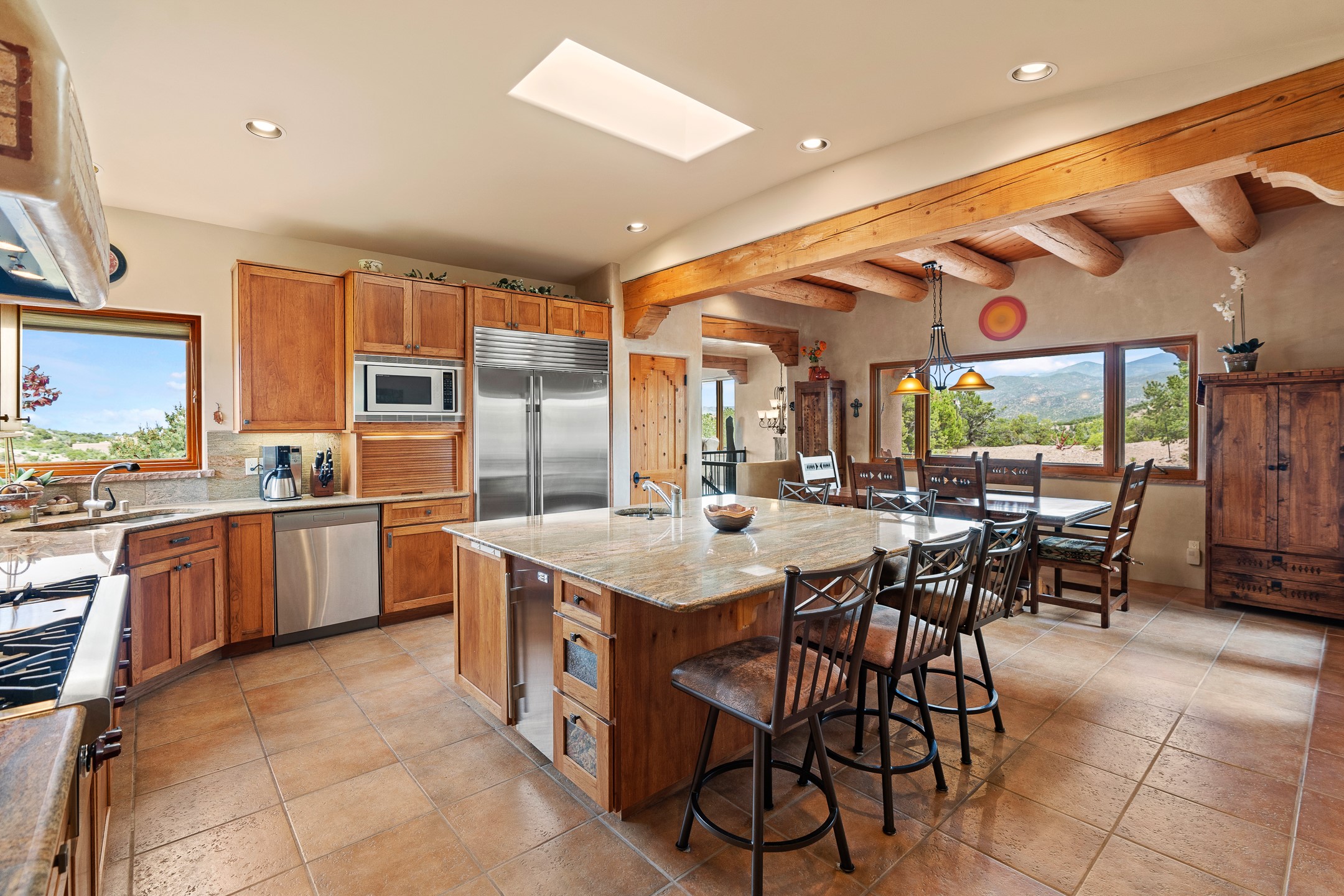 Santa Fe Elegance with Sangre de Cristo Mountain Views.Located in a gated enclave just minutes from the Santa Fe Opera, this 3,000 sq ft residence offers sweeping Sangre de Cristo views from nearly every room. Privately set on 2.7 acres, the home showcases timeless Santa Fe style with diamond plaster walls, vigas, latilla ceilings, and a classic kiva fireplace.The upper level, the heart of the home, features a chef's kitchen with professional Wolf 6 burner range, and grill, pot filler, built-in wine captain fridge, a Wolf double oven and Sub zero stainless refrigerator, a dining room, expansive living room, and a serene primary suite, all thoughtfully positioned to capture the stunning vistas. A large entertainer's deck invites outdoor dining and sunset gatherings.The lower level offers a flexible den/office and a private guest suite, accessed through a charming gated courtyard. Additional highlights include an 850-bottle climate-controlled wine cellar, generous storage, and three custom rock water features that add tranquility throughout the mature landscaped gardens.A rare blend of privacy, style, and panoramic beauty--just minutes from world-class music, culture, and cuisine.