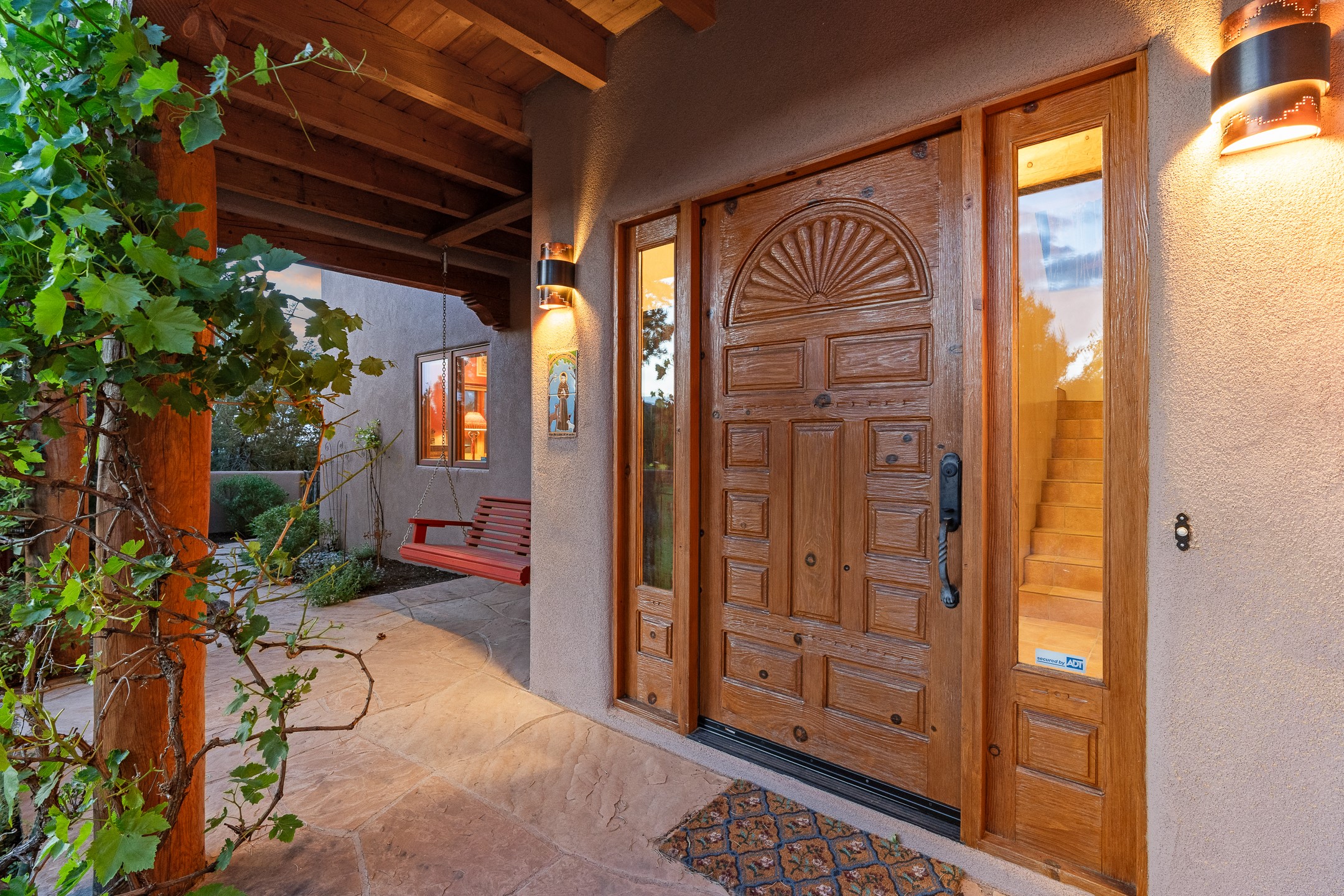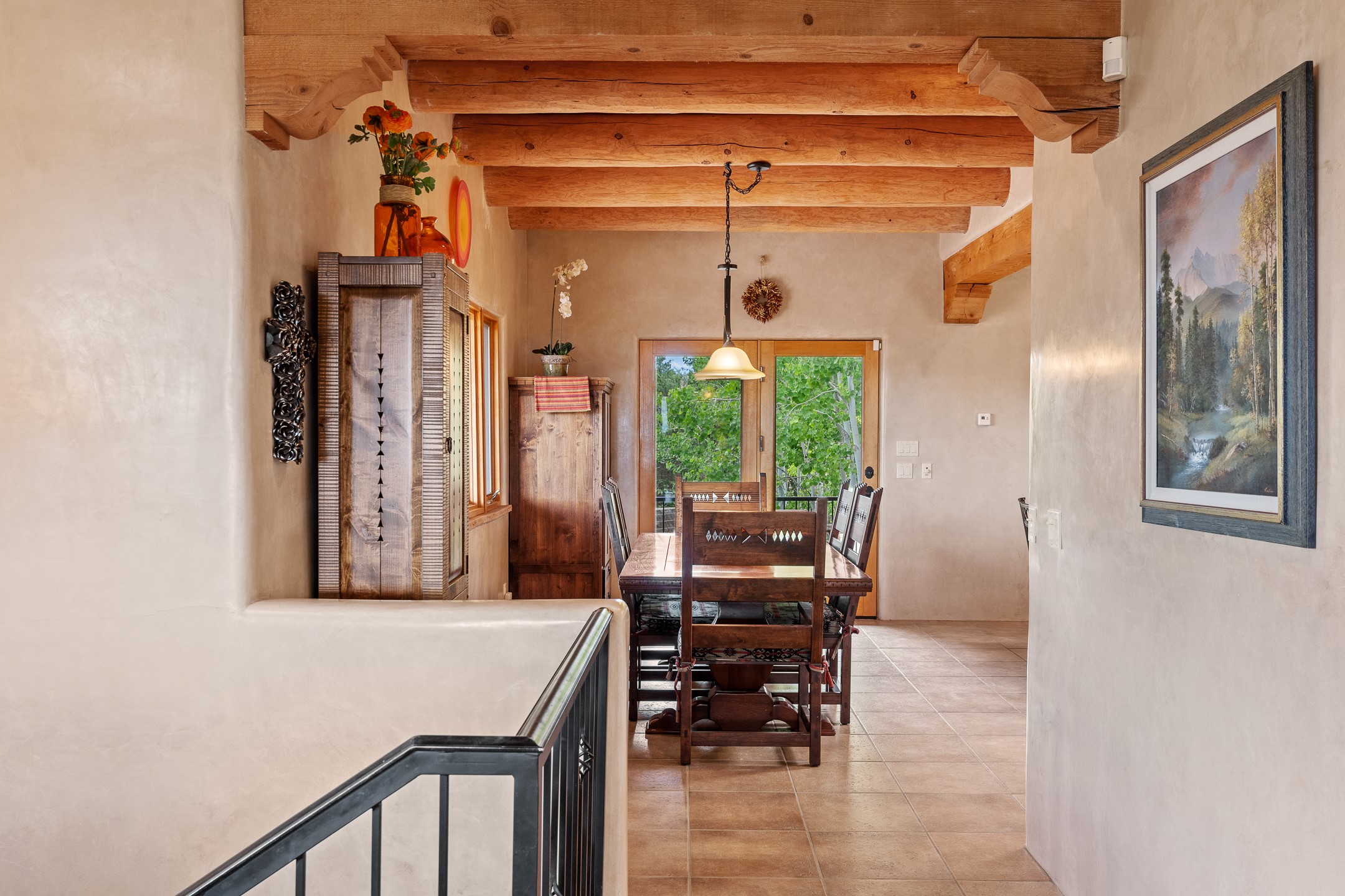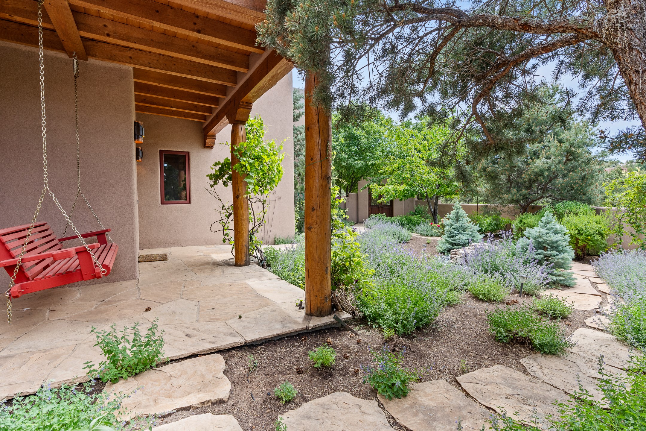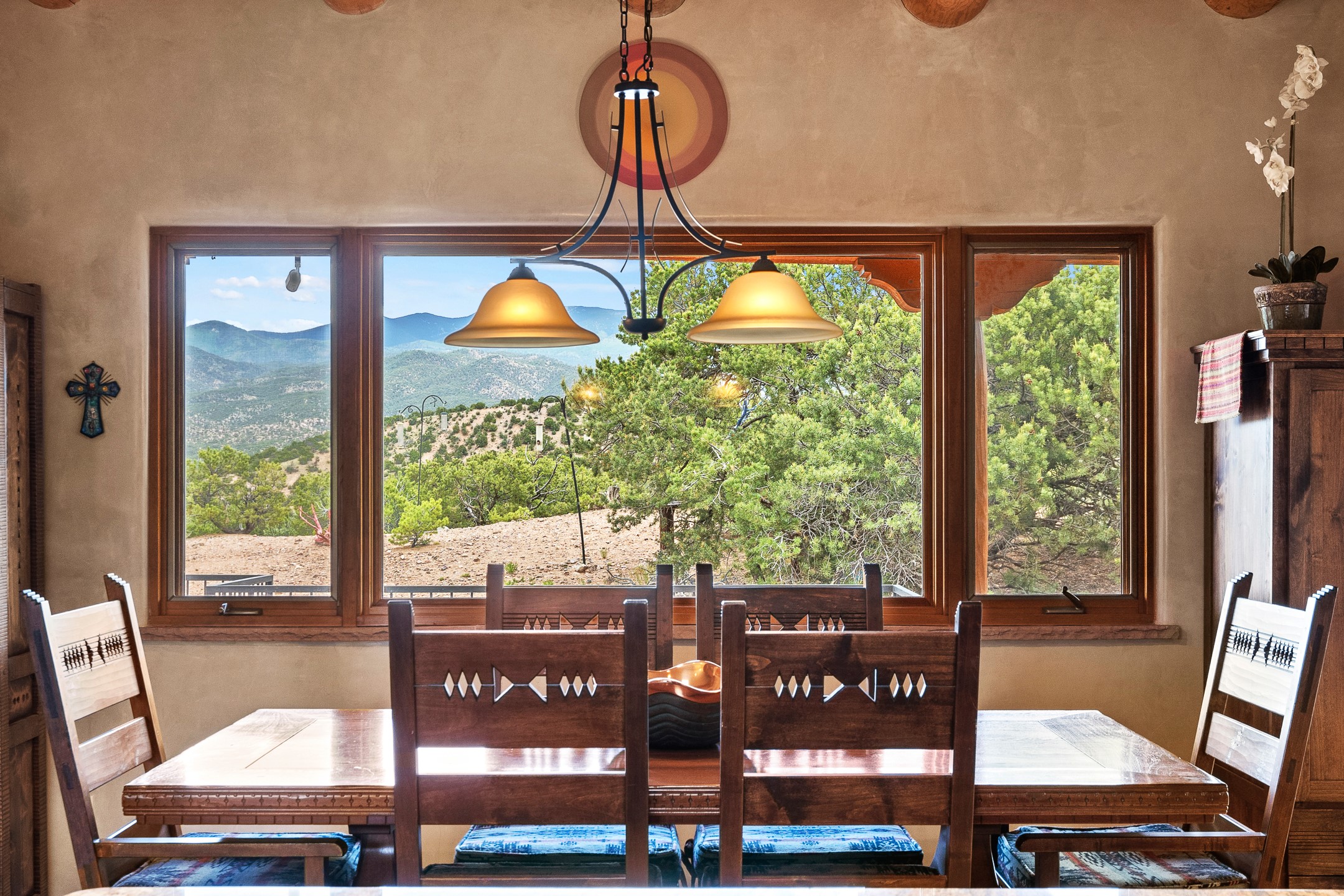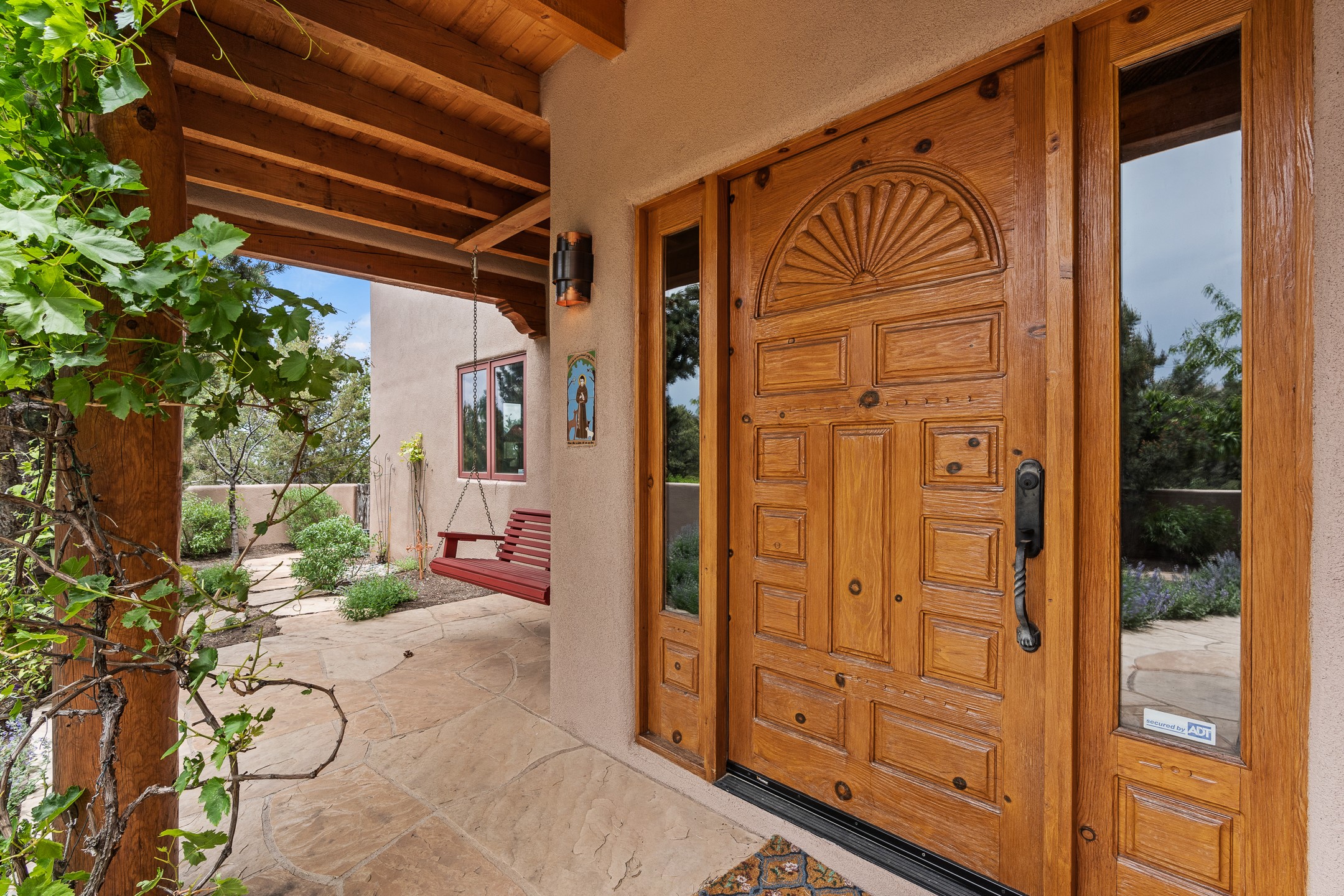 Santa Fe Elegance with Sangre de Cristo Mountain Views.Located in a gated enclave just minutes from the Santa Fe Opera, this 3,000 sq ft residence offers sweeping Sangre de Cristo views from nearly every room. Privately set on 2.7 acres, the home showcases timeless Santa Fe style with diamond plaster walls, vigas, latilla ceilings, and a classic kiva fireplace.The upper level, the heart of the home, features a chef's kitchen with professional Wolf 6 burner range, and grill, pot filler, built-in wine captain fridge, a Wolf double oven and Sub zero stainless refrigerator, a dining room, expansive living room, and a serene primary suite, all thoughtfully positioned to capture the stunning vistas. A large entertainer's deck invites outdoor dining and sunset gatherings.The lower level offers a flexible den/office and a private guest suite, accessed through a charming gated courtyard. Additional highlights include an 850-bottle climate-controlled wine cellar, generous storage, and three custom rock water features that add tranquility throughout the mature landscaped gardens.A rare blend of privacy, style, and panoramic beauty--just minutes from world-class music, culture, and cuisine.