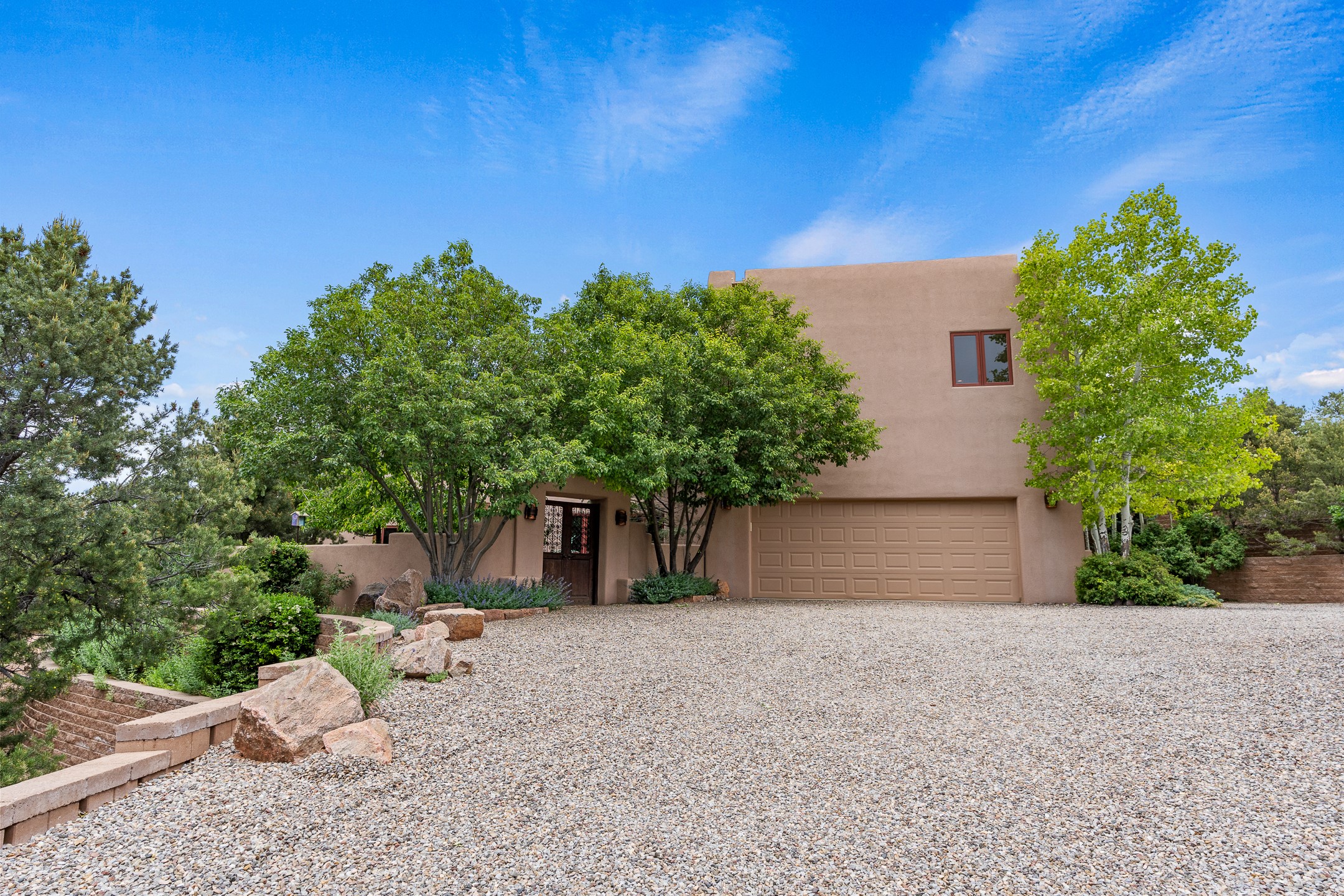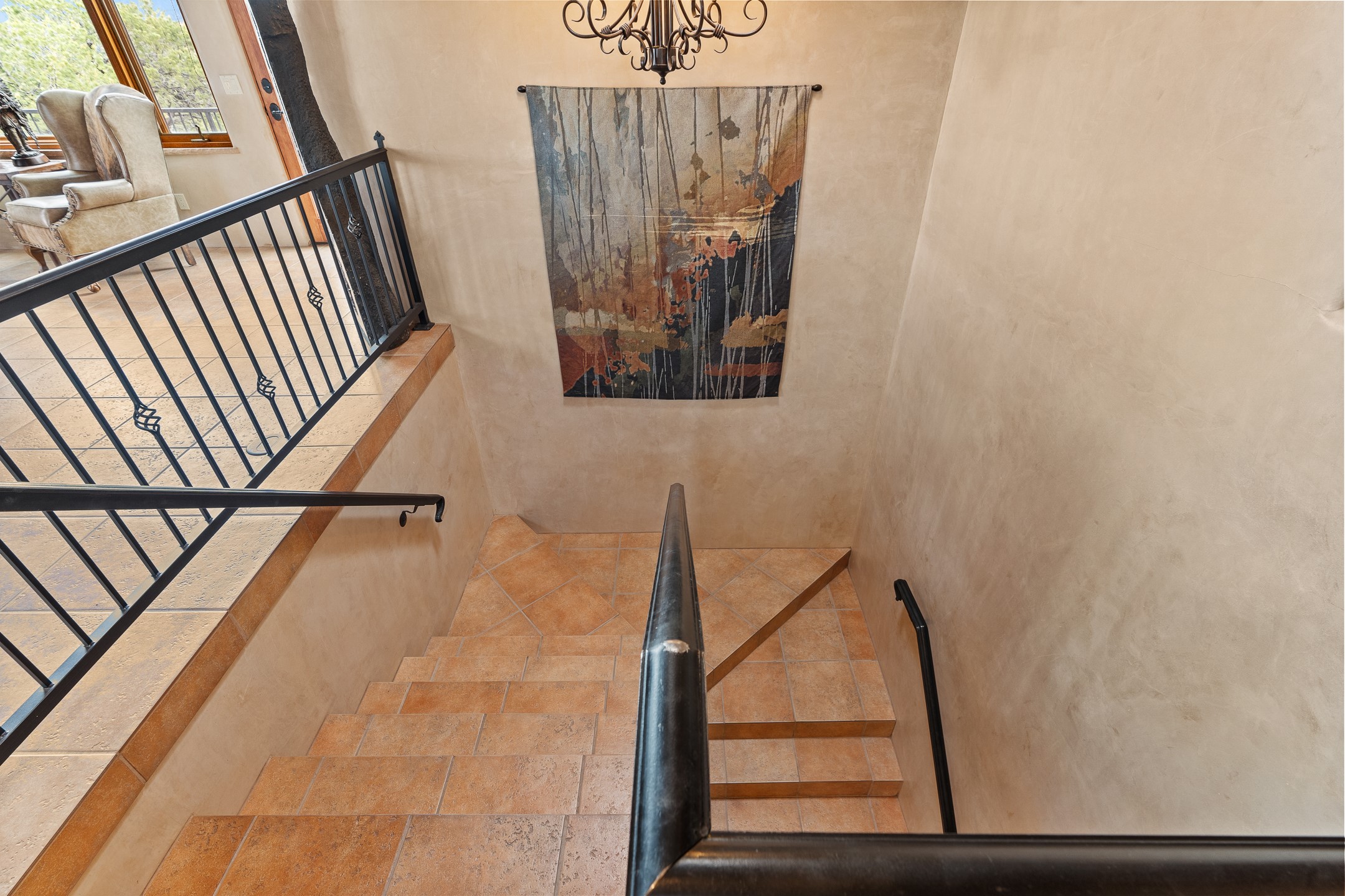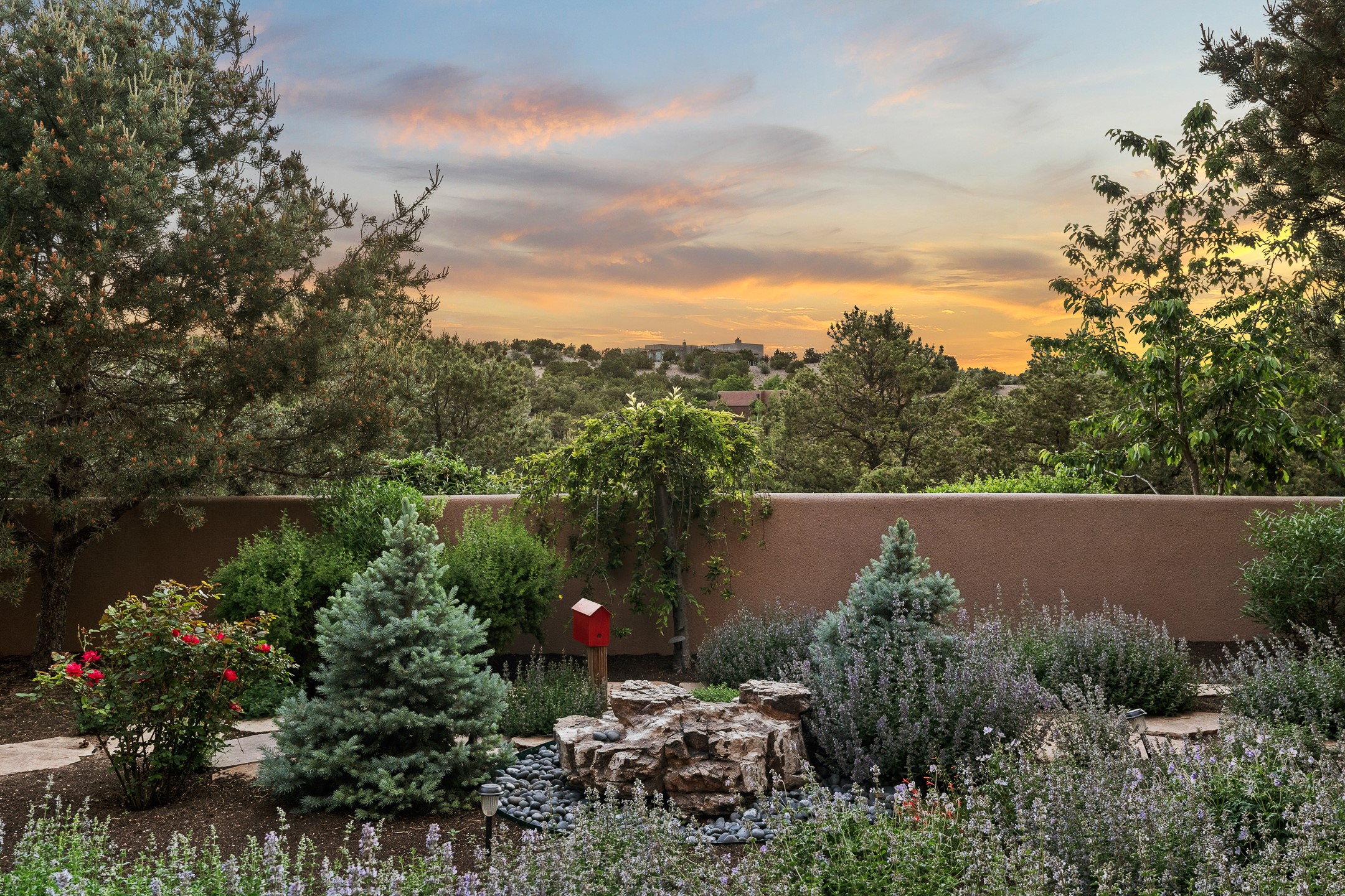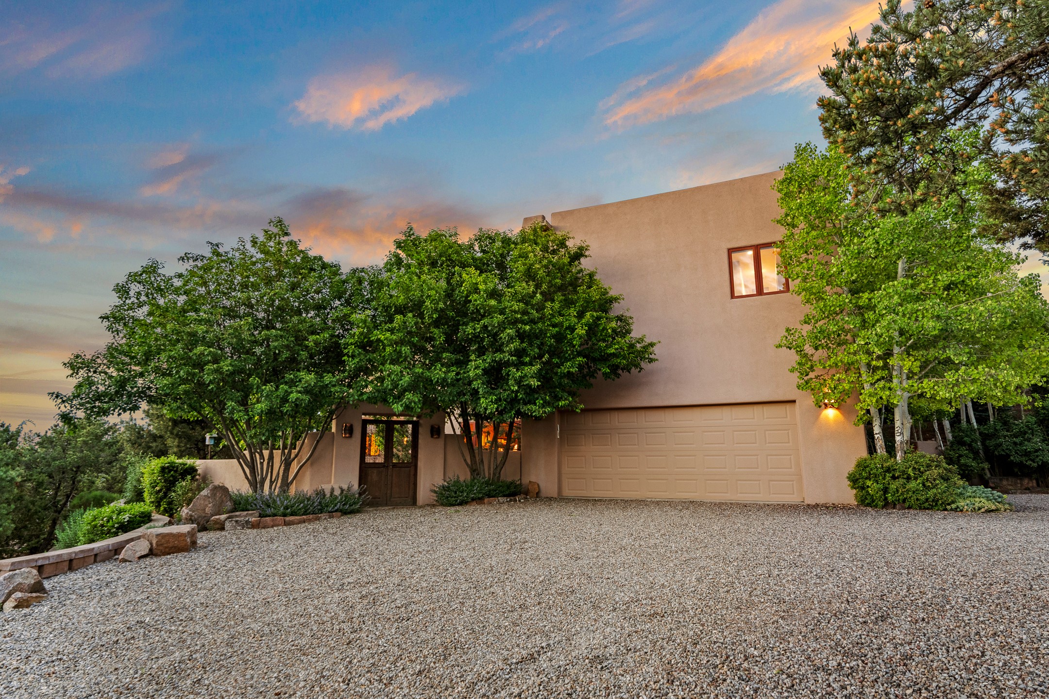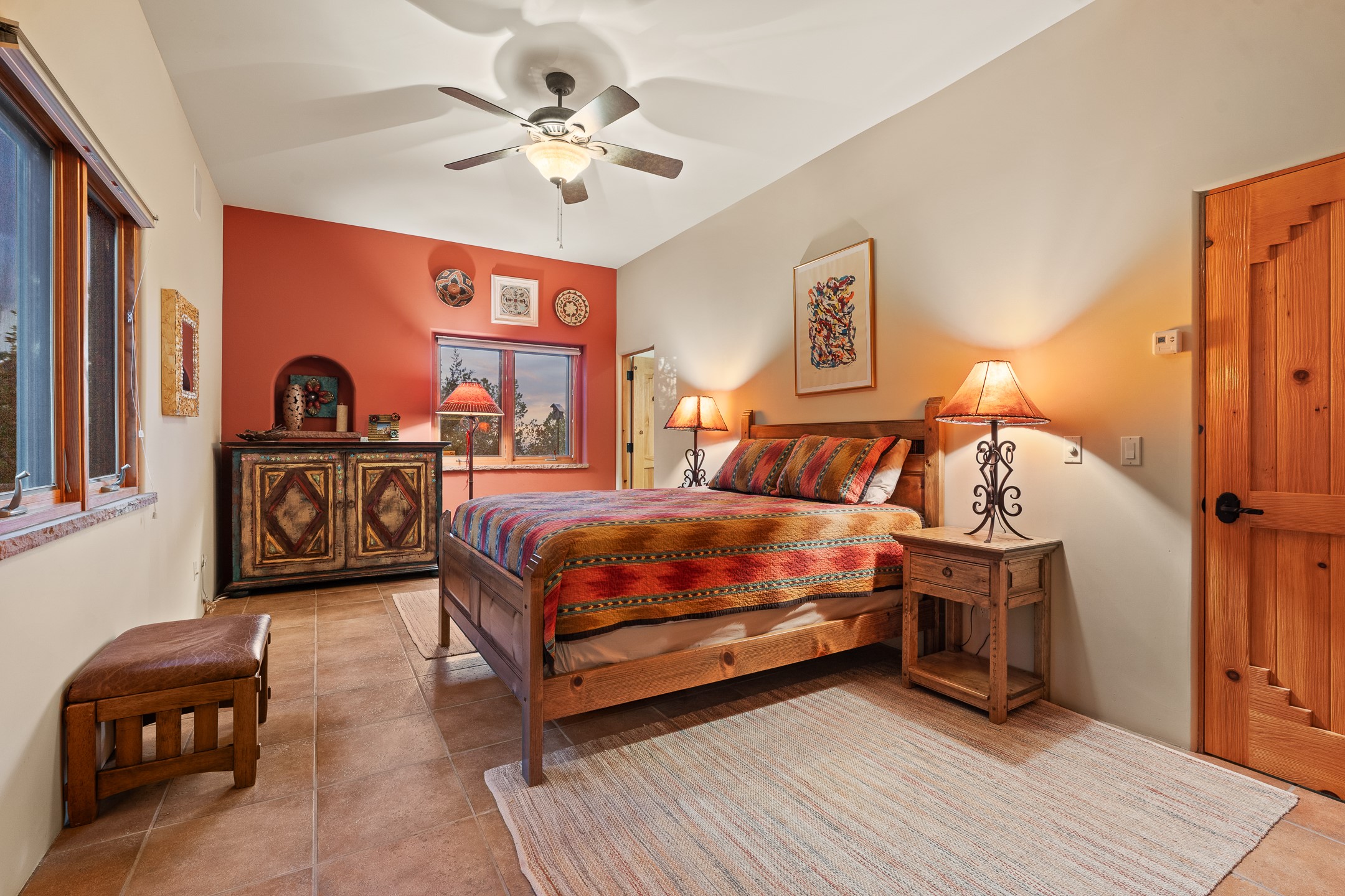 Santa Fe Elegance with Sangre de Cristo Mountain Views.Located in a gated enclave just minutes from the Santa Fe Opera, this 3,000 sq ft residence offers sweeping Sangre de Cristo views from nearly every room. Privately set on 2.7 acres, the home showcases timeless Santa Fe style with diamond plaster walls, vigas, latilla ceilings, and a classic kiva fireplace.The upper level, the heart of the home, features a chef's kitchen with professional Wolf 6 burner range, and grill, pot filler, built-in wine captain fridge, a Wolf double oven and Sub zero stainless refrigerator, a dining room, expansive living room, and a serene primary suite, all thoughtfully positioned to capture the stunning vistas. A large entertainer's deck invites outdoor dining and sunset gatherings.The lower level offers a flexible den/office and a private guest suite, accessed through a charming gated courtyard. Additional highlights include an 850-bottle climate-controlled wine cellar, generous storage, and three custom rock water features that add tranquility throughout the mature landscaped gardens.A rare blend of privacy, style, and panoramic beauty--just minutes from world-class music, culture, and cuisine.