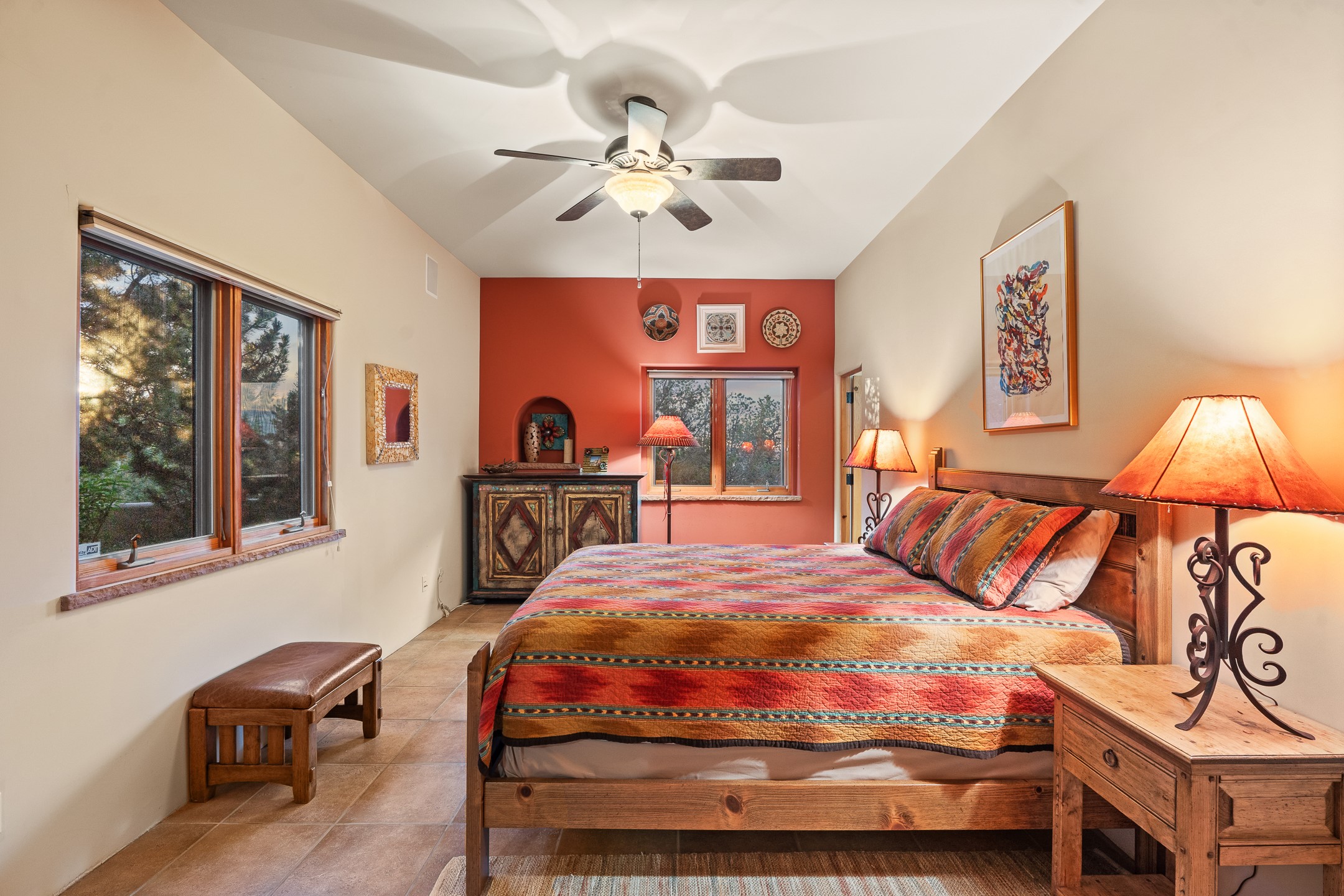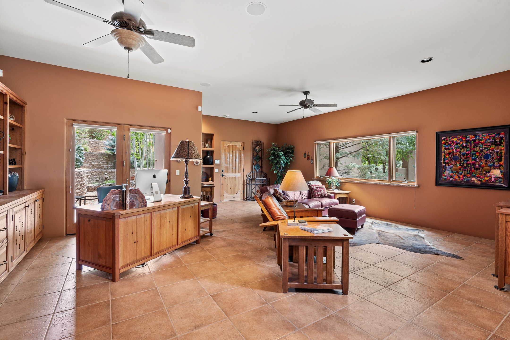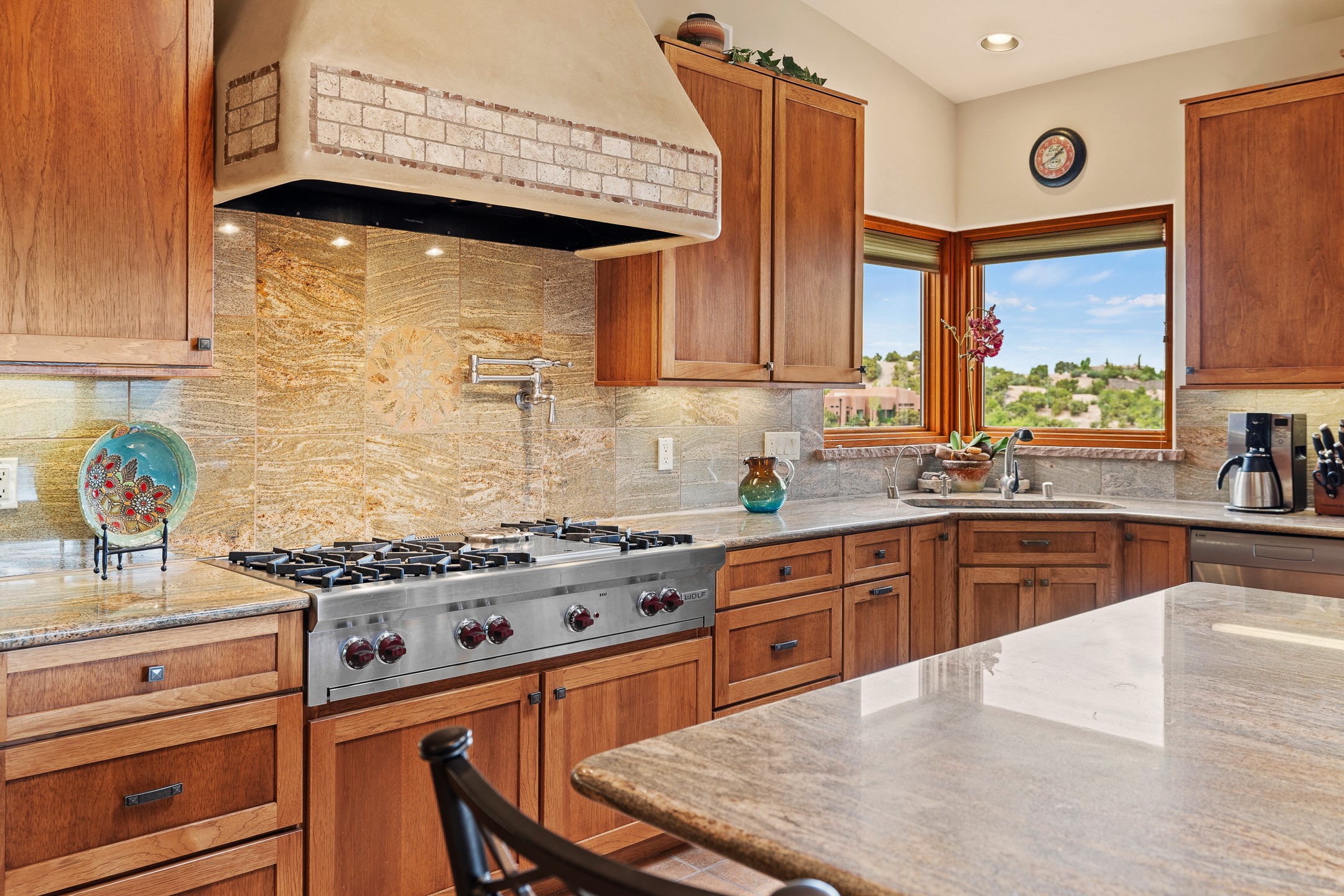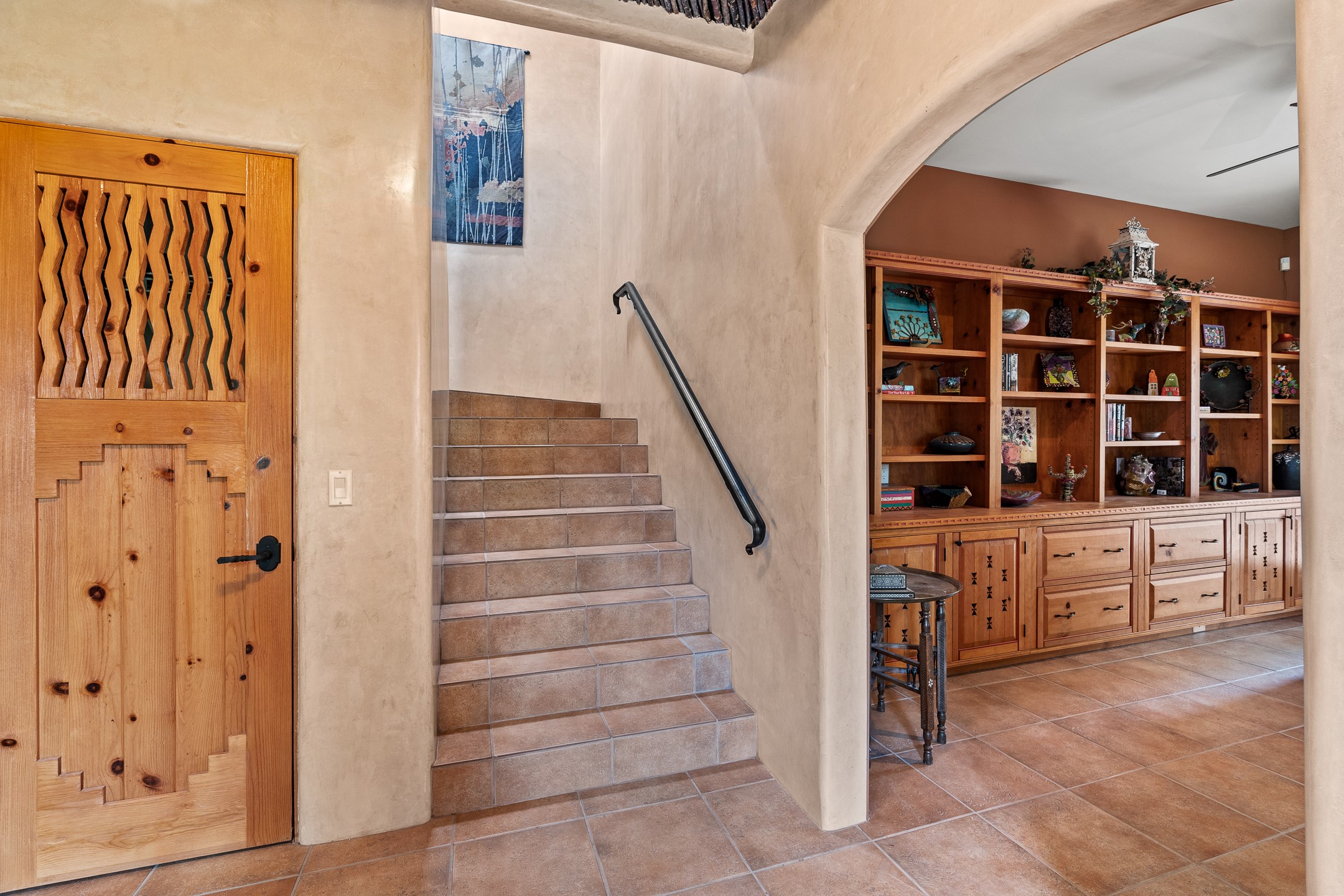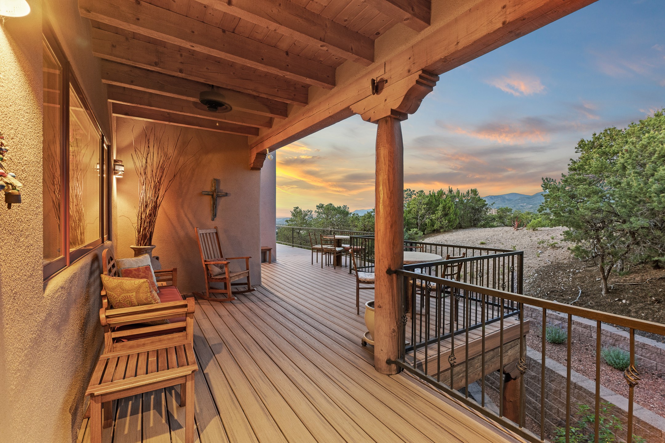 Santa Fe Elegance with Sangre de Cristo Mountain Views.Located in a gated enclave just minutes from the Santa Fe Opera, this 3,000 sq ft residence offers sweeping Sangre de Cristo views from nearly every room. Privately set on 2.7 acres, the home showcases timeless Santa Fe style with diamond plaster walls, vigas, latilla ceilings, and a classic kiva fireplace.The upper level, the heart of the home, features a chef's kitchen with professional Wolf 6 burner range, and grill, pot filler, built-in wine captain fridge, a Wolf double oven and Sub zero stainless refrigerator, a dining room, expansive living room, and a serene primary suite, all thoughtfully positioned to capture the stunning vistas. A large entertainer's deck invites outdoor dining and sunset gatherings.The lower level offers a flexible den/office and a private guest suite, accessed through a charming gated courtyard. Additional highlights include an 850-bottle climate-controlled wine cellar, generous storage, and three custom rock water features that add tranquility throughout the mature landscaped gardens.A rare blend of privacy, style, and panoramic beauty--just minutes from world-class music, culture, and cuisine.