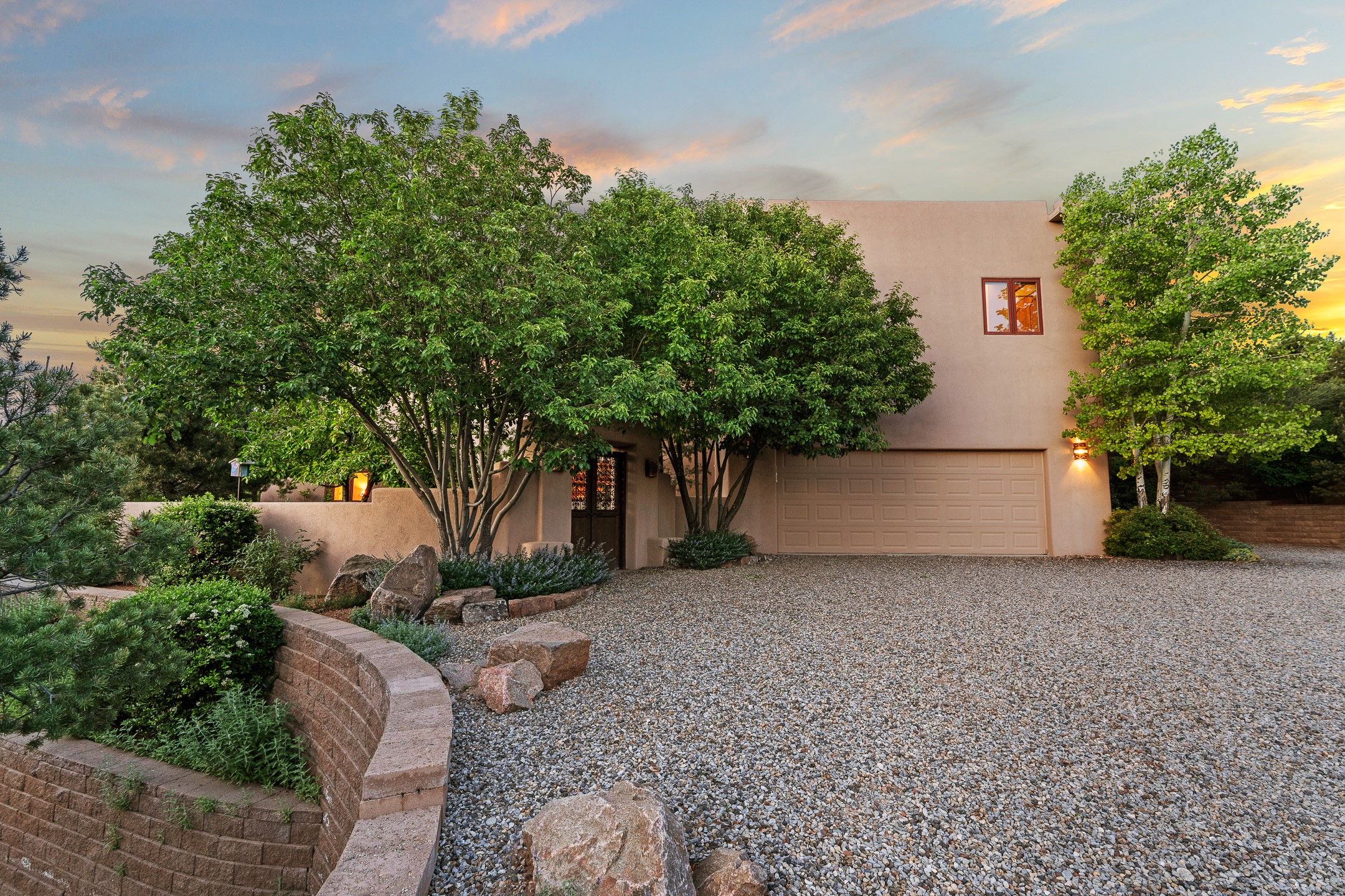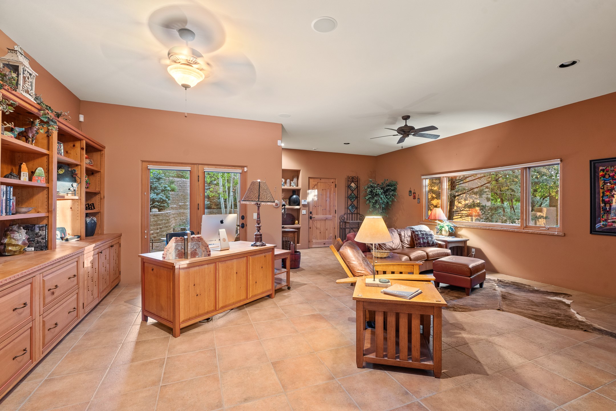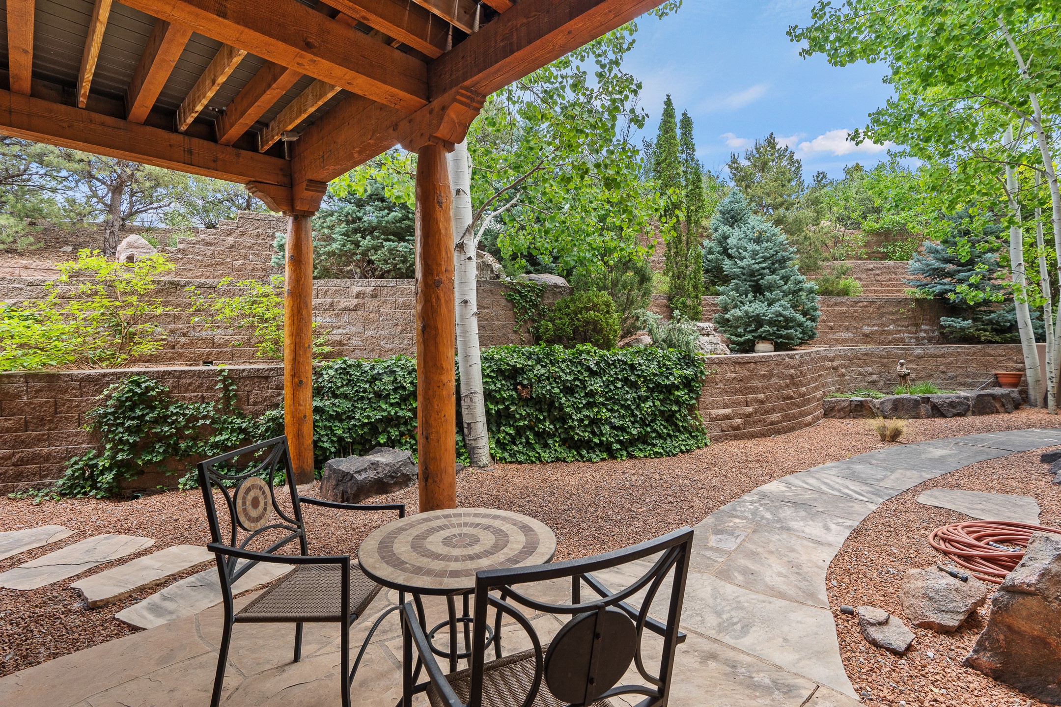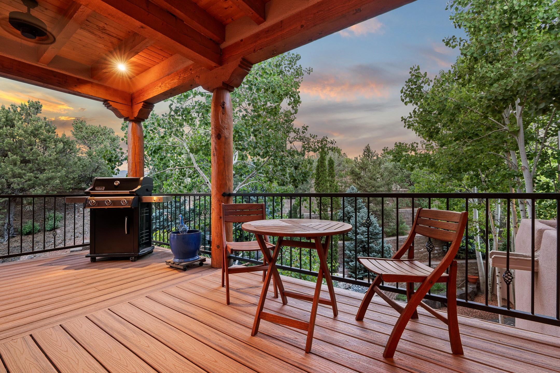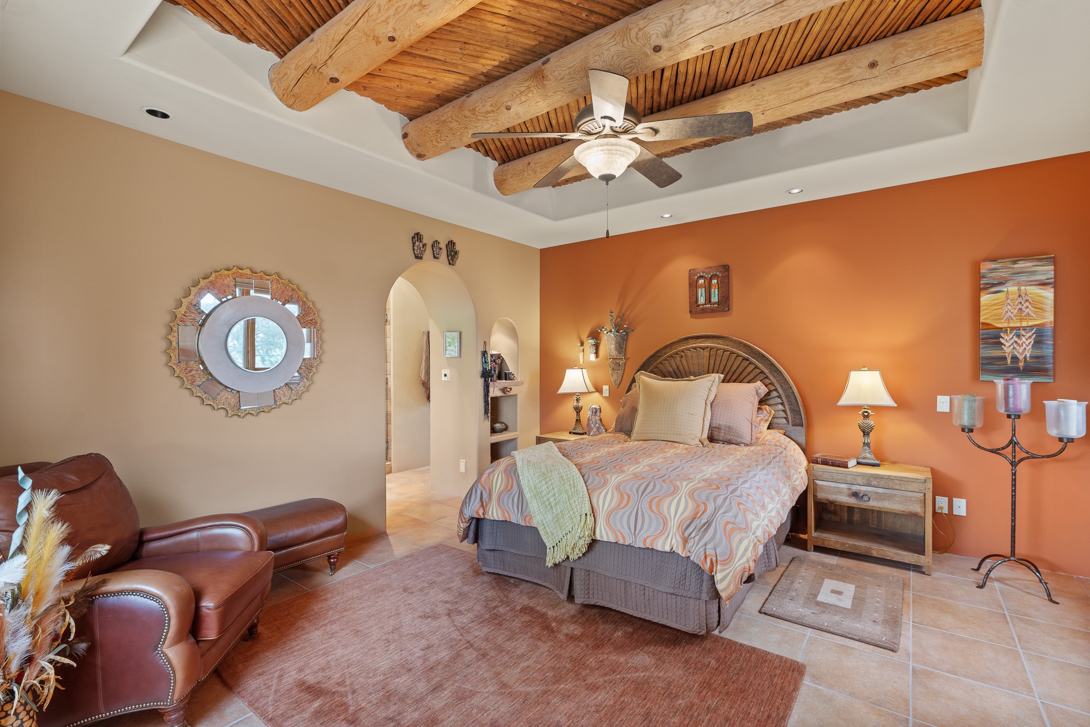 Santa Fe Elegance with Sangre de Cristo Mountain Views.Located in a gated enclave just minutes from the Santa Fe Opera, this 3,000 sq ft residence offers sweeping Sangre de Cristo views from nearly every room. Privately set on 2.7 acres, the home showcases timeless Santa Fe style with diamond plaster walls, vigas, latilla ceilings, and a classic kiva fireplace.The upper level, the heart of the home, features a chef's kitchen with professional Wolf 6 burner range, and grill, pot filler, built-in wine captain fridge, a Wolf double oven and Sub zero stainless refrigerator, a dining room, expansive living room, and a serene primary suite, all thoughtfully positioned to capture the stunning vistas. A large entertainer's deck invites outdoor dining and sunset gatherings.The lower level offers a flexible den/office and a private guest suite, accessed through a charming gated courtyard. Additional highlights include an 850-bottle climate-controlled wine cellar, generous storage, and three custom rock water features that add tranquility throughout the mature landscaped gardens.A rare blend of privacy, style, and panoramic beauty--just minutes from world-class music, culture, and cuisine.
