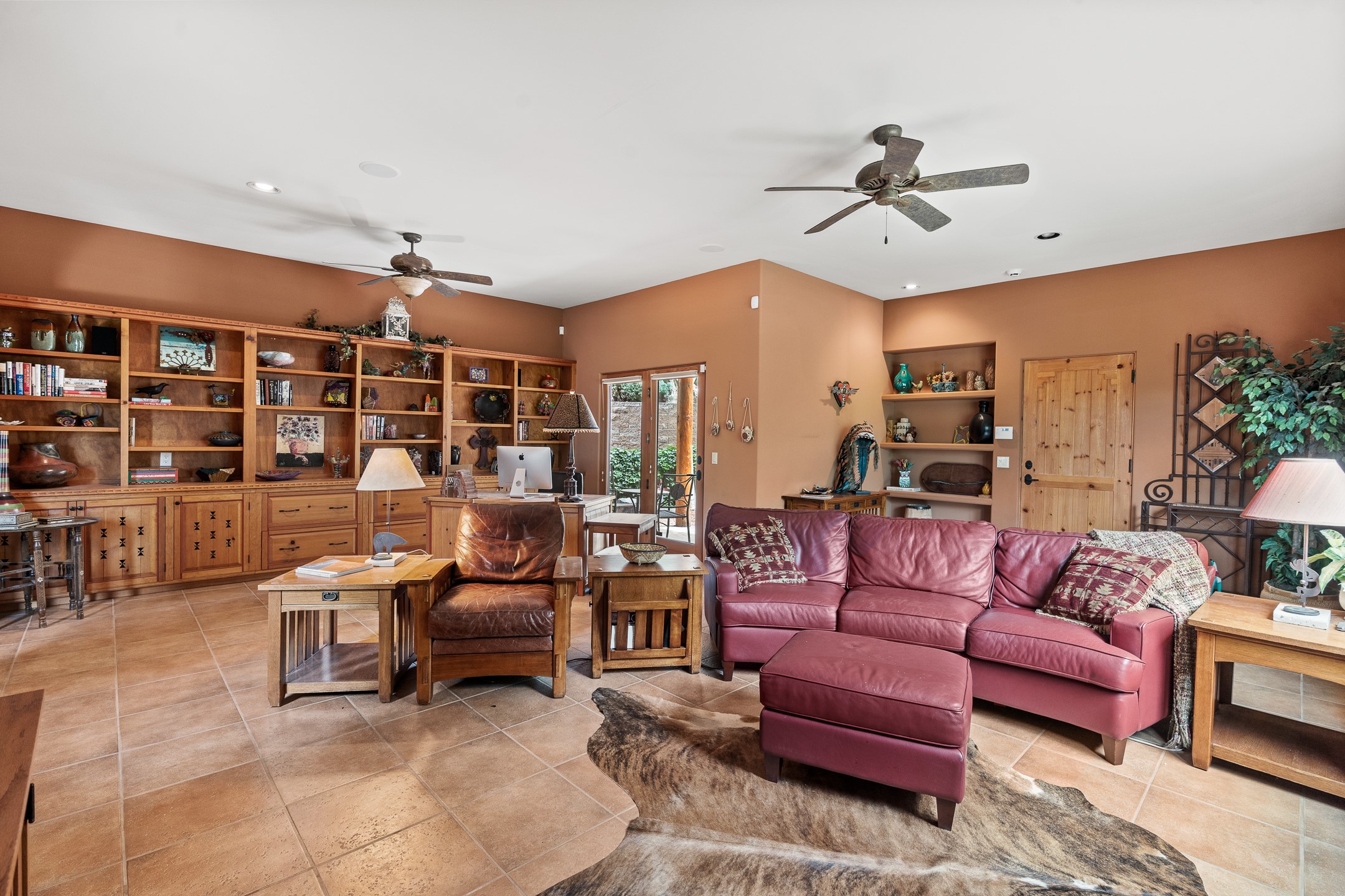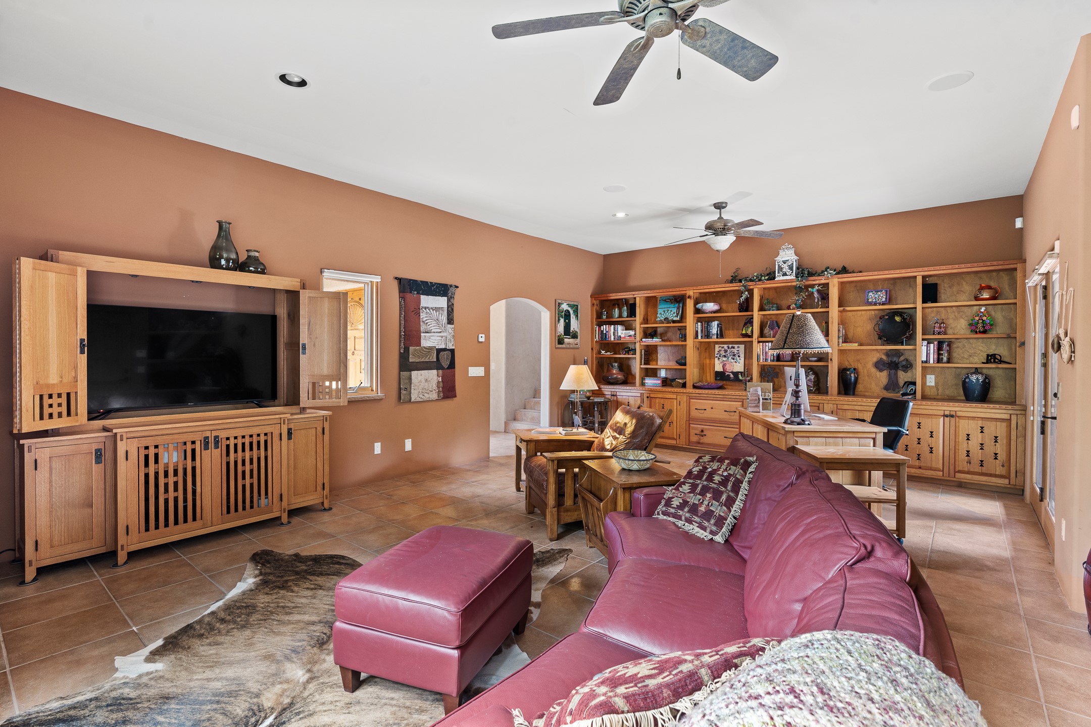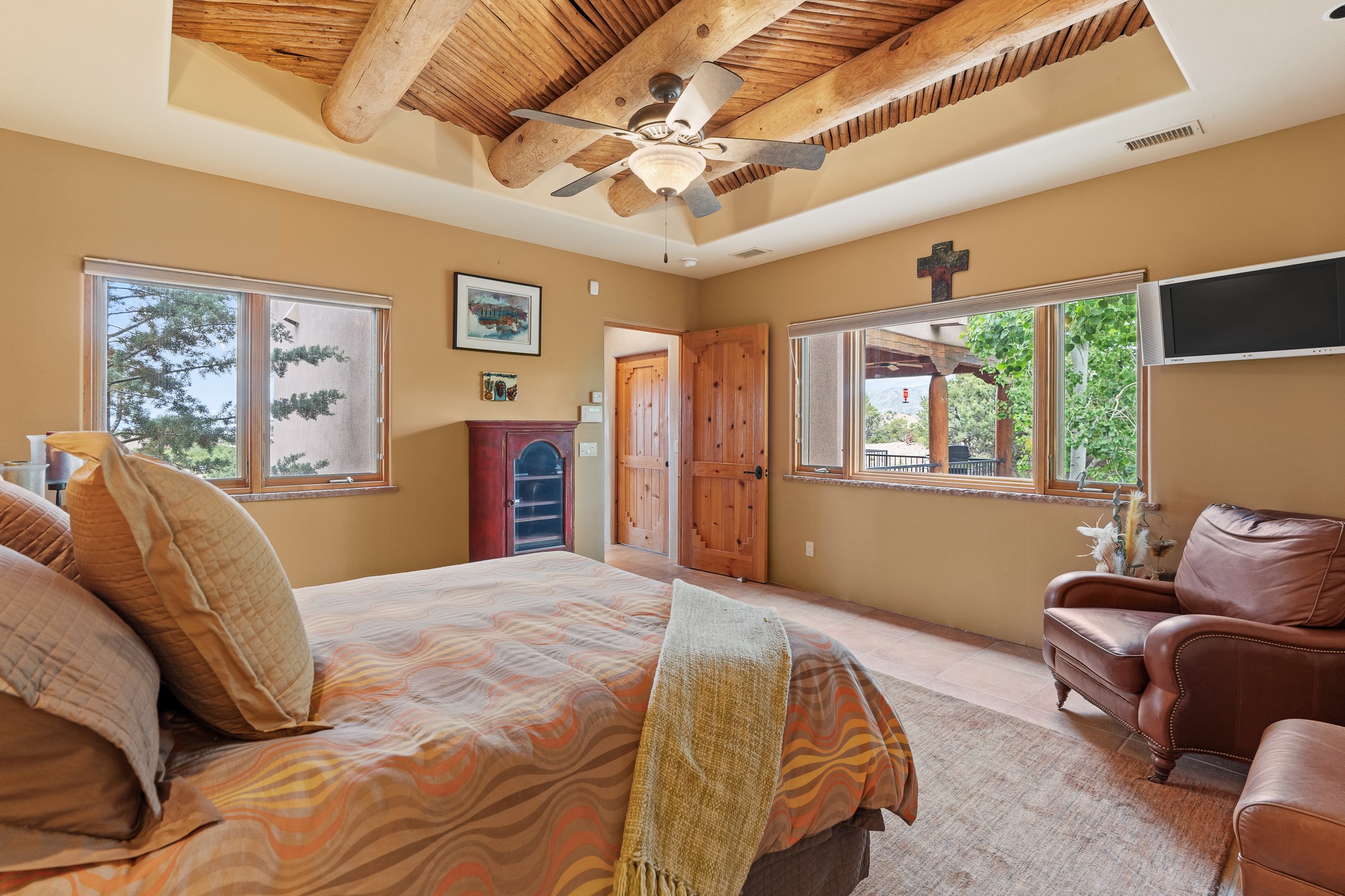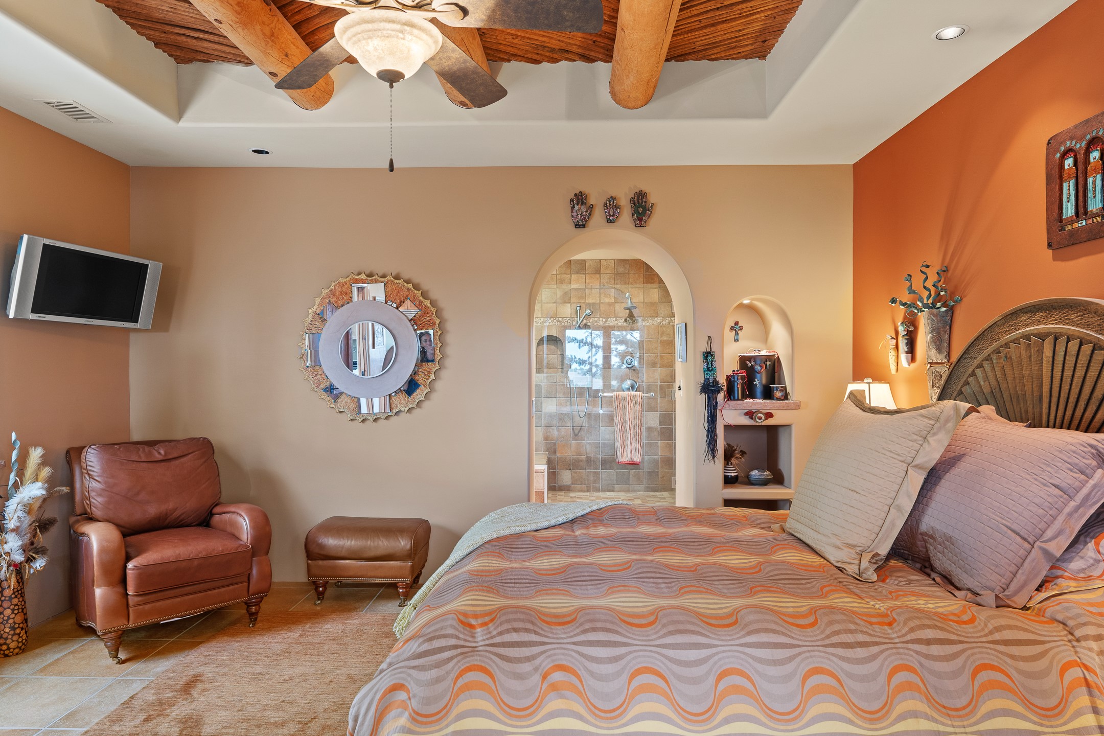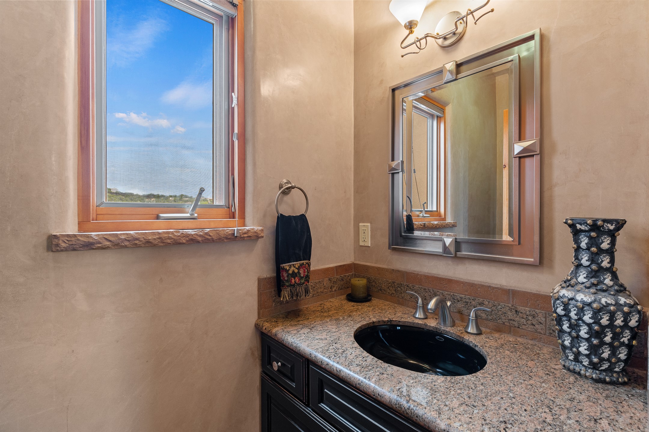 Santa Fe Elegance with Sangre de Cristo Mountain Views.Located in a gated enclave just minutes from the Santa Fe Opera, this 3,000 sq ft residence offers sweeping Sangre de Cristo views from nearly every room. Privately set on 2.7 acres, the home showcases timeless Santa Fe style with diamond plaster walls, vigas, latilla ceilings, and a classic kiva fireplace.The upper level, the heart of the home, features a chef's kitchen with professional Wolf 6 burner range, and grill, pot filler, built-in wine captain fridge, a Wolf double oven and Sub zero stainless refrigerator, a dining room, expansive living room, and a serene primary suite, all thoughtfully positioned to capture the stunning vistas. A large entertainer's deck invites outdoor dining and sunset gatherings.The lower level offers a flexible den/office and a private guest suite, accessed through a charming gated courtyard. Additional highlights include an 850-bottle climate-controlled wine cellar, generous storage, and three custom rock water features that add tranquility throughout the mature landscaped gardens.A rare blend of privacy, style, and panoramic beauty--just minutes from world-class music, culture, and cuisine.
