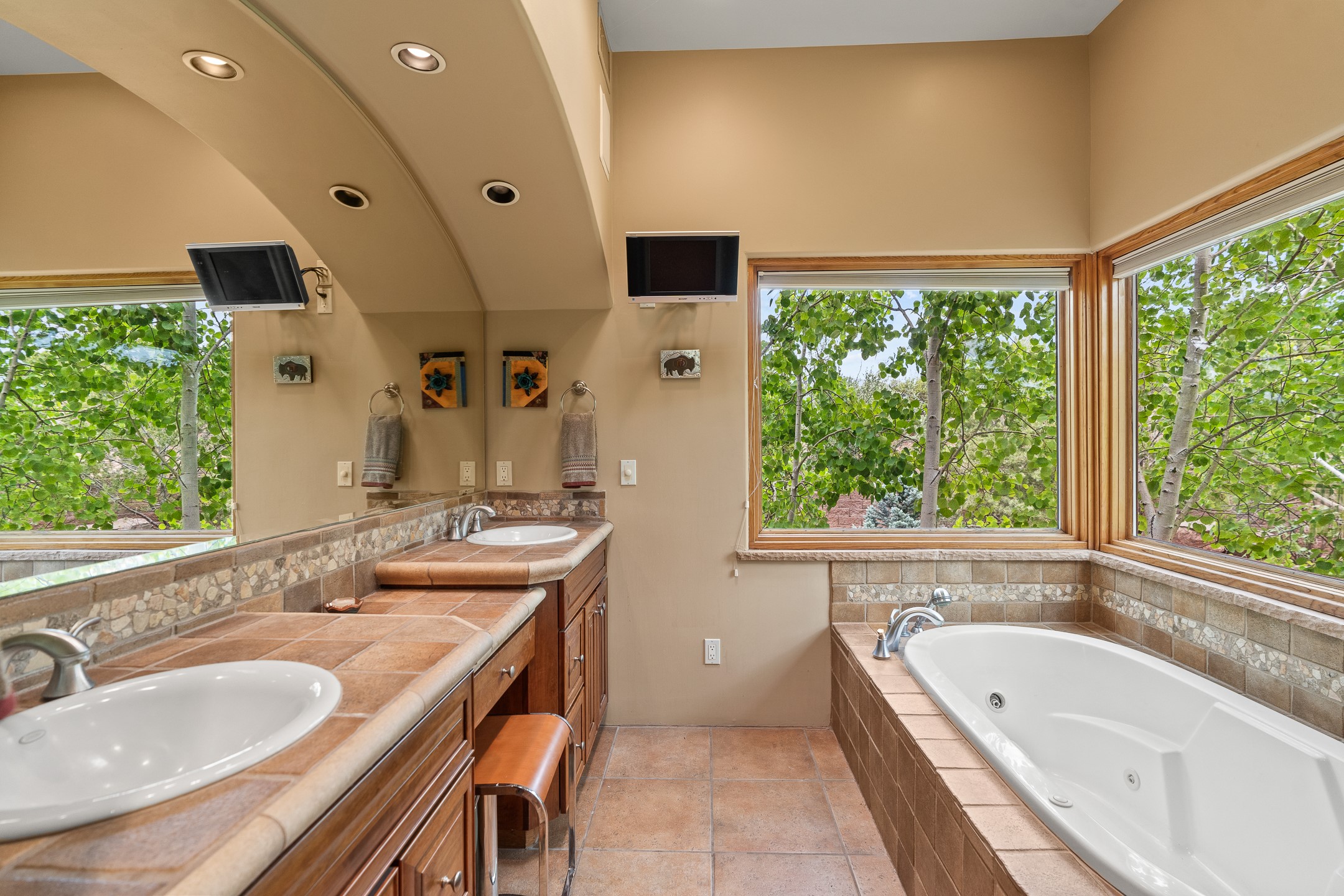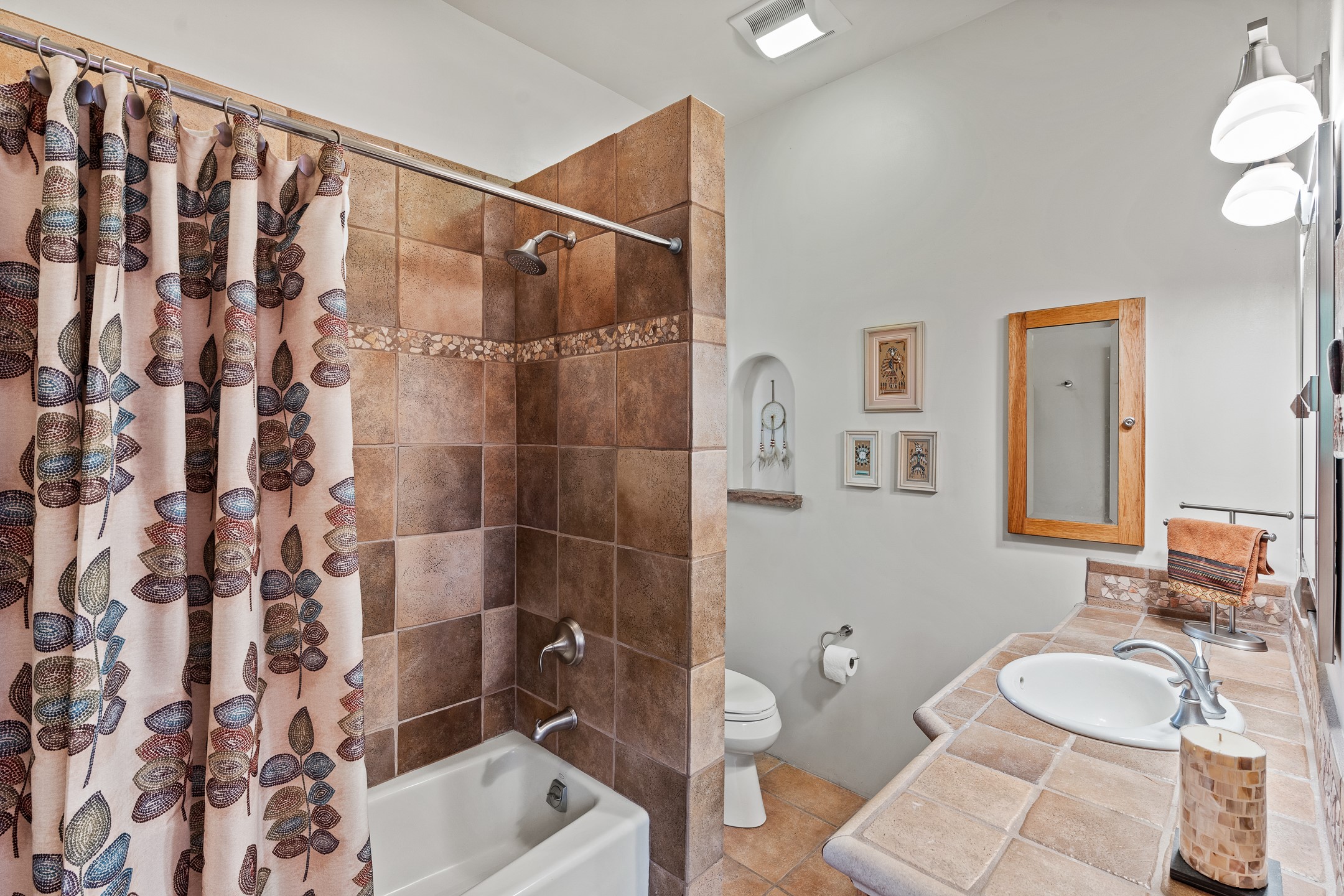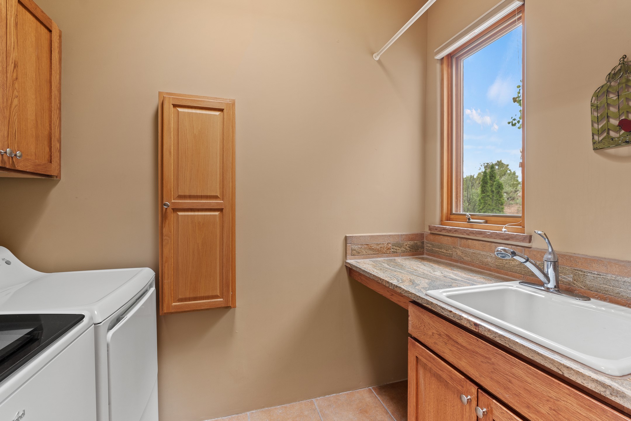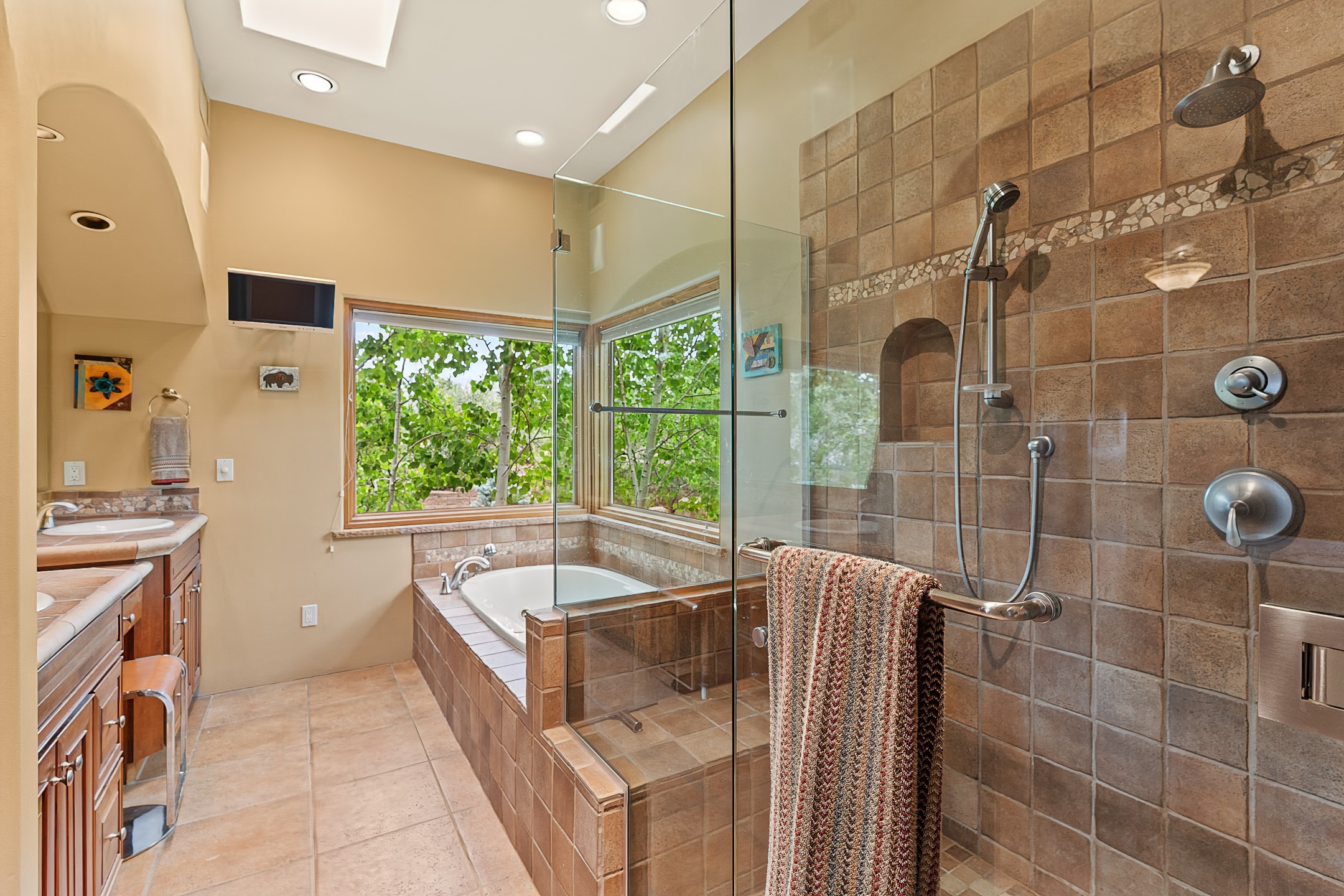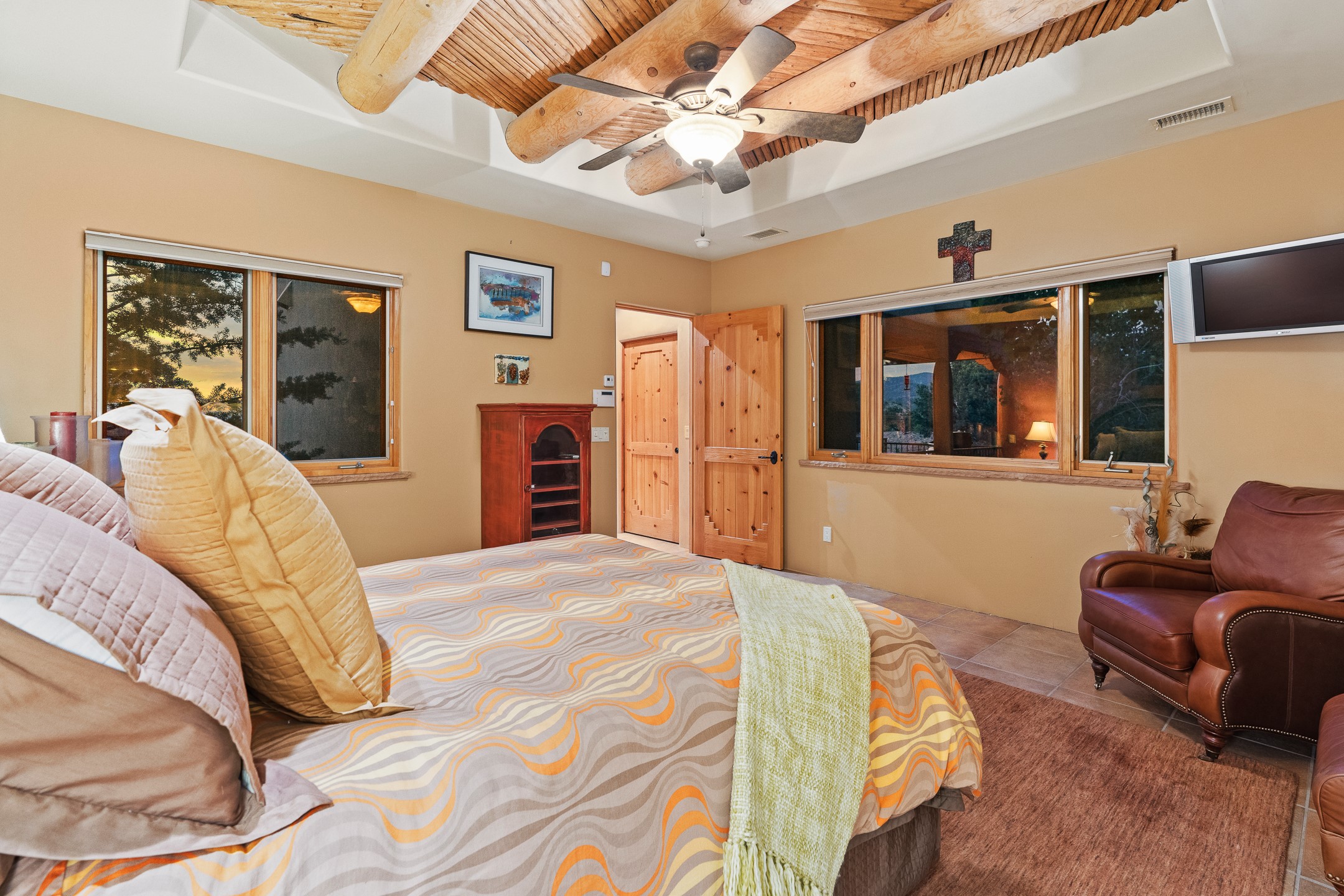 Santa Fe Elegance with Sangre de Cristo Mountain Views.Located in a gated enclave just minutes from the Santa Fe Opera, this 3,000 sq ft residence offers sweeping Sangre de Cristo views from nearly every room. Privately set on 2.7 acres, the home showcases timeless Santa Fe style with diamond plaster walls, vigas, latilla ceilings, and a classic kiva fireplace.The upper level, the heart of the home, features a chef's kitchen with professional Wolf 6 burner range, and grill, pot filler, built-in wine captain fridge, a Wolf double oven and Sub zero stainless refrigerator, a dining room, expansive living room, and a serene primary suite, all thoughtfully positioned to capture the stunning vistas. A large entertainer's deck invites outdoor dining and sunset gatherings.The lower level offers a flexible den/office and a private guest suite, accessed through a charming gated courtyard. Additional highlights include an 850-bottle climate-controlled wine cellar, generous storage, and three custom rock water features that add tranquility throughout the mature landscaped gardens.A rare blend of privacy, style, and panoramic beauty--just minutes from world-class music, culture, and cuisine.