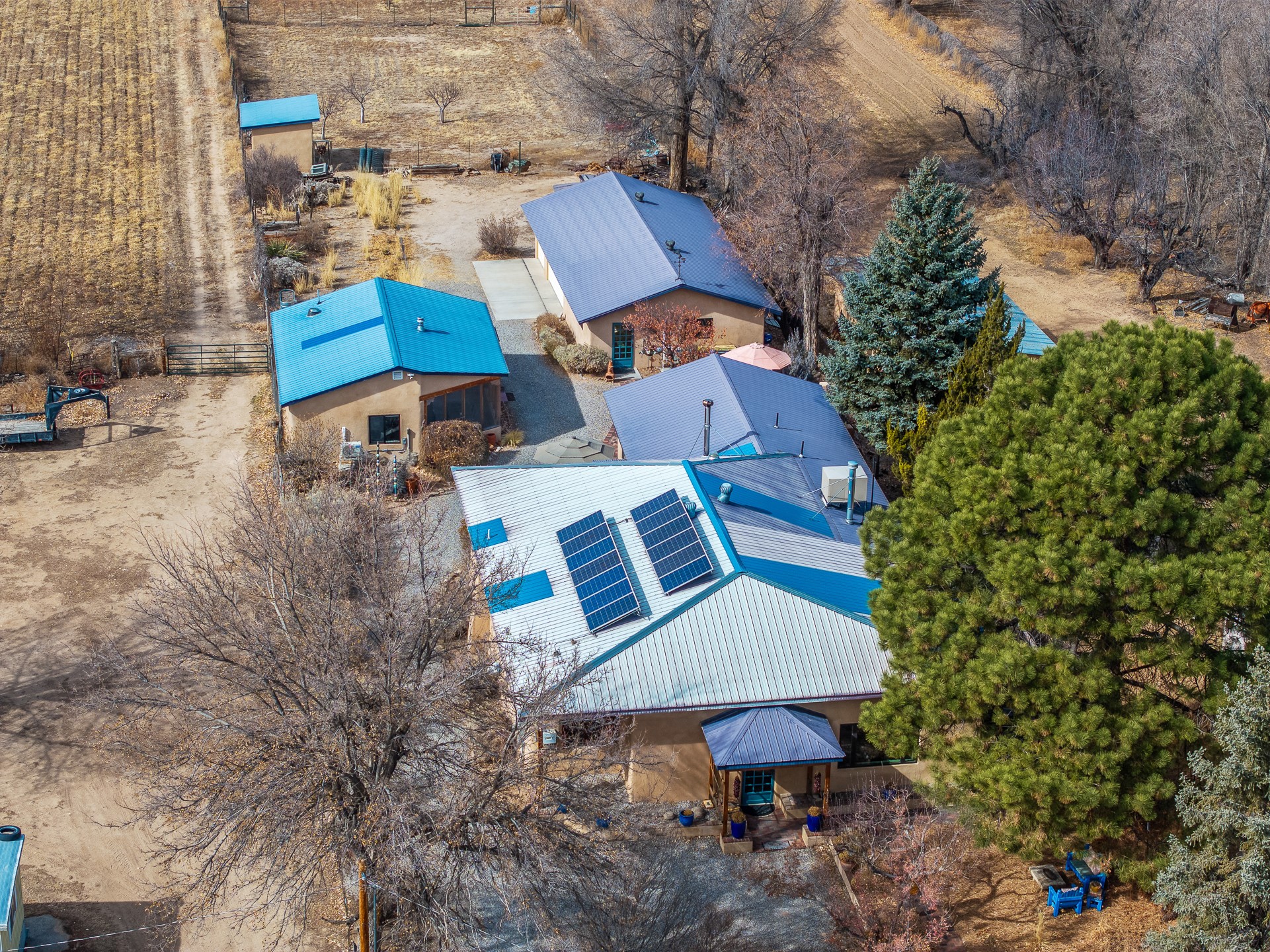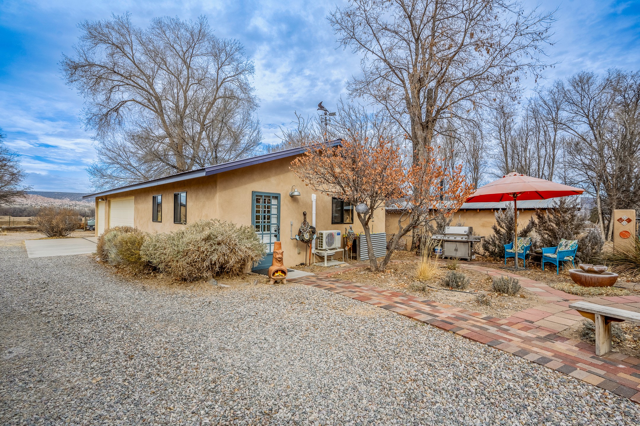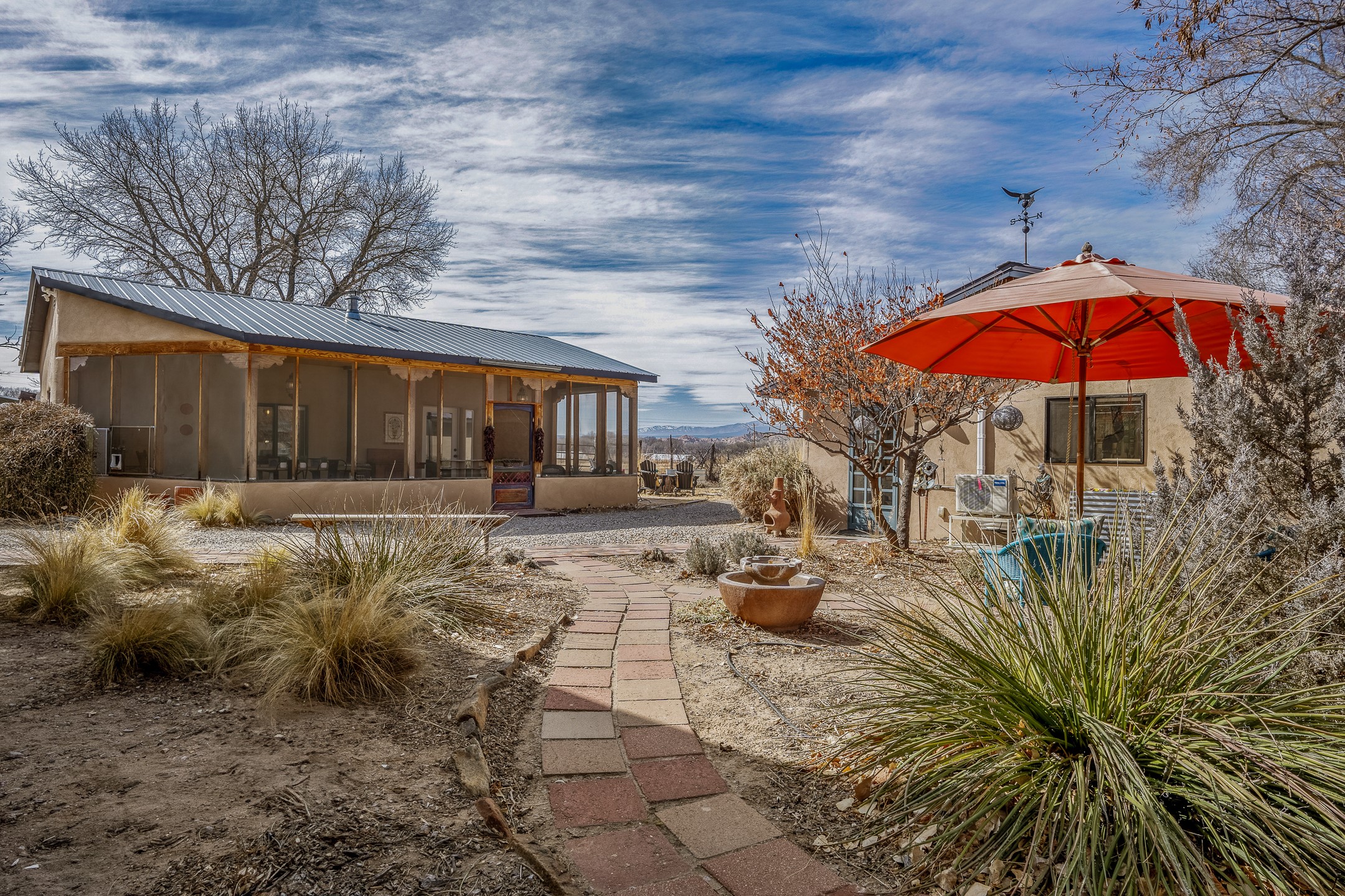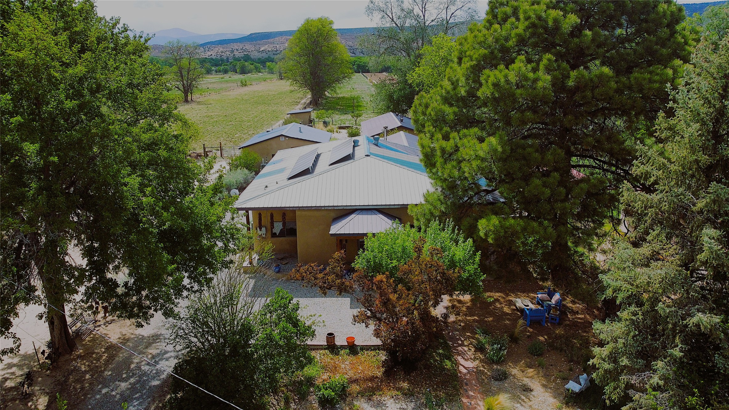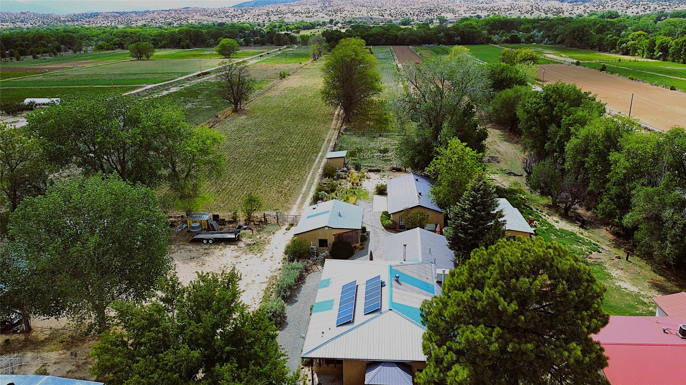 Charming, yet elegant, Alcalde adobe compound just steps from the Rio Grande Bosque. Experience refined farm living in this meticulously restored northern New Mexico property, which includes a main house, detached casita, and artist studio with a 3-car garage on 4.2 acres--2 acres of which are arable farmland. The acreage stretches from the Acequia de Alcalde to the Rio Grande Bosque and offers sweeping 180-degree views of the Jemez Mountains, Black Mesa, and the RG Bosque. The 3-bedroom, 2-bath adobe main house dates back to the early 1900s but has undergone thoughtful renovations and system upgrades in 2004 and again between 2022 and 2025. Finishes include vigas, coved ceilings, tile, brick, and wood floors, plus new high-end appliances in the kitchen and laundry. Equally charming is the 1-BD, 1-BA detached casita--perfect for guests or rental income. The double-adobe casita, the oldest structure on the property, was completely reimagined in 2024 and features custom tile work, a functional kitchenette, a new mini-split for heating and cooling, a screened-in porch, and front-row views of the Bosque. The property also includes a 3-car detached garage with an attached artist studio, making this property truly the complete package. The approximately 500 sq. ft. studio is heated and cooled by a mini-split and serves as an ideal space to create--or would serve as a great workshop. The grounds near the residences are landscaped with native grasses, flowers, a variety of fruit trees, and are watered by an 8-zone automated drip irrigation system. Water fountains grace both the front and back of the main house for added ambiance. Additional features include a private well, net-metered solar panels on the main house, and 3-acre feet of acequia water rights. Whether you're seeking an agricultural dream or a lush, retreat from city life, this property offers tranquility and the splendor of northern New Mexico--just 35 minutes from downtown Santa Fe.