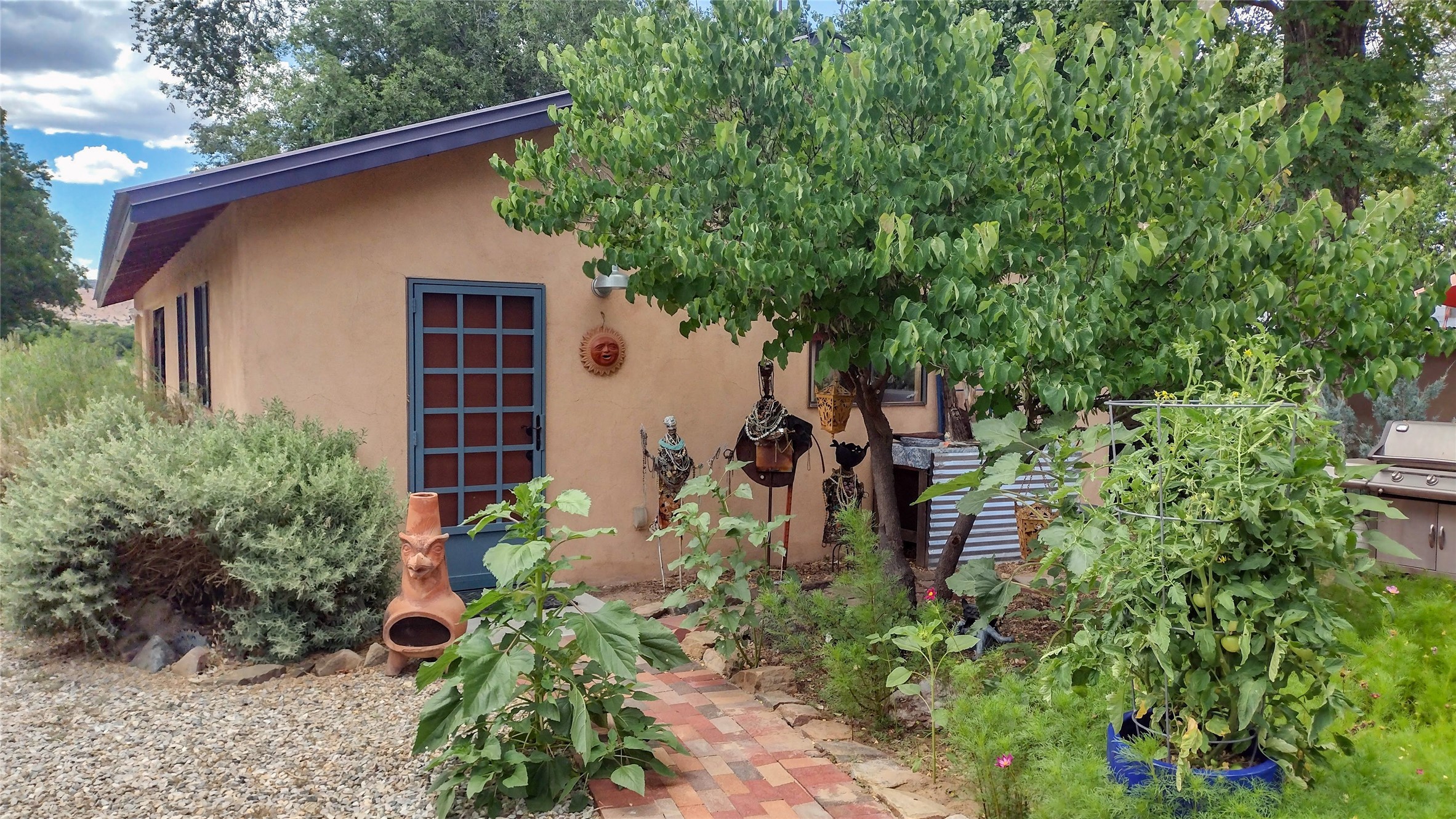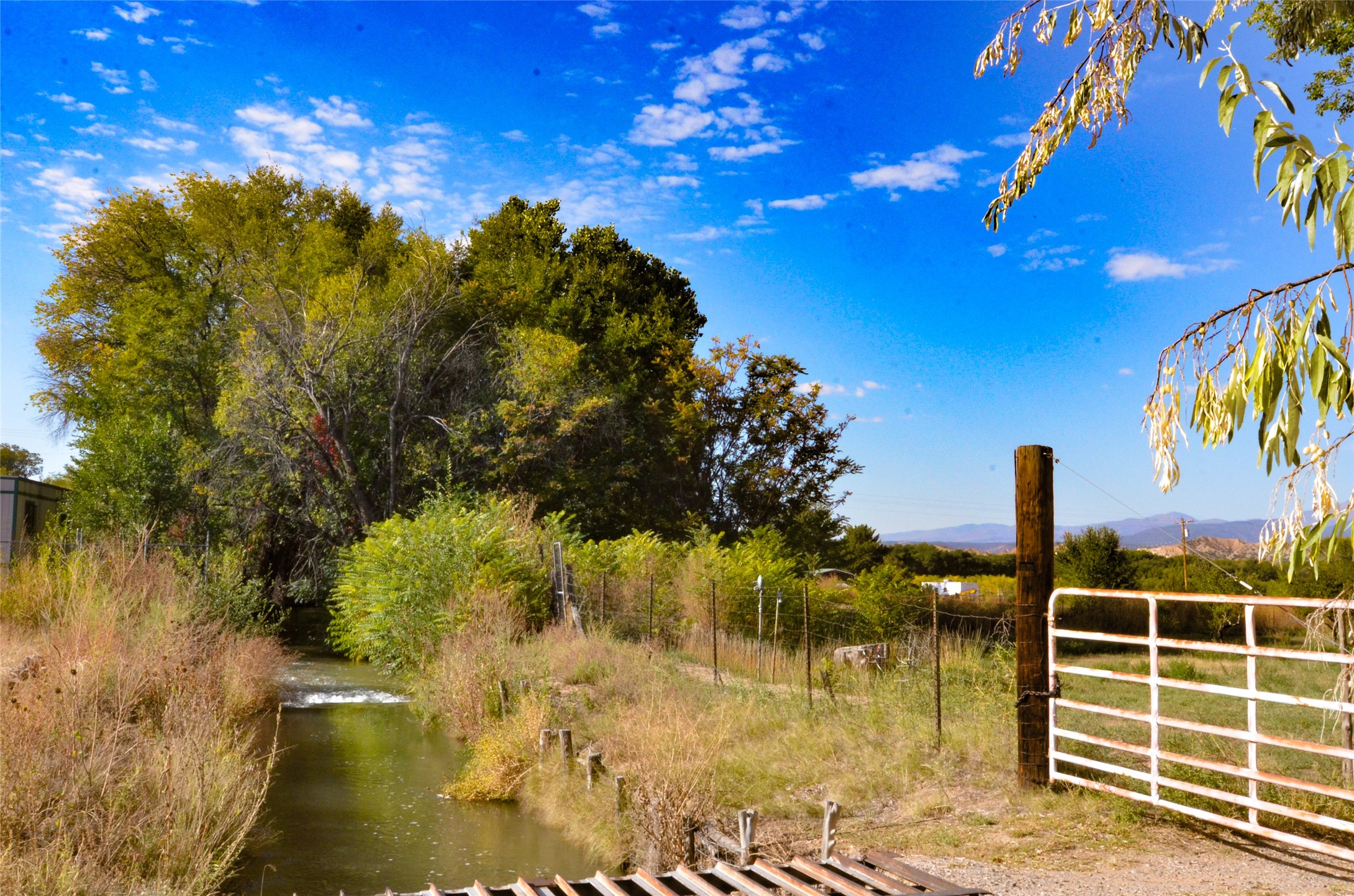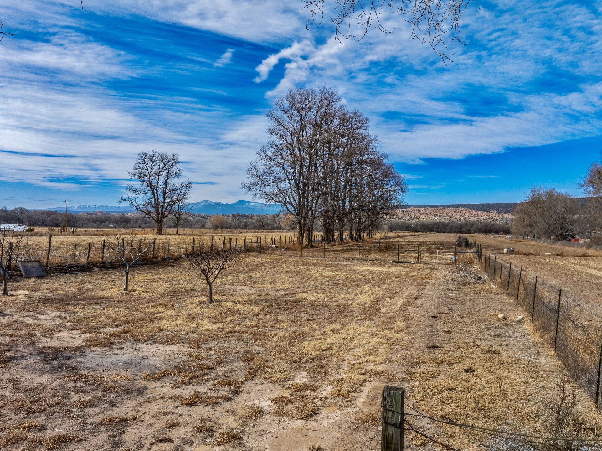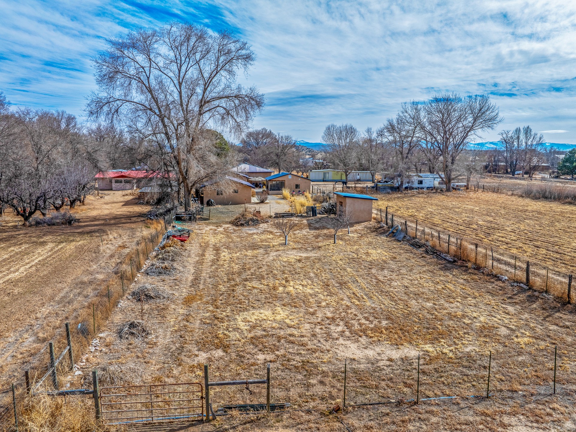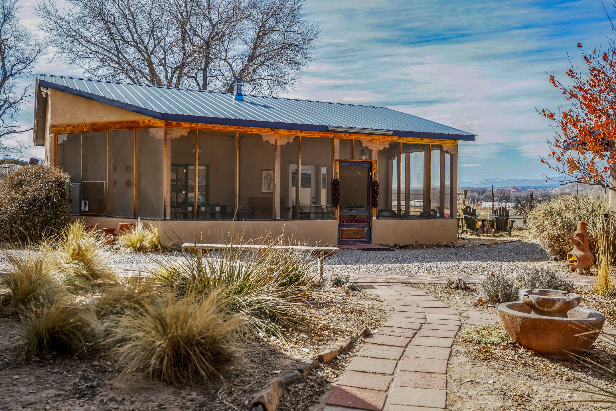 Charming, yet elegant, Alcalde adobe compound just steps from the Rio Grande Bosque. Experience refined farm living in this meticulously restored northern New Mexico property, which includes a main house, detached casita, and artist studio with a 3-car garage on 4.2 acres--2 acres of which are arable farmland. The acreage stretches from the Acequia de Alcalde to the Rio Grande Bosque and offers sweeping 180-degree views of the Jemez Mountains, Black Mesa, and the RG Bosque. The 3-bedroom, 2-bath adobe main house dates back to the early 1900s but has undergone thoughtful renovations and system upgrades in 2004 and again between 2022 and 2025. Finishes include vigas, coved ceilings, tile, brick, and wood floors, plus new high-end appliances in the kitchen and laundry. Equally charming is the 1-BD, 1-BA detached casita--perfect for guests or rental income. The double-adobe casita, the oldest structure on the property, was completely reimagined in 2024 and features custom tile work, a functional kitchenette, a new mini-split for heating and cooling, a screened-in porch, and front-row views of the Bosque. The property also includes a 3-car detached garage with an attached artist studio, making this property truly the complete package. The approximately 500 sq. ft. studio is heated and cooled by a mini-split and serves as an ideal space to create--or would serve as a great workshop. The grounds near the residences are landscaped with native grasses, flowers, a variety of fruit trees, and are watered by an 8-zone automated drip irrigation system. Water fountains grace both the front and back of the main house for added ambiance. Additional features include a private well, net-metered solar panels on the main house, and 3-acre feet of acequia water rights. Whether you're seeking an agricultural dream or a lush, retreat from city life, this property offers tranquility and the splendor of northern New Mexico--just 35 minutes from downtown Santa Fe.