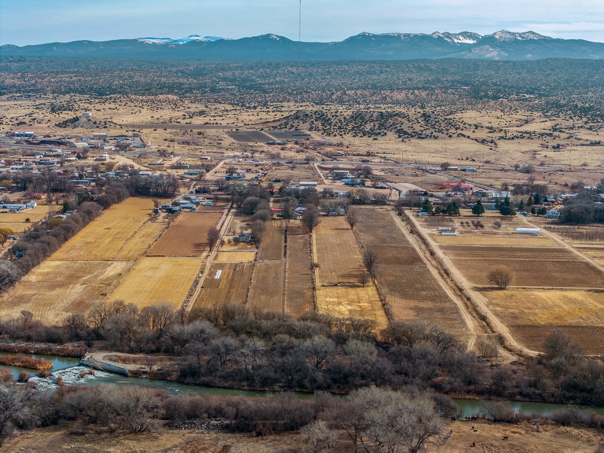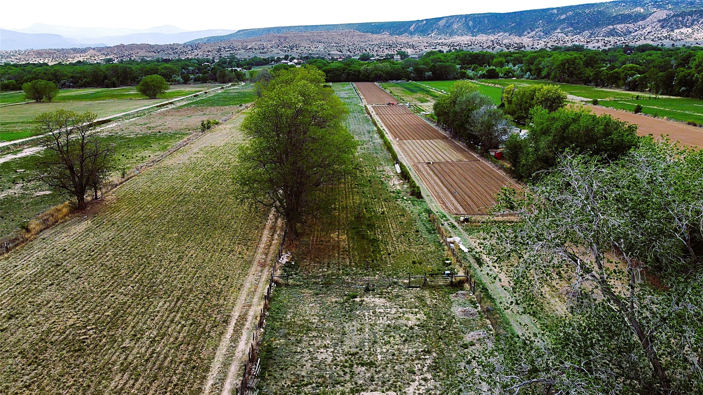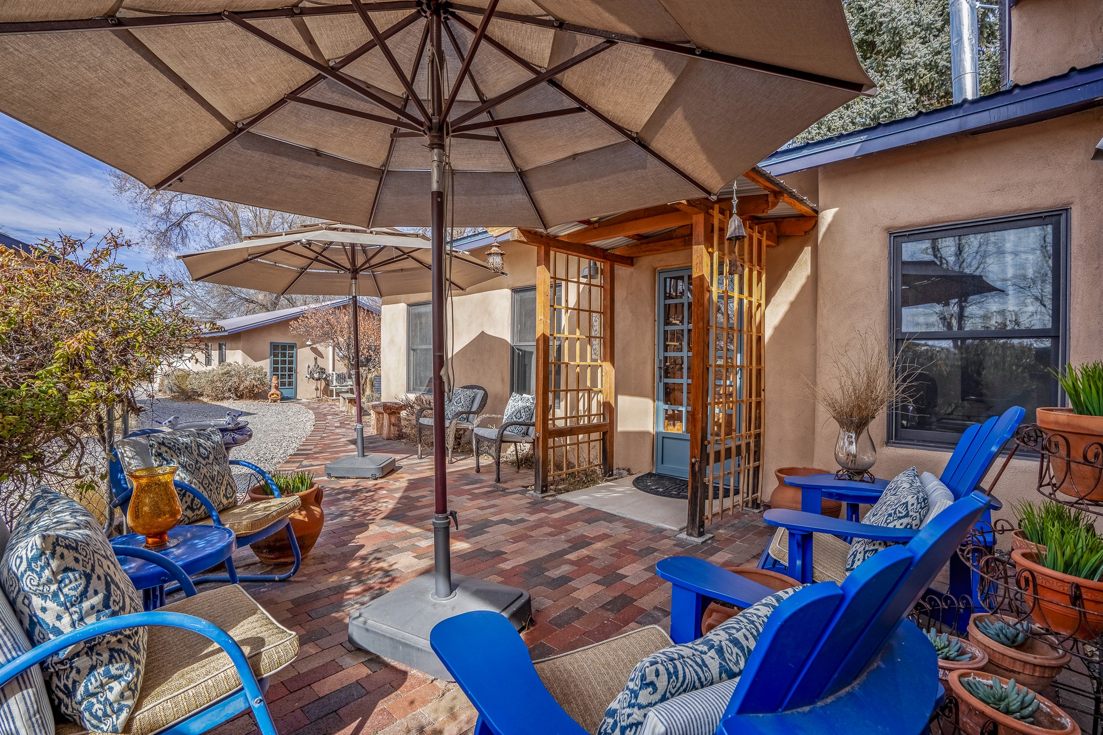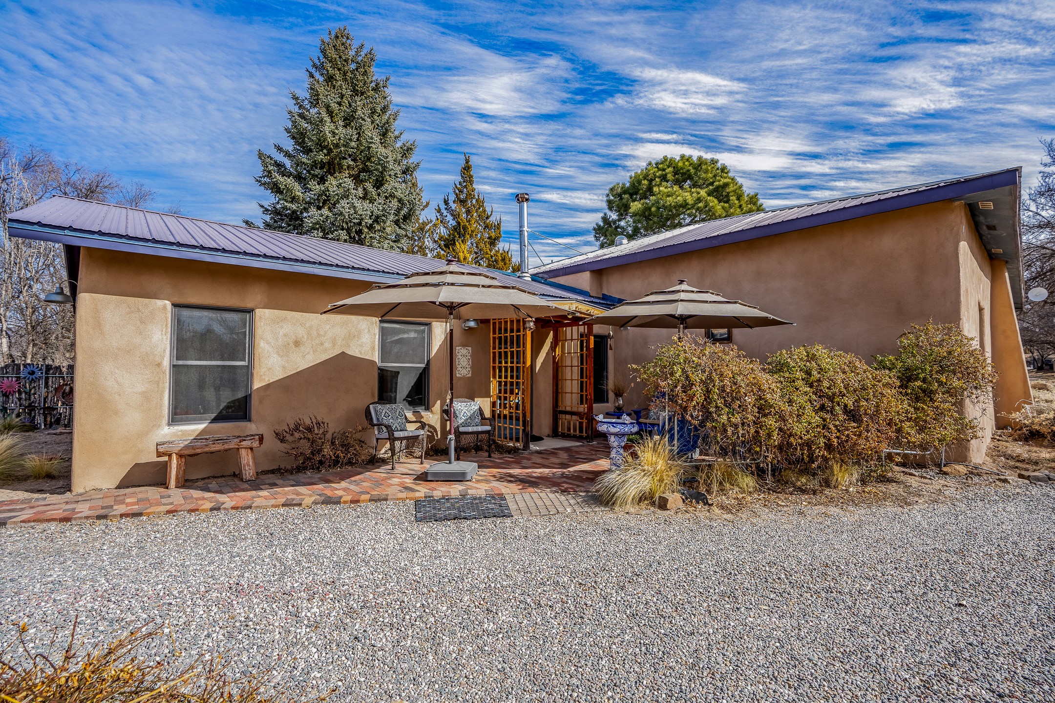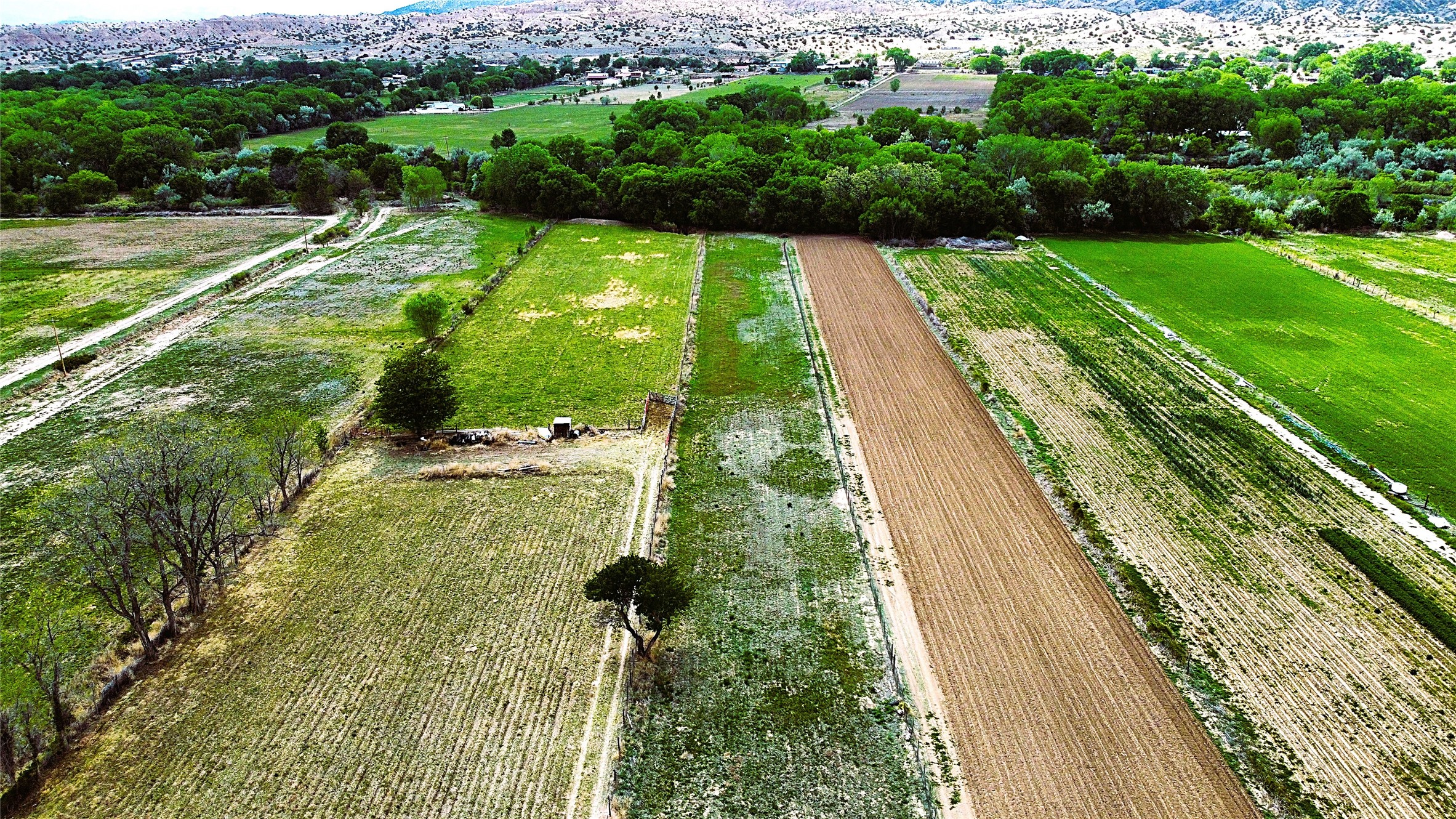 Charming, yet elegant, Alcalde adobe compound just steps from the Rio Grande Bosque. Experience refined farm living in this meticulously restored northern New Mexico property, which includes a main house, detached casita, and artist studio with a 3-car garage on 4.2 acres--2 acres of which are arable farmland. The acreage stretches from the Acequia de Alcalde to the Rio Grande Bosque and offers sweeping 180-degree views of the Jemez Mountains, Black Mesa, and the RG Bosque. The 3-bedroom, 2-bath adobe main house dates back to the early 1900s but has undergone thoughtful renovations and system upgrades in 2004 and again between 2022 and 2025. Finishes include vigas, coved ceilings, tile, brick, and wood floors, plus new high-end appliances in the kitchen and laundry. Equally charming is the 1-BD, 1-BA detached casita--perfect for guests or rental income. The double-adobe casita, the oldest structure on the property, was completely reimagined in 2024 and features custom tile work, a functional kitchenette, a new mini-split for heating and cooling, a screened-in porch, and front-row views of the Bosque. The property also includes a 3-car detached garage with an attached artist studio, making this property truly the complete package. The approximately 500 sq. ft. studio is heated and cooled by a mini-split and serves as an ideal space to create--or would serve as a great workshop. The grounds near the residences are landscaped with native grasses, flowers, a variety of fruit trees, and are watered by an 8-zone automated drip irrigation system. Water fountains grace both the front and back of the main house for added ambiance. Additional features include a private well, net-metered solar panels on the main house, and 3-acre feet of acequia water rights. Whether you're seeking an agricultural dream or a lush, retreat from city life, this property offers tranquility and the splendor of northern New Mexico--just 35 minutes from downtown Santa Fe.