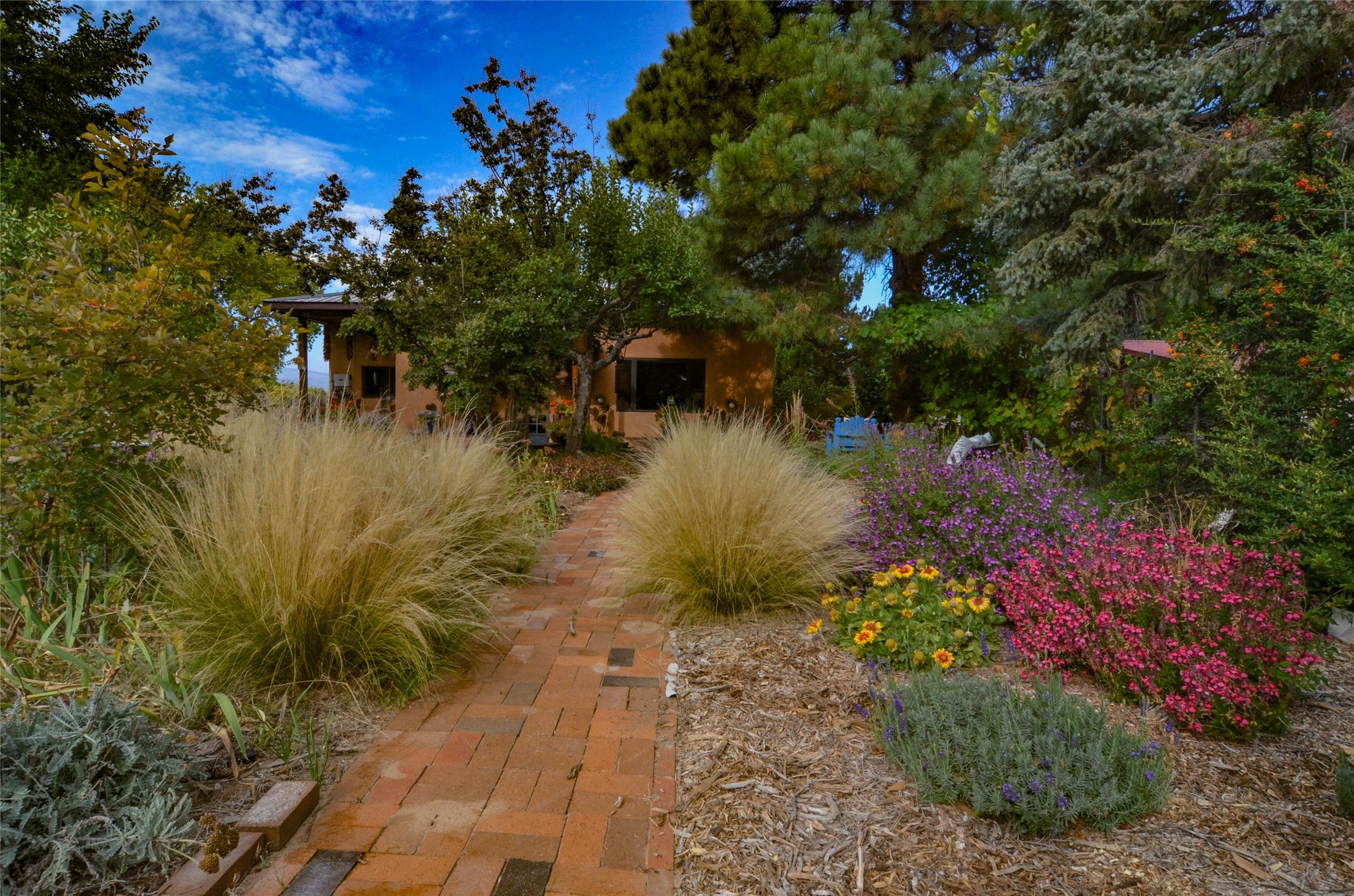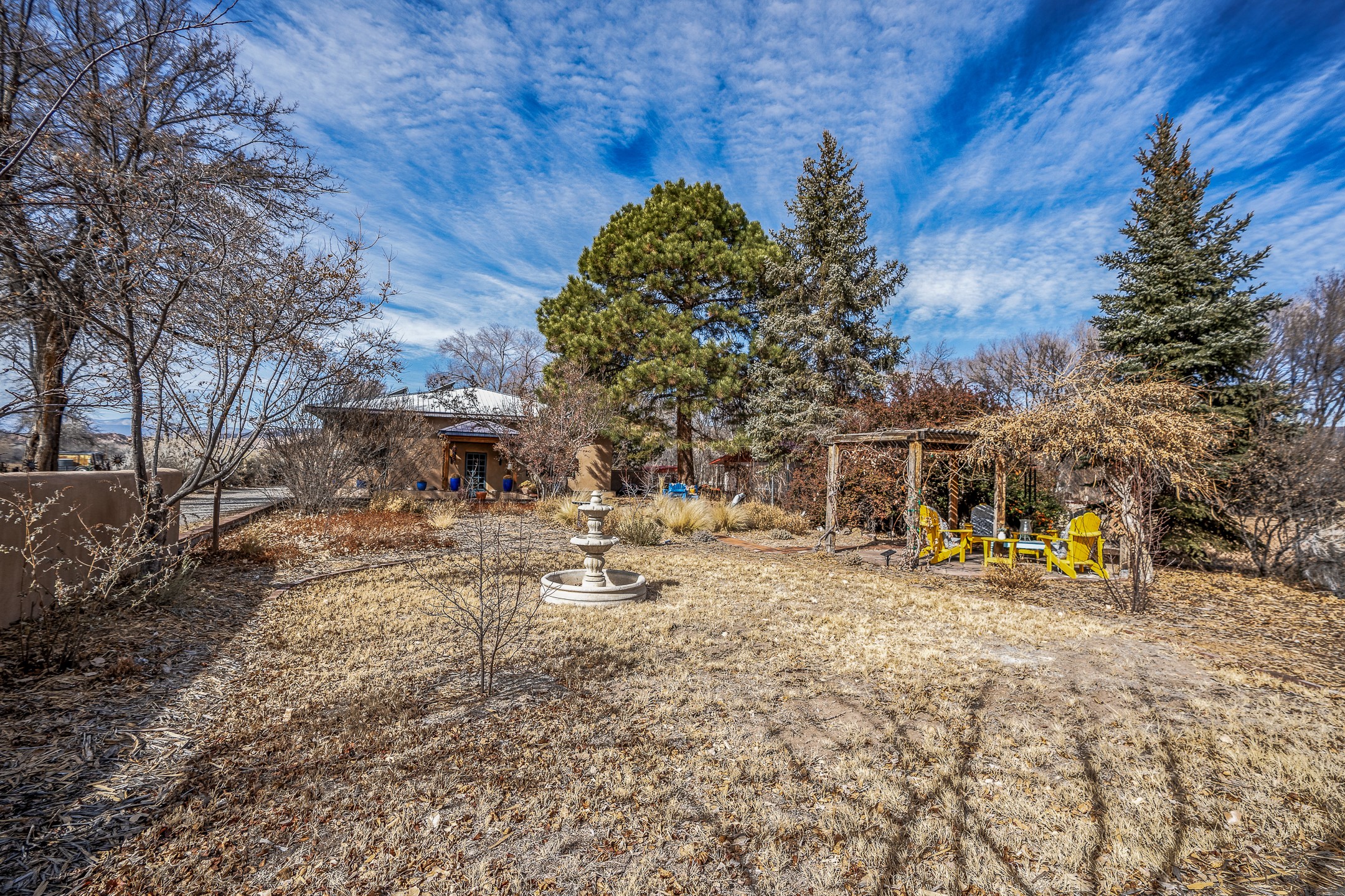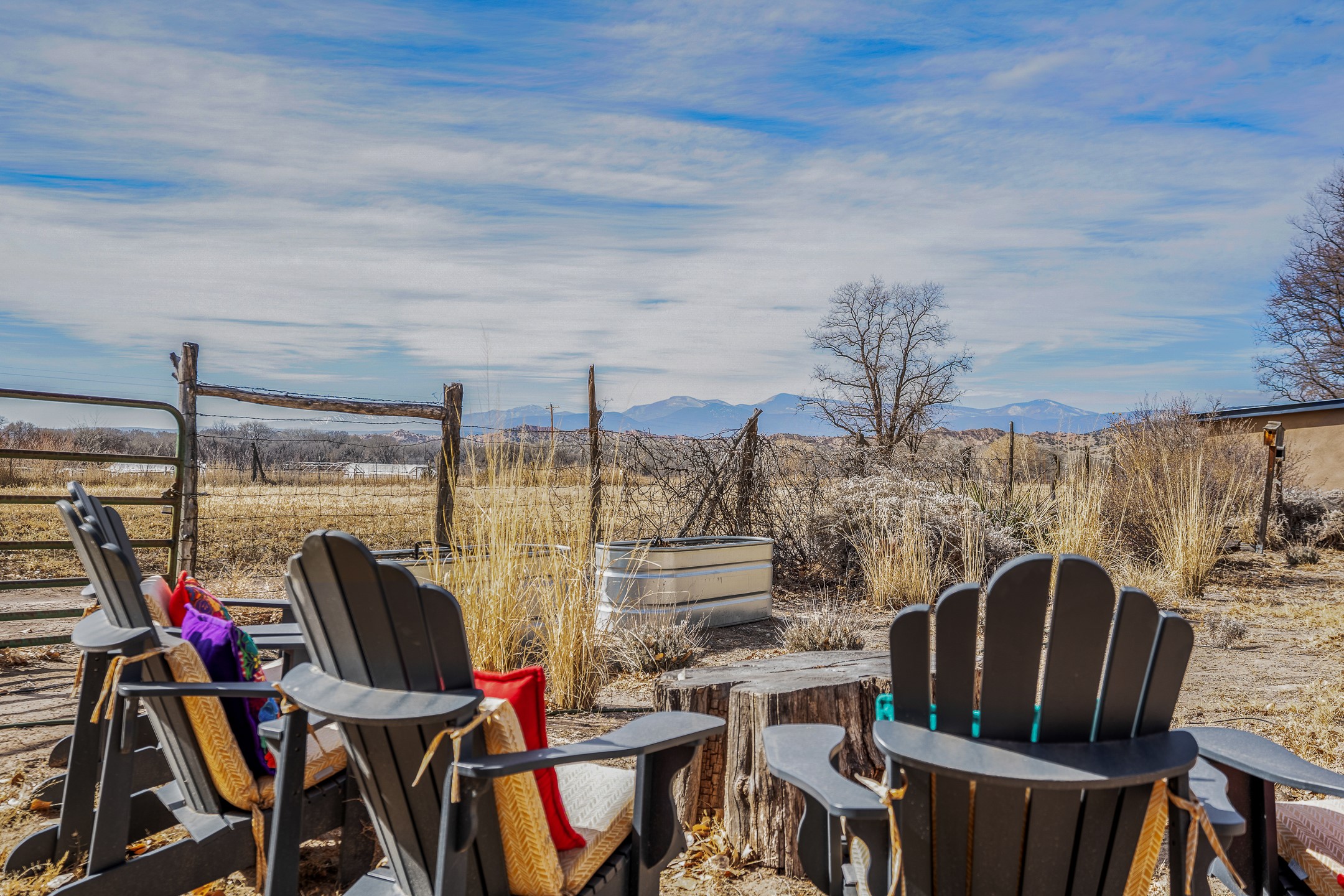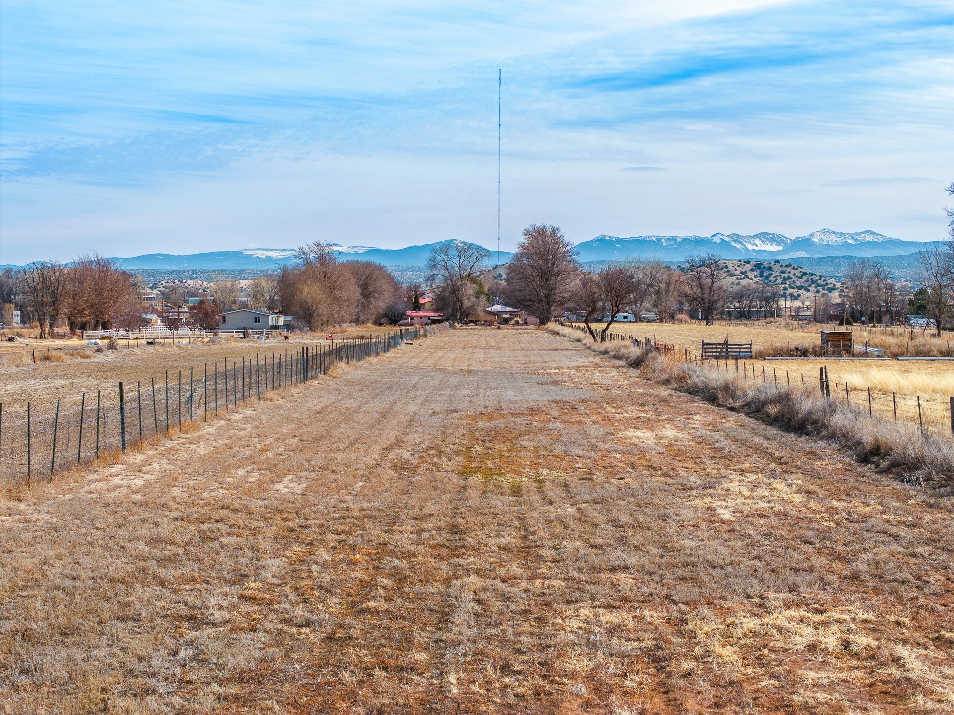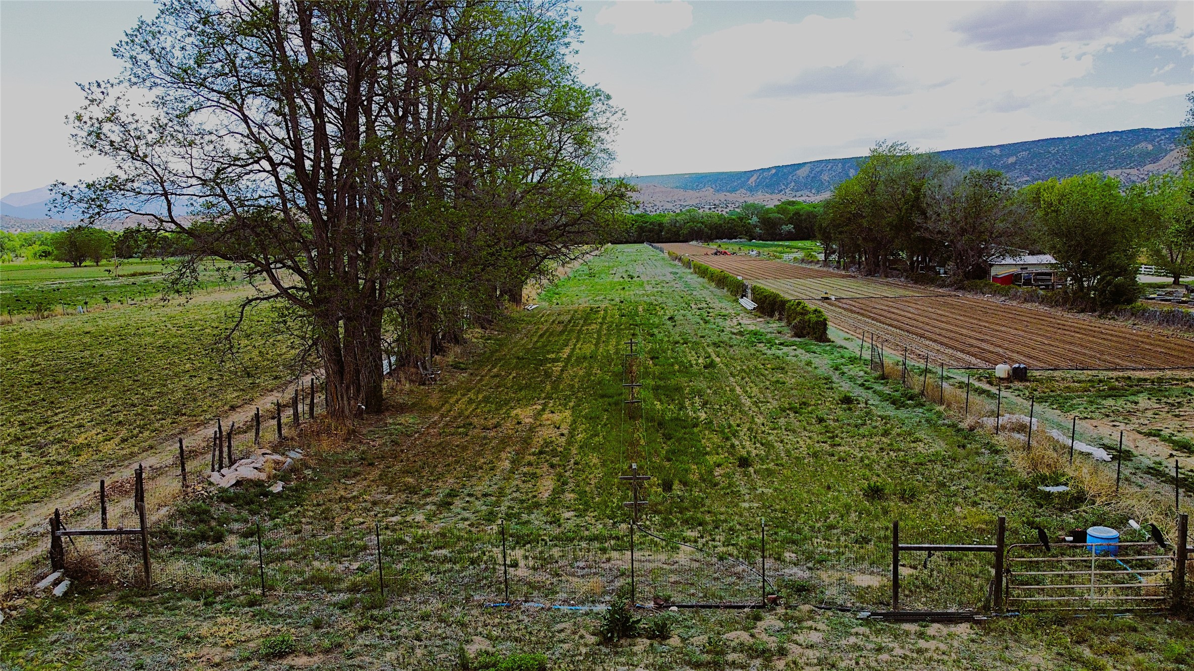 Charming, yet elegant, Alcalde adobe compound just steps from the Rio Grande Bosque. Experience refined farm living in this meticulously restored northern New Mexico property, which includes a main house, detached casita, and artist studio with a 3-car garage on 4.2 acres--2 acres of which are arable farmland. The acreage stretches from the Acequia de Alcalde to the Rio Grande Bosque and offers sweeping 180-degree views of the Jemez Mountains, Black Mesa, and the RG Bosque. The 3-bedroom, 2-bath adobe main house dates back to the early 1900s but has undergone thoughtful renovations and system upgrades in 2004 and again between 2022 and 2025. Finishes include vigas, coved ceilings, tile, brick, and wood floors, plus new high-end appliances in the kitchen and laundry. Equally charming is the 1-BD, 1-BA detached casita--perfect for guests or rental income. The double-adobe casita, the oldest structure on the property, was completely reimagined in 2024 and features custom tile work, a functional kitchenette, a new mini-split for heating and cooling, a screened-in porch, and front-row views of the Bosque. The property also includes a 3-car detached garage with an attached artist studio, making this property truly the complete package. The approximately 500 sq. ft. studio is heated and cooled by a mini-split and serves as an ideal space to create--or would serve as a great workshop. The grounds near the residences are landscaped with native grasses, flowers, a variety of fruit trees, and are watered by an 8-zone automated drip irrigation system. Water fountains grace both the front and back of the main house for added ambiance. Additional features include a private well, net-metered solar panels on the main house, and 3-acre feet of acequia water rights. Whether you're seeking an agricultural dream or a lush, retreat from city life, this property offers tranquility and the splendor of northern New Mexico--just 35 minutes from downtown Santa Fe.