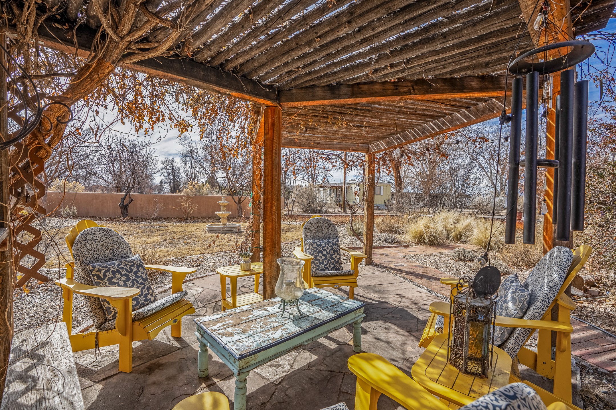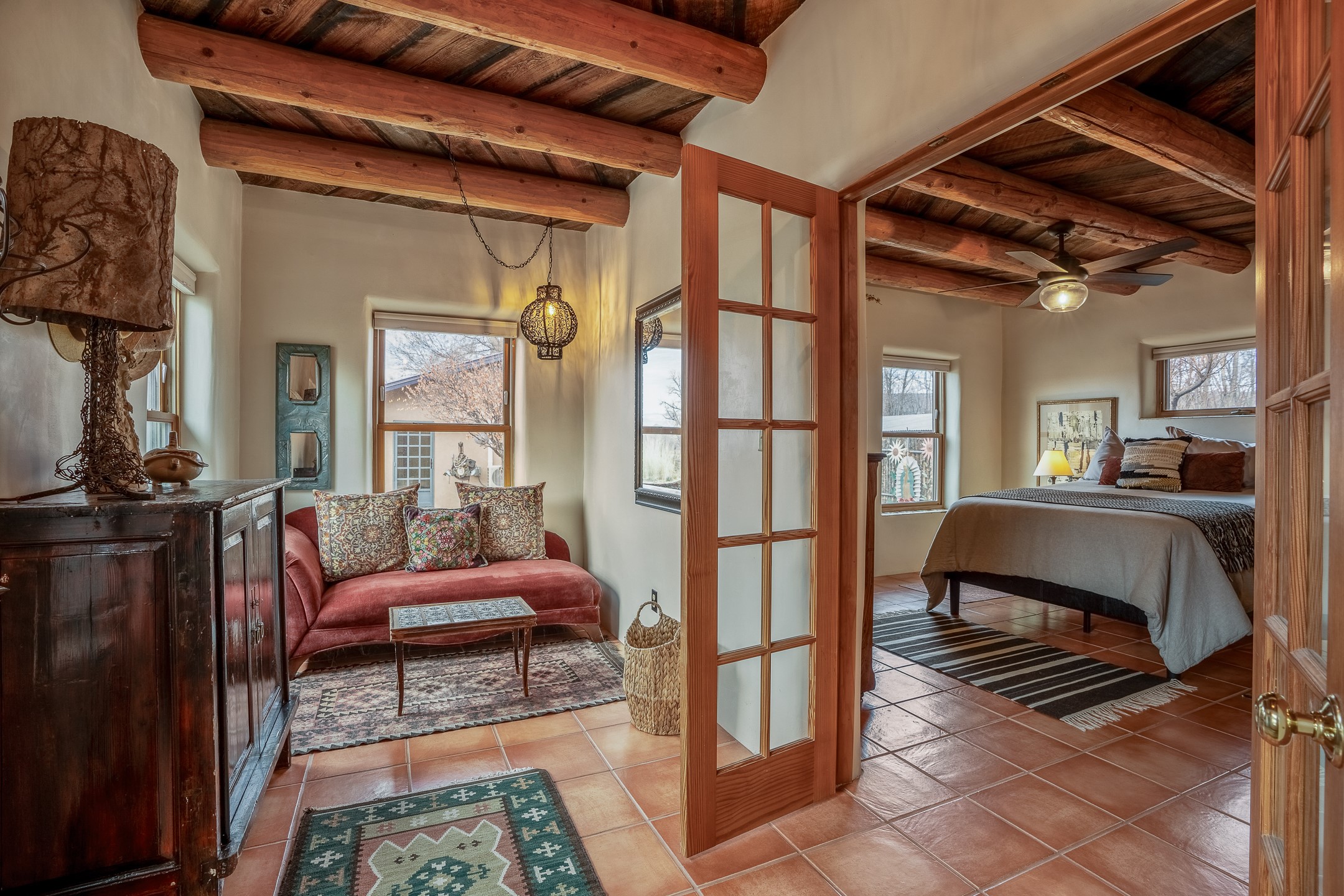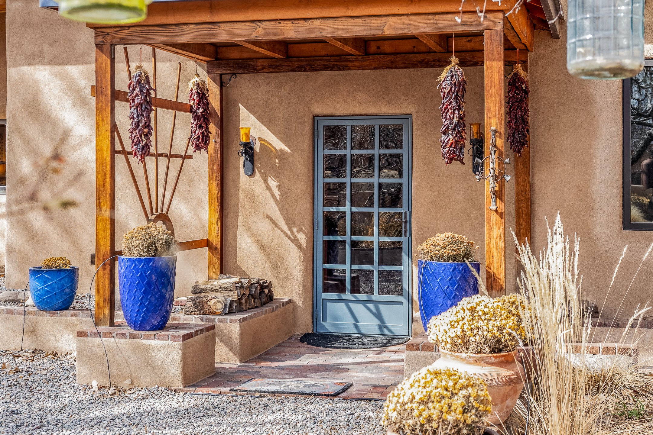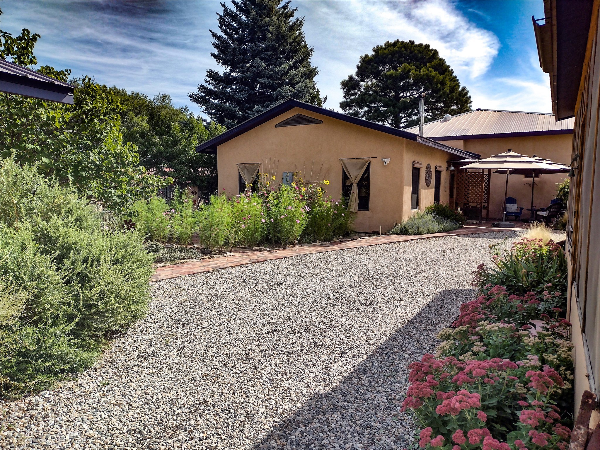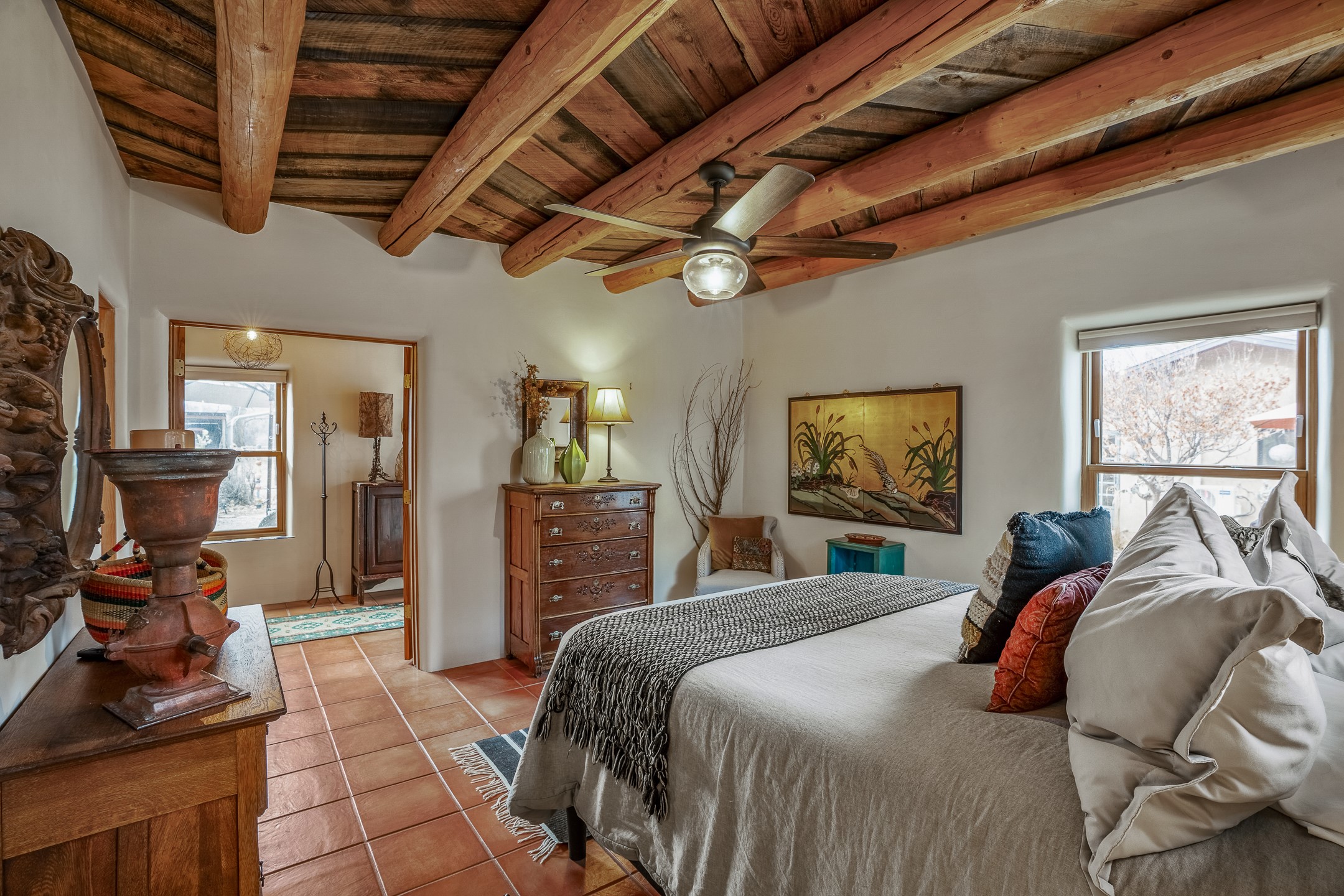 Charming, yet elegant, Alcalde adobe compound just steps from the Rio Grande Bosque. Experience refined farm living in this meticulously restored northern New Mexico property, which includes a main house, detached casita, and artist studio with a 3-car garage on 4.2 acres--2 acres of which are arable farmland. The acreage stretches from the Acequia de Alcalde to the Rio Grande Bosque and offers sweeping 180-degree views of the Jemez Mountains, Black Mesa, and the RG Bosque. The 3-bedroom, 2-bath adobe main house dates back to the early 1900s but has undergone thoughtful renovations and system upgrades in 2004 and again between 2022 and 2025. Finishes include vigas, coved ceilings, tile, brick, and wood floors, plus new high-end appliances in the kitchen and laundry. Equally charming is the 1-BD, 1-BA detached casita--perfect for guests or rental income. The double-adobe casita, the oldest structure on the property, was completely reimagined in 2024 and features custom tile work, a functional kitchenette, a new mini-split for heating and cooling, a screened-in porch, and front-row views of the Bosque. The property also includes a 3-car detached garage with an attached artist studio, making this property truly the complete package. The approximately 500 sq. ft. studio is heated and cooled by a mini-split and serves as an ideal space to create--or would serve as a great workshop. The grounds near the residences are landscaped with native grasses, flowers, a variety of fruit trees, and are watered by an 8-zone automated drip irrigation system. Water fountains grace both the front and back of the main house for added ambiance. Additional features include a private well, net-metered solar panels on the main house, and 3-acre feet of acequia water rights. Whether you're seeking an agricultural dream or a lush, retreat from city life, this property offers tranquility and the splendor of northern New Mexico--just 35 minutes from downtown Santa Fe.