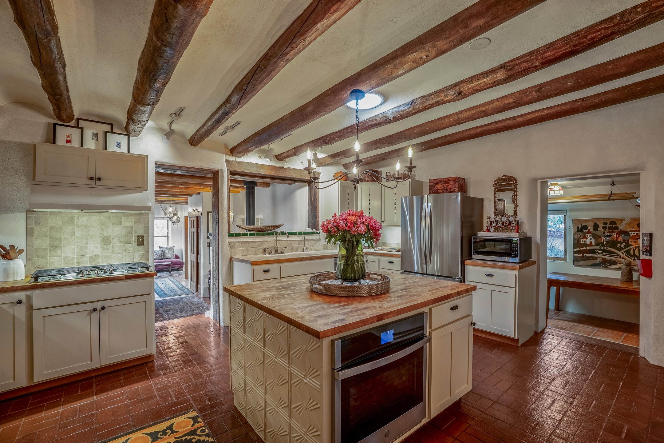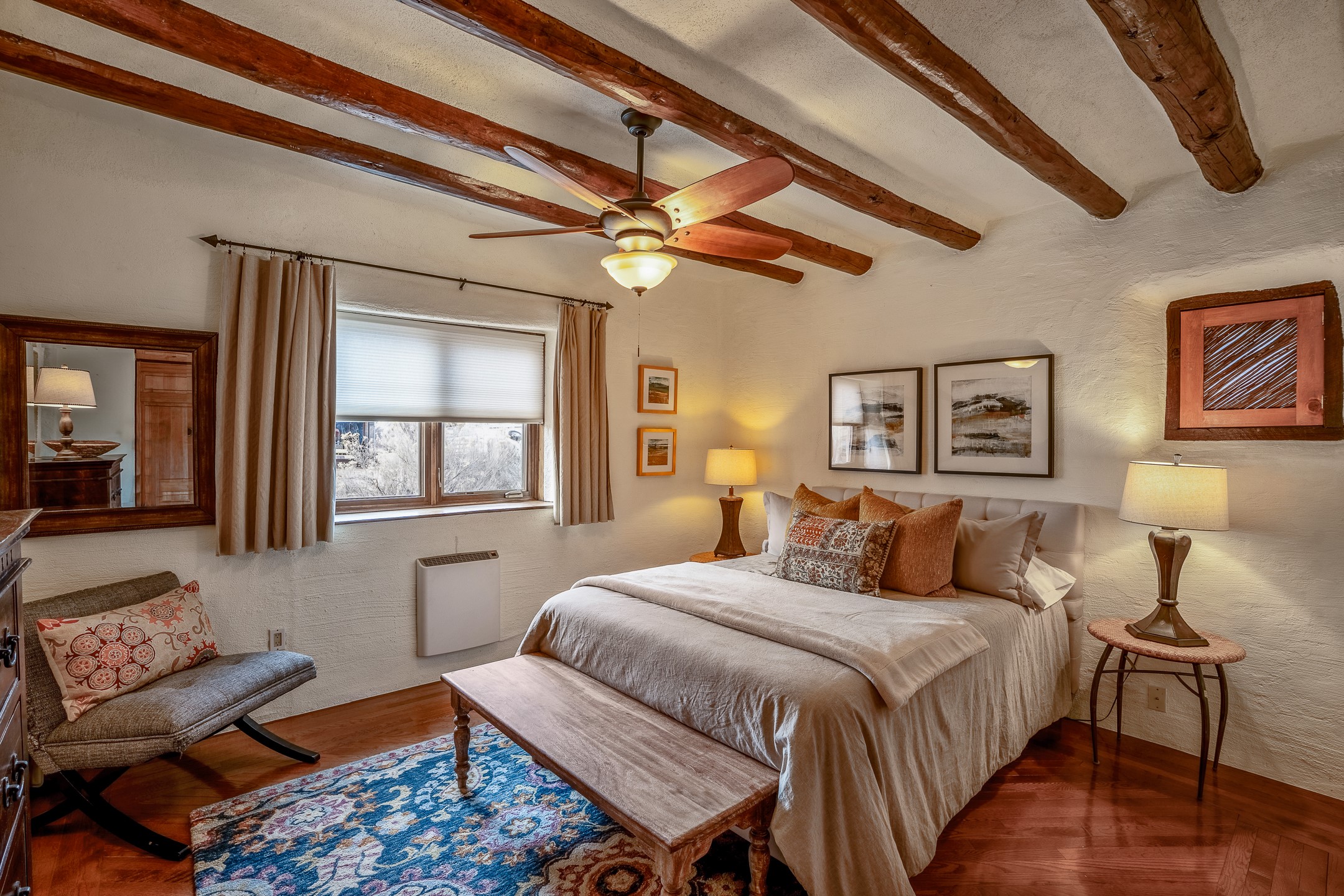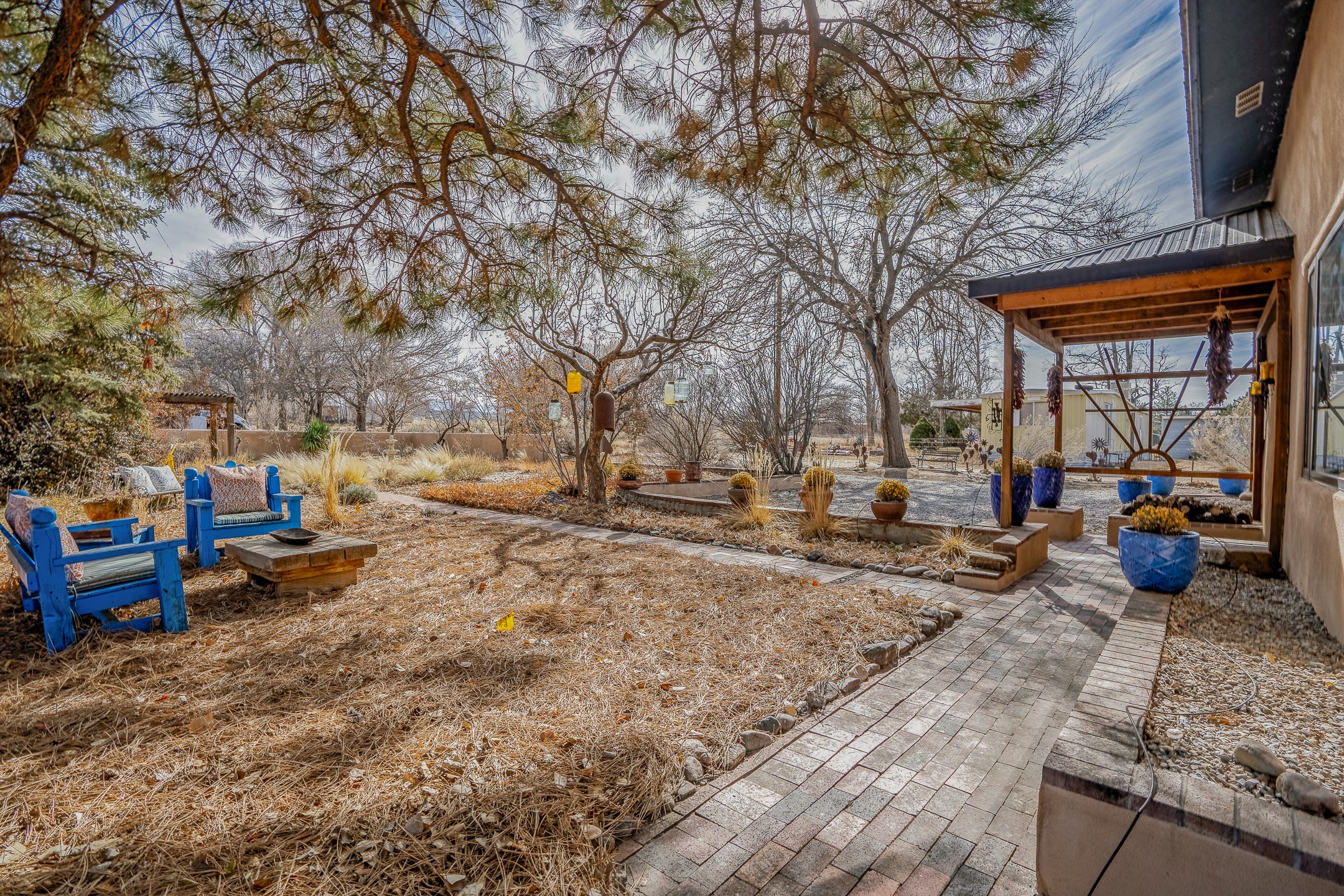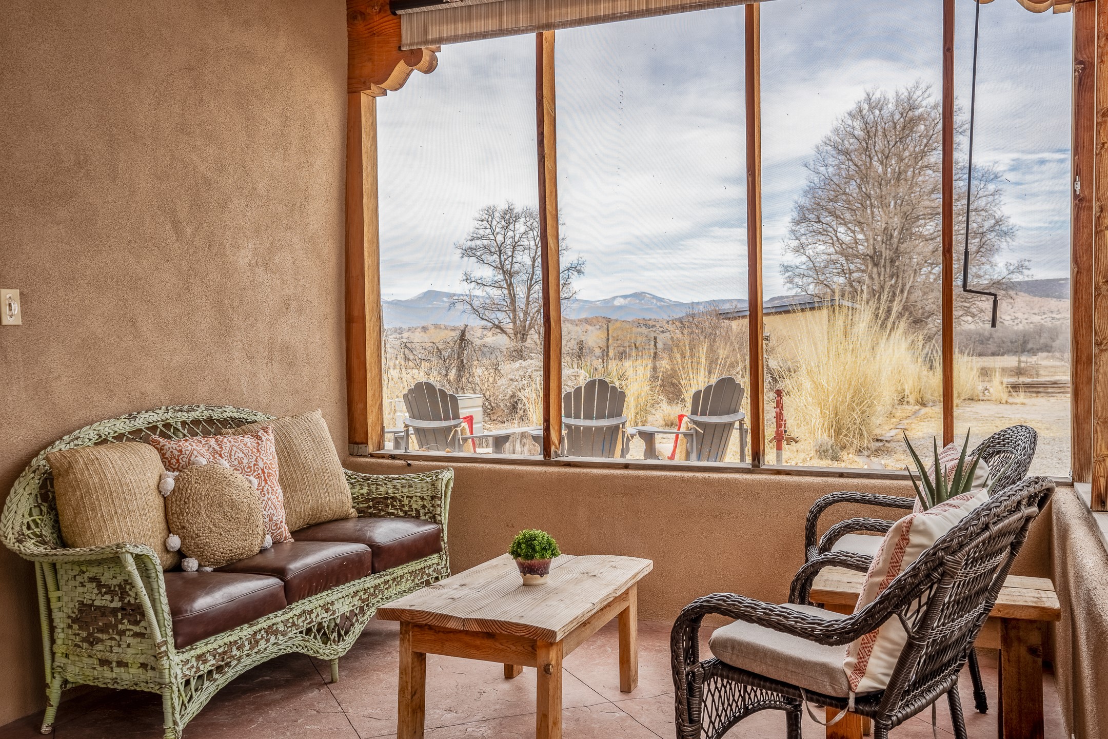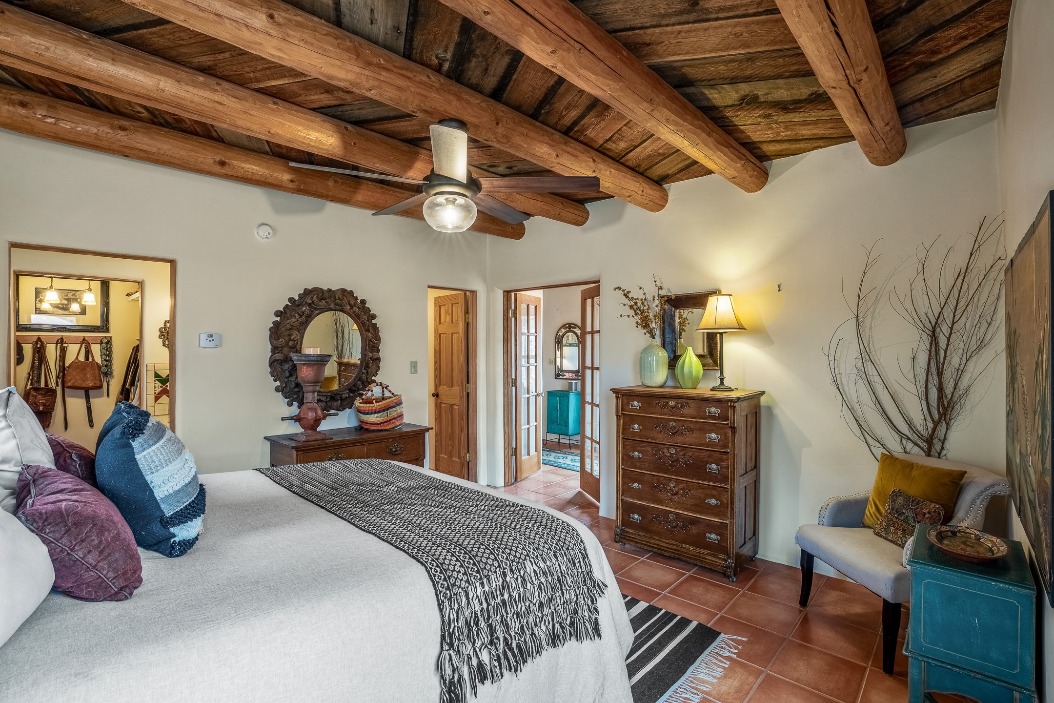 Charming, yet elegant, Alcalde adobe compound just steps from the Rio Grande Bosque. Experience refined farm living in this meticulously restored northern New Mexico property, which includes a main house, detached casita, and artist studio with a 3-car garage on 4.2 acres--2 acres of which are arable farmland. The acreage stretches from the Acequia de Alcalde to the Rio Grande Bosque and offers sweeping 180-degree views of the Jemez Mountains, Black Mesa, and the RG Bosque. The 3-bedroom, 2-bath adobe main house dates back to the early 1900s but has undergone thoughtful renovations and system upgrades in 2004 and again between 2022 and 2025. Finishes include vigas, coved ceilings, tile, brick, and wood floors, plus new high-end appliances in the kitchen and laundry. Equally charming is the 1-BD, 1-BA detached casita--perfect for guests or rental income. The double-adobe casita, the oldest structure on the property, was completely reimagined in 2024 and features custom tile work, a functional kitchenette, a new mini-split for heating and cooling, a screened-in porch, and front-row views of the Bosque. The property also includes a 3-car detached garage with an attached artist studio, making this property truly the complete package. The approximately 500 sq. ft. studio is heated and cooled by a mini-split and serves as an ideal space to create--or would serve as a great workshop. The grounds near the residences are landscaped with native grasses, flowers, a variety of fruit trees, and are watered by an 8-zone automated drip irrigation system. Water fountains grace both the front and back of the main house for added ambiance. Additional features include a private well, net-metered solar panels on the main house, and 3-acre feet of acequia water rights. Whether you're seeking an agricultural dream or a lush, retreat from city life, this property offers tranquility and the splendor of northern New Mexico--just 35 minutes from downtown Santa Fe.