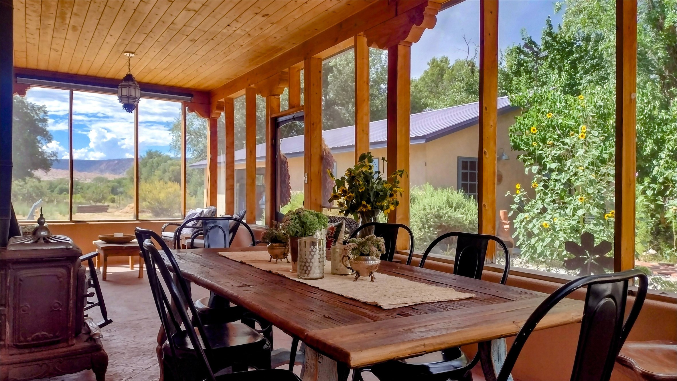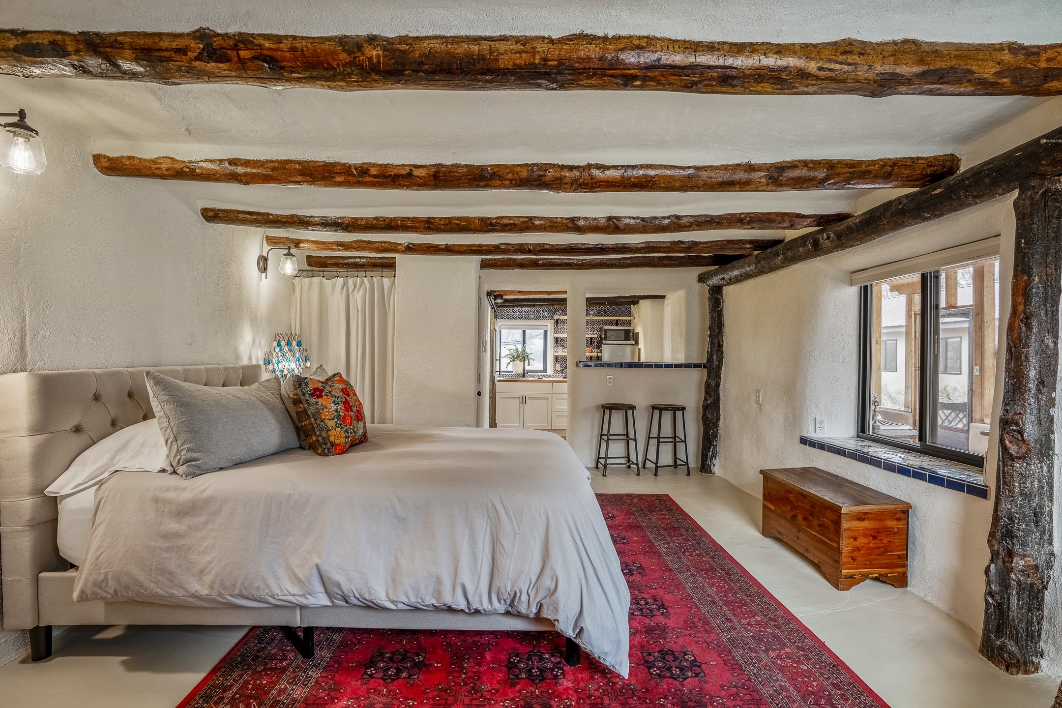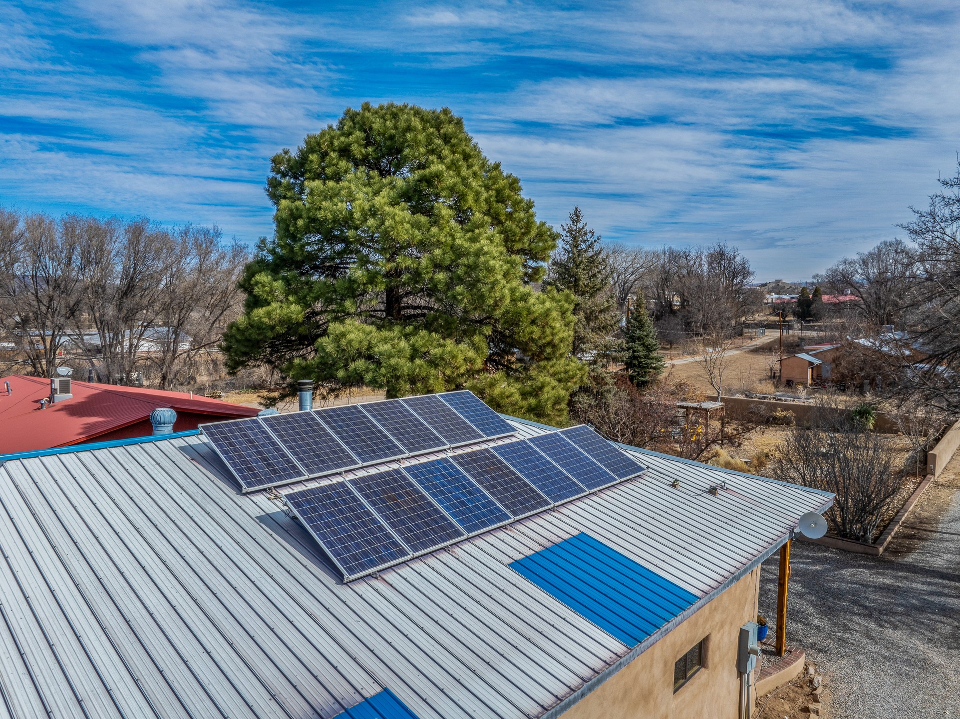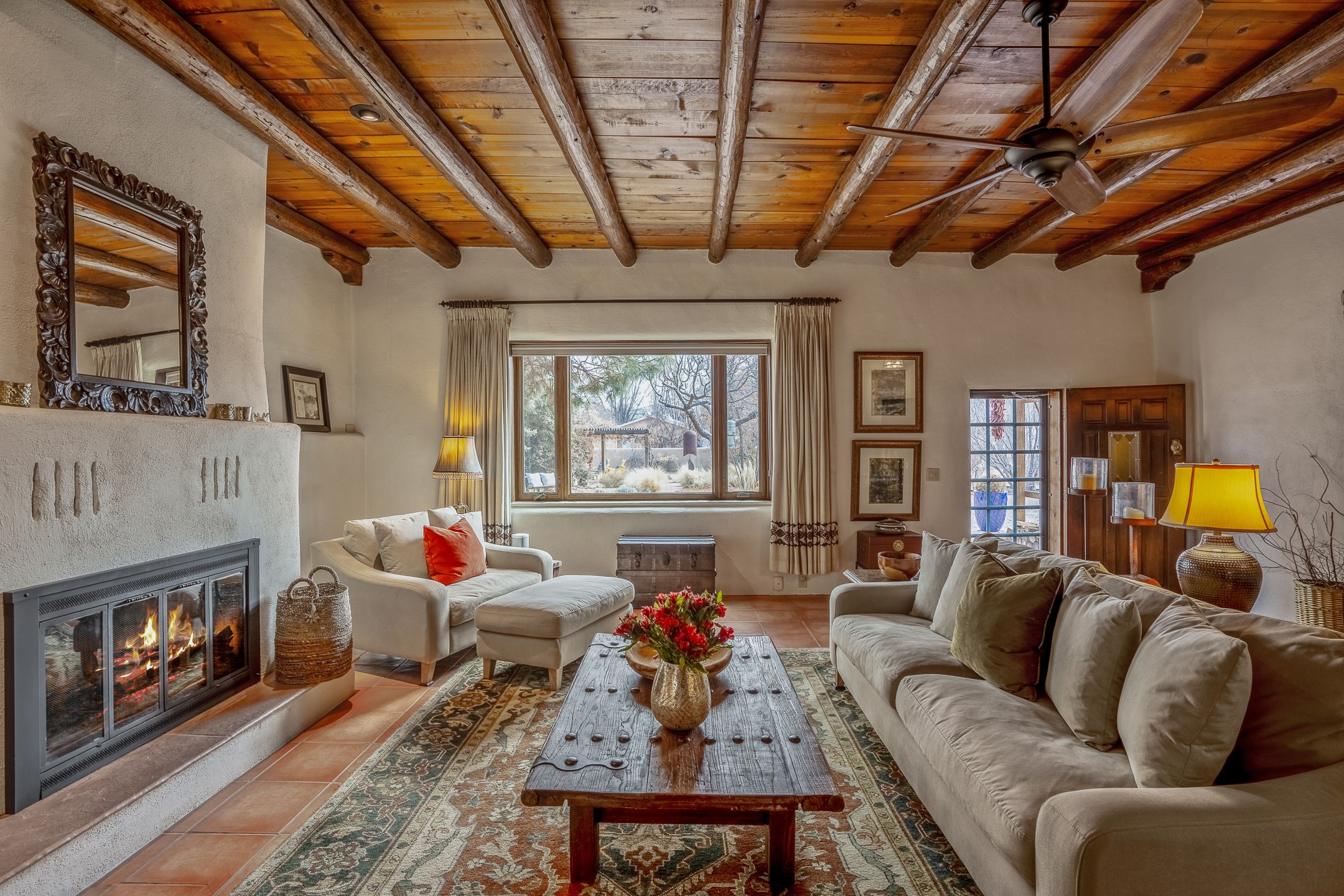 Charming, yet elegant, Alcalde adobe compound just steps from the Rio Grande Bosque. Experience refined farm living in this meticulously restored northern New Mexico property, which includes a main house, detached casita, and artist studio with a 3-car garage on 4.2 acres--2 acres of which are arable farmland. The acreage stretches from the Acequia de Alcalde to the Rio Grande Bosque and offers sweeping 180-degree views of the Jemez Mountains, Black Mesa, and the RG Bosque. The 3-bedroom, 2-bath adobe main house dates back to the early 1900s but has undergone thoughtful renovations and system upgrades in 2004 and again between 2022 and 2025. Finishes include vigas, coved ceilings, tile, brick, and wood floors, plus new high-end appliances in the kitchen and laundry. Equally charming is the 1-BD, 1-BA detached casita--perfect for guests or rental income. The double-adobe casita, the oldest structure on the property, was completely reimagined in 2024 and features custom tile work, a functional kitchenette, a new mini-split for heating and cooling, a screened-in porch, and front-row views of the Bosque. The property also includes a 3-car detached garage with an attached artist studio, making this property truly the complete package. The approximately 500 sq. ft. studio is heated and cooled by a mini-split and serves as an ideal space to create--or would serve as a great workshop. The grounds near the residences are landscaped with native grasses, flowers, a variety of fruit trees, and are watered by an 8-zone automated drip irrigation system. Water fountains grace both the front and back of the main house for added ambiance. Additional features include a private well, net-metered solar panels on the main house, and 3-acre feet of acequia water rights. Whether you're seeking an agricultural dream or a lush, retreat from city life, this property offers tranquility and the splendor of northern New Mexico--just 35 minutes from downtown Santa Fe.