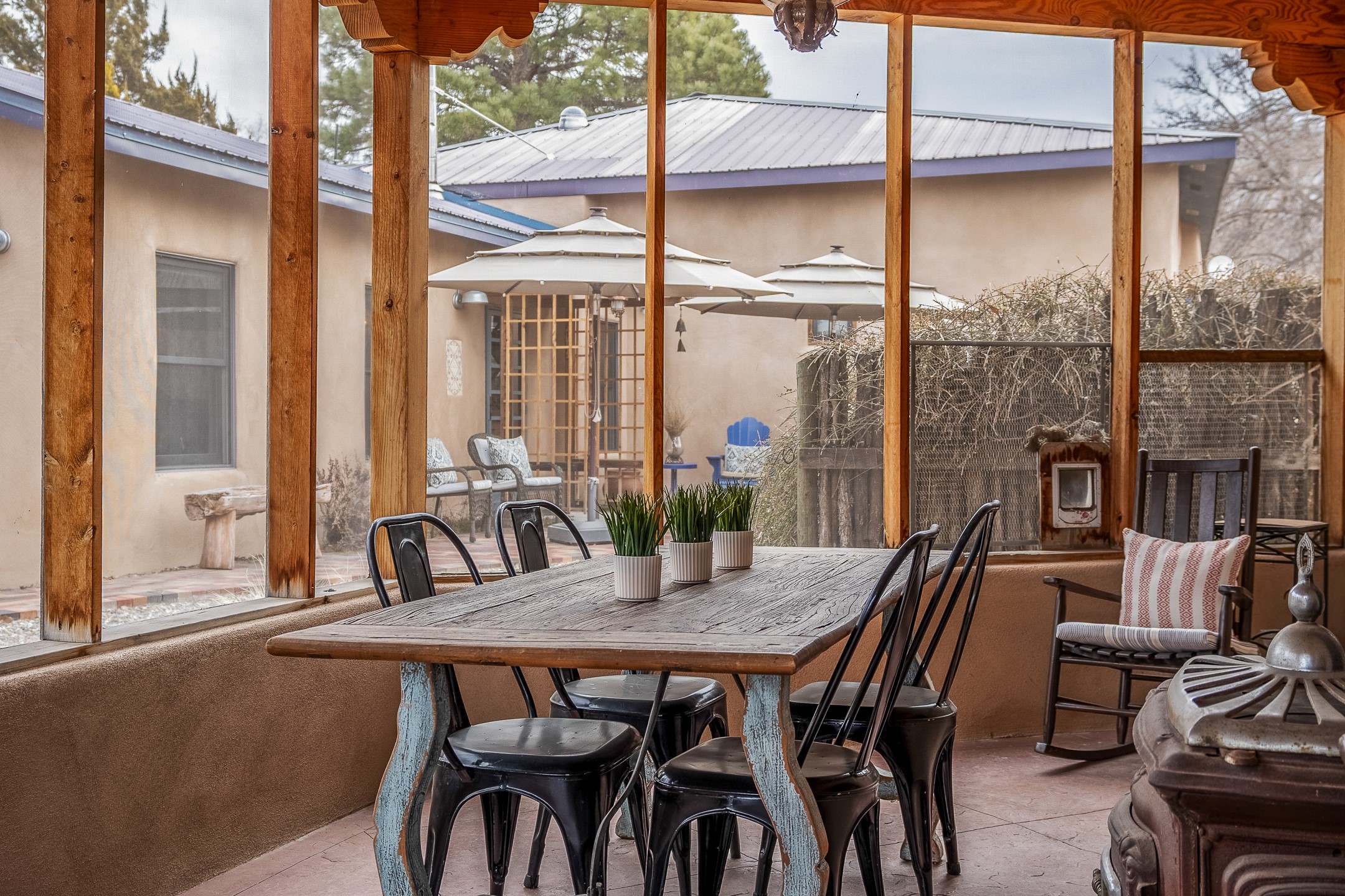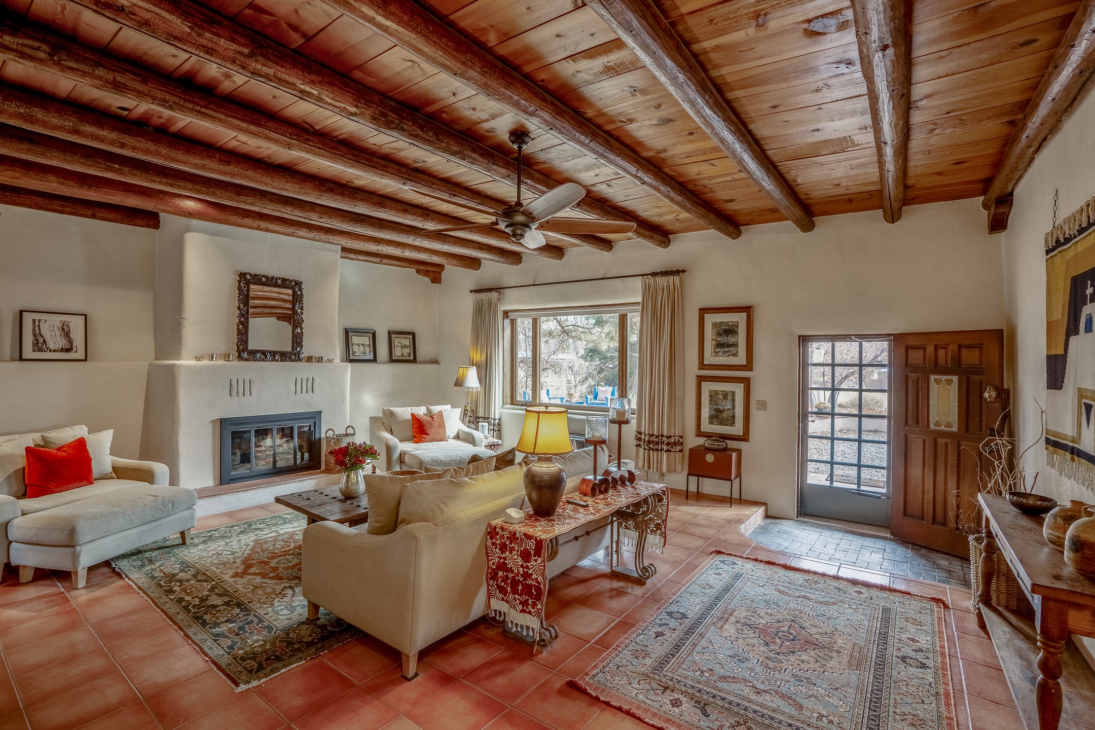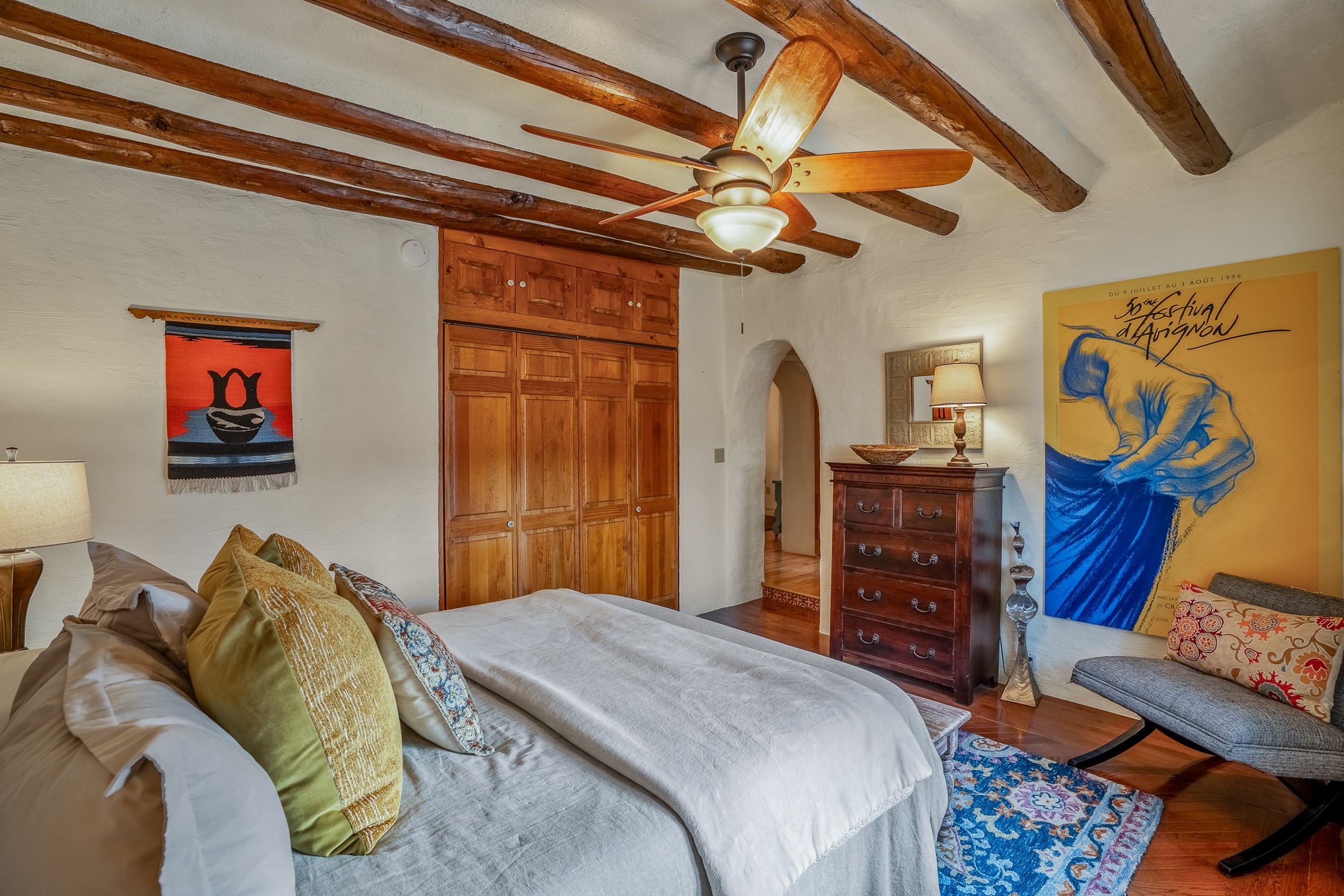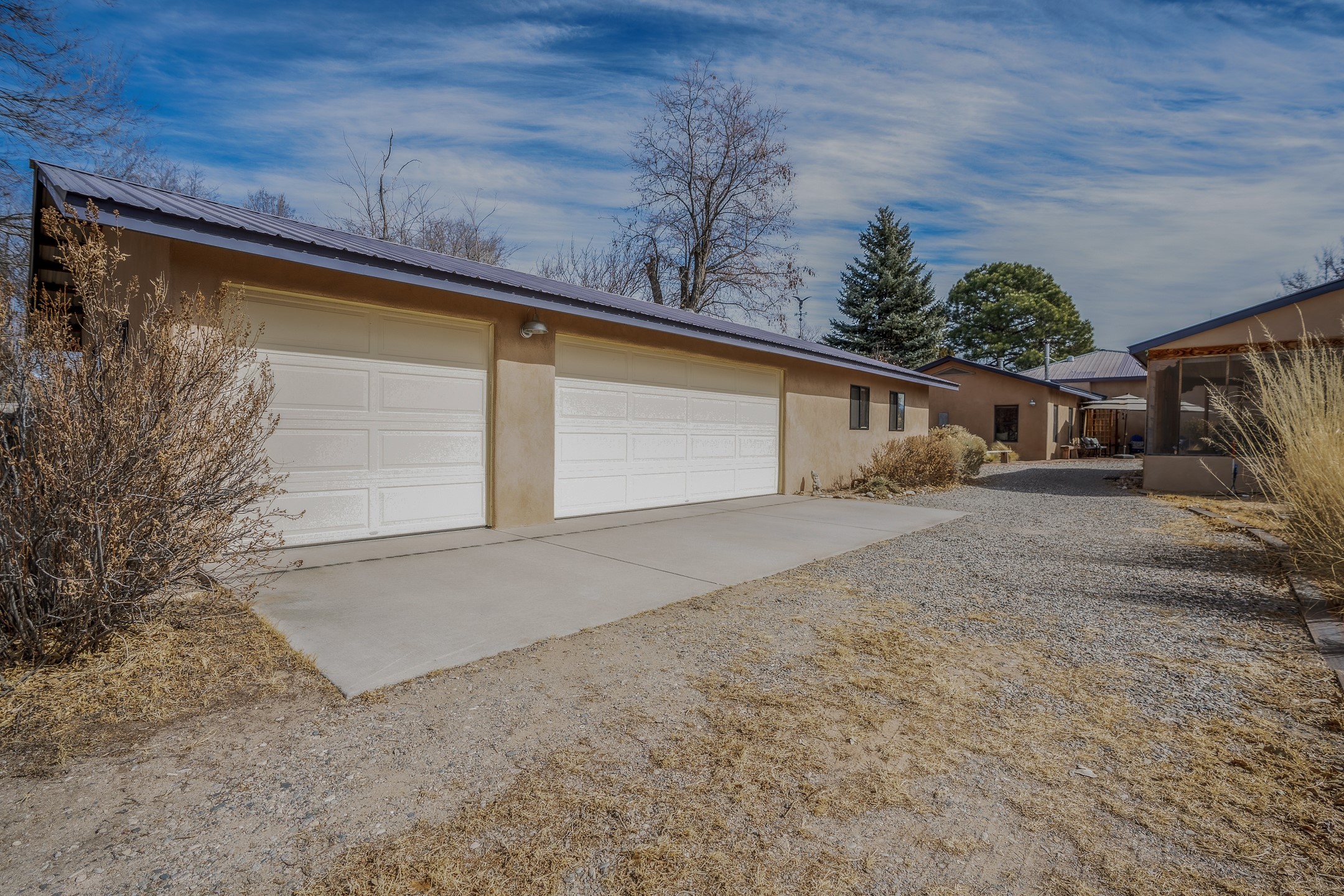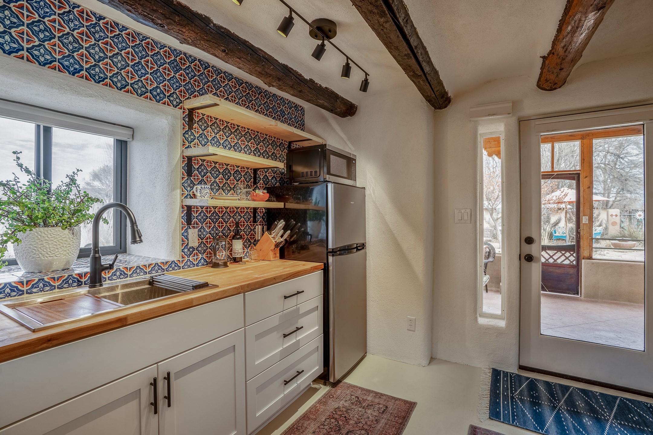 Charming, yet elegant, Alcalde adobe compound just steps from the Rio Grande Bosque. Experience refined farm living in this meticulously restored northern New Mexico property, which includes a main house, detached casita, and artist studio with a 3-car garage on 4.2 acres--2 acres of which are arable farmland. The acreage stretches from the Acequia de Alcalde to the Rio Grande Bosque and offers sweeping 180-degree views of the Jemez Mountains, Black Mesa, and the RG Bosque. The 3-bedroom, 2-bath adobe main house dates back to the early 1900s but has undergone thoughtful renovations and system upgrades in 2004 and again between 2022 and 2025. Finishes include vigas, coved ceilings, tile, brick, and wood floors, plus new high-end appliances in the kitchen and laundry. Equally charming is the 1-BD, 1-BA detached casita--perfect for guests or rental income. The double-adobe casita, the oldest structure on the property, was completely reimagined in 2024 and features custom tile work, a functional kitchenette, a new mini-split for heating and cooling, a screened-in porch, and front-row views of the Bosque. The property also includes a 3-car detached garage with an attached artist studio, making this property truly the complete package. The approximately 500 sq. ft. studio is heated and cooled by a mini-split and serves as an ideal space to create--or would serve as a great workshop. The grounds near the residences are landscaped with native grasses, flowers, a variety of fruit trees, and are watered by an 8-zone automated drip irrigation system. Water fountains grace both the front and back of the main house for added ambiance. Additional features include a private well, net-metered solar panels on the main house, and 3-acre feet of acequia water rights. Whether you're seeking an agricultural dream or a lush, retreat from city life, this property offers tranquility and the splendor of northern New Mexico--just 35 minutes from downtown Santa Fe.