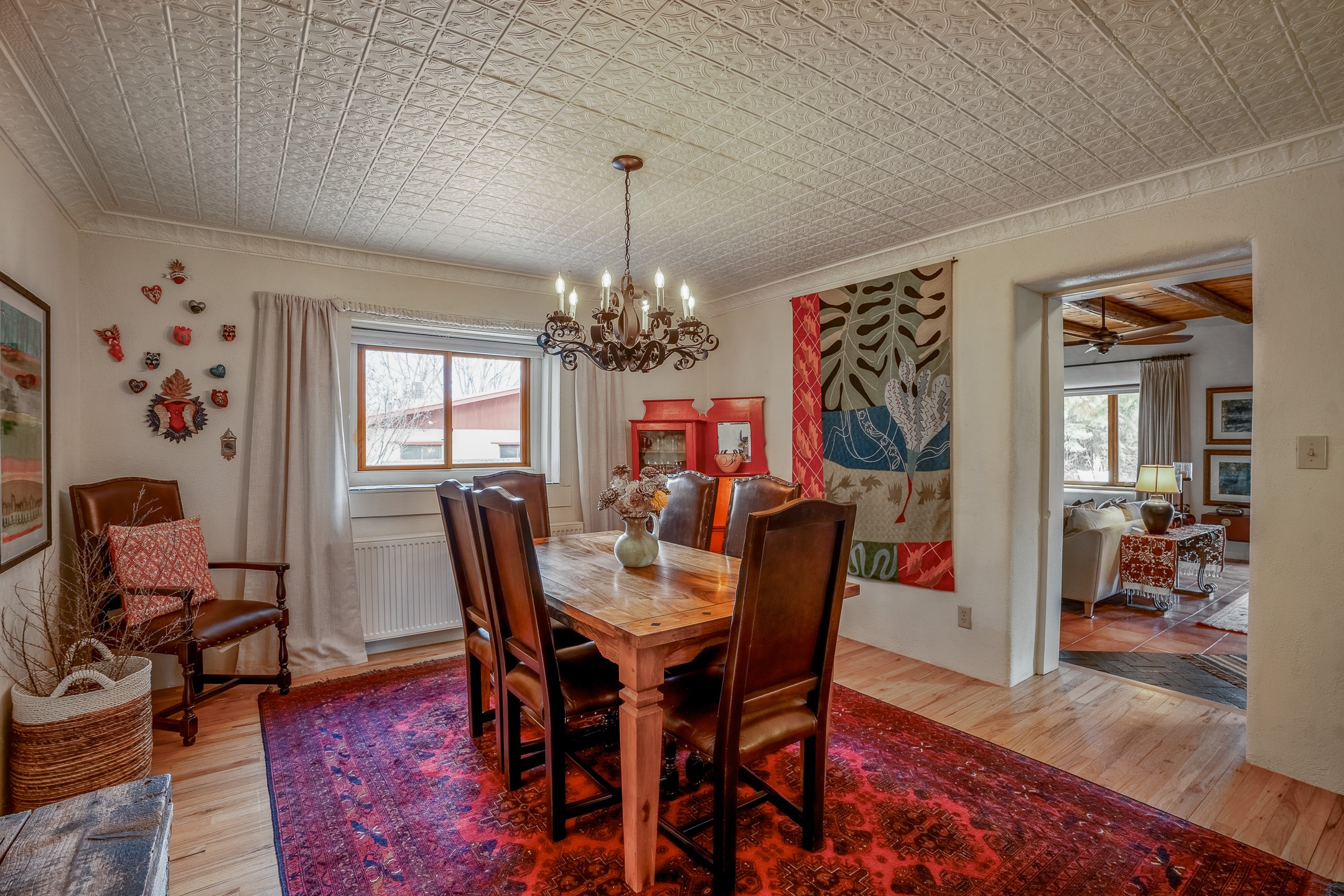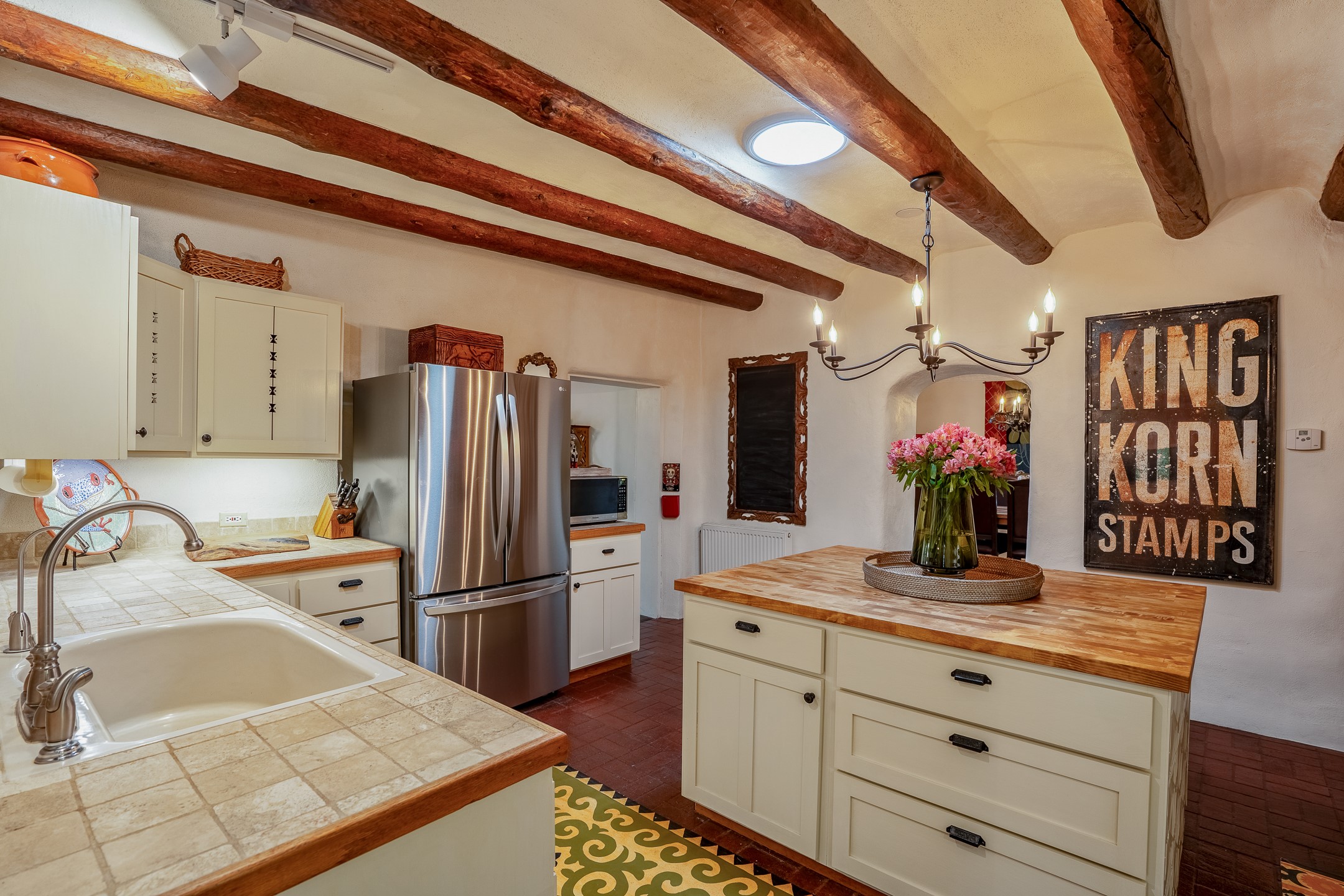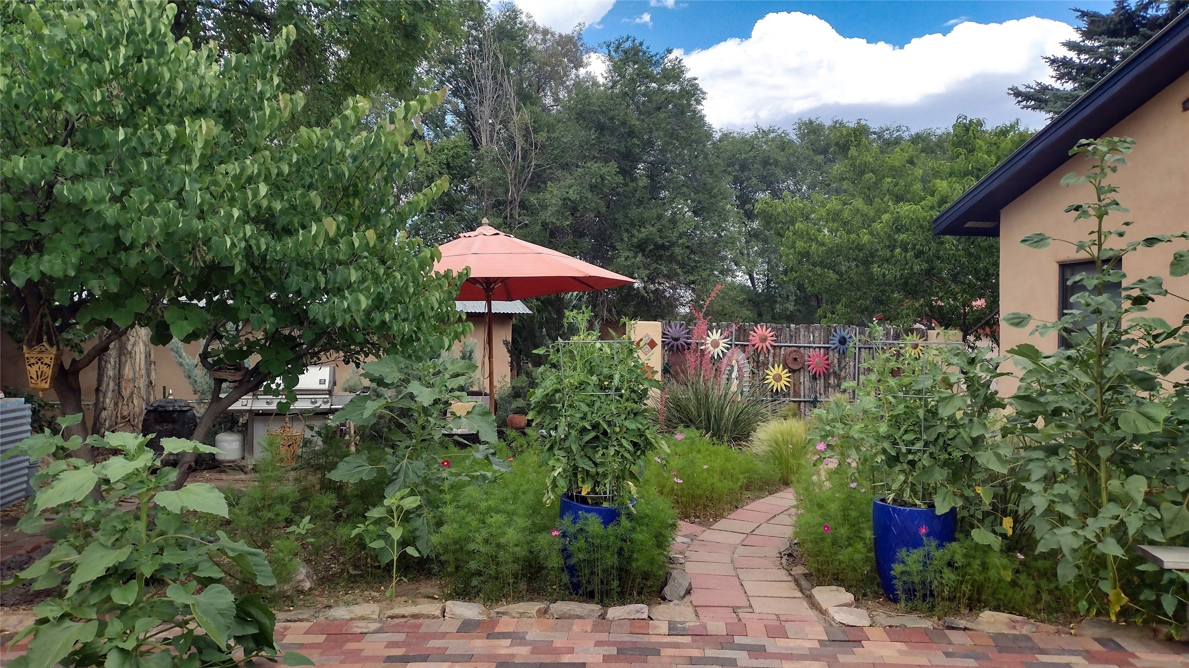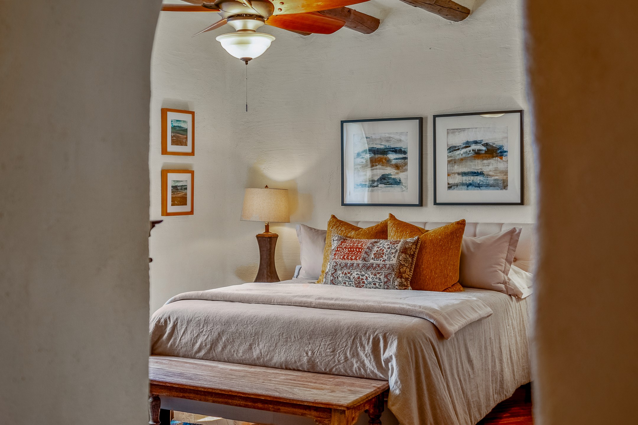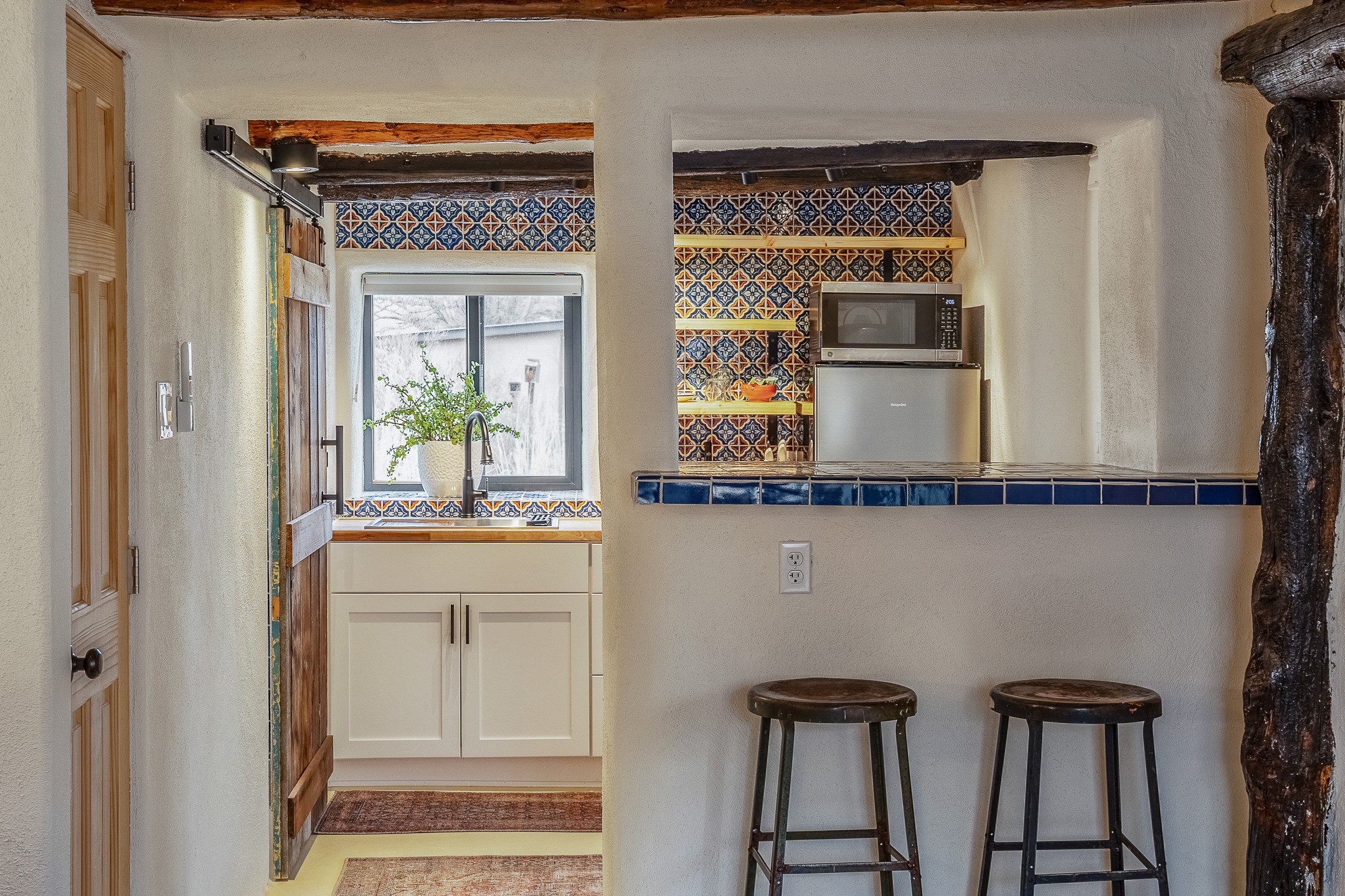 Charming, yet elegant, Alcalde adobe compound just steps from the Rio Grande Bosque. Experience refined farm living in this meticulously restored northern New Mexico property, which includes a main house, detached casita, and artist studio with a 3-car garage on 4.2 acres--2 acres of which are arable farmland. The acreage stretches from the Acequia de Alcalde to the Rio Grande Bosque and offers sweeping 180-degree views of the Jemez Mountains, Black Mesa, and the RG Bosque. The 3-bedroom, 2-bath adobe main house dates back to the early 1900s but has undergone thoughtful renovations and system upgrades in 2004 and again between 2022 and 2025. Finishes include vigas, coved ceilings, tile, brick, and wood floors, plus new high-end appliances in the kitchen and laundry. Equally charming is the 1-BD, 1-BA detached casita--perfect for guests or rental income. The double-adobe casita, the oldest structure on the property, was completely reimagined in 2024 and features custom tile work, a functional kitchenette, a new mini-split for heating and cooling, a screened-in porch, and front-row views of the Bosque. The property also includes a 3-car detached garage with an attached artist studio, making this property truly the complete package. The approximately 500 sq. ft. studio is heated and cooled by a mini-split and serves as an ideal space to create--or would serve as a great workshop. The grounds near the residences are landscaped with native grasses, flowers, a variety of fruit trees, and are watered by an 8-zone automated drip irrigation system. Water fountains grace both the front and back of the main house for added ambiance. Additional features include a private well, net-metered solar panels on the main house, and 3-acre feet of acequia water rights. Whether you're seeking an agricultural dream or a lush, retreat from city life, this property offers tranquility and the splendor of northern New Mexico--just 35 minutes from downtown Santa Fe.