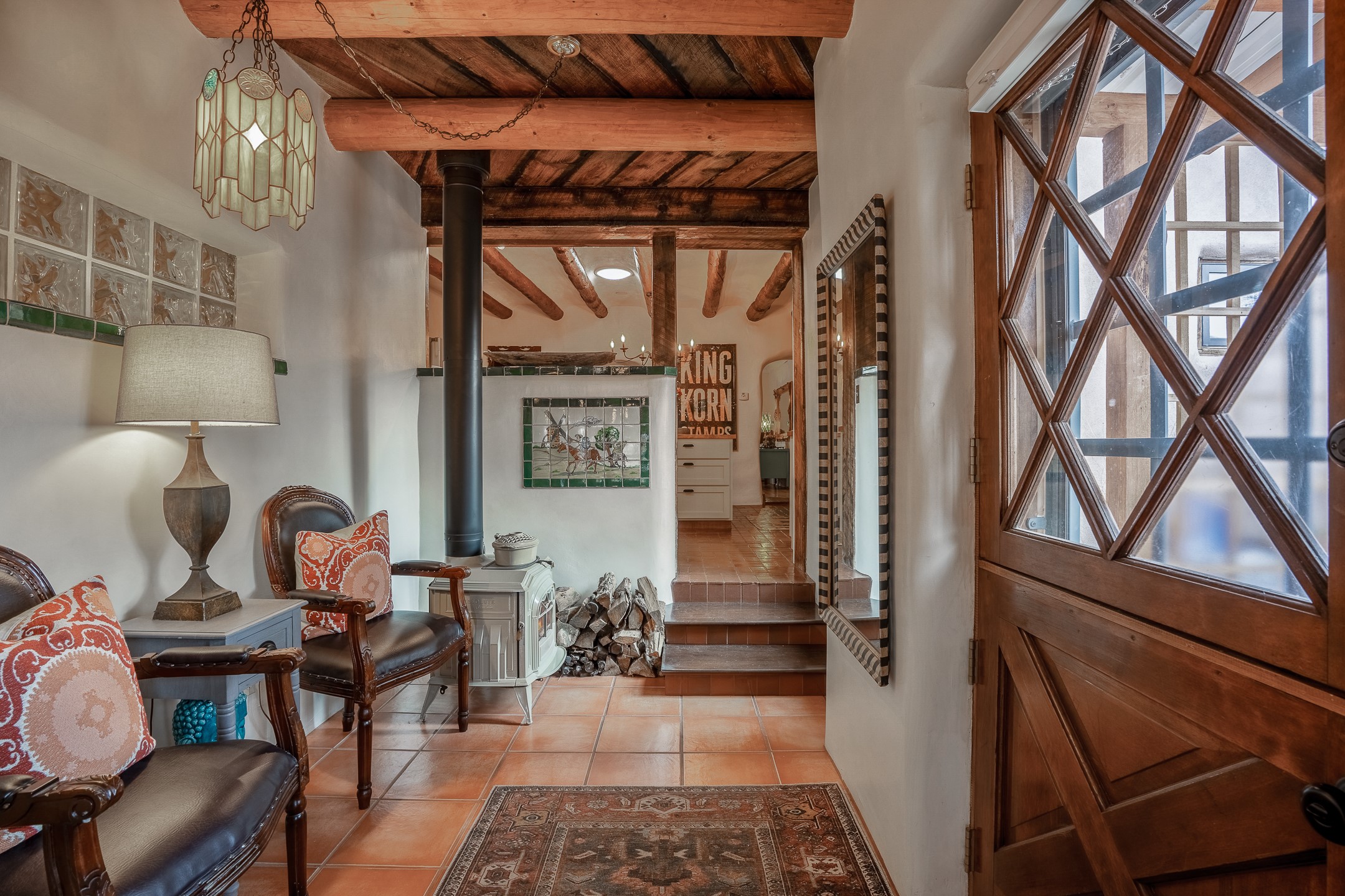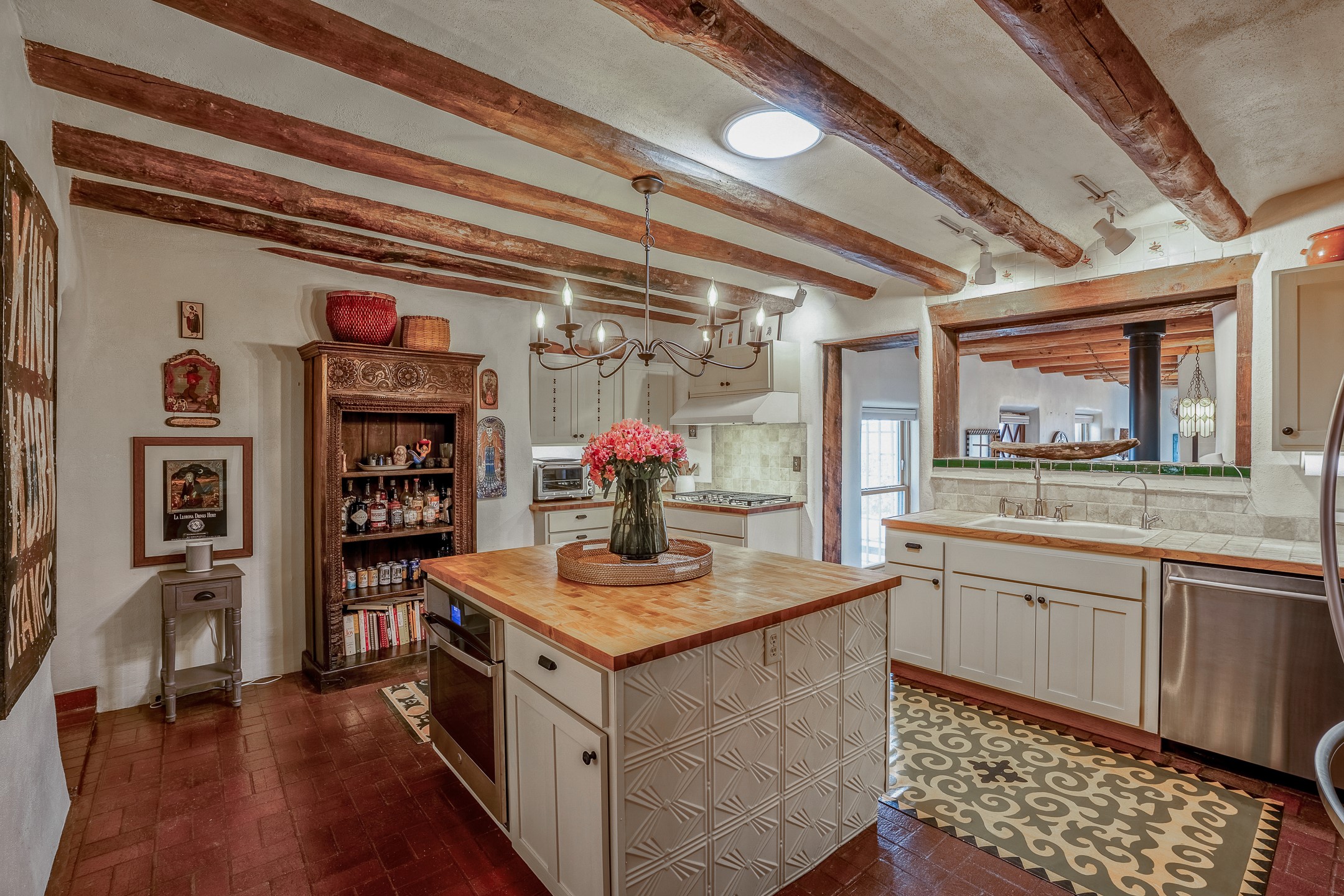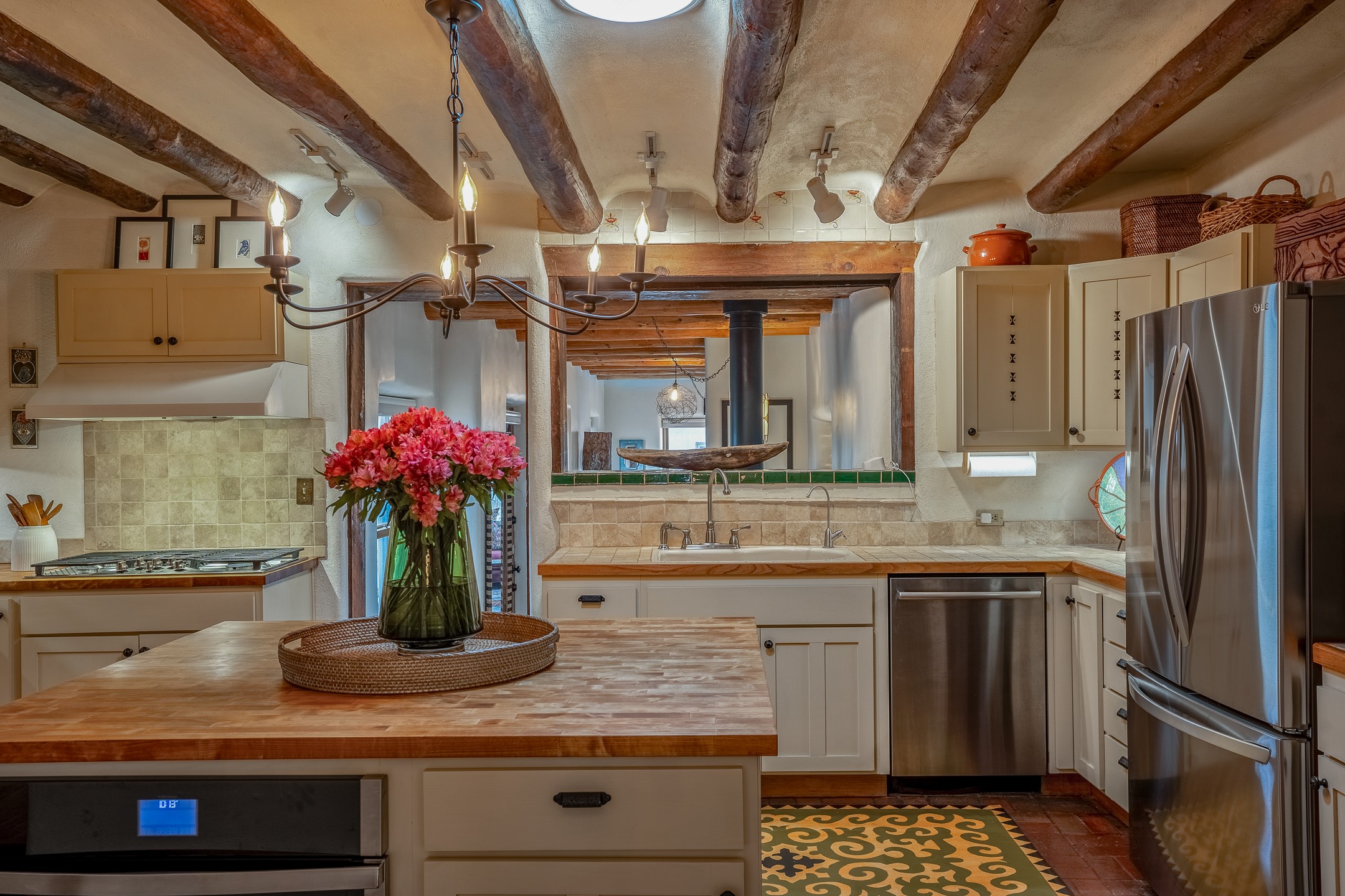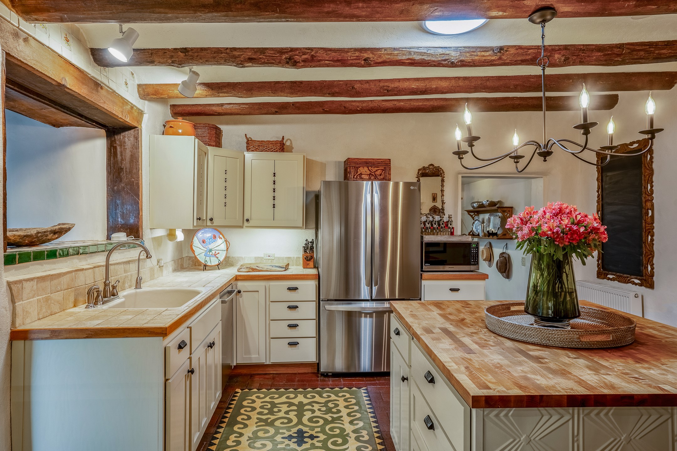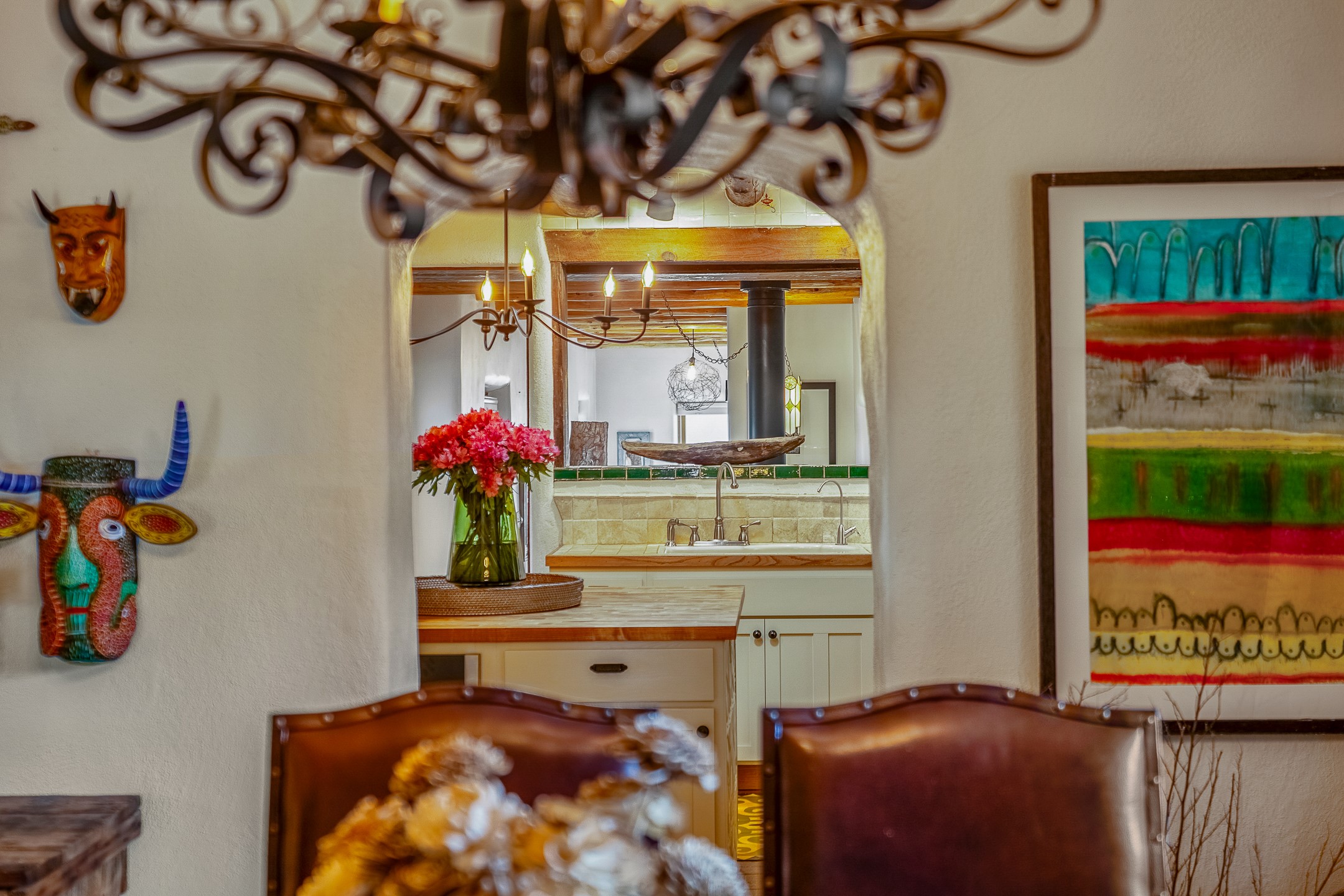 Charming, yet elegant, Alcalde adobe compound just steps from the Rio Grande Bosque. Experience refined farm living in this meticulously restored northern New Mexico property, which includes a main house, detached casita, and artist studio with a 3-car garage on 4.2 acres--2 acres of which are arable farmland. The acreage stretches from the Acequia de Alcalde to the Rio Grande Bosque and offers sweeping 180-degree views of the Jemez Mountains, Black Mesa, and the RG Bosque. The 3-bedroom, 2-bath adobe main house dates back to the early 1900s but has undergone thoughtful renovations and system upgrades in 2004 and again between 2022 and 2025. Finishes include vigas, coved ceilings, tile, brick, and wood floors, plus new high-end appliances in the kitchen and laundry. Equally charming is the 1-BD, 1-BA detached casita--perfect for guests or rental income. The double-adobe casita, the oldest structure on the property, was completely reimagined in 2024 and features custom tile work, a functional kitchenette, a new mini-split for heating and cooling, a screened-in porch, and front-row views of the Bosque. The property also includes a 3-car detached garage with an attached artist studio, making this property truly the complete package. The approximately 500 sq. ft. studio is heated and cooled by a mini-split and serves as an ideal space to create--or would serve as a great workshop. The grounds near the residences are landscaped with native grasses, flowers, a variety of fruit trees, and are watered by an 8-zone automated drip irrigation system. Water fountains grace both the front and back of the main house for added ambiance. Additional features include a private well, net-metered solar panels on the main house, and 3-acre feet of acequia water rights. Whether you're seeking an agricultural dream or a lush, retreat from city life, this property offers tranquility and the splendor of northern New Mexico--just 35 minutes from downtown Santa Fe.